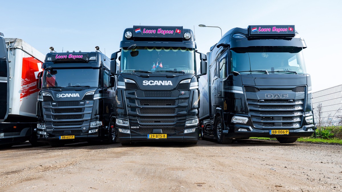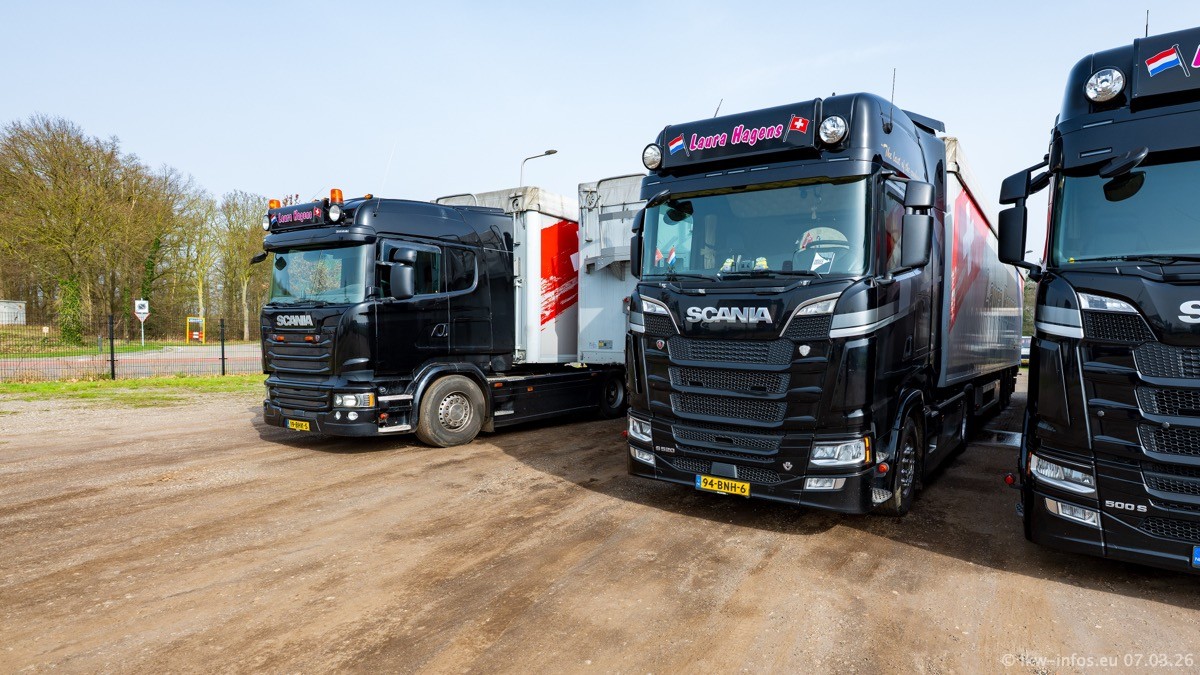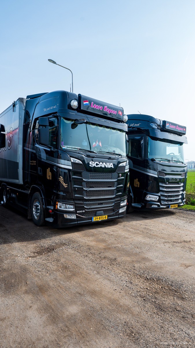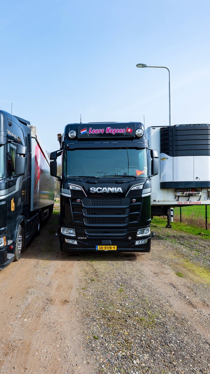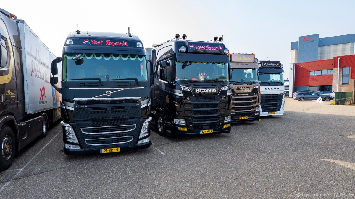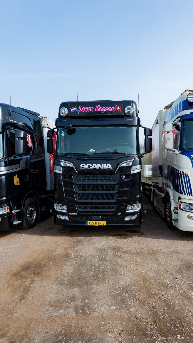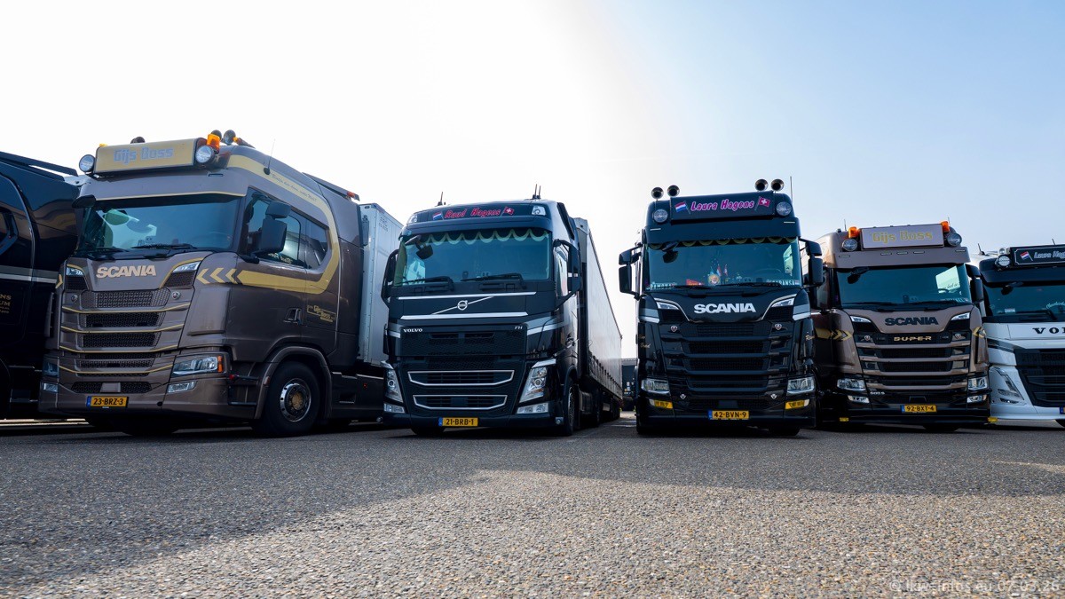 Die LKW von Laura Hagens stehen jetzt auf dem Parkplatz gegenüber vom Firmengelände. Gijs Boss hat das Büro in Venlo aufgelöst und die "alten" LKW stehen jetzt auch in Wanssum. Darum musste ein Teil der LKW auf den zweiten Parkplatz, weil es sowieso schon viel zu eng ist auf dem Firmenhof. Es gibt einen weiteren neuen VOLVO FH Aero, der seit Anfang Januar fährt.