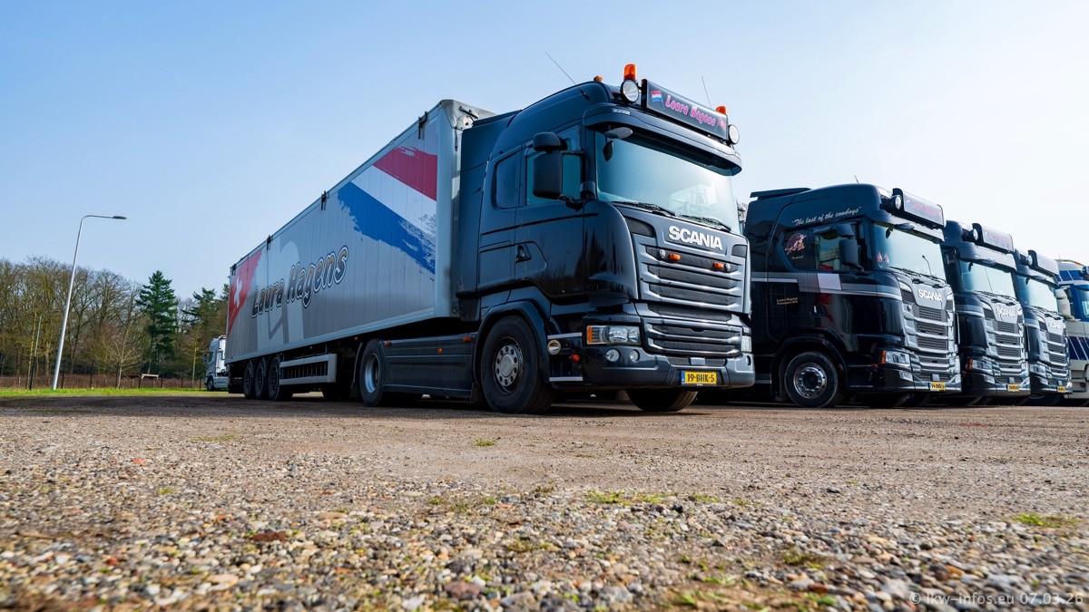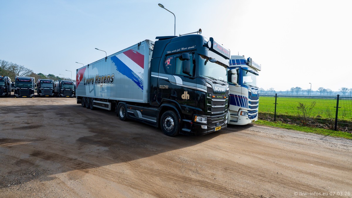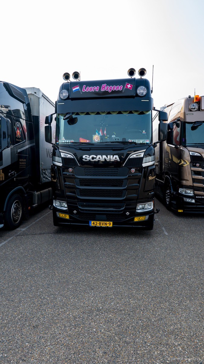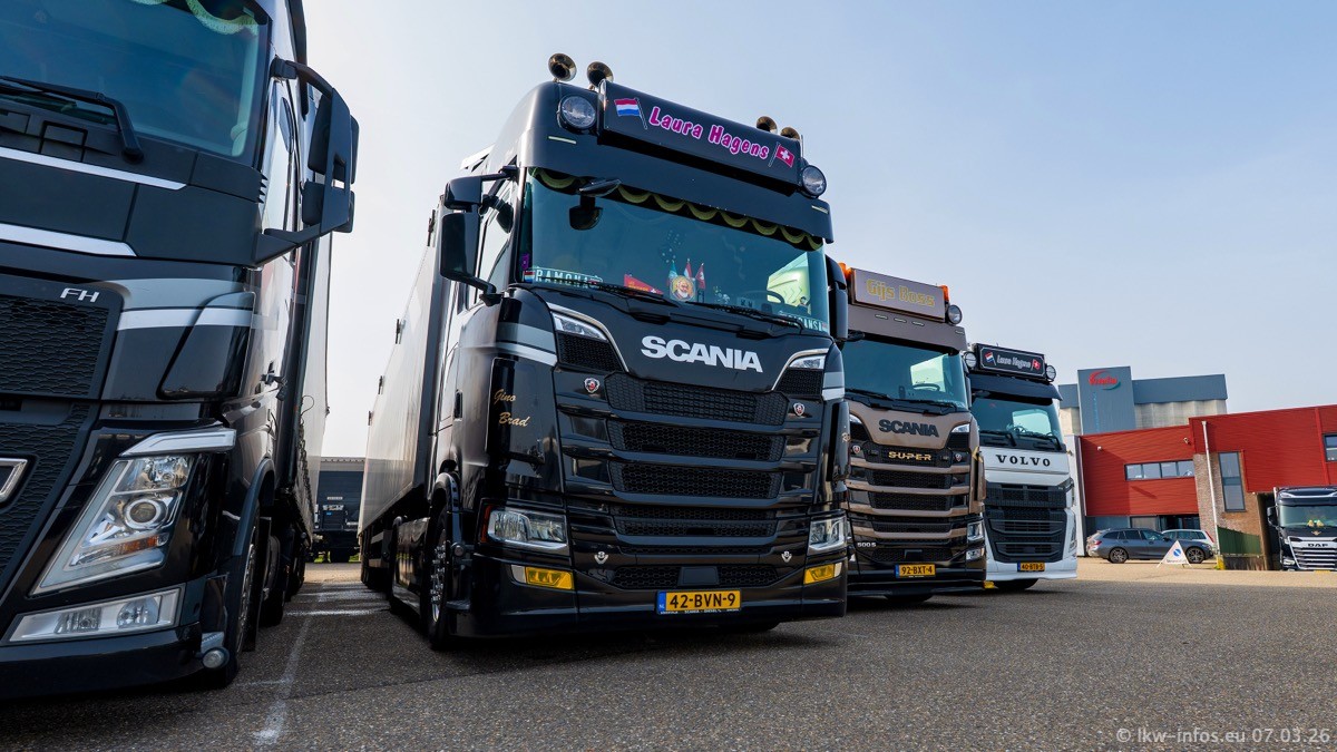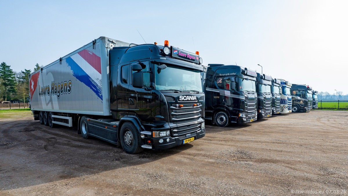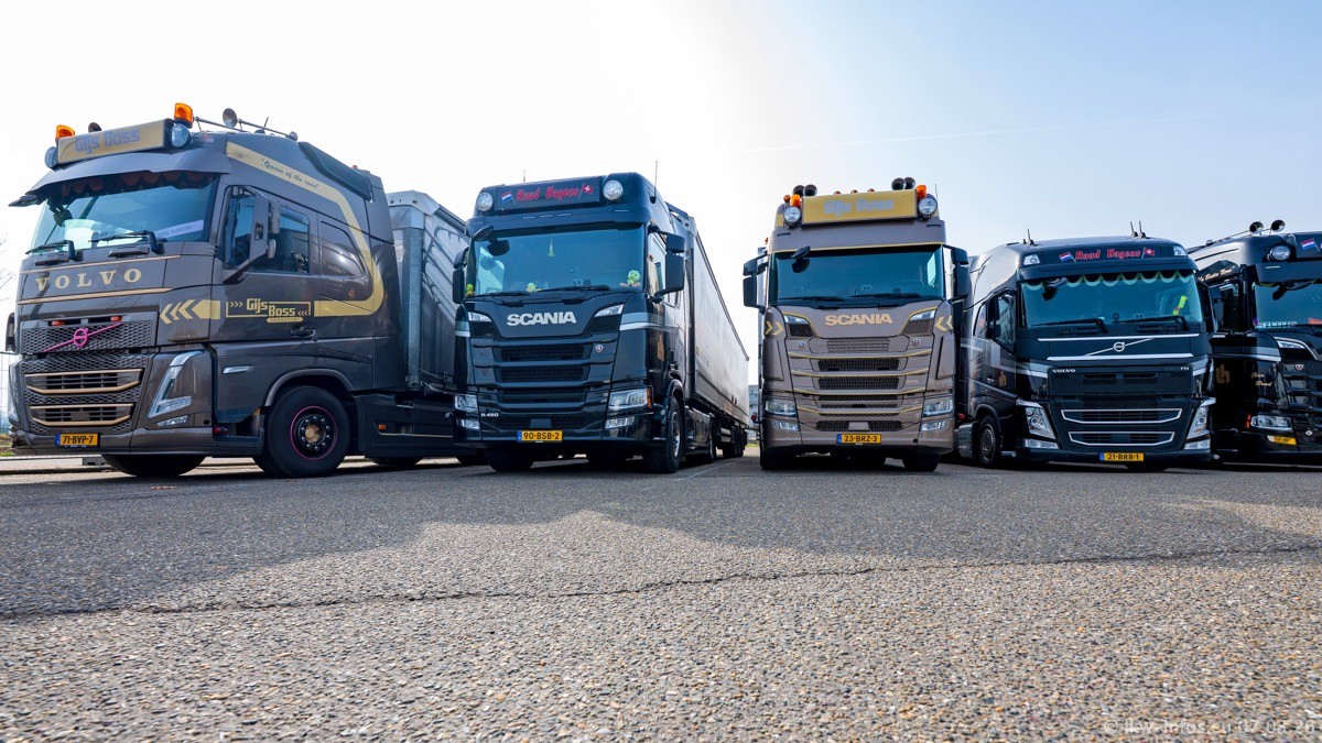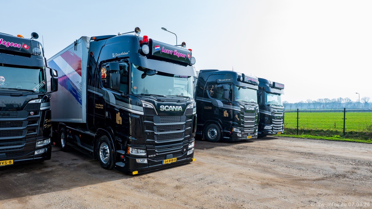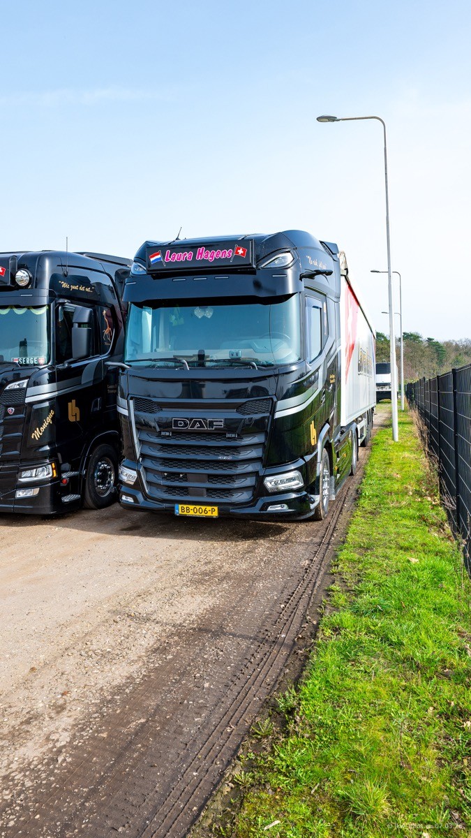 Die LKW von Laura Hagens stehen jetzt auf dem Parkplatz gegenüber vom Firmengelände. Gijs Boss hat das Büro in Venlo aufgelöst und die "alten" LKW stehen jetzt auch in Wanssum. Darum musste ein Teil der LKW auf den zweiten Parkplatz, weil es sowieso schon viel zu eng ist auf dem Firmenhof. Es gibt einen weiteren neuen VOLVO FH Aero, der seit Anfang Januar fährt.