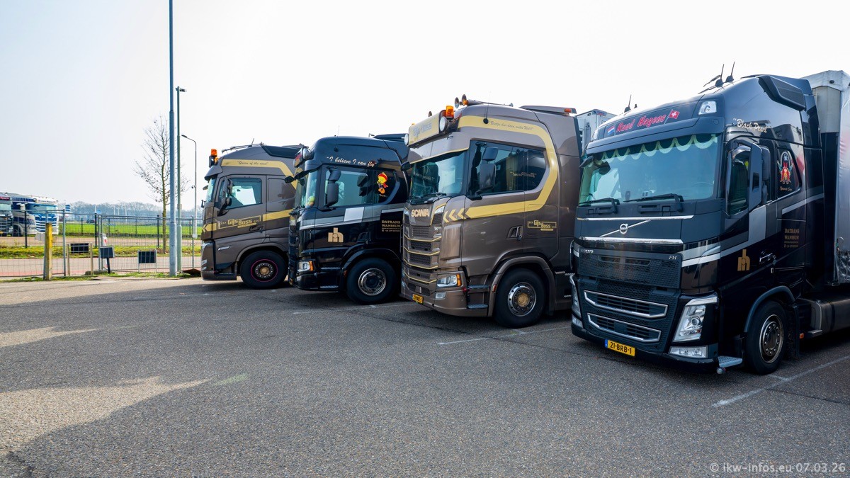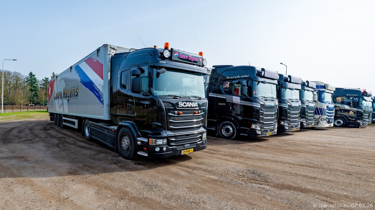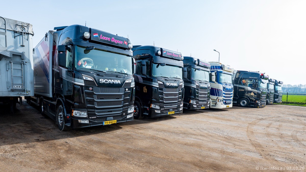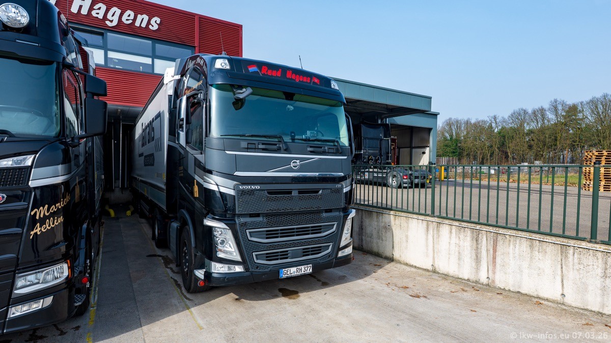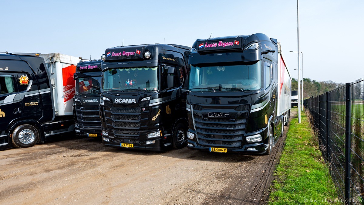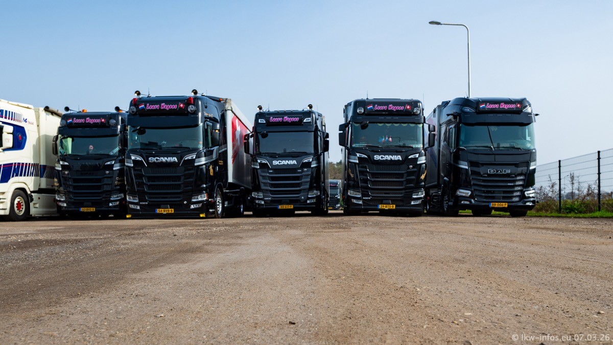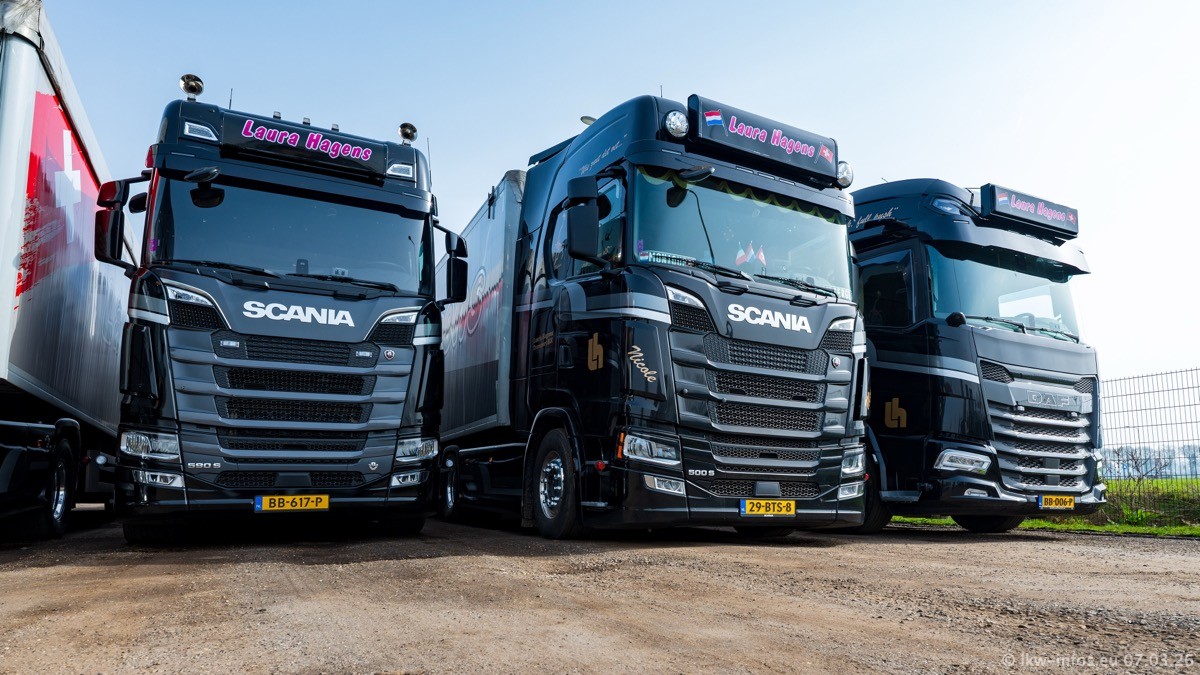 Die LKW von Laura Hagens stehen jetzt auf dem Parkplatz gegenüber vom Firmengelände. Gijs Boss hat das Büro in Venlo aufgelöst und die "alten" LKW stehen jetzt auch in Wanssum. Darum musste ein Teil der LKW auf den zweiten Parkplatz, weil es sowieso schon viel zu eng ist auf dem Firmenhof. Es gibt einen weiteren neuen VOLVO FH Aero, der seit Anfang Januar fährt.
