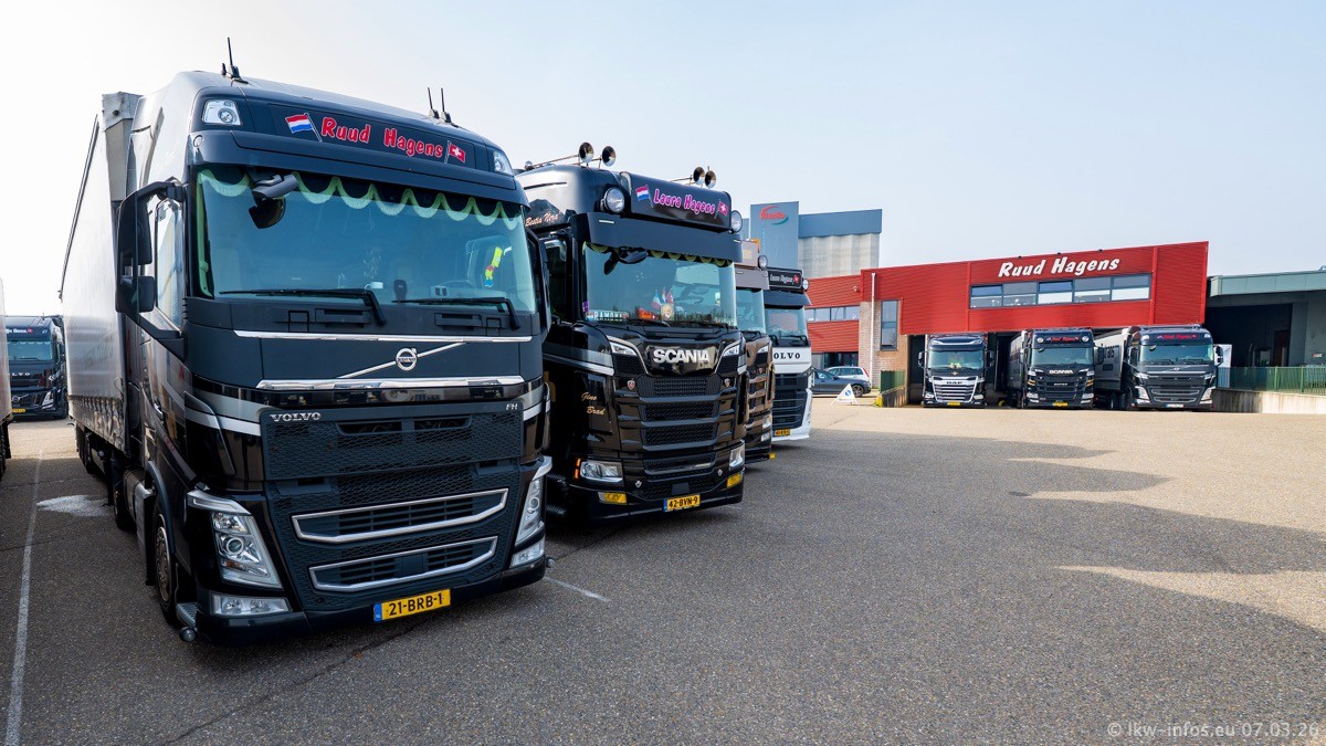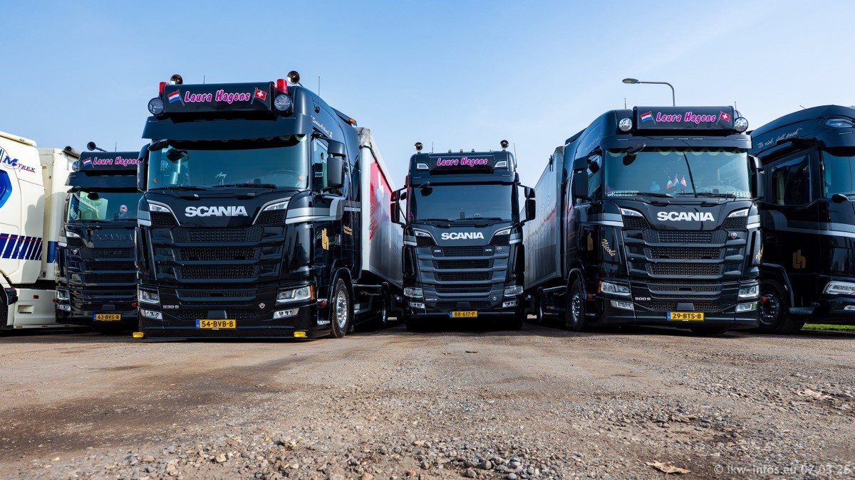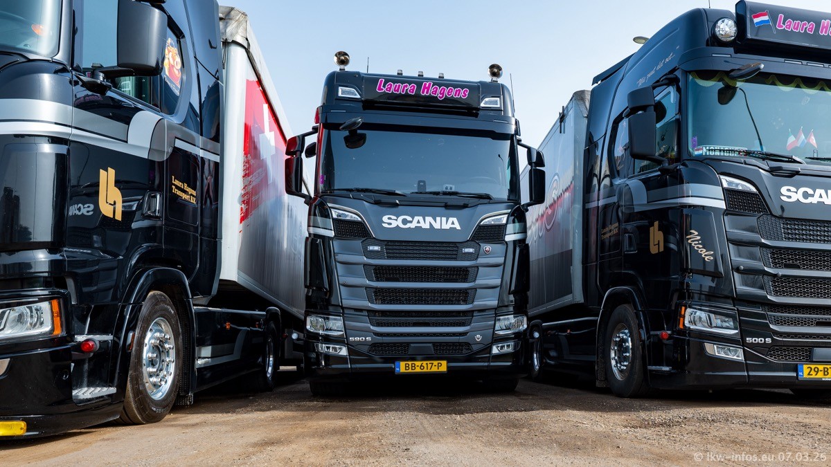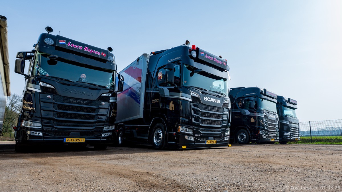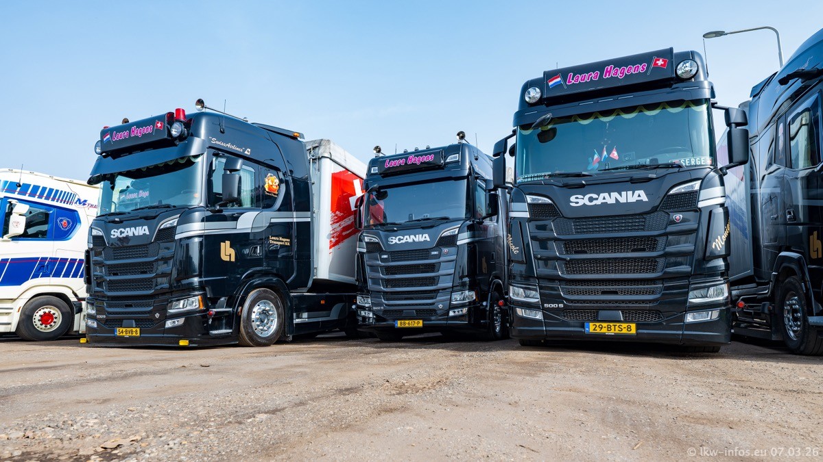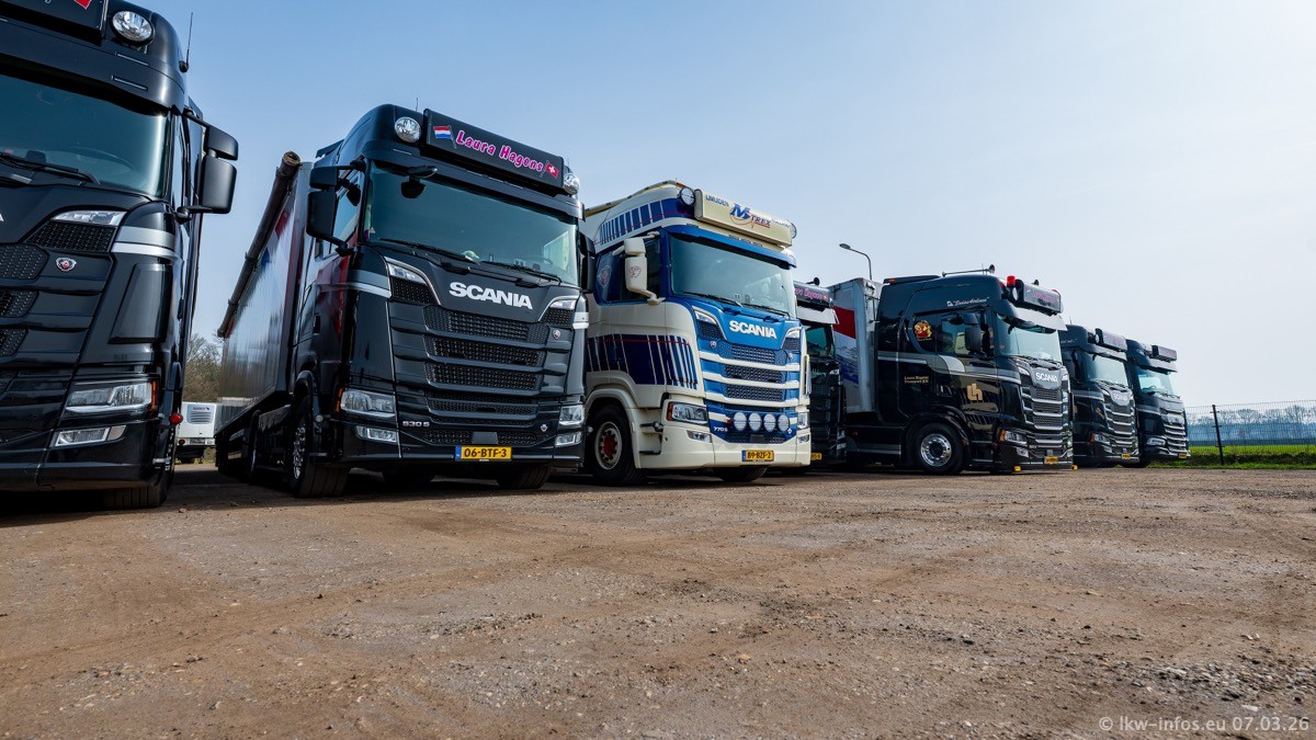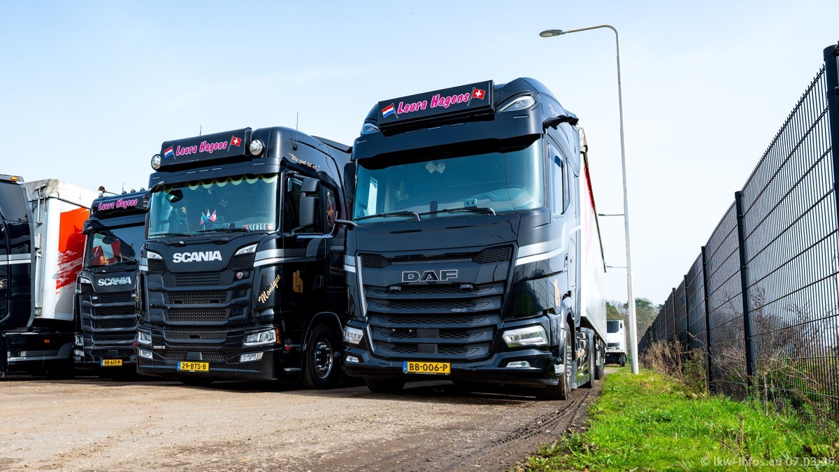Die LKW von Laura Hagens stehen jetzt auf dem Parkplatz gegenüber vom Firmengelände. Gijs Boss hat das Büro in Venlo aufgelöst und die "alten" LKW stehen jetzt auch in Wanssum. Darum musste ein Teil der LKW auf den zweiten Parkplatz, weil es sowieso schon viel zu eng ist auf dem Firmenhof. Es gibt einen weiteren neuen VOLVO FH Aero, der seit Anfang Januar fährt.