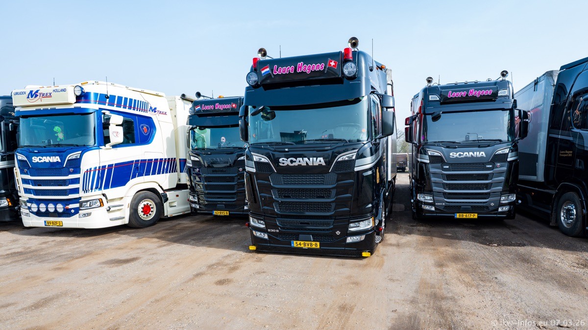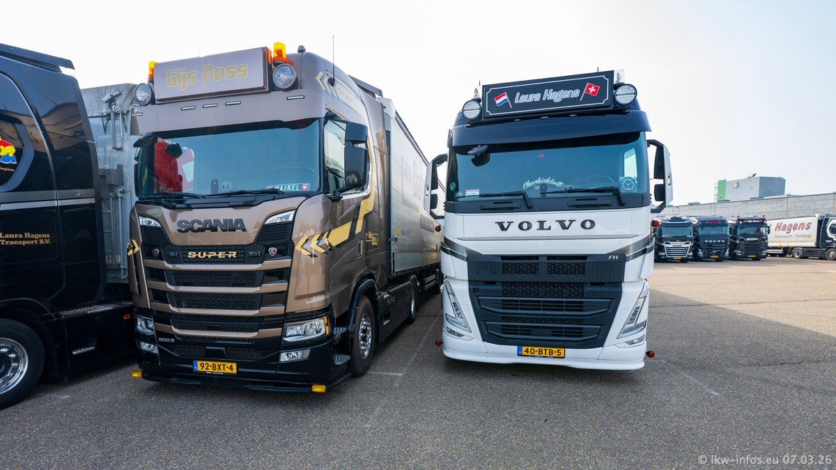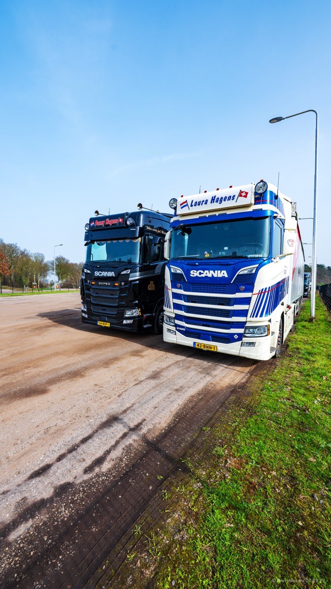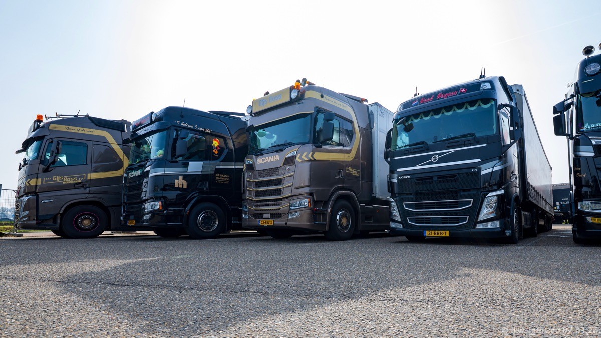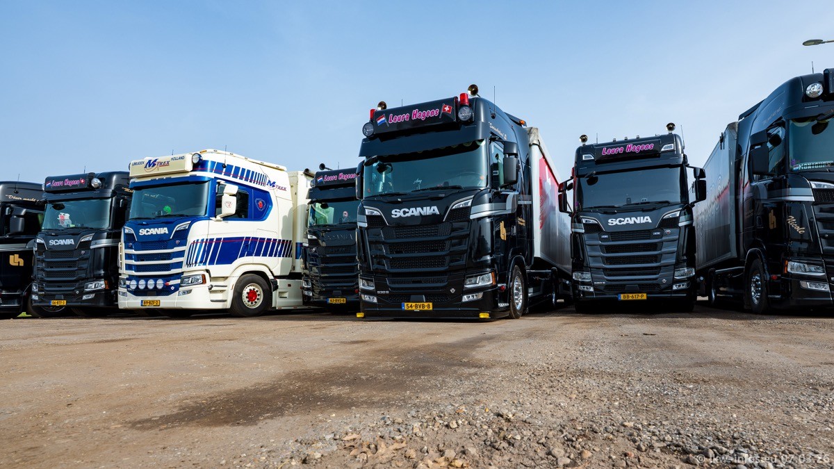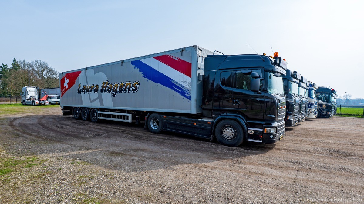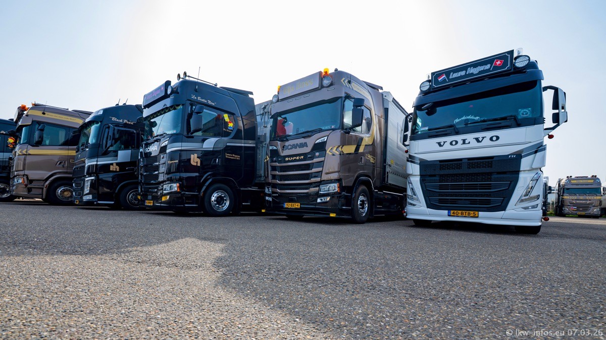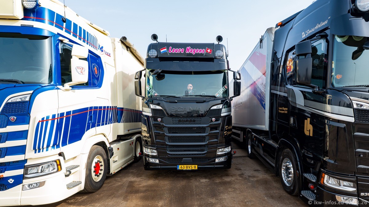 Die LKW von Laura Hagens stehen jetzt auf dem Parkplatz gegenüber vom Firmengelände. Gijs Boss hat das Büro in Venlo aufgelöst und die "alten" LKW stehen jetzt auch in Wanssum. Darum musste ein Teil der LKW auf den zweiten Parkplatz, weil es sowieso schon viel zu eng ist auf dem Firmenhof. Es gibt einen weiteren neuen VOLVO FH Aero, der seit Anfang Januar fährt.