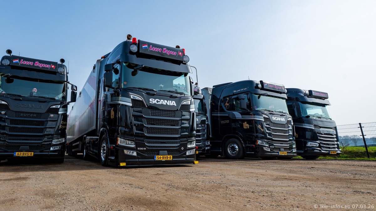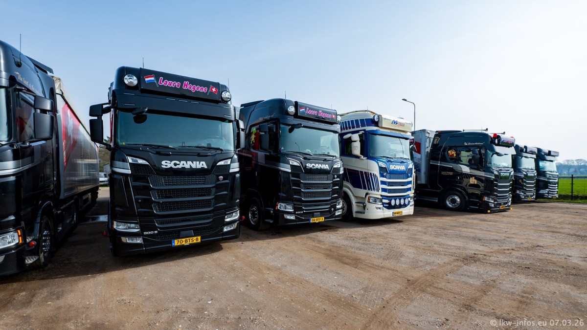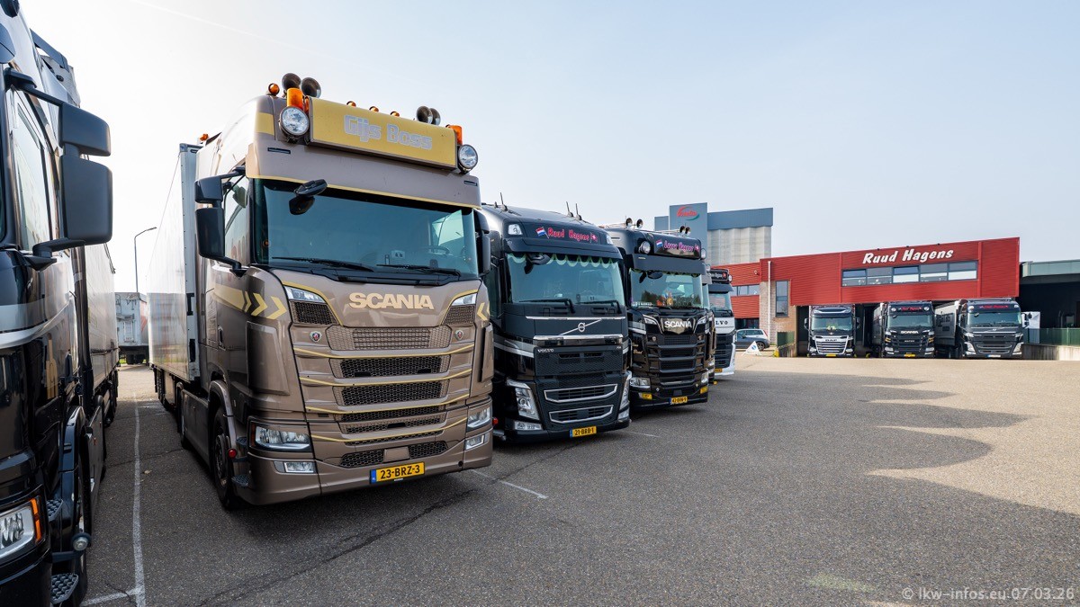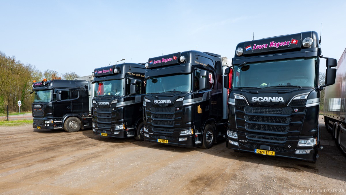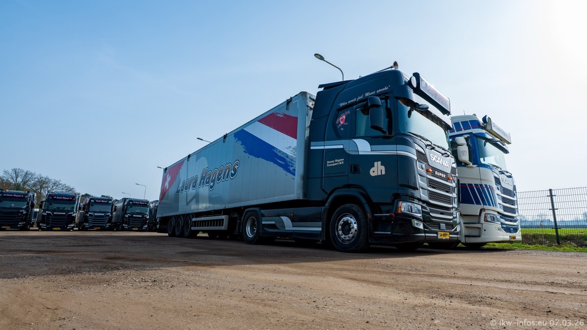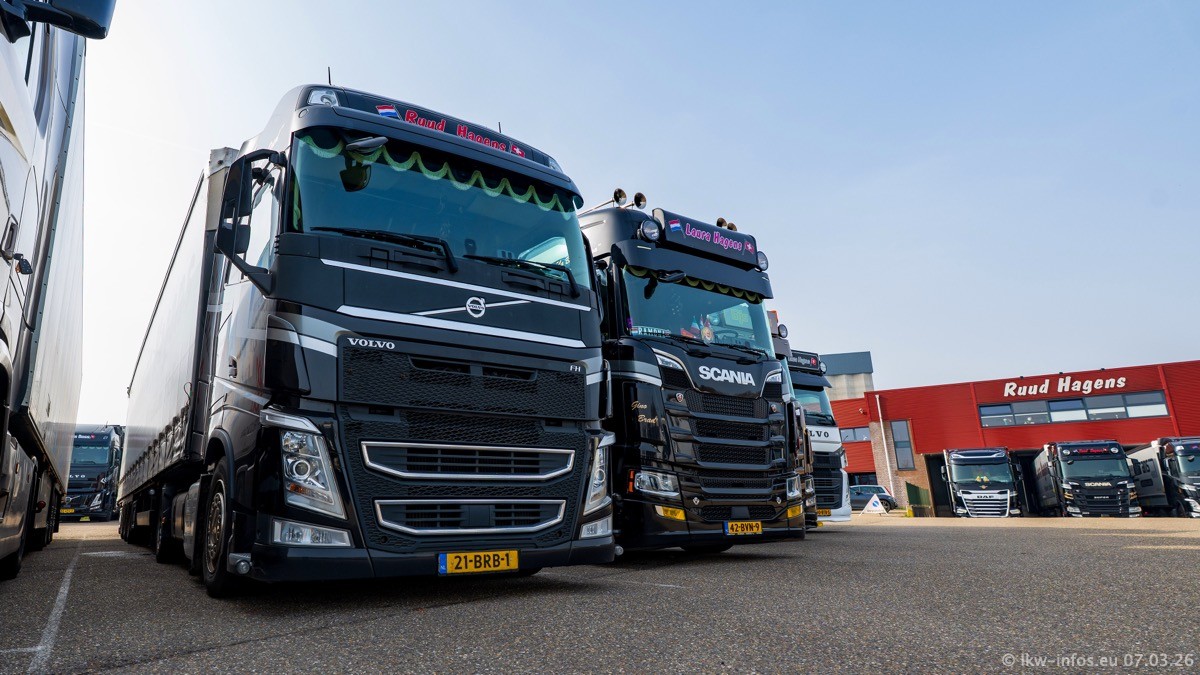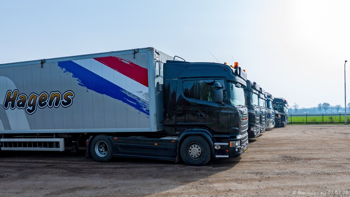 Die LKW von Laura Hagens stehen jetzt auf dem Parkplatz gegenüber vom Firmengelände. Gijs Boss hat das Büro in Venlo aufgelöst und die "alten" LKW stehen jetzt auch in Wanssum. Darum musste ein Teil der LKW auf den zweiten Parkplatz, weil es sowieso schon viel zu eng ist auf dem Firmenhof. Es gibt einen weiteren neuen VOLVO FH Aero, der seit Anfang Januar fährt.