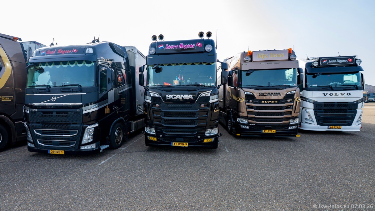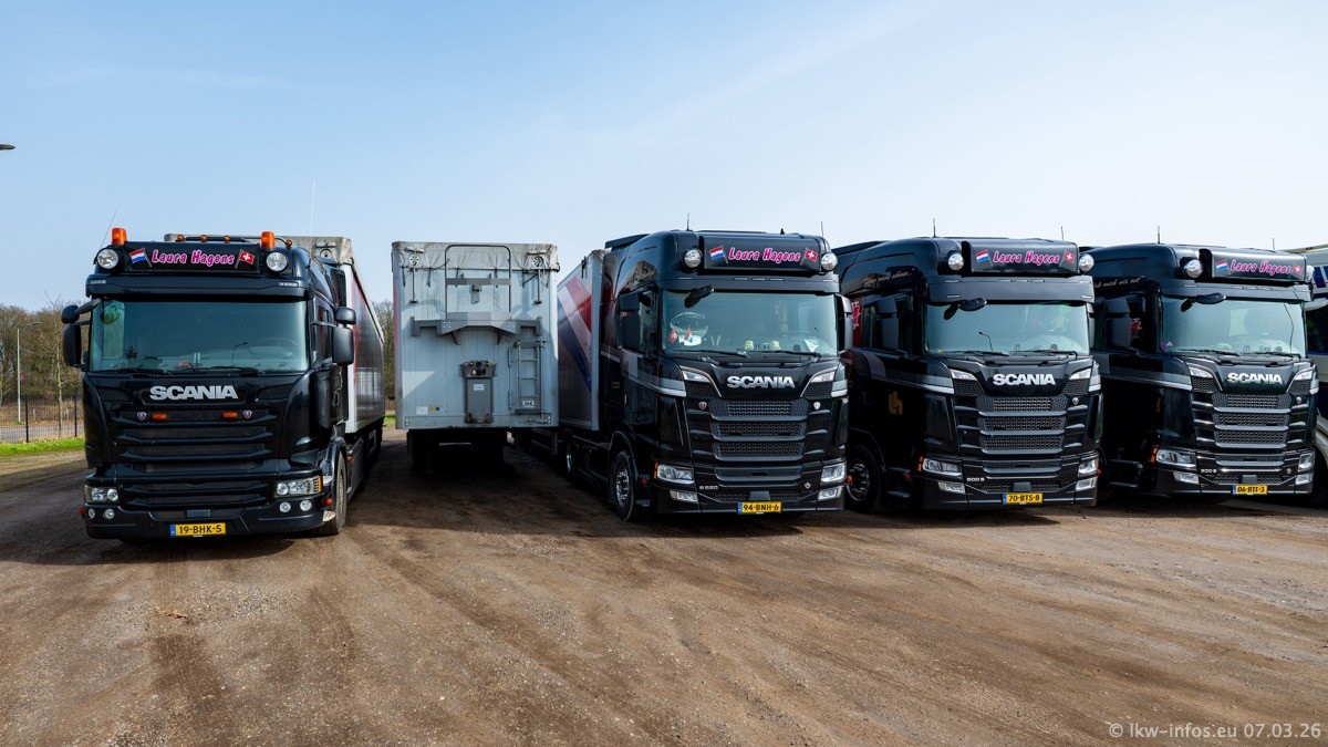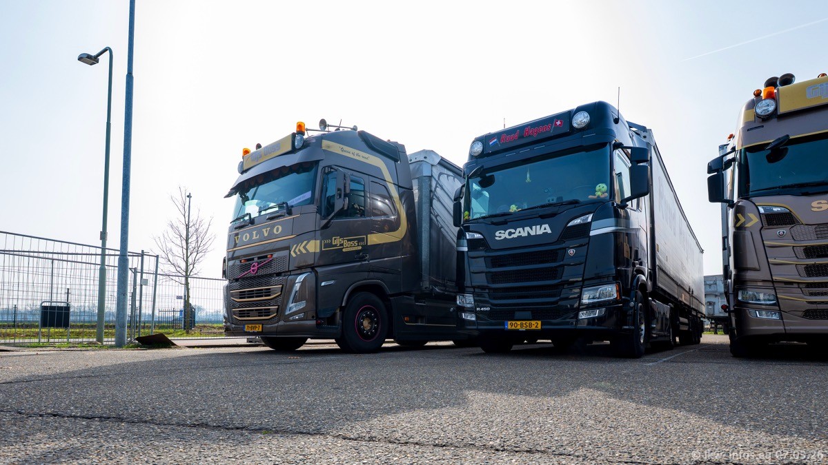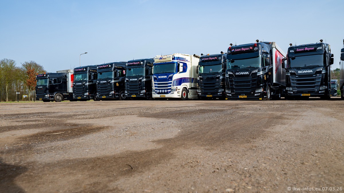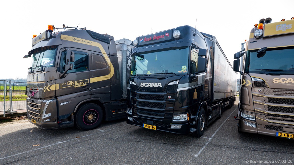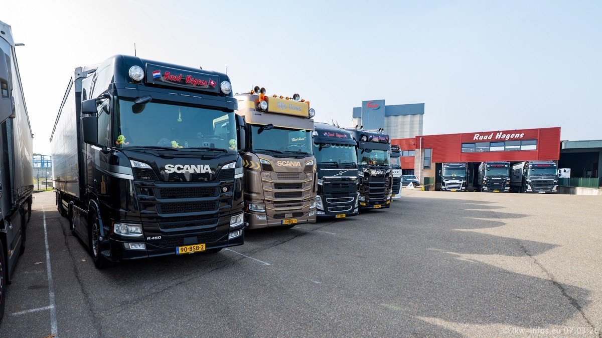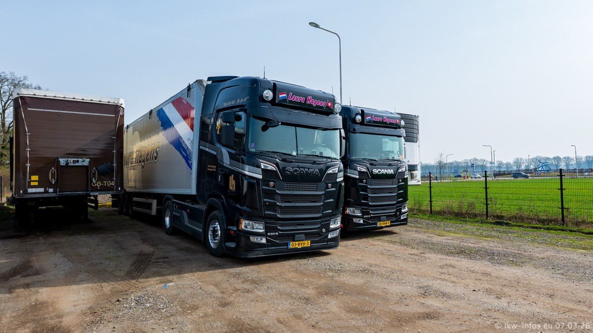 Die LKW von Laura Hagens stehen jetzt auf dem Parkplatz gegenüber vom Firmengelände. Gijs Boss hat das Büro in Venlo aufgelöst und die "alten" LKW stehen jetzt auch in Wanssum. Darum musste ein Teil der LKW auf den zweiten Parkplatz, weil es sowieso schon viel zu eng ist auf dem Firmenhof. Es gibt einen weiteren neuen VOLVO FH Aero, der seit Anfang Januar fährt.