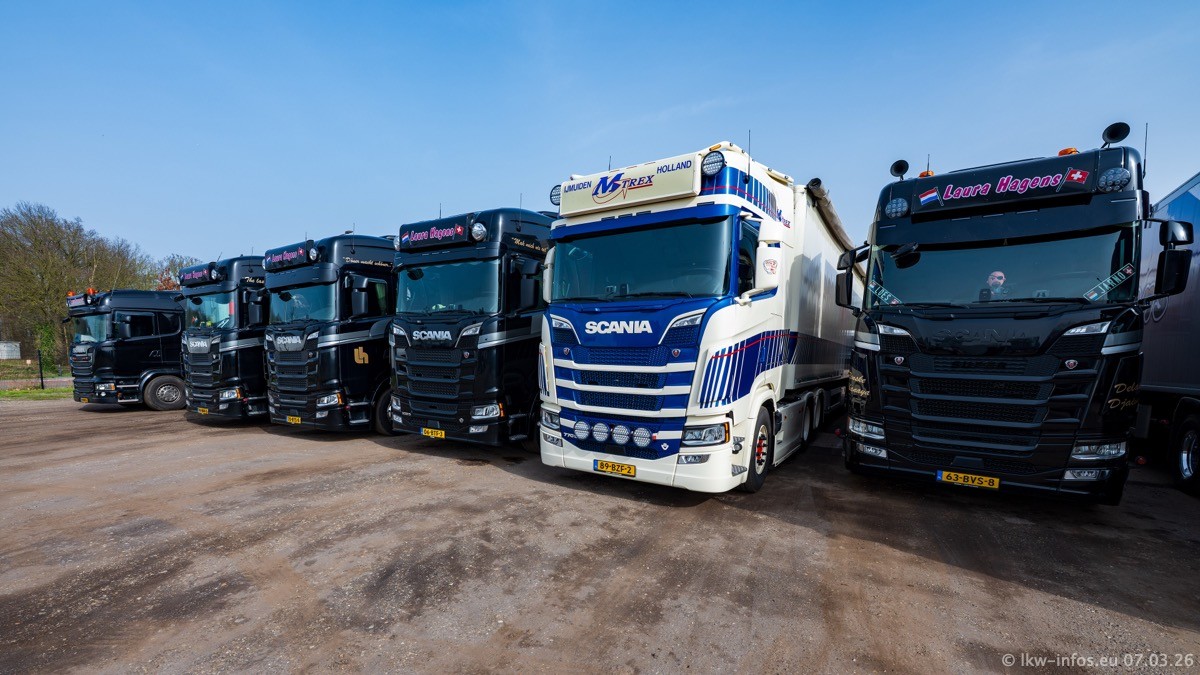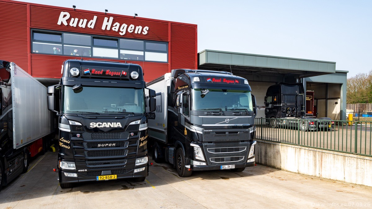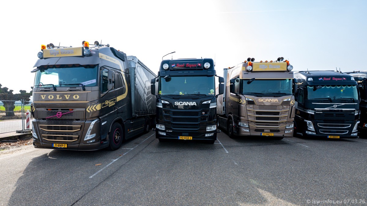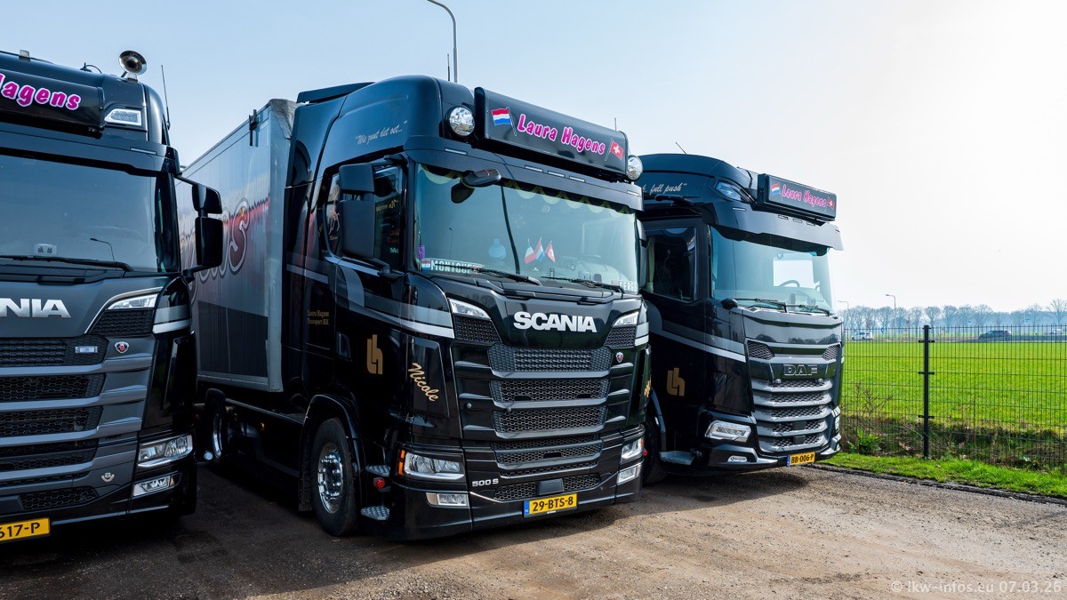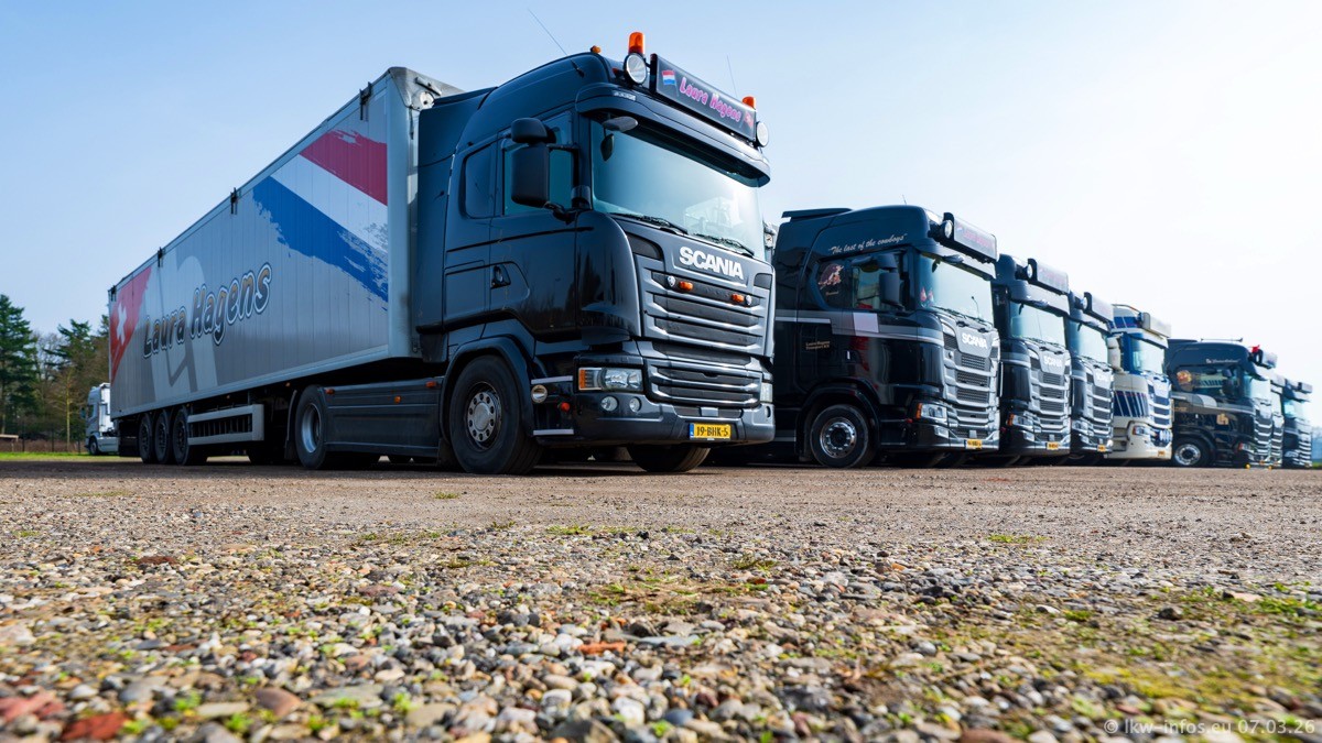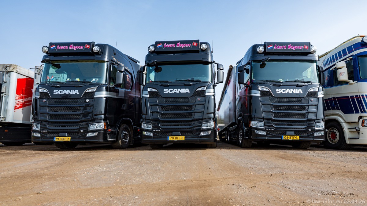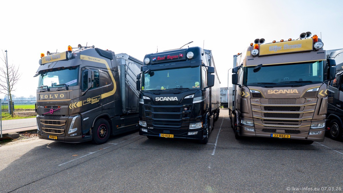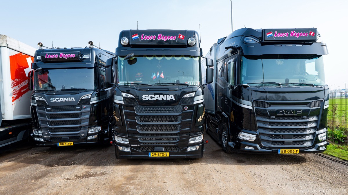 Die LKW von Laura Hagens stehen jetzt auf dem Parkplatz gegenüber vom Firmengelände. Gijs Boss hat das Büro in Venlo aufgelöst und die "alten" LKW stehen jetzt auch in Wanssum. Darum musste ein Teil der LKW auf den zweiten Parkplatz, weil es sowieso schon viel zu eng ist auf dem Firmenhof. Es gibt einen weiteren neuen VOLVO FH Aero, der seit Anfang Januar fährt.