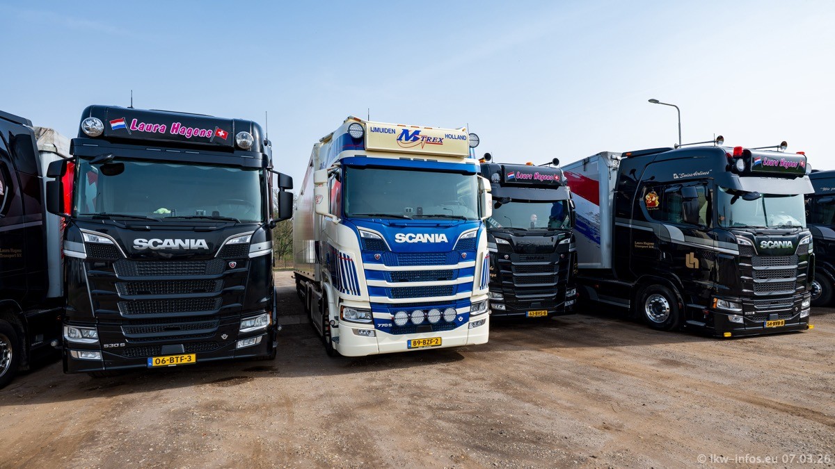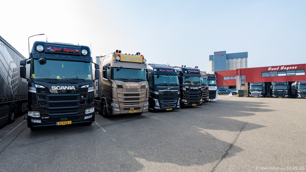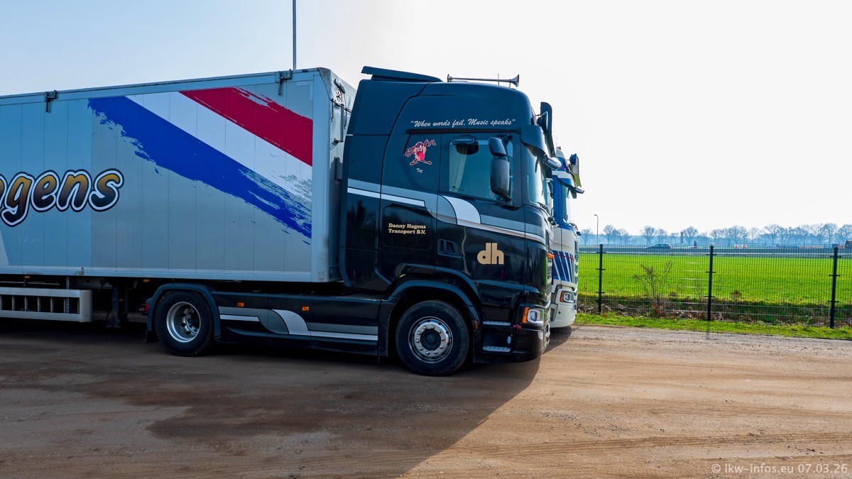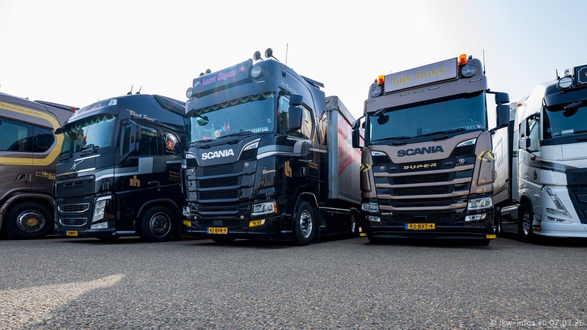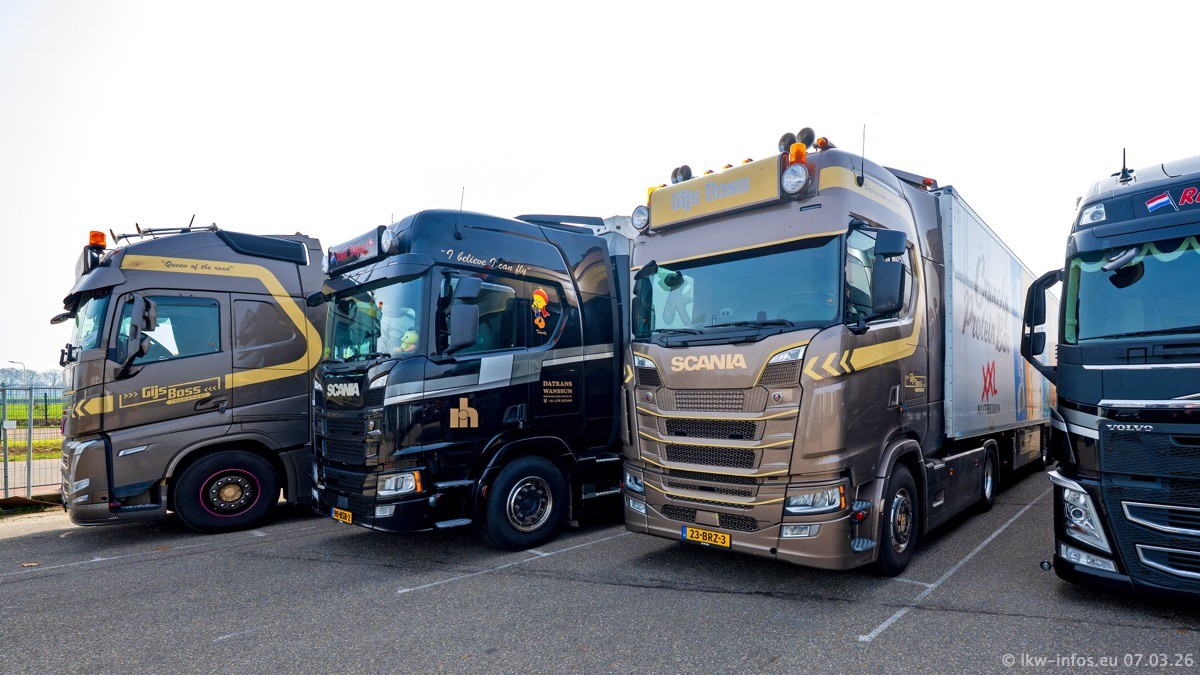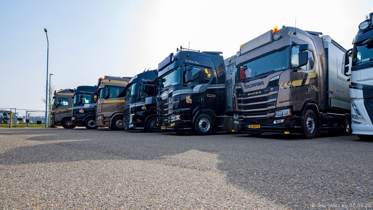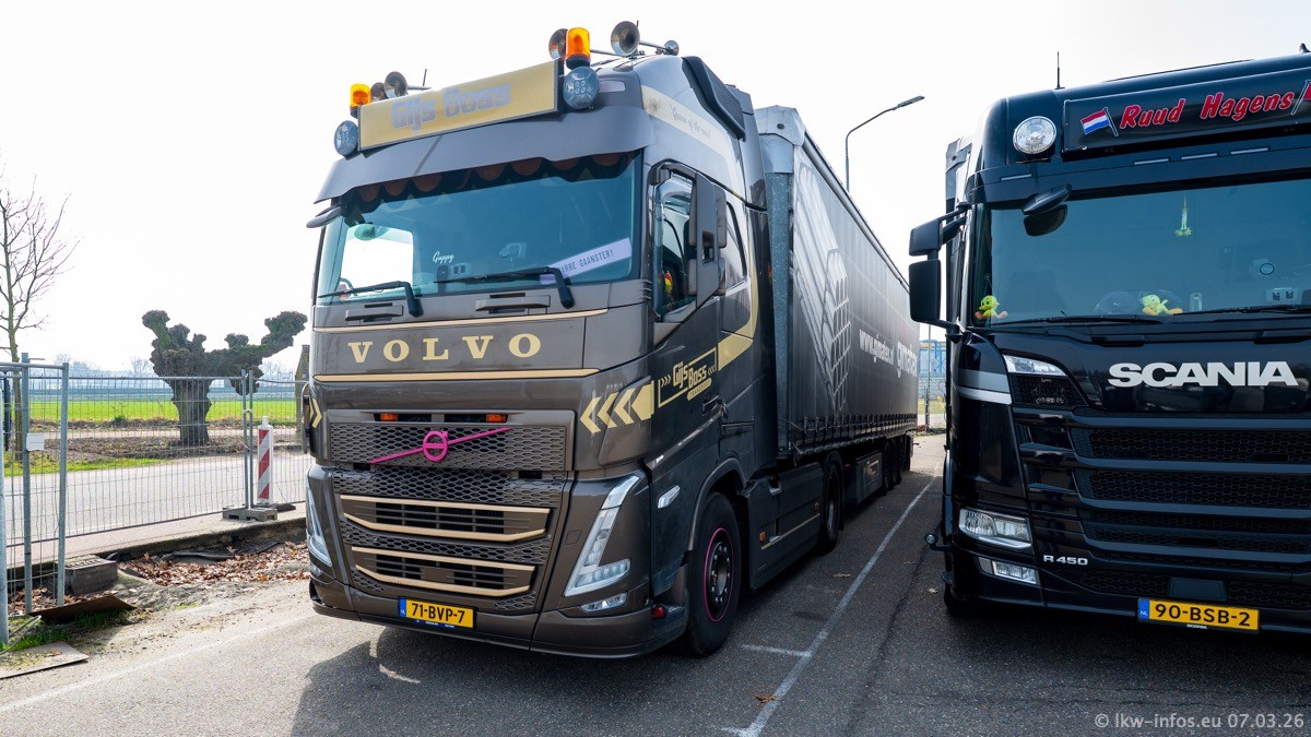 Die LKW von Laura Hagens stehen jetzt auf dem Parkplatz gegenüber vom Firmengelände. Gijs Boss hat das Büro in Venlo aufgelöst und die "alten" LKW stehen jetzt auch in Wanssum. Darum musste ein Teil der LKW auf den zweiten Parkplatz, weil es sowieso schon viel zu eng ist auf dem Firmenhof. Es gibt einen weiteren neuen VOLVO FH Aero, der seit Anfang Januar fährt.