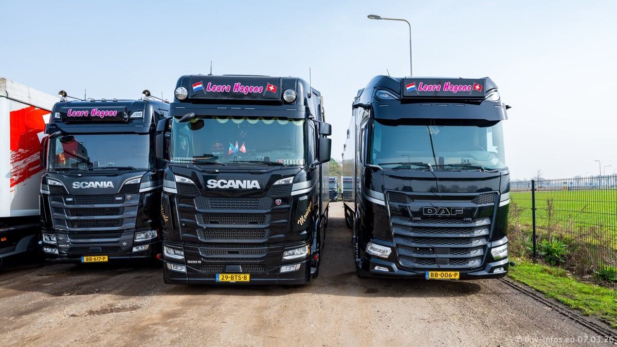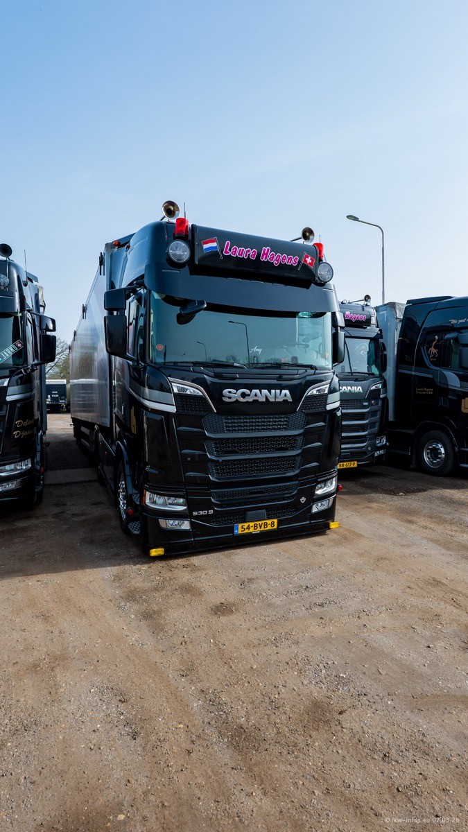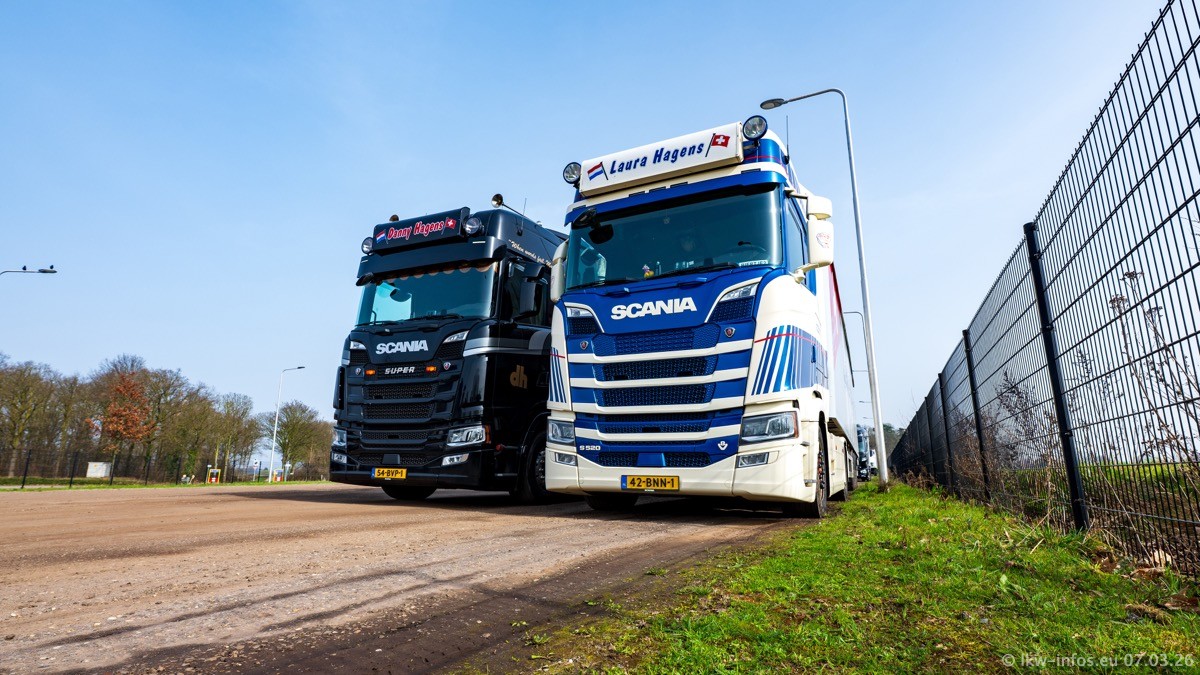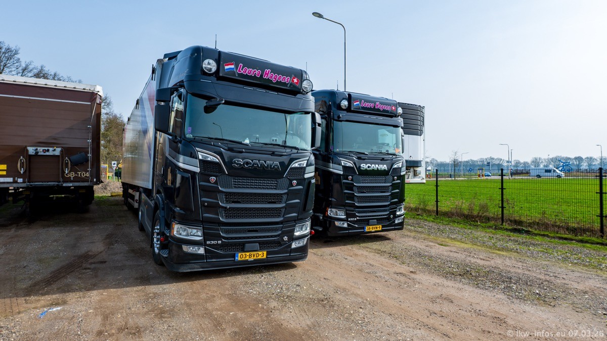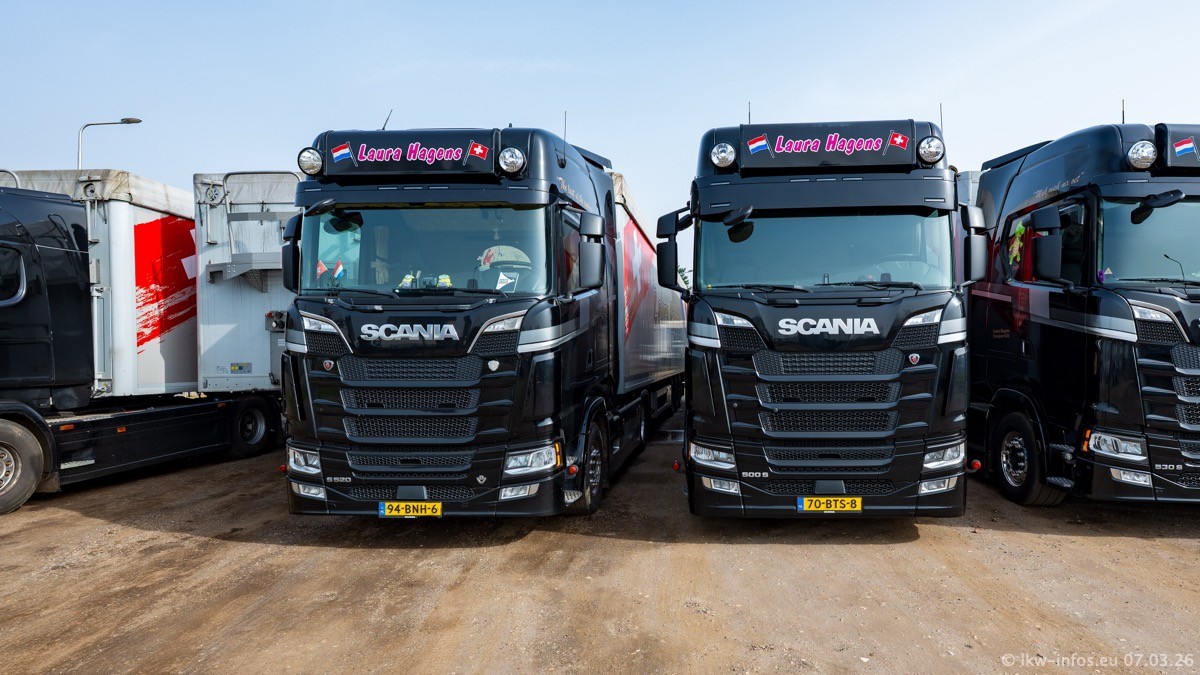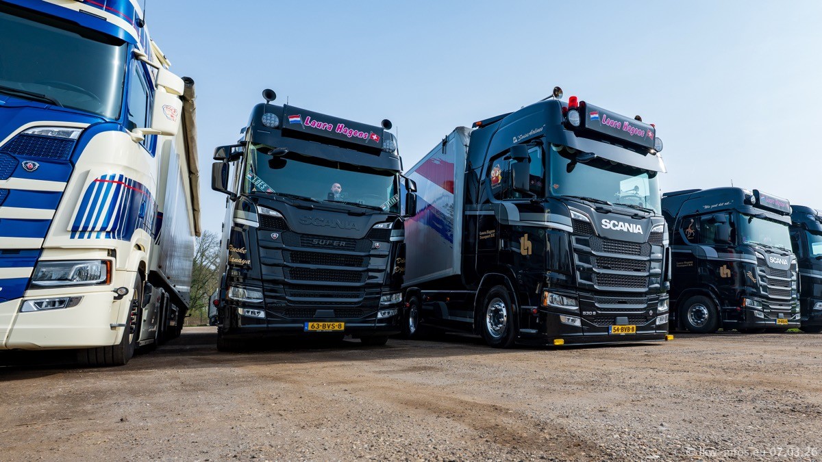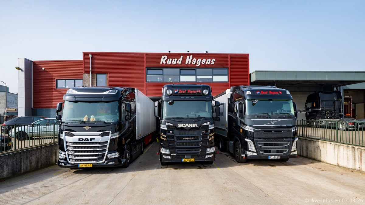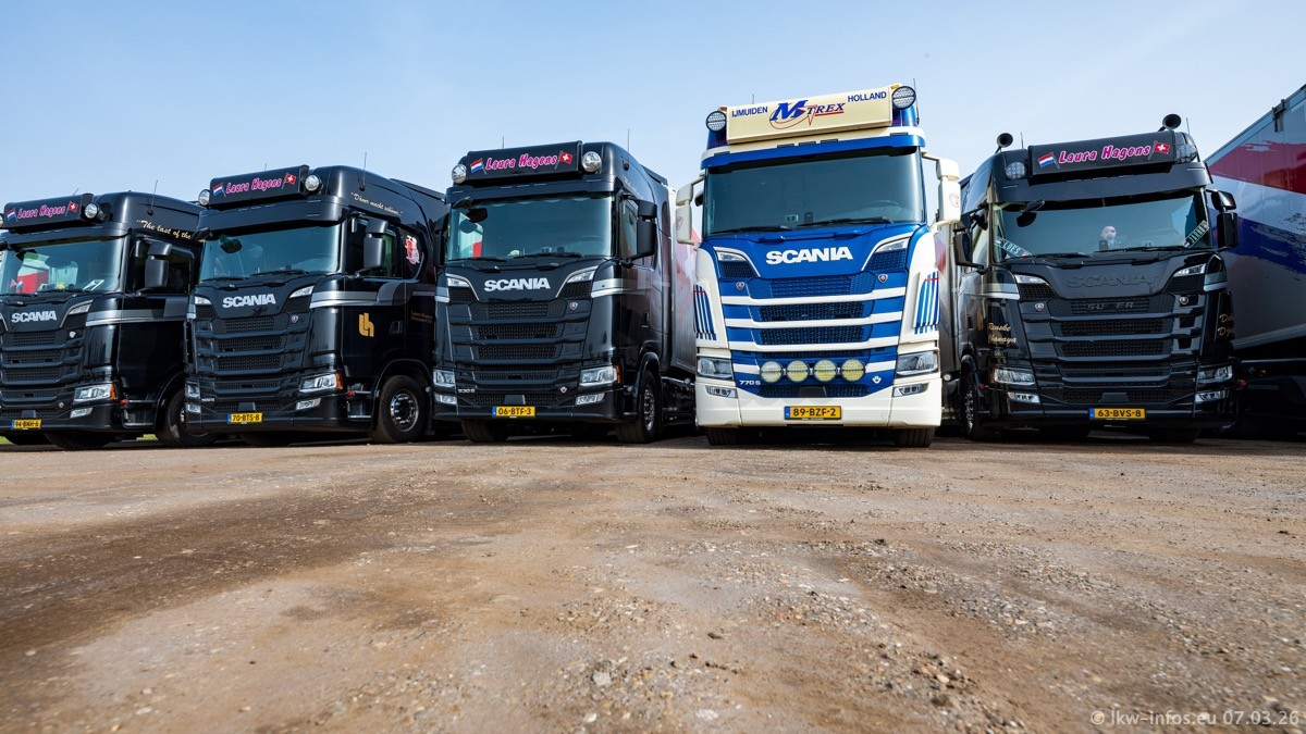 Die LKW von Laura Hagens stehen jetzt auf dem Parkplatz gegenüber vom Firmengelände. Gijs Boss hat das Büro in Venlo aufgelöst und die "alten" LKW stehen jetzt auch in Wanssum. Darum musste ein Teil der LKW auf den zweiten Parkplatz, weil es sowieso schon viel zu eng ist auf dem Firmenhof. Es gibt einen weiteren neuen VOLVO FH Aero, der seit Anfang Januar fährt.