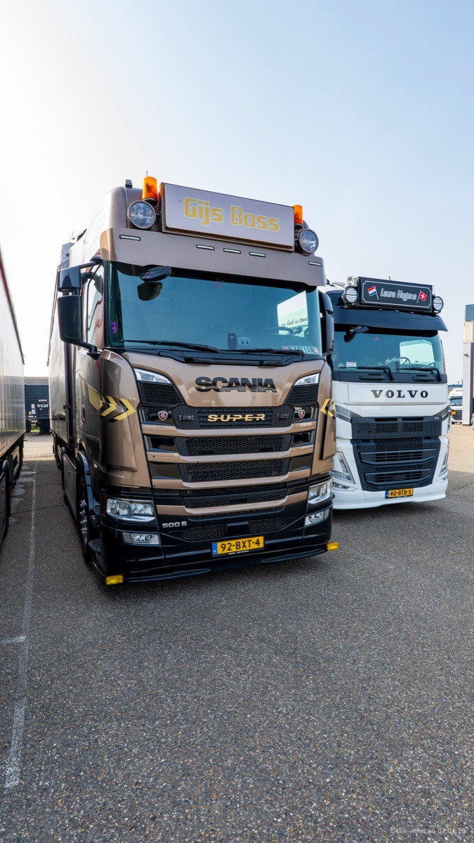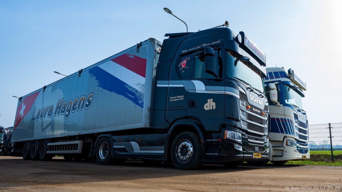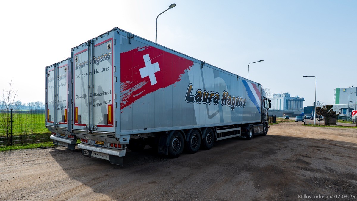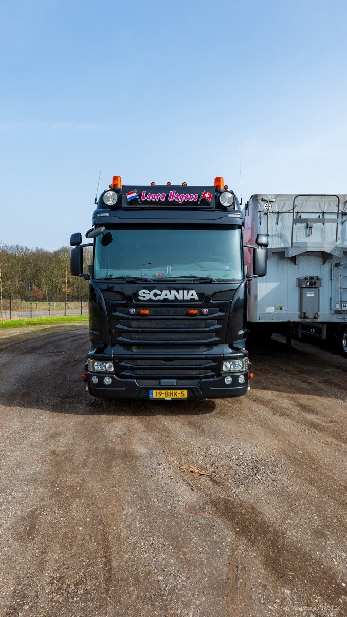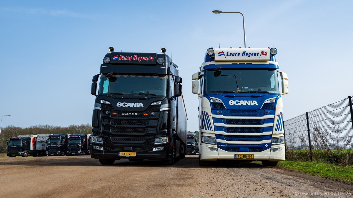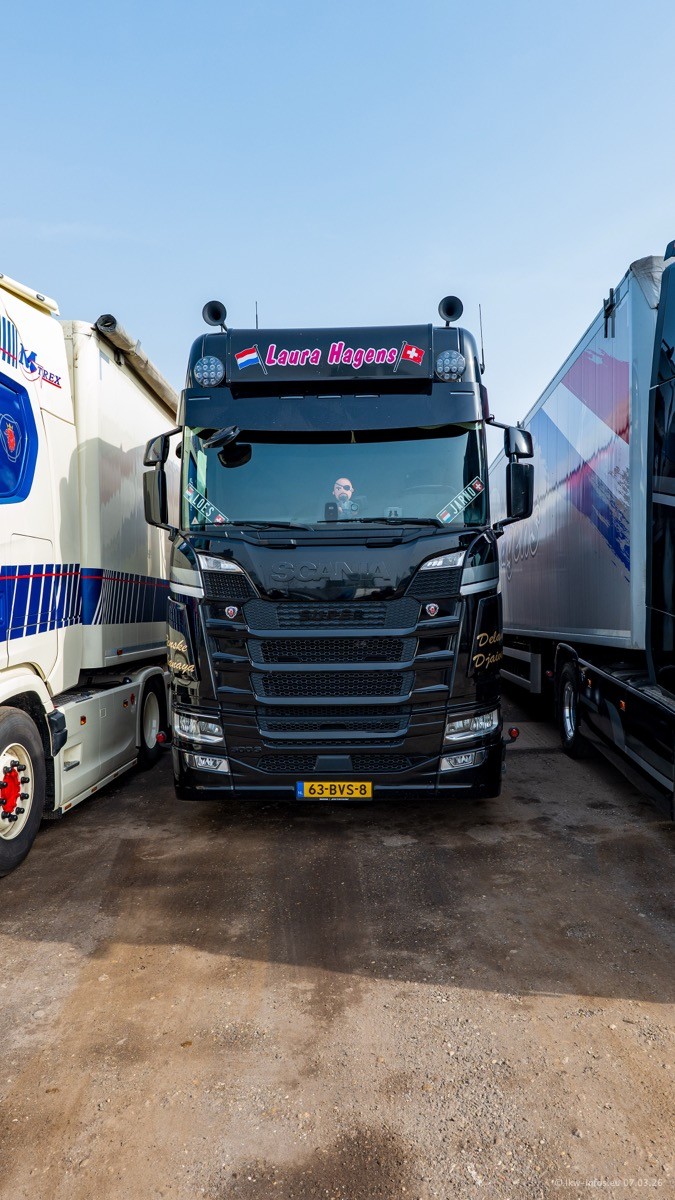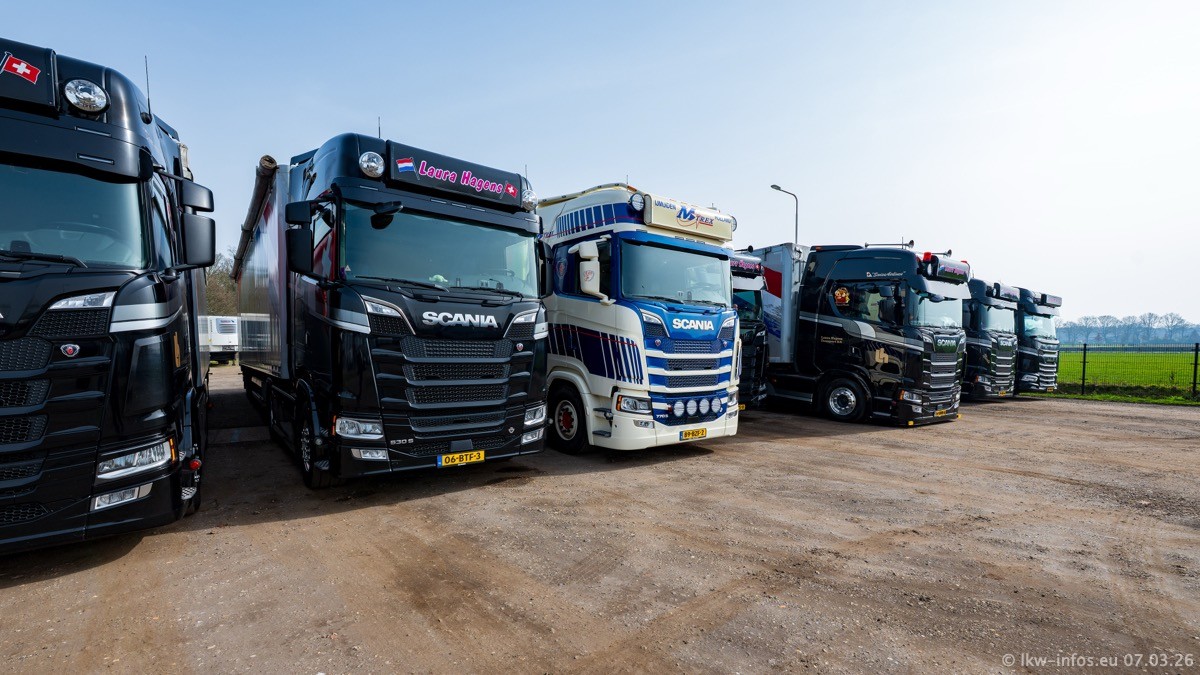 Die LKW von Laura Hagens stehen jetzt auf dem Parkplatz gegenüber vom Firmengelände. Gijs Boss hat das Büro in Venlo aufgelöst und die "alten" LKW stehen jetzt auch in Wanssum. Darum musste ein Teil der LKW auf den zweiten Parkplatz, weil es sowieso schon viel zu eng ist auf dem Firmenhof. Es gibt einen weiteren neuen VOLVO FH Aero, der seit Anfang Januar fährt.