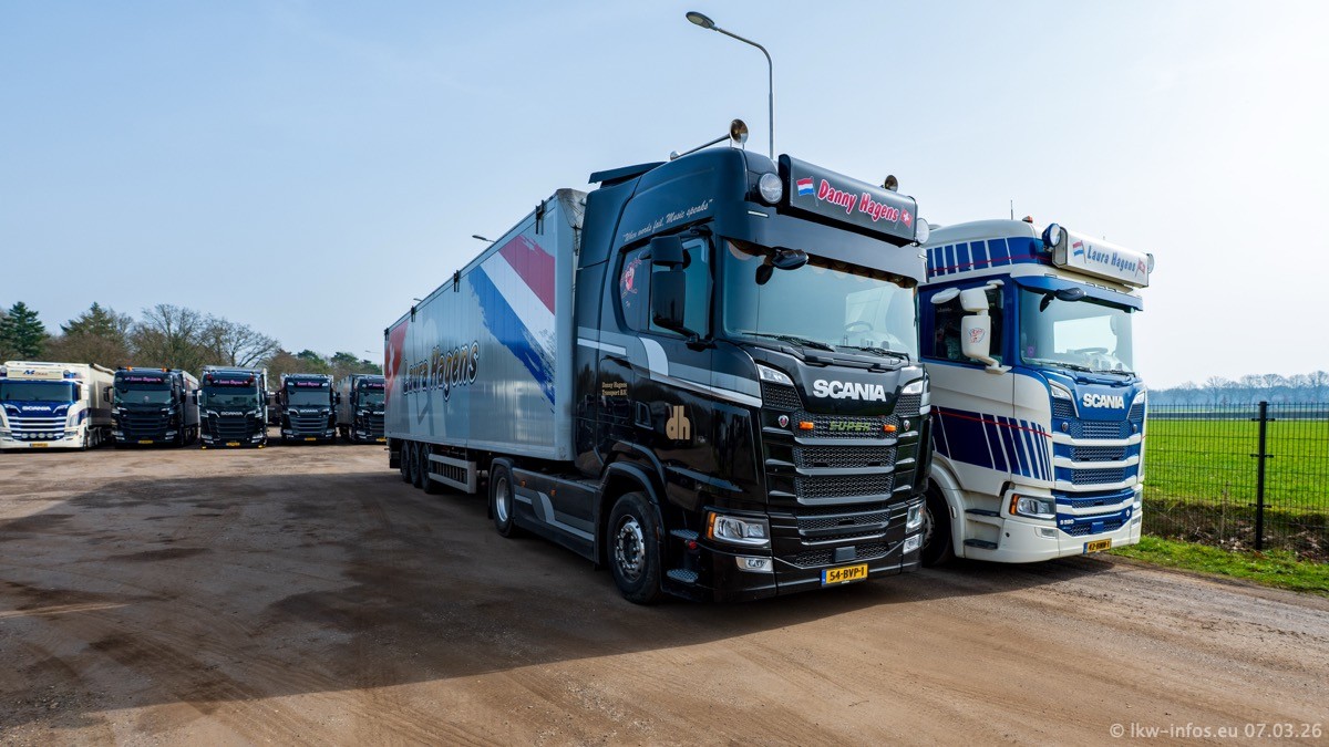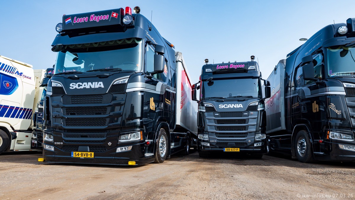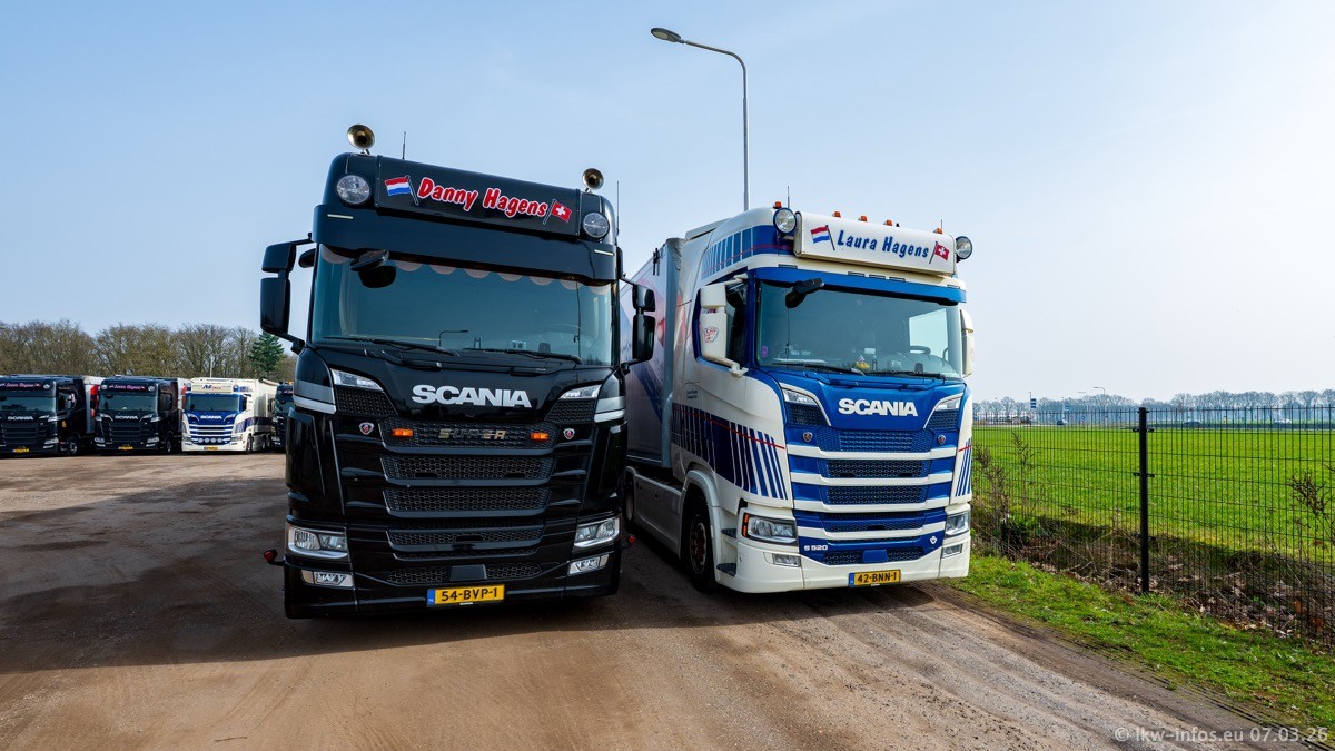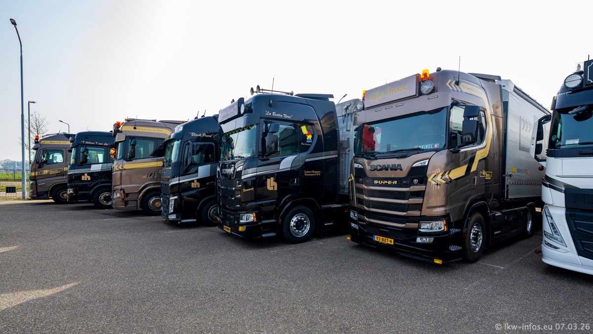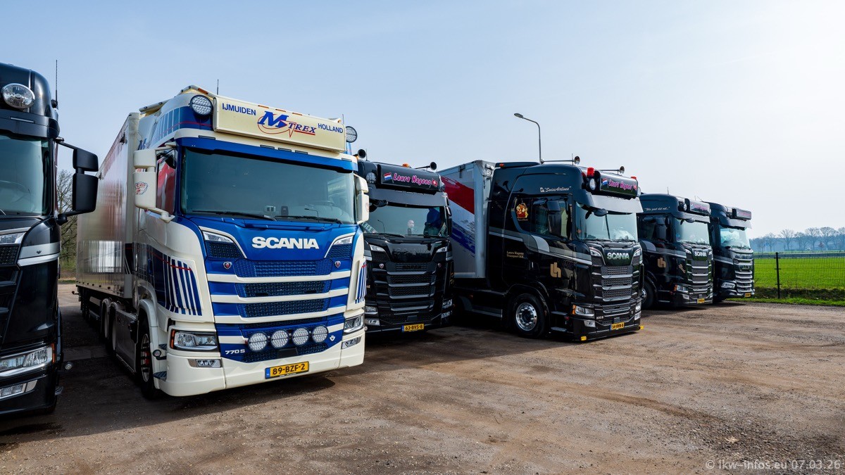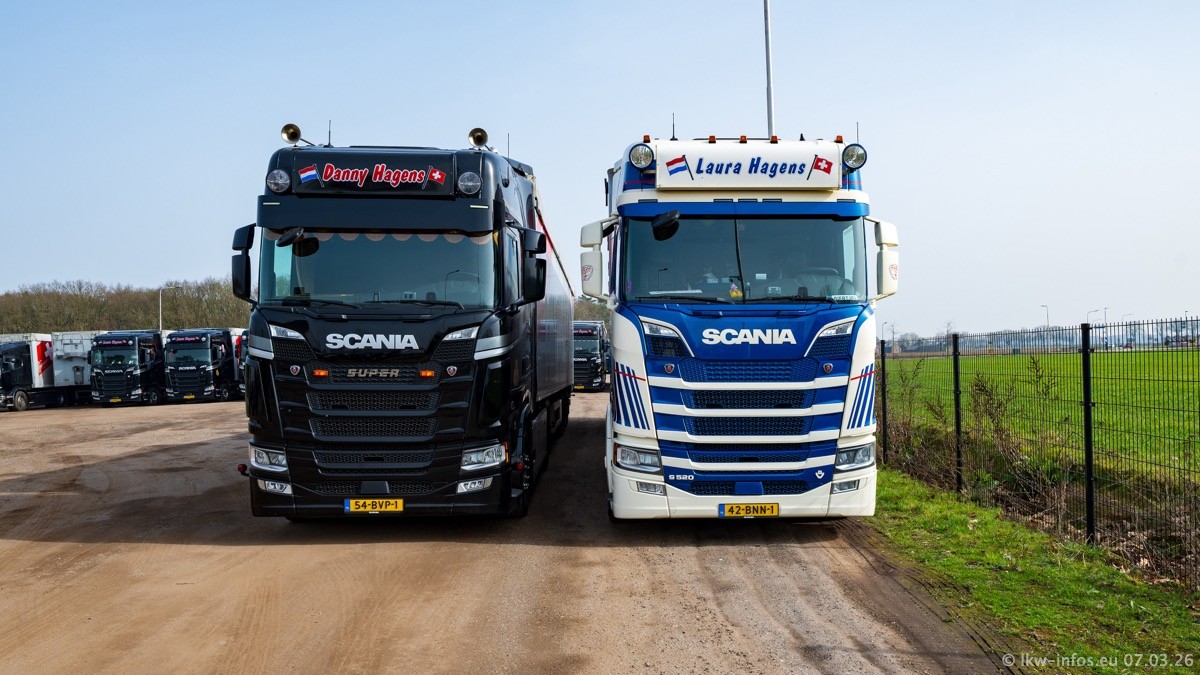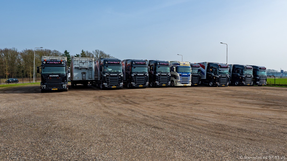 Die LKW von Laura Hagens stehen jetzt auf dem Parkplatz gegenüber vom Firmengelände. Gijs Boss hat das Büro in Venlo aufgelöst und die "alten" LKW stehen jetzt auch in Wanssum. Darum musste ein Teil der LKW auf den zweiten Parkplatz, weil es sowieso schon viel zu eng ist auf dem Firmenhof. Es gibt einen weiteren neuen VOLVO FH Aero, der seit Anfang Januar fährt.