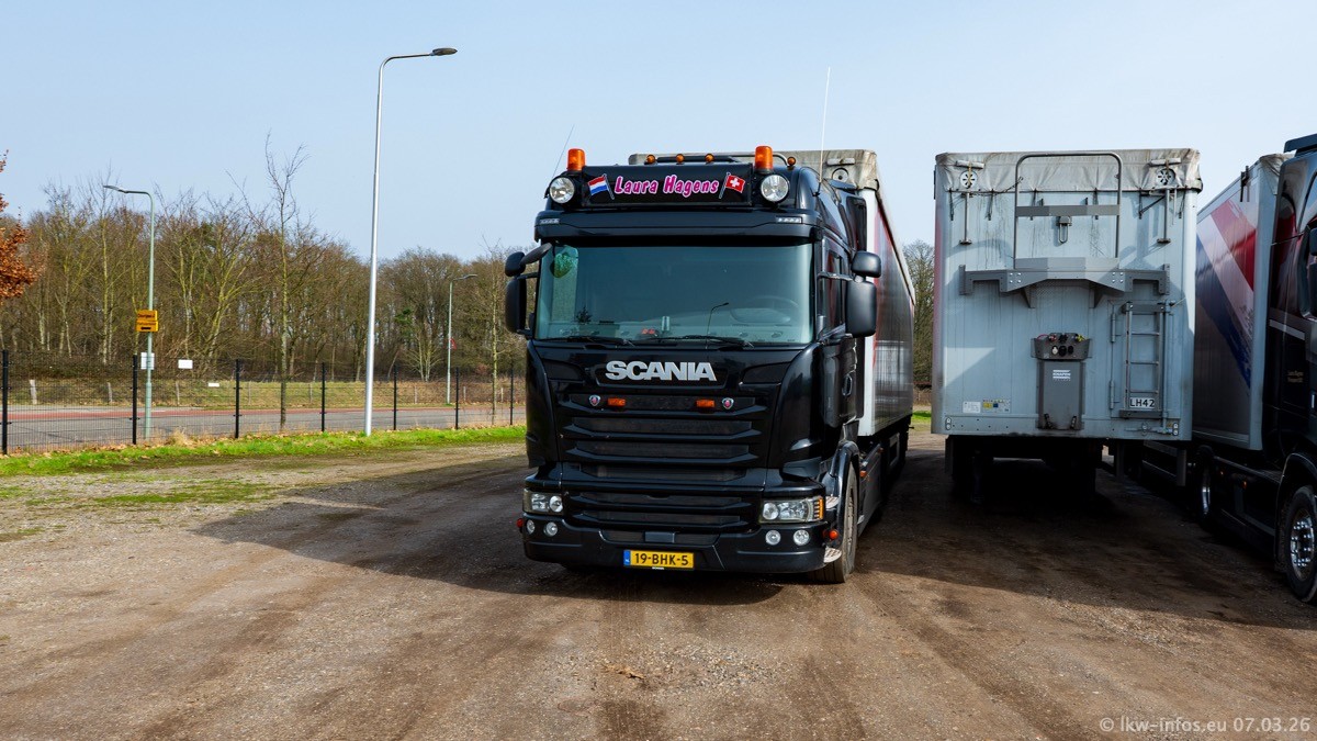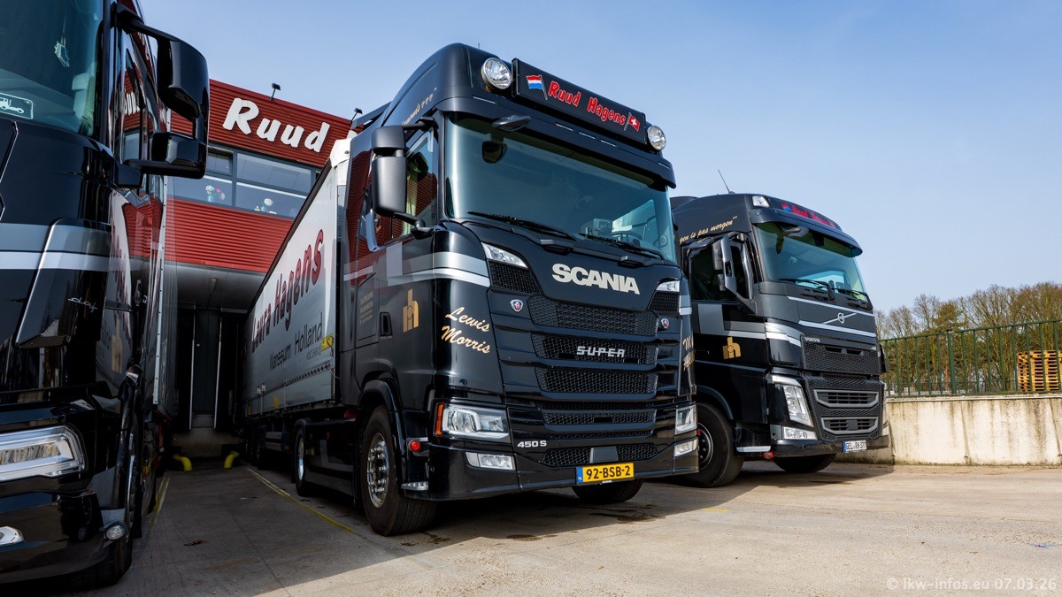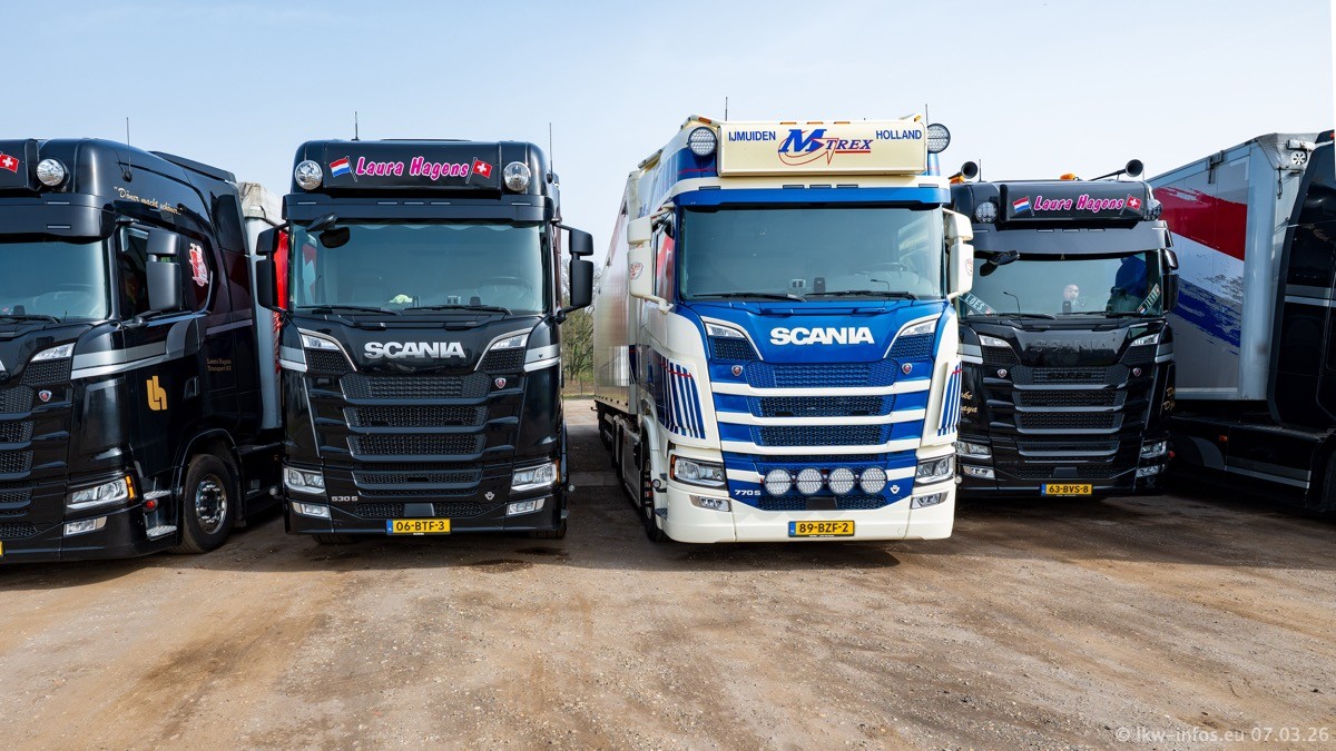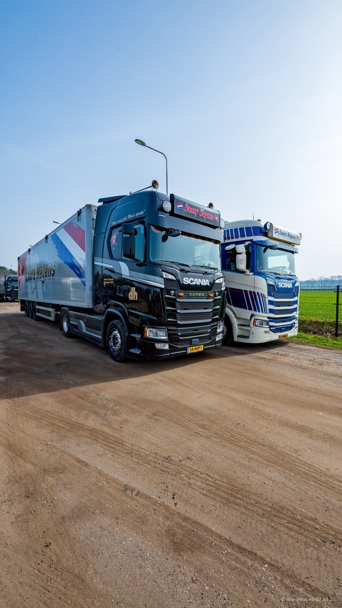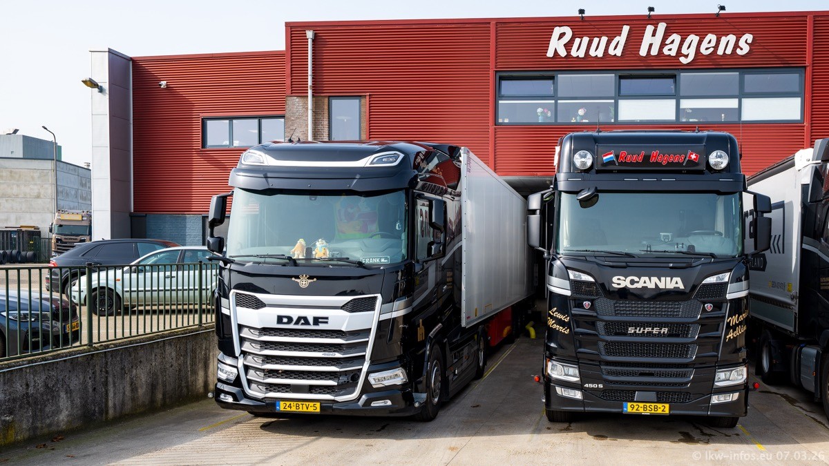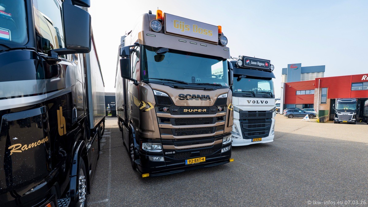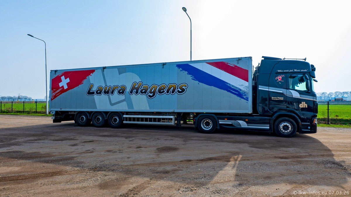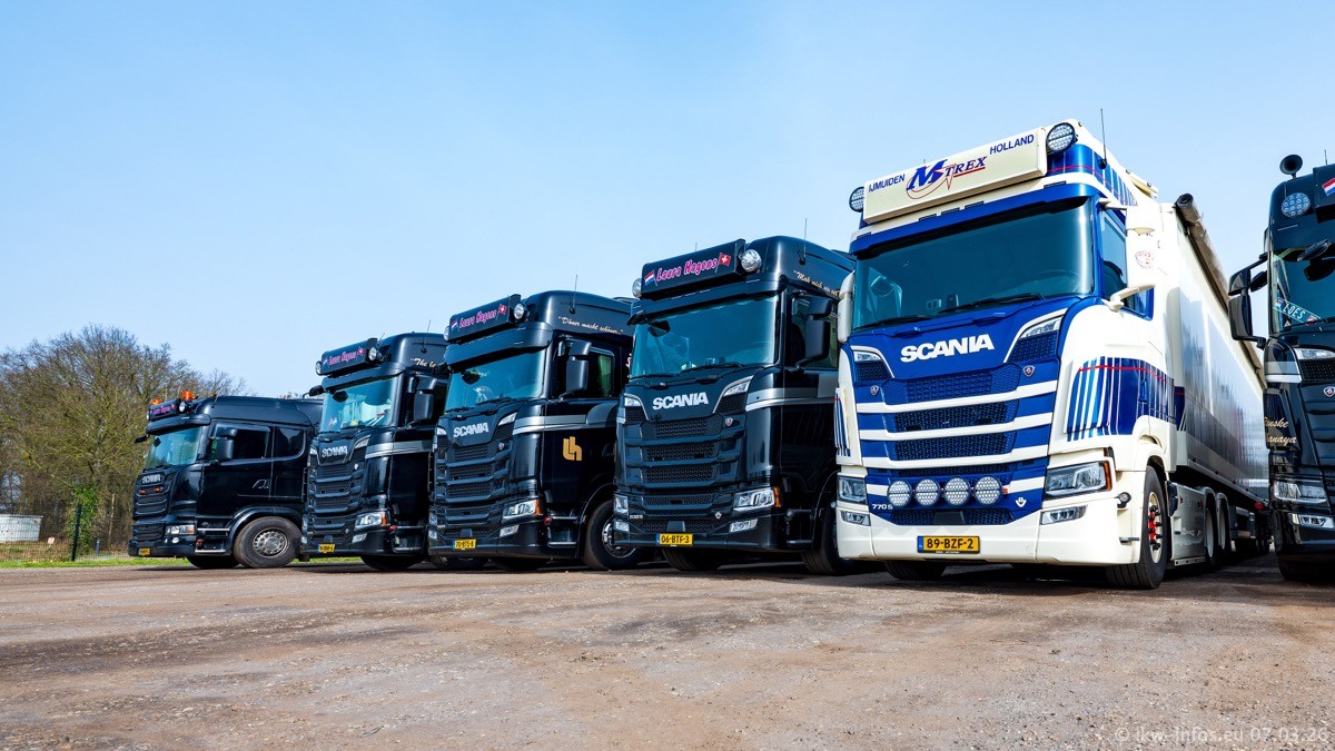 Die LKW von Laura Hagens stehen jetzt auf dem Parkplatz gegenüber vom Firmengelände. Gijs Boss hat das Büro in Venlo aufgelöst und die "alten" LKW stehen jetzt auch in Wanssum. Darum musste ein Teil der LKW auf den zweiten Parkplatz, weil es sowieso schon viel zu eng ist auf dem Firmenhof. Es gibt einen weiteren neuen VOLVO FH Aero, der seit Anfang Januar fährt.