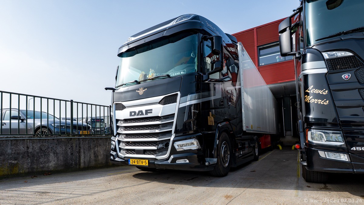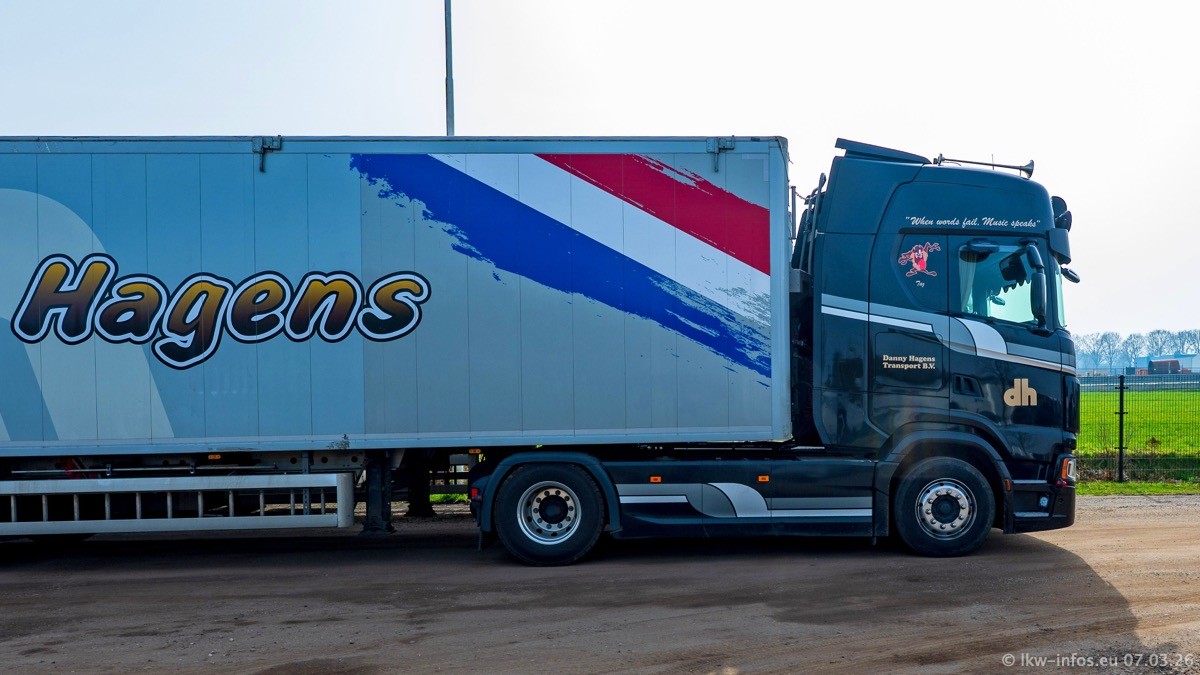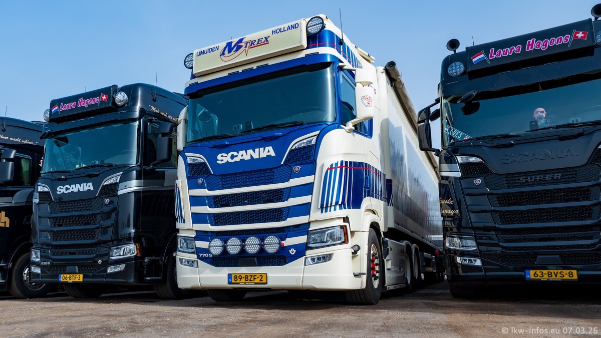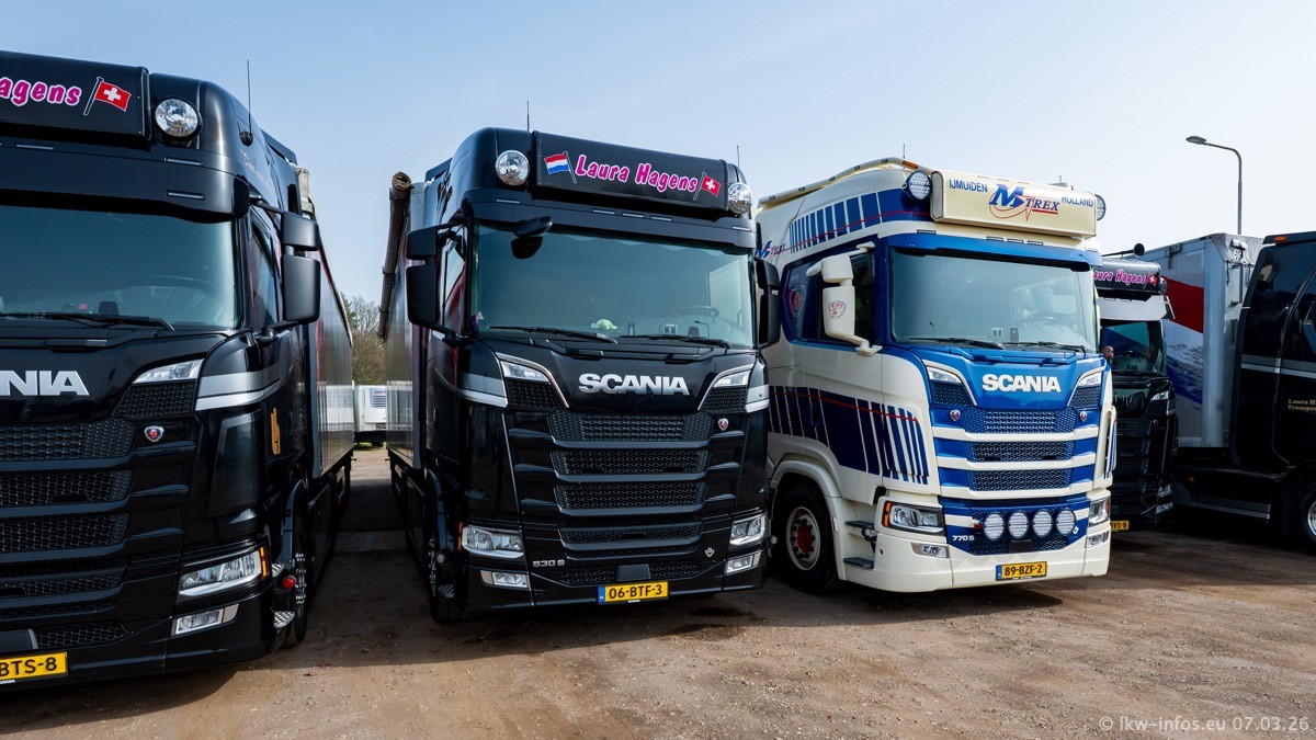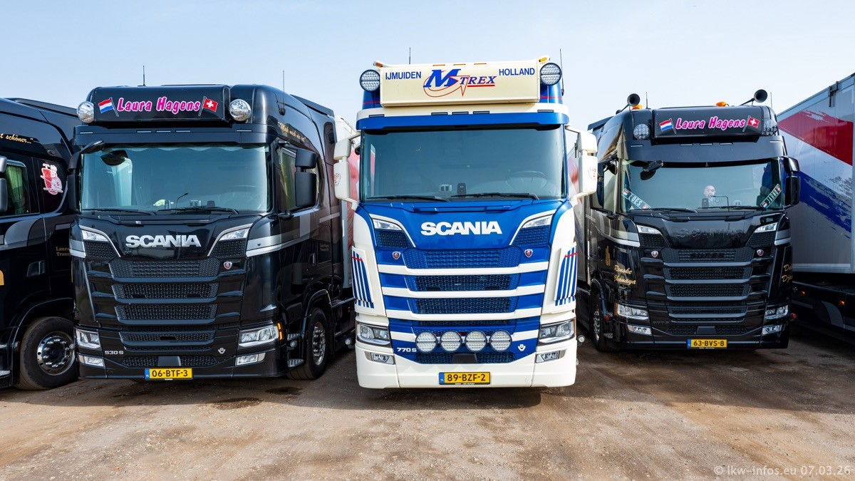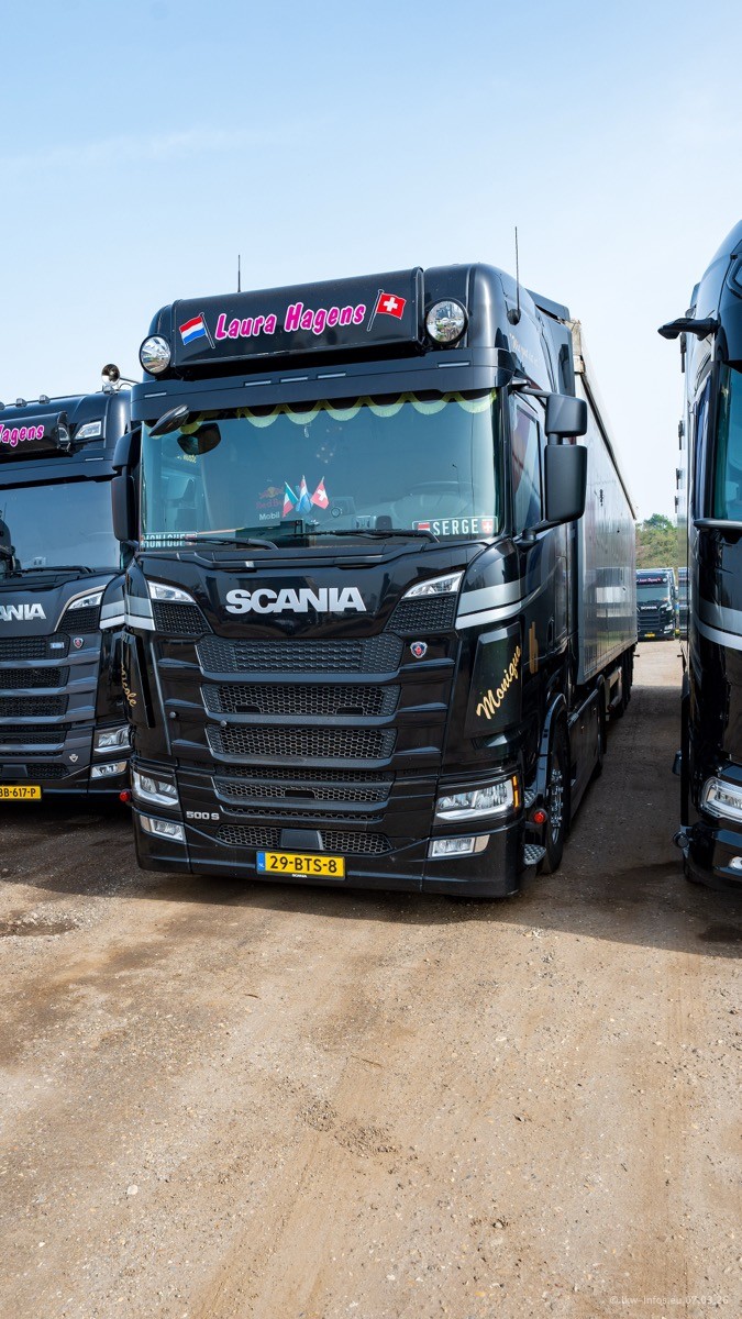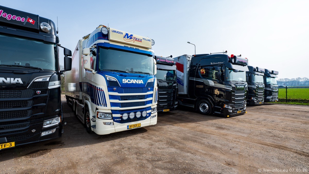 Die LKW von Laura Hagens stehen jetzt auf dem Parkplatz gegenüber vom Firmengelände. Gijs Boss hat das Büro in Venlo aufgelöst und die "alten" LKW stehen jetzt auch in Wanssum. Darum musste ein Teil der LKW auf den zweiten Parkplatz, weil es sowieso schon viel zu eng ist auf dem Firmenhof. Es gibt einen weiteren neuen VOLVO FH Aero, der seit Anfang Januar fährt.