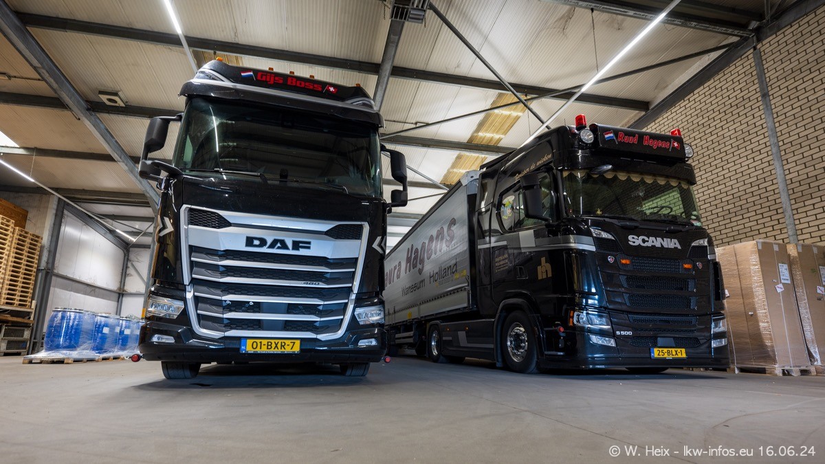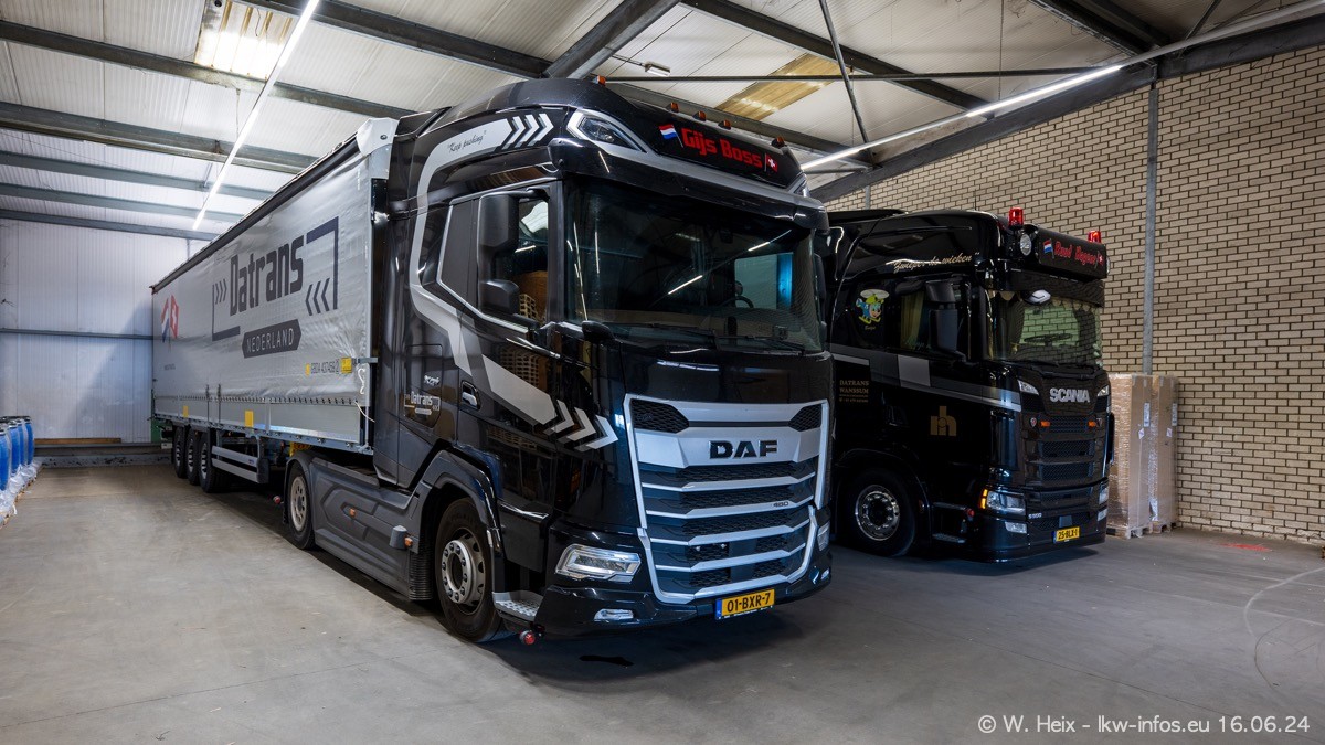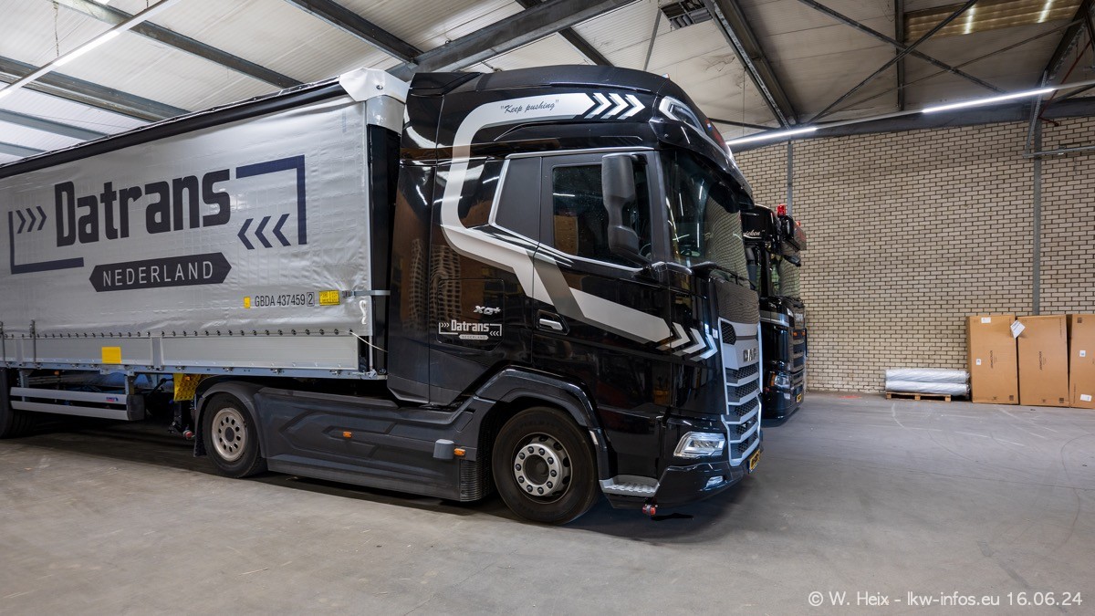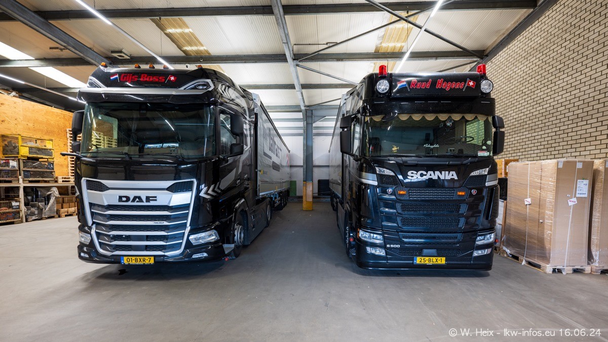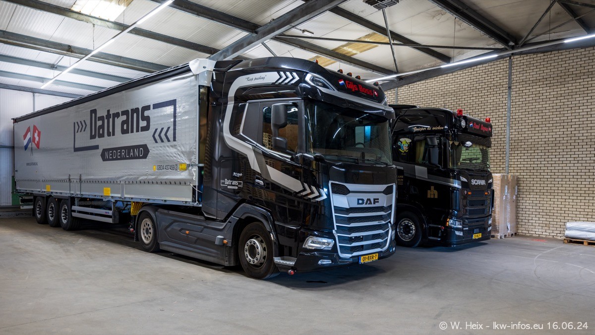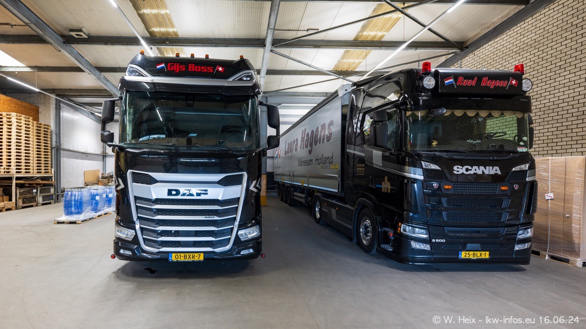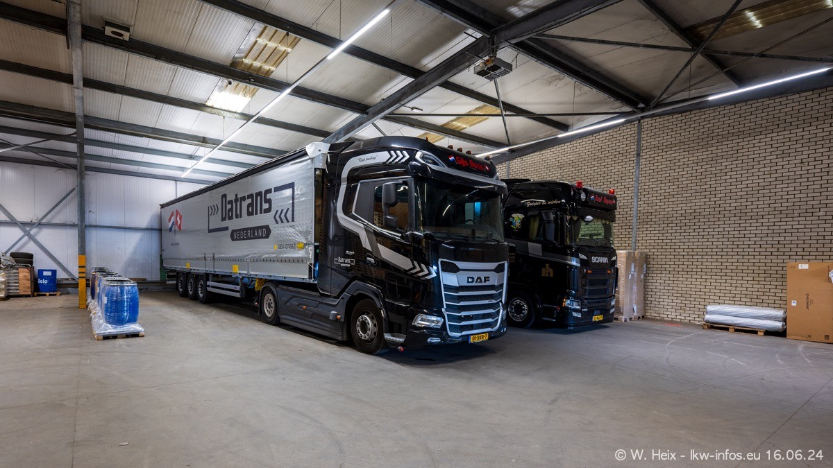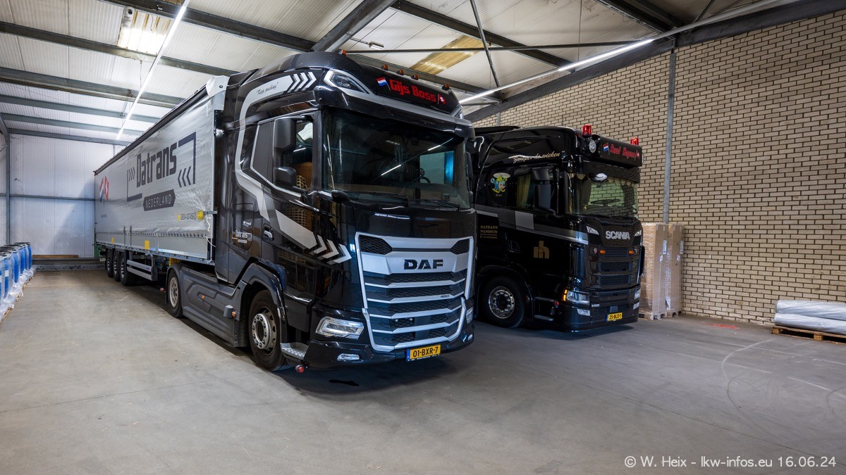 Ende Januar 2024 hat die Firma Gijs Boss die Fahrzeuge von Ruud Hagens Datrans B.V. übernommen. Das schwarze Design bleibt erhalten, den ersten neuen DAF XG+ mit neuem Aufleger, beschriftet mit "Datrans" gibt es auf den ersten Bildern in dieser Galerie zu sehen. Dazu kommen aktuell zwei weiße DAF XG+, die in Deutschland zugelassen sind (Moers MO, Kreis Wesel). Die Fahrzeuge in den bekannten Farben von Gijs Boss gibt es weiterhin. Diese stehen jedoch weiterhin verteilt bei Kunden oder Fahrern zuhause. Die zweite "neue" Firma ist jetzt Laura Hagens, Das ist bekanntlich die Tochter von Ruud Hagens. Unter dem Namen laufen alle SCANIA NextGen mit Schubboden/Walking-Floor Aufliegern. Die beiden M-Trex SCANIA gehören dazu. Alle Planenauflieger gehörten bisher Ruud Hagens Datrans B.V. Dazu kommen noch die IVECO S-Way, von Helene-Speed (Deutschland und Rumänien). Da sicherlich alle Fahrzeuge über länger Zeit noch "bunt gemischt" zu sehen sein werden, habe ich erstmal alles unter dem Namen Boss-Datrans & Laura Hagens zusammengefasst. Alle LKW werden auch weiterhin auf dem bekannten Gelände in Wanssum stehen.