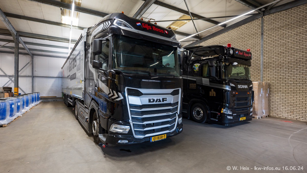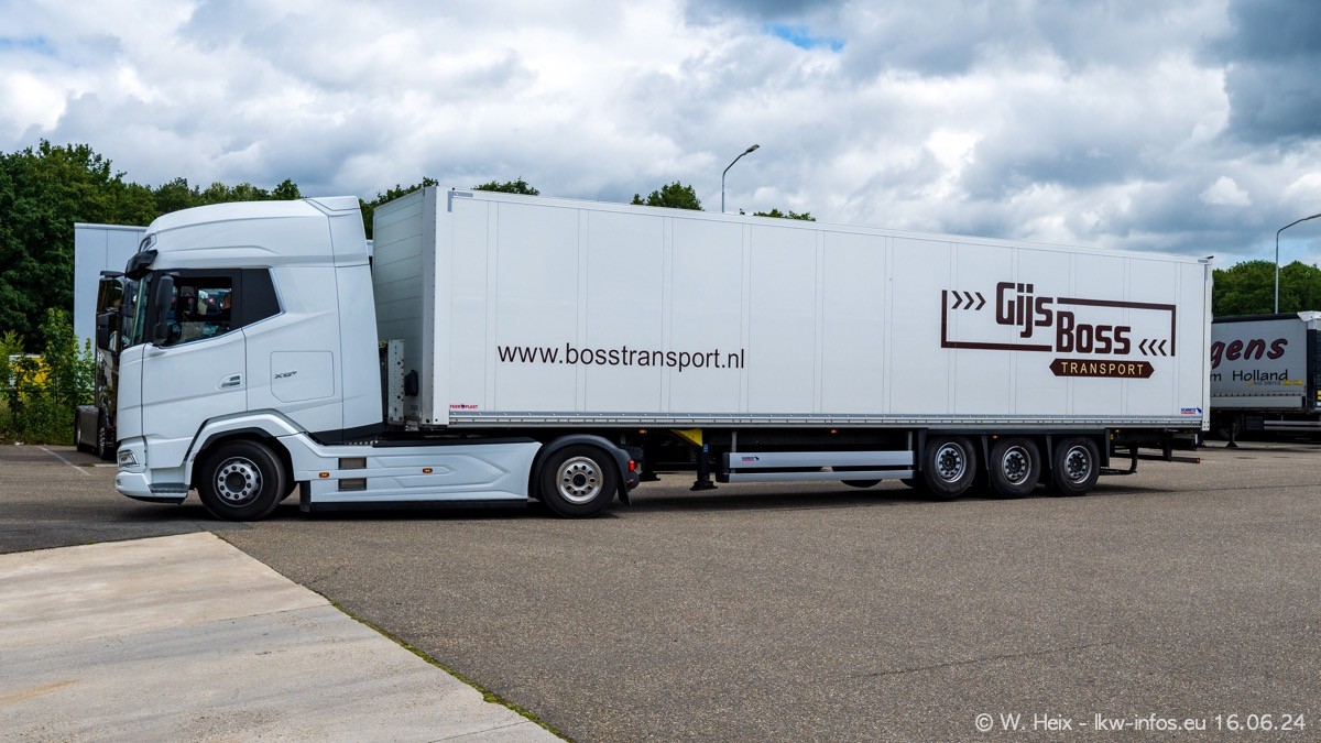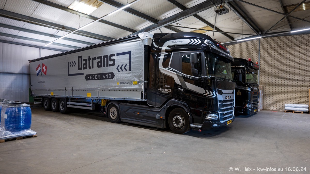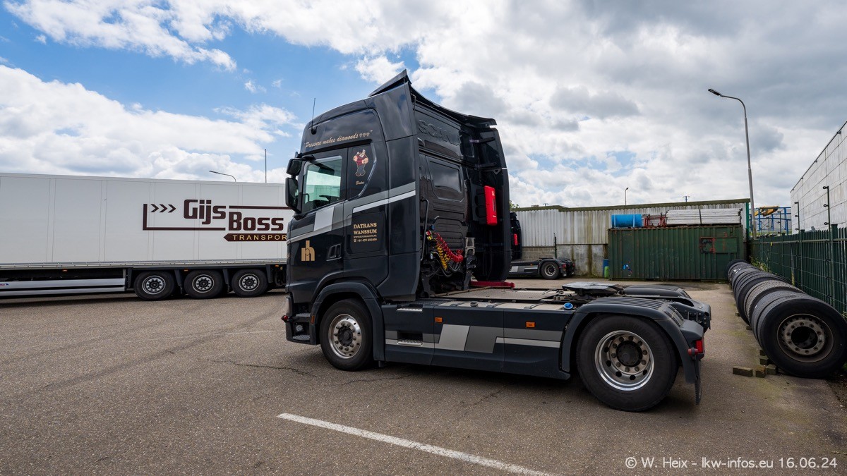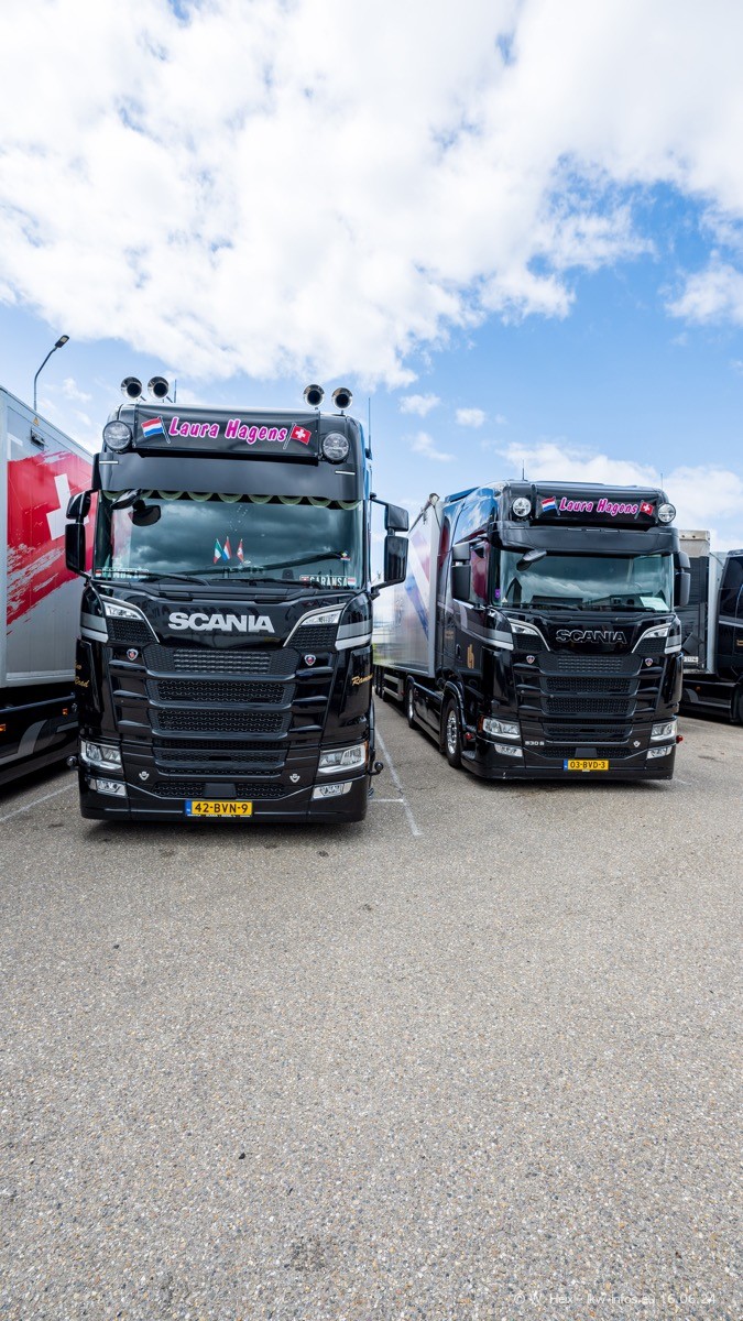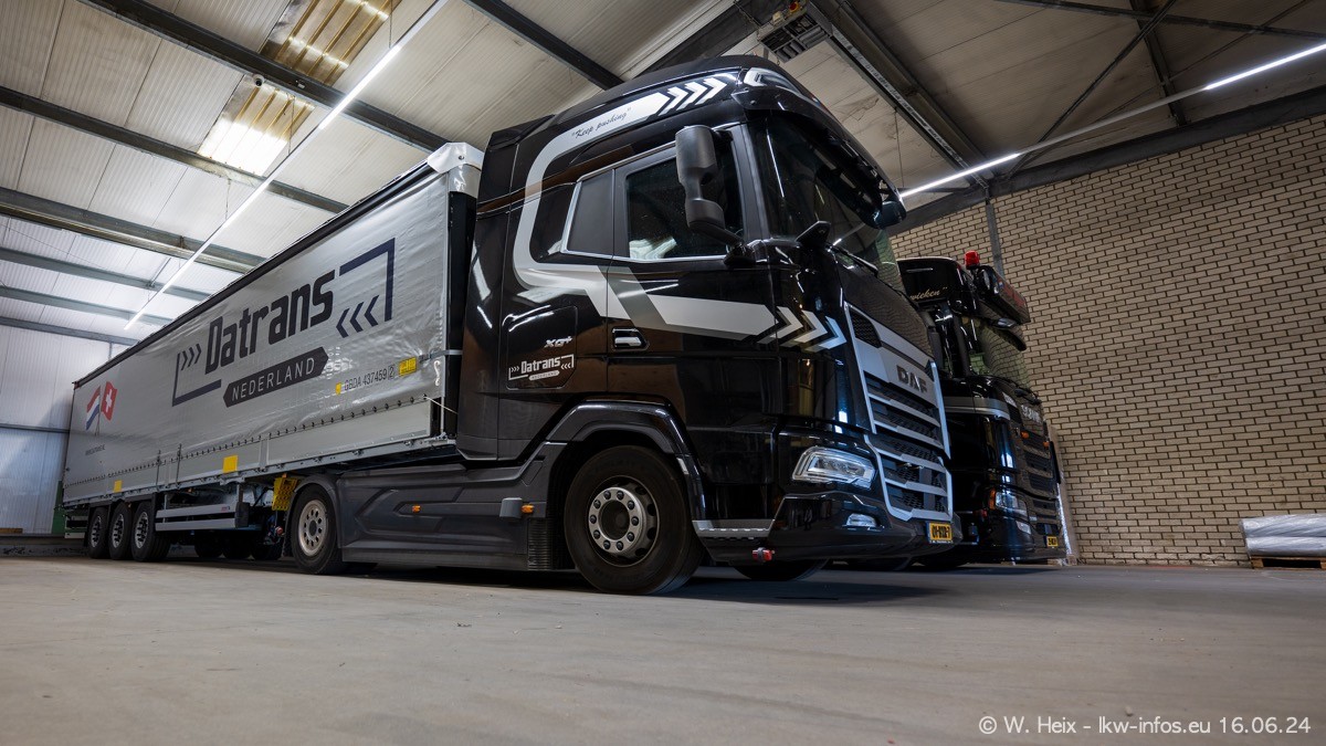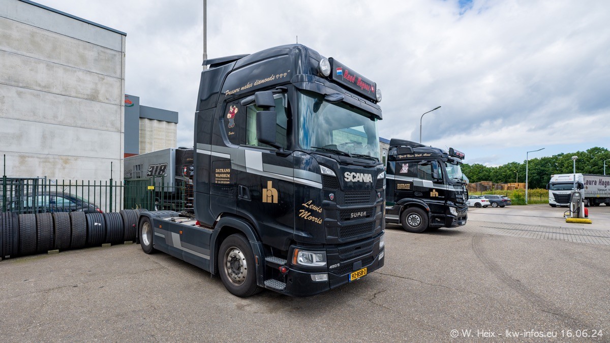 Ende Januar 2024 hat die Firma Gijs Boss die Fahrzeuge von Ruud Hagens Datrans B.V. übernommen. Das schwarze Design bleibt erhalten, den ersten neuen DAF XG+ mit neuem Aufleger, beschriftet mit "Datrans" gibt es auf den ersten Bildern in dieser Galerie zu sehen. Dazu kommen aktuell zwei weiße DAF XG+, die in Deutschland zugelassen sind (Moers MO, Kreis Wesel). Die Fahrzeuge in den bekannten Farben von Gijs Boss gibt es weiterhin. Diese stehen jedoch weiterhin verteilt bei Kunden oder Fahrern zuhause. Die zweite "neue" Firma ist jetzt Laura Hagens, Das ist bekanntlich die Tochter von Ruud Hagens. Unter dem Namen laufen alle SCANIA NextGen mit Schubboden/Walking-Floor Aufliegern. Die beiden M-Trex SCANIA gehören dazu. Alle Planenauflieger gehörten bisher Ruud Hagens Datrans B.V. Dazu kommen noch die IVECO S-Way, von Helene-Speed (Deutschland und Rumänien). Da sicherlich alle Fahrzeuge über länger Zeit noch "bunt gemischt" zu sehen sein werden, habe ich erstmal alles unter dem Namen Boss-Datrans & Laura Hagens zusammengefasst. Alle LKW werden auch weiterhin auf dem bekannten Gelände in Wanssum stehen.