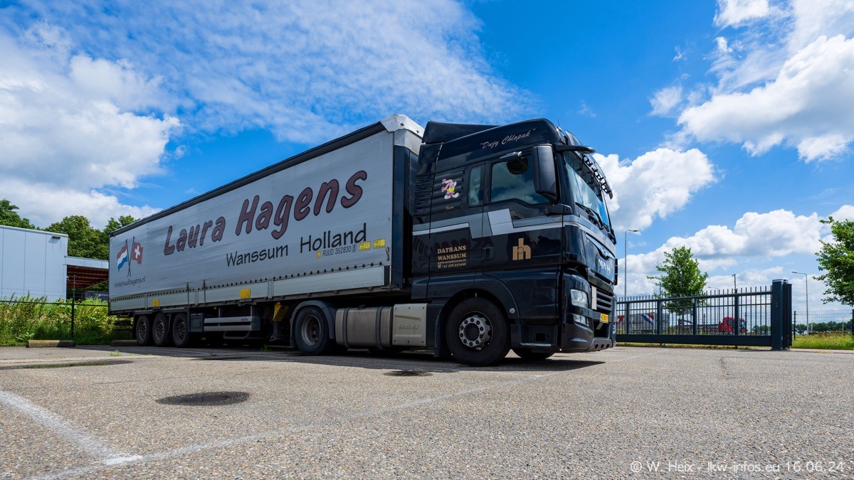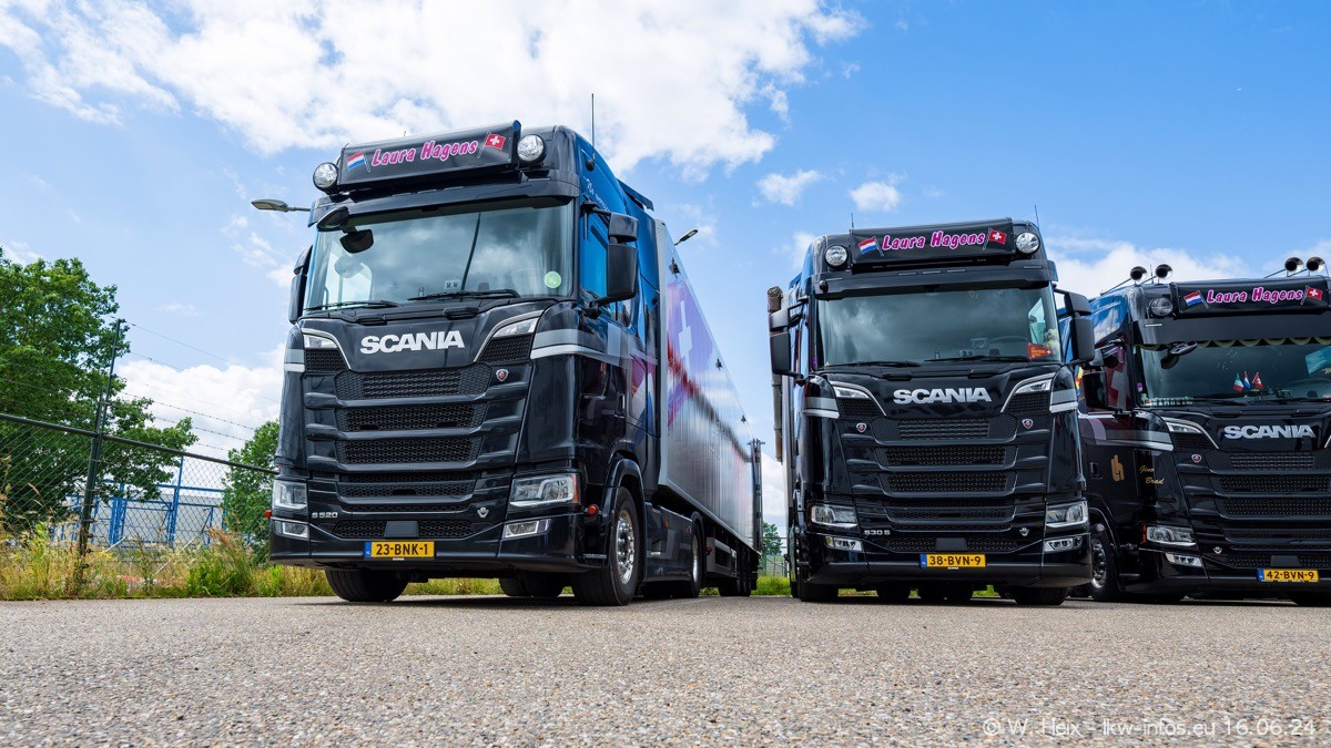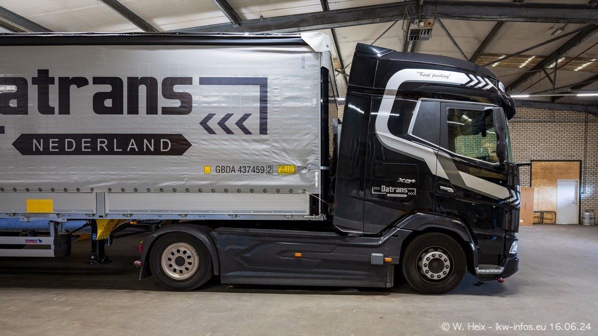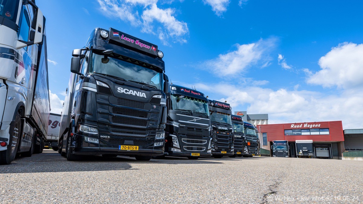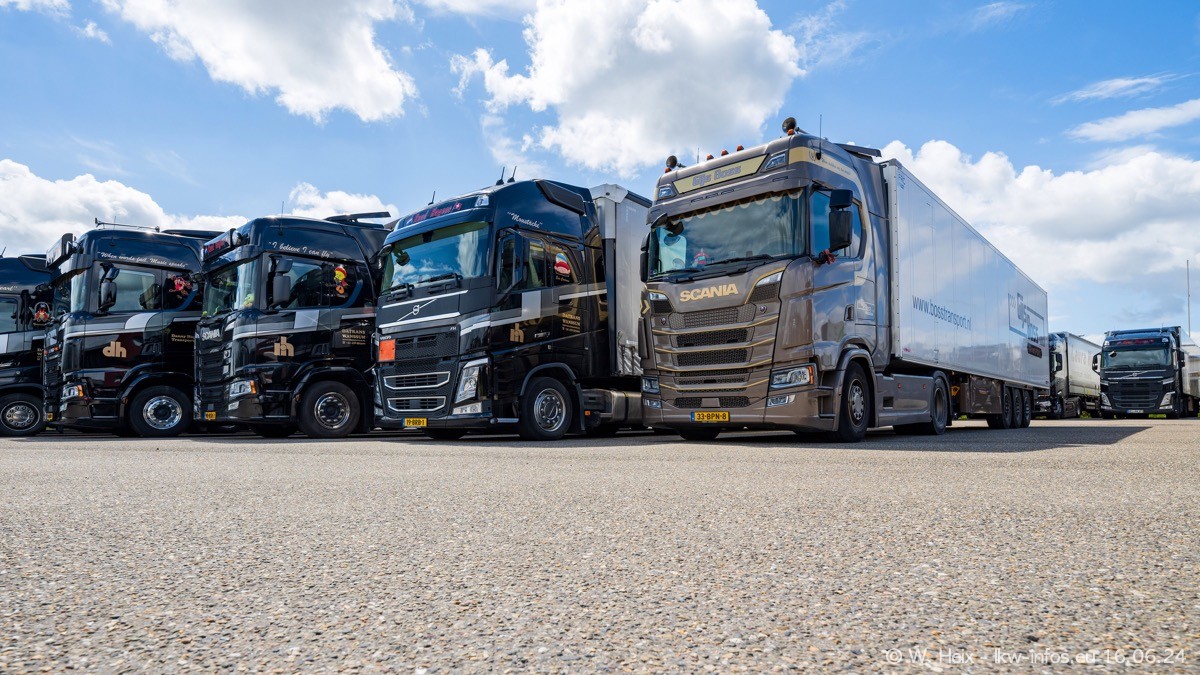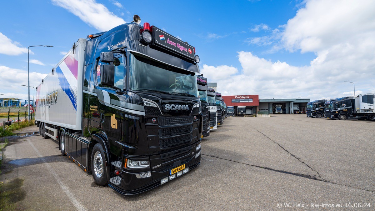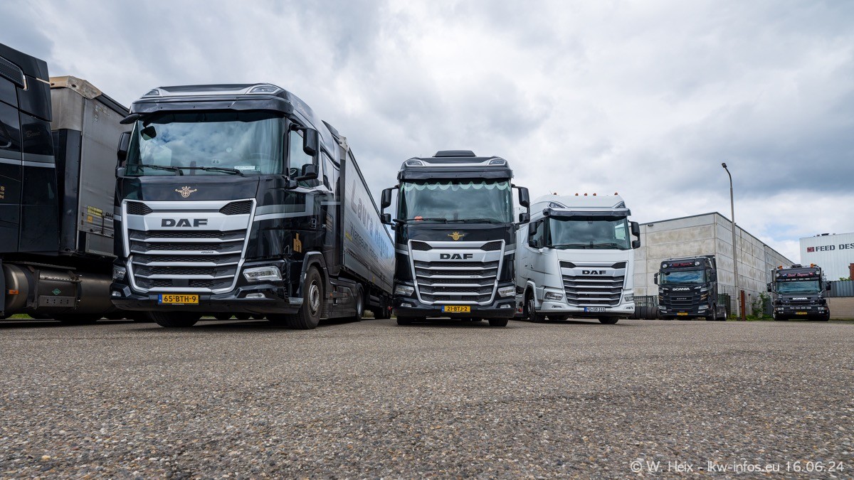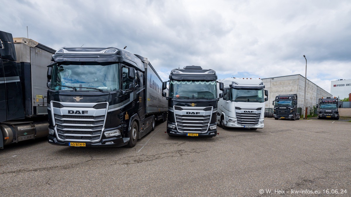 Ende Januar 2024 hat die Firma Gijs Boss die Fahrzeuge von Ruud Hagens Datrans B.V. übernommen. Das schwarze Design bleibt erhalten, den ersten neuen DAF XG+ mit neuem Aufleger, beschriftet mit "Datrans" gibt es auf den ersten Bildern in dieser Galerie zu sehen. Dazu kommen aktuell zwei weiße DAF XG+, die in Deutschland zugelassen sind (Moers MO, Kreis Wesel). Die Fahrzeuge in den bekannten Farben von Gijs Boss gibt es weiterhin. Diese stehen jedoch weiterhin verteilt bei Kunden oder Fahrern zuhause. Die zweite "neue" Firma ist jetzt Laura Hagens, Das ist bekanntlich die Tochter von Ruud Hagens. Unter dem Namen laufen alle SCANIA NextGen mit Schubboden/Walking-Floor Aufliegern. Die beiden M-Trex SCANIA gehören dazu. Alle Planenauflieger gehörten bisher Ruud Hagens Datrans B.V. Dazu kommen noch die IVECO S-Way, von Helene-Speed (Deutschland und Rumänien). Da sicherlich alle Fahrzeuge über länger Zeit noch "bunt gemischt" zu sehen sein werden, habe ich erstmal alles unter dem Namen Boss-Datrans & Laura Hagens zusammengefasst. Alle LKW werden auch weiterhin auf dem bekannten Gelände in Wanssum stehen.