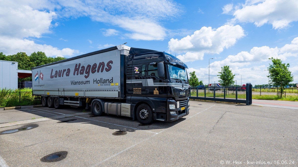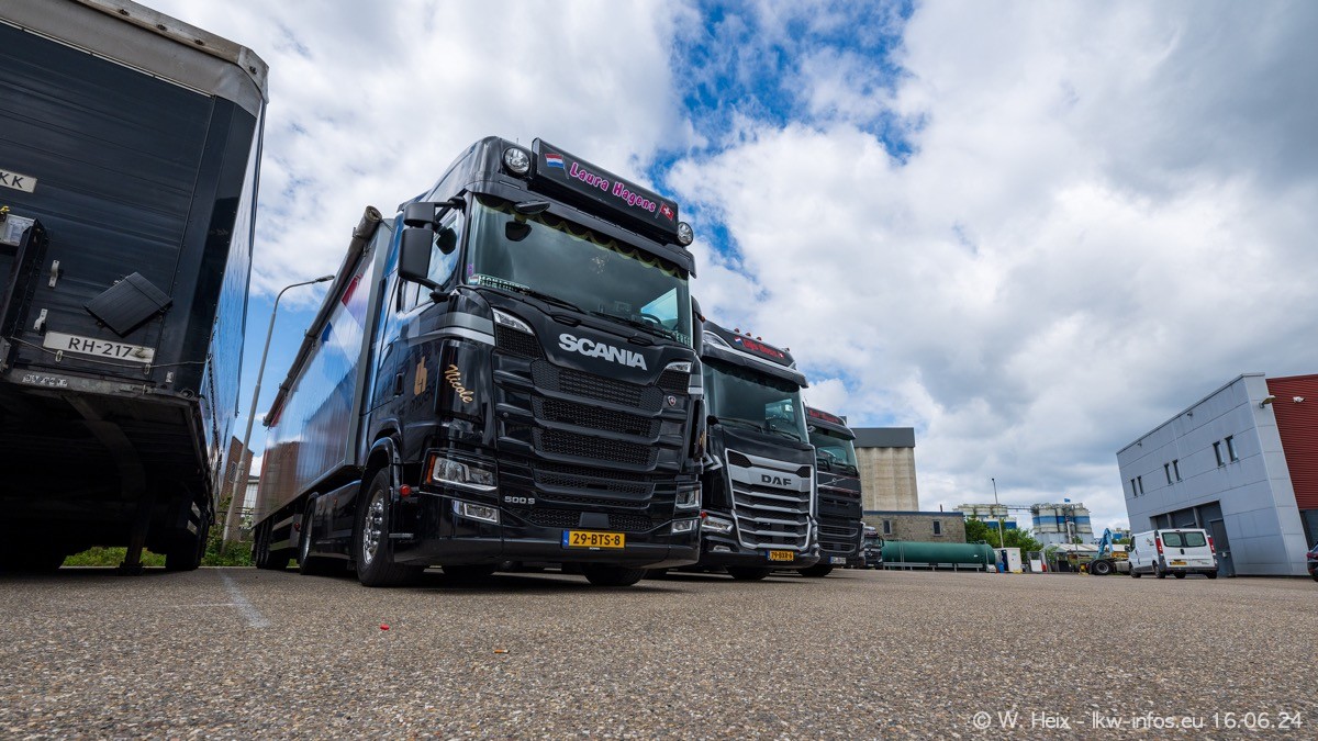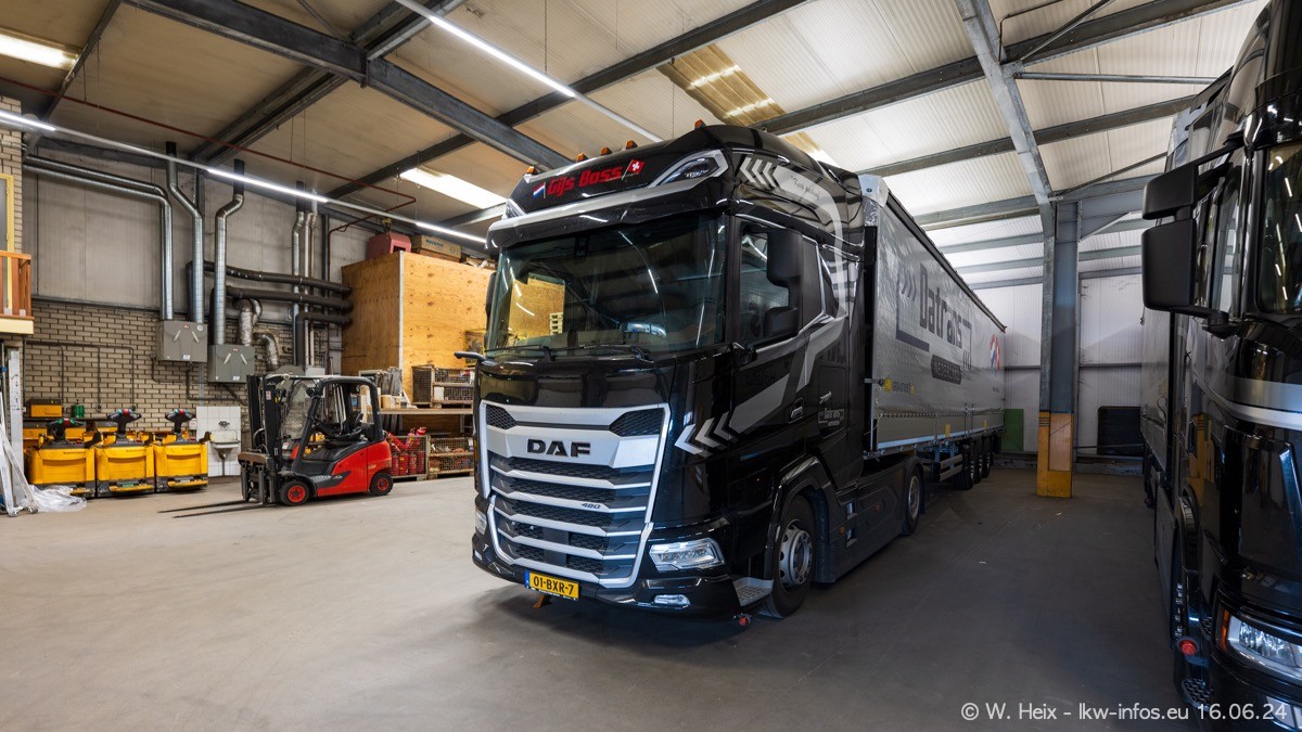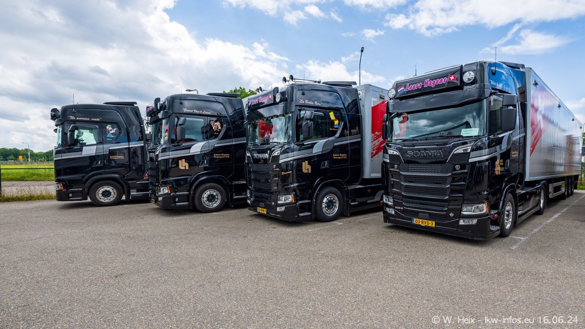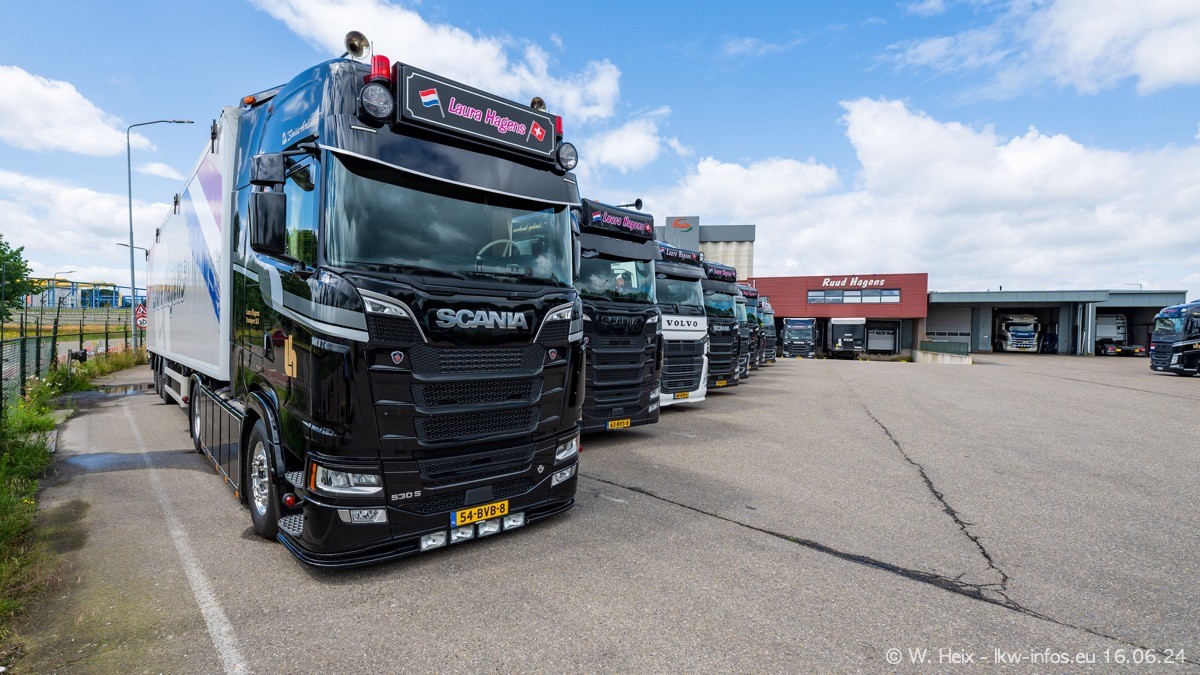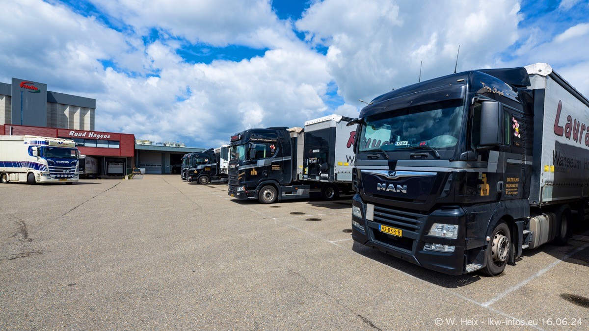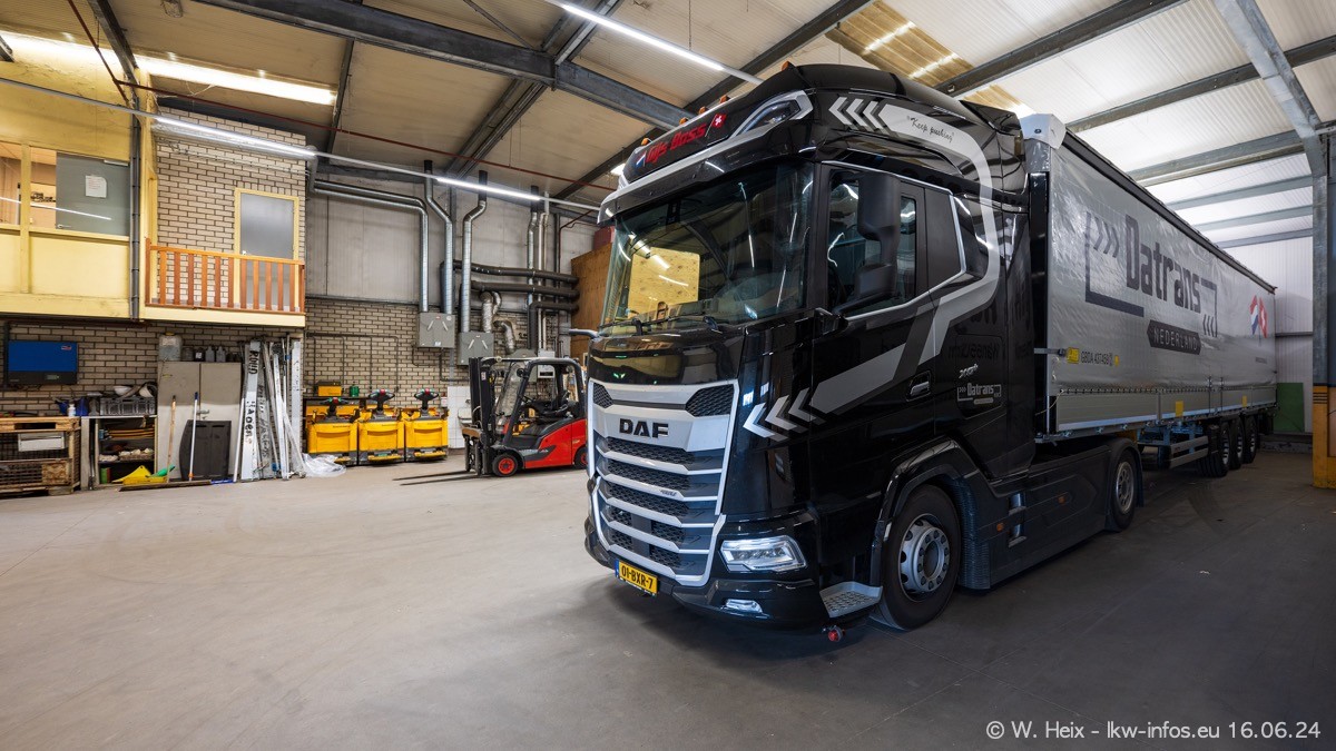 Ende Januar 2024 hat die Firma Gijs Boss die Fahrzeuge von Ruud Hagens Datrans B.V. übernommen. Das schwarze Design bleibt erhalten, den ersten neuen DAF XG+ mit neuem Aufleger, beschriftet mit "Datrans" gibt es auf den ersten Bildern in dieser Galerie zu sehen. Dazu kommen aktuell zwei weiße DAF XG+, die in Deutschland zugelassen sind (Moers MO, Kreis Wesel). Die Fahrzeuge in den bekannten Farben von Gijs Boss gibt es weiterhin. Diese stehen jedoch weiterhin verteilt bei Kunden oder Fahrern zuhause. Die zweite "neue" Firma ist jetzt Laura Hagens, Das ist bekanntlich die Tochter von Ruud Hagens. Unter dem Namen laufen alle SCANIA NextGen mit Schubboden/Walking-Floor Aufliegern. Die beiden M-Trex SCANIA gehören dazu. Alle Planenauflieger gehörten bisher Ruud Hagens Datrans B.V. Dazu kommen noch die IVECO S-Way, von Helene-Speed (Deutschland und Rumänien). Da sicherlich alle Fahrzeuge über länger Zeit noch "bunt gemischt" zu sehen sein werden, habe ich erstmal alles unter dem Namen Boss-Datrans & Laura Hagens zusammengefasst. Alle LKW werden auch weiterhin auf dem bekannten Gelände in Wanssum stehen.