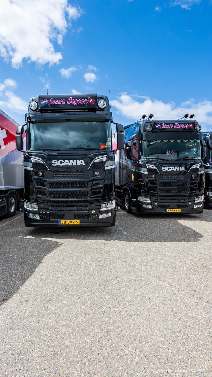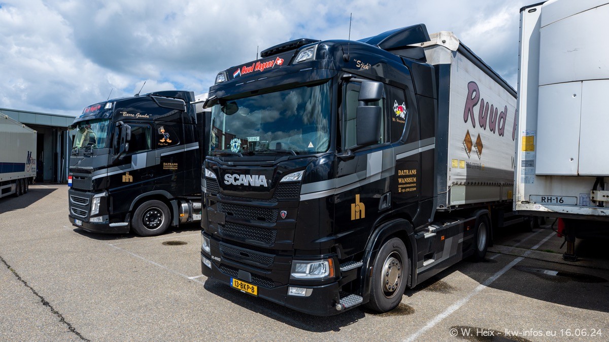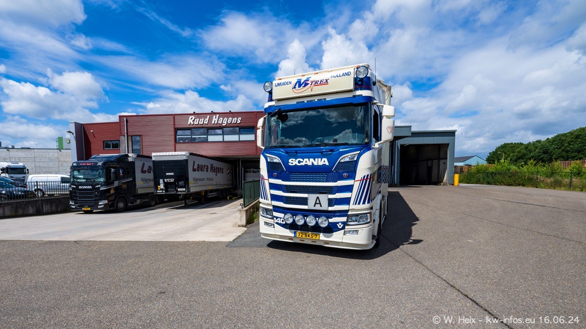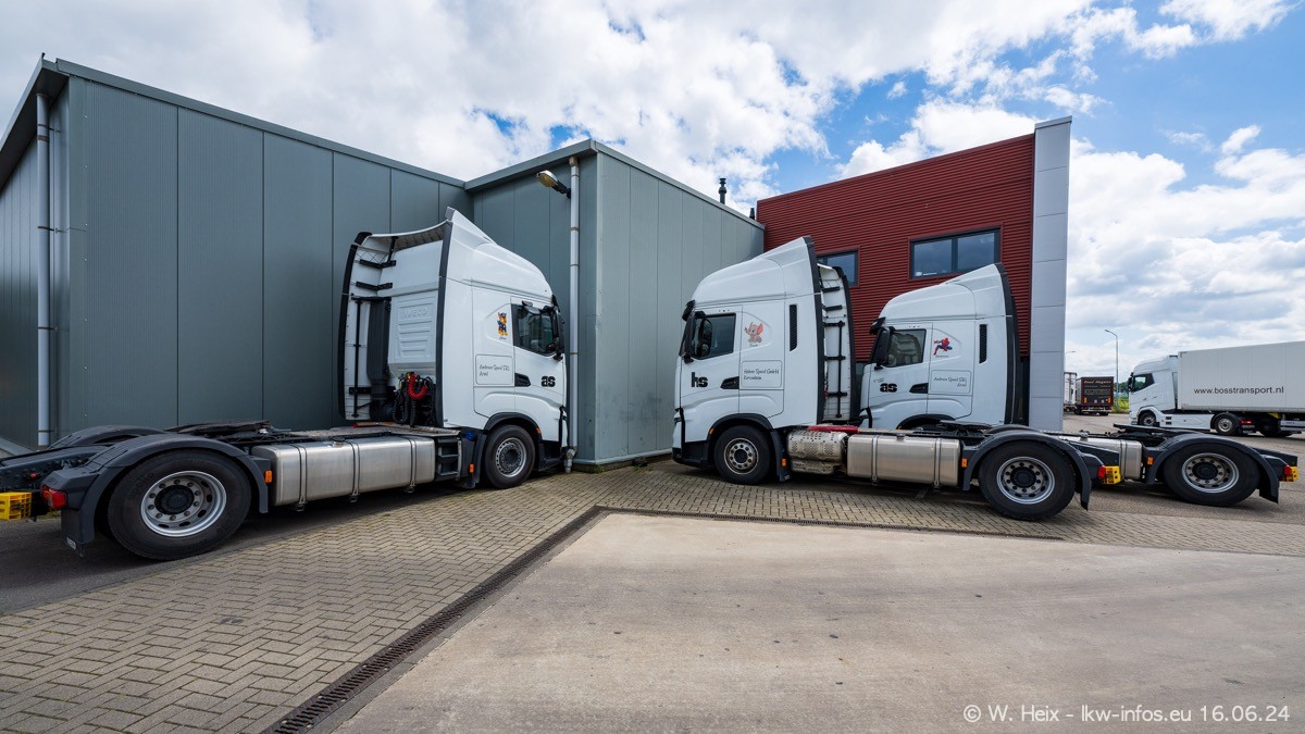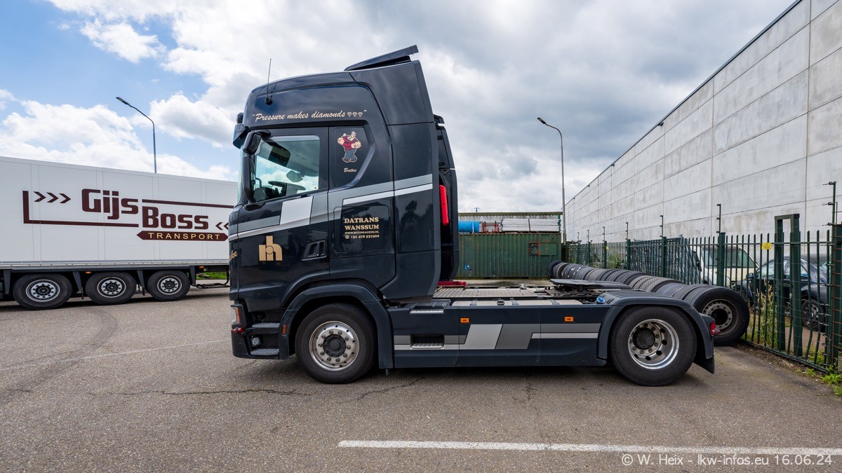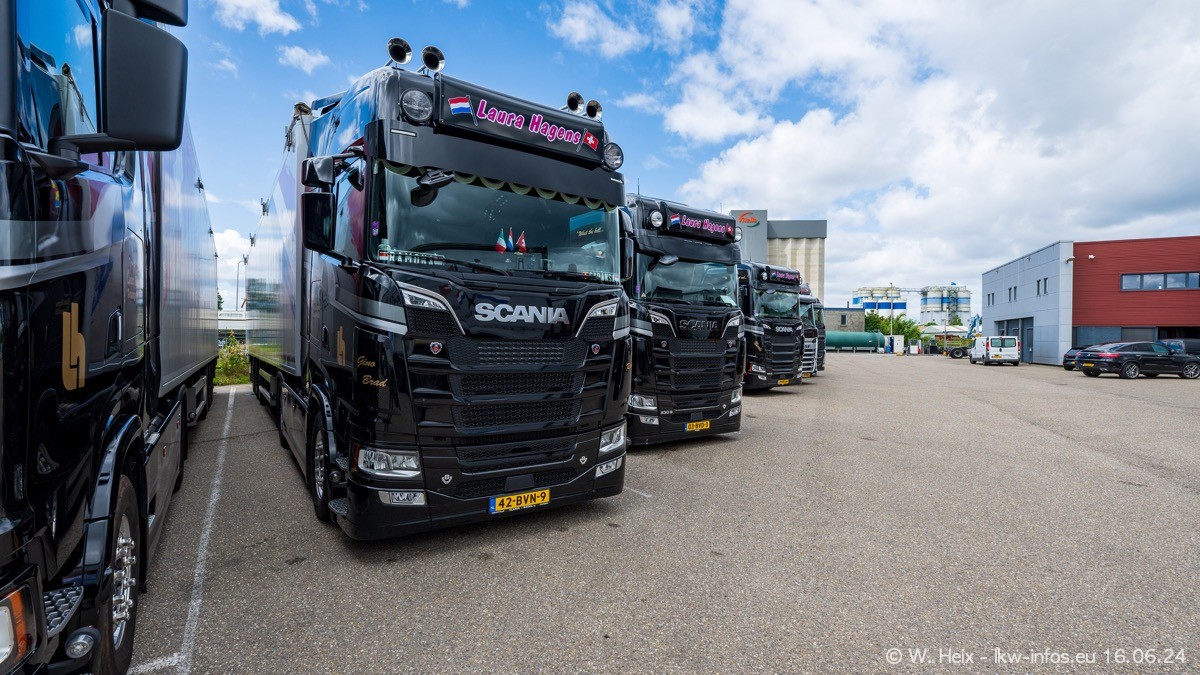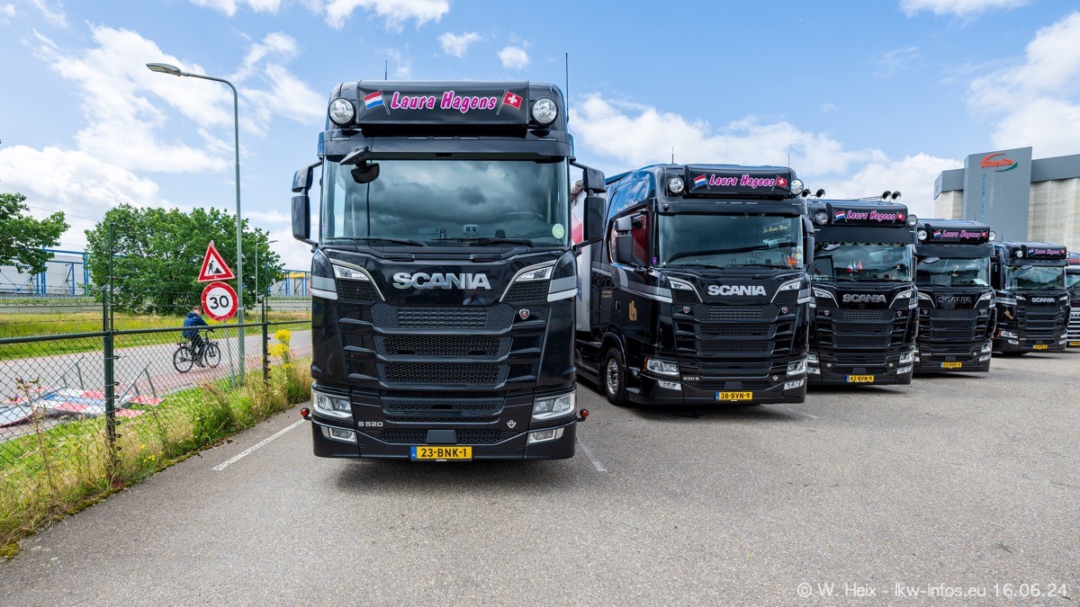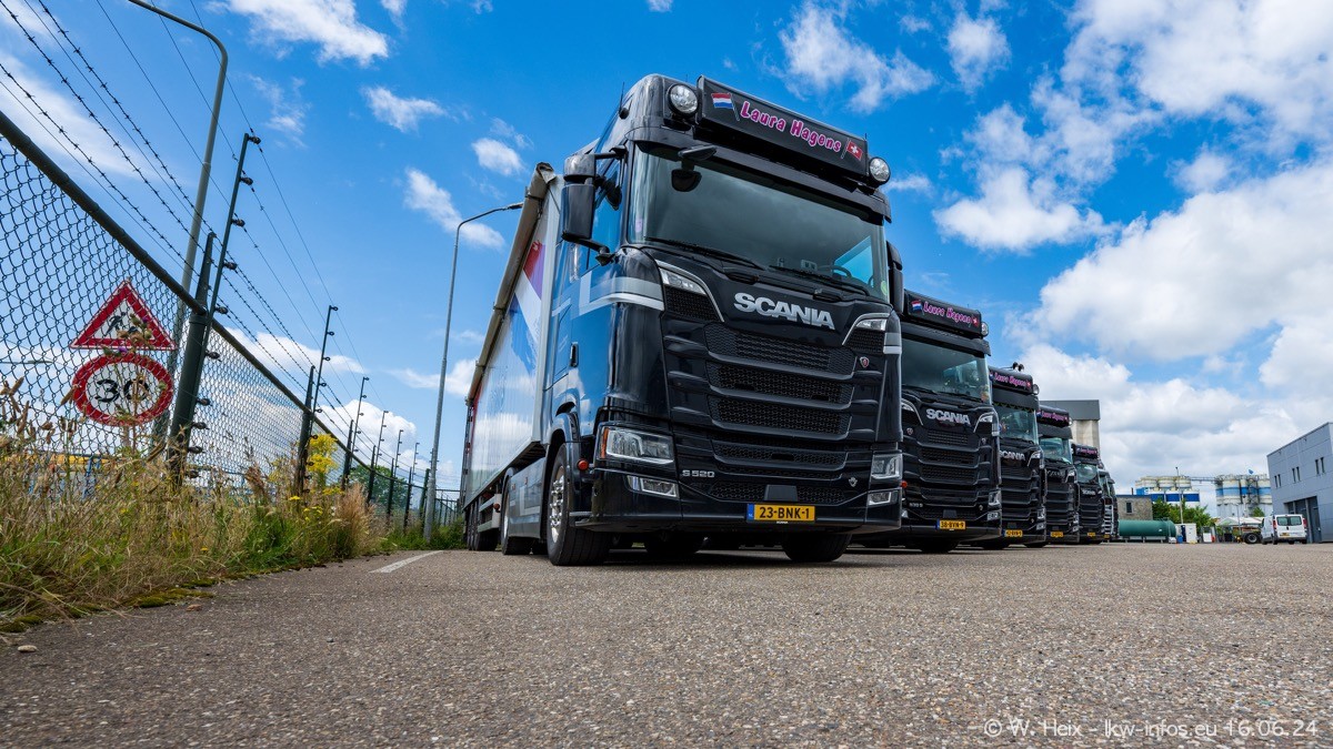 Ende Januar 2024 hat die Firma Gijs Boss die Fahrzeuge von Ruud Hagens Datrans B.V. übernommen. Das schwarze Design bleibt erhalten, den ersten neuen DAF XG+ mit neuem Aufleger, beschriftet mit "Datrans" gibt es auf den ersten Bildern in dieser Galerie zu sehen. Dazu kommen aktuell zwei weiße DAF XG+, die in Deutschland zugelassen sind (Moers MO, Kreis Wesel). Die Fahrzeuge in den bekannten Farben von Gijs Boss gibt es weiterhin. Diese stehen jedoch weiterhin verteilt bei Kunden oder Fahrern zuhause. Die zweite "neue" Firma ist jetzt Laura Hagens, Das ist bekanntlich die Tochter von Ruud Hagens. Unter dem Namen laufen alle SCANIA NextGen mit Schubboden/Walking-Floor Aufliegern. Die beiden M-Trex SCANIA gehören dazu. Alle Planenauflieger gehörten bisher Ruud Hagens Datrans B.V. Dazu kommen noch die IVECO S-Way, von Helene-Speed (Deutschland und Rumänien). Da sicherlich alle Fahrzeuge über länger Zeit noch "bunt gemischt" zu sehen sein werden, habe ich erstmal alles unter dem Namen Boss-Datrans & Laura Hagens zusammengefasst. Alle LKW werden auch weiterhin auf dem bekannten Gelände in Wanssum stehen.