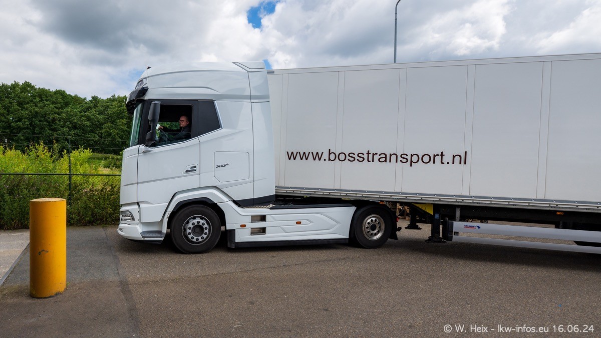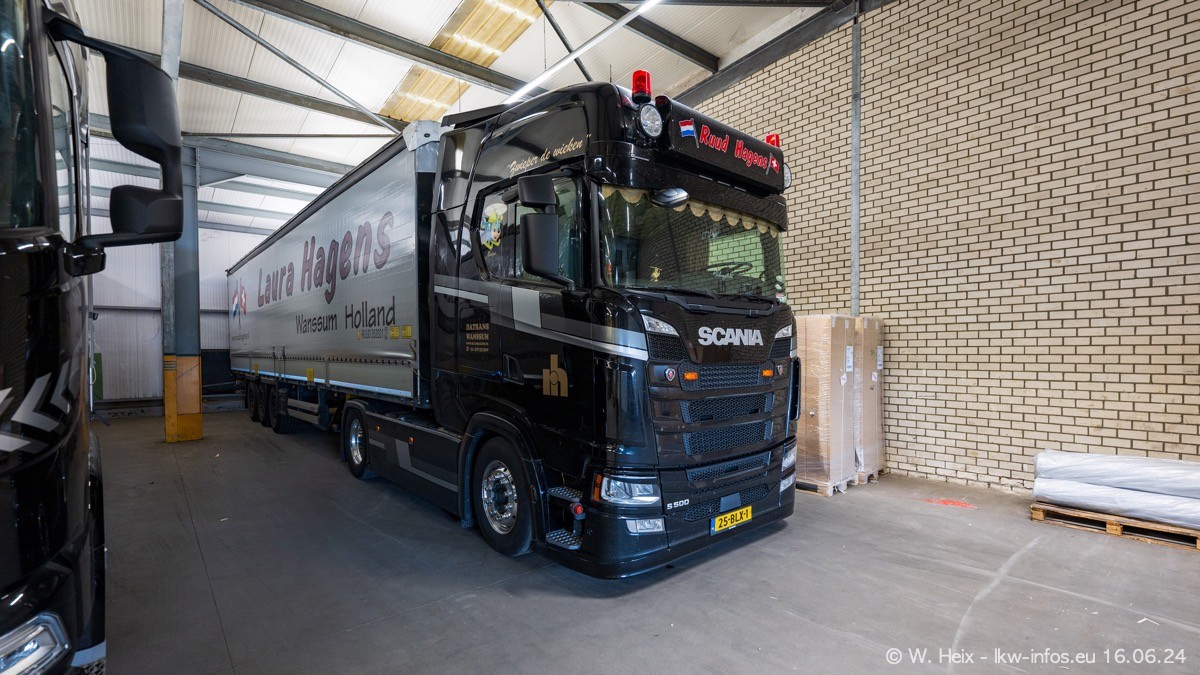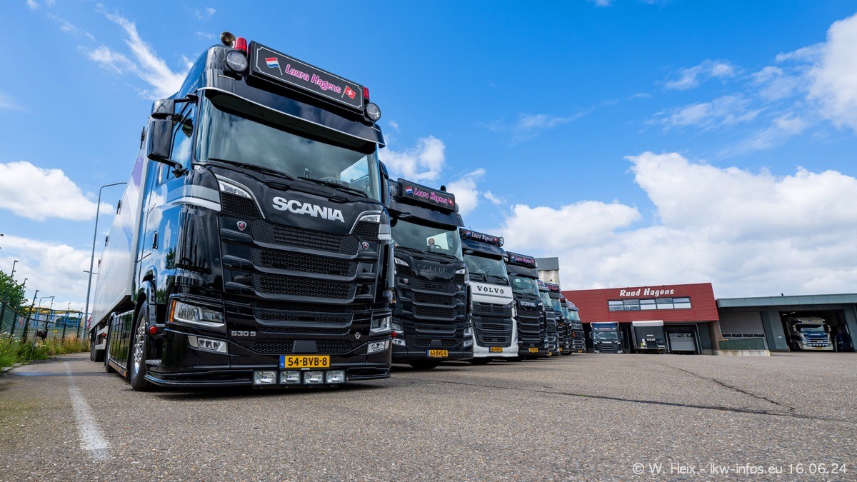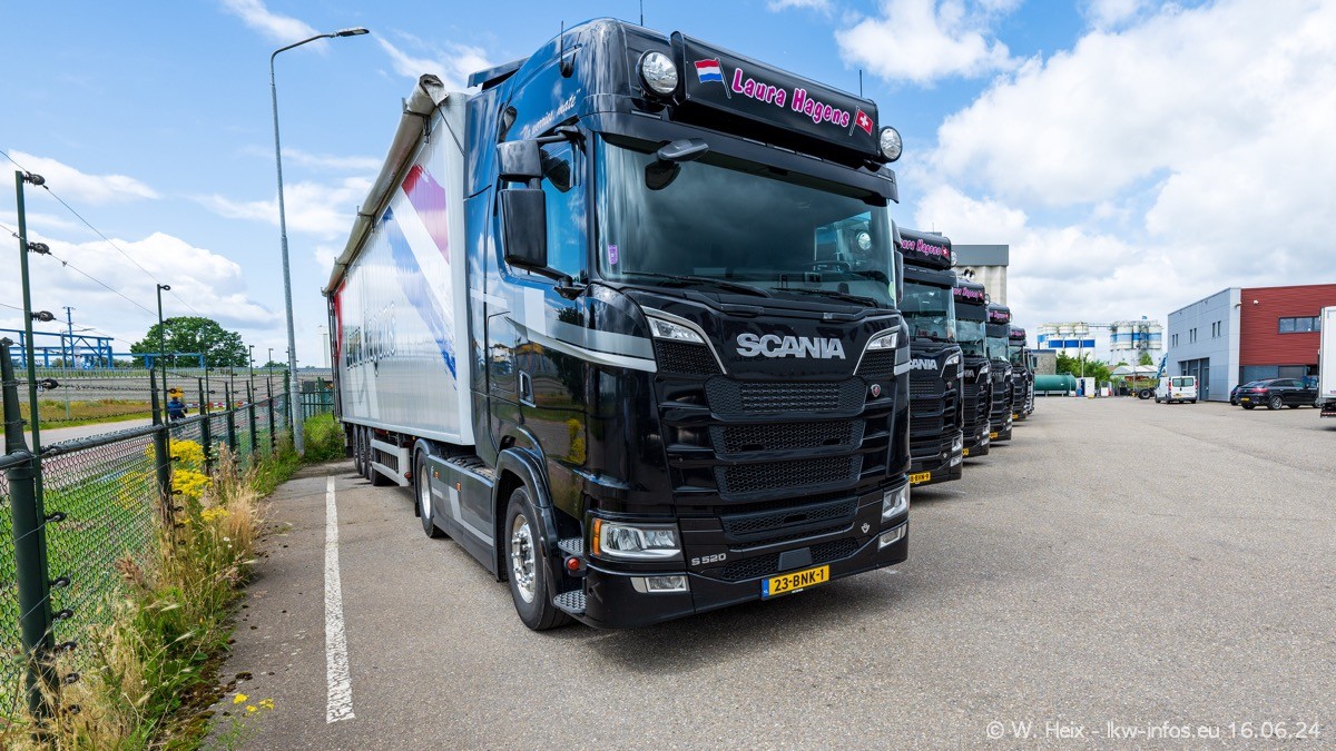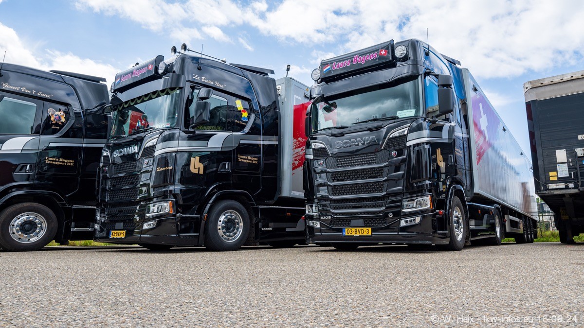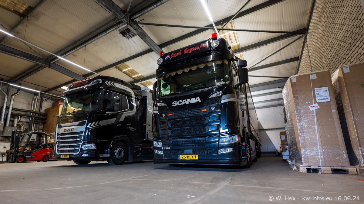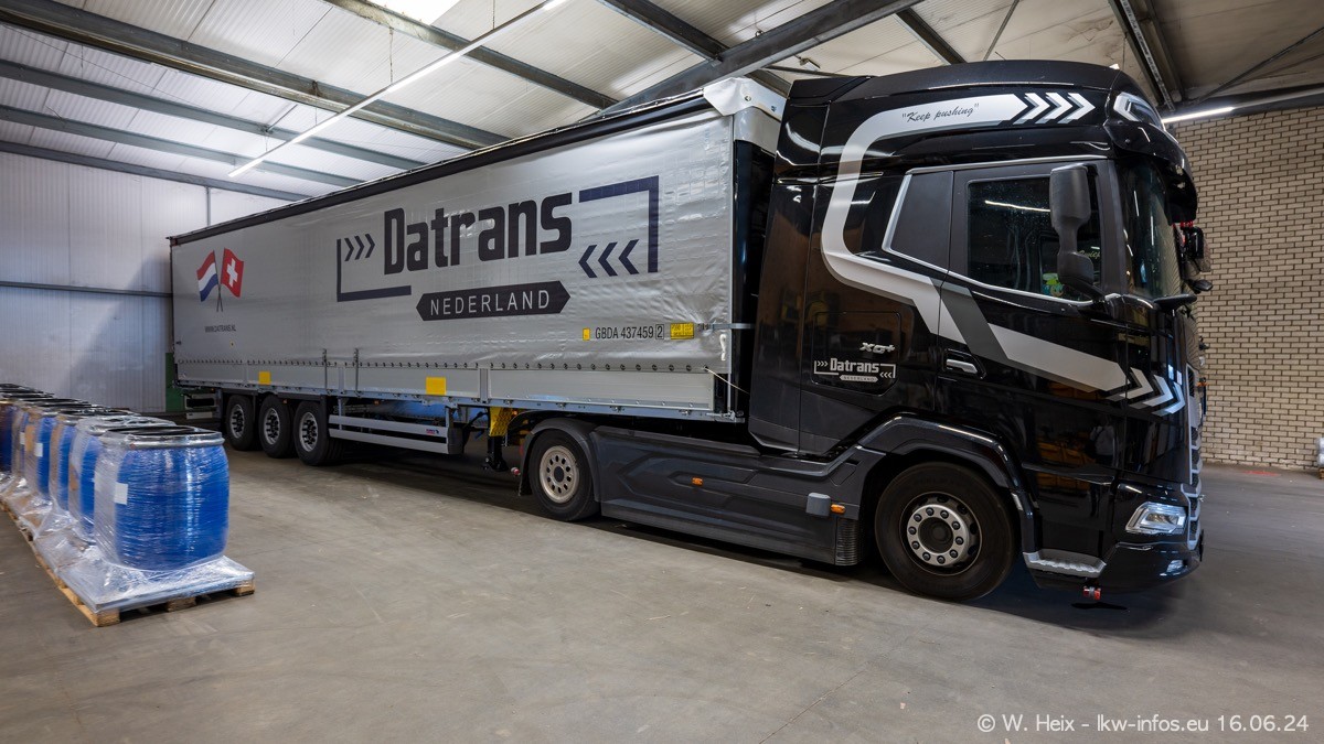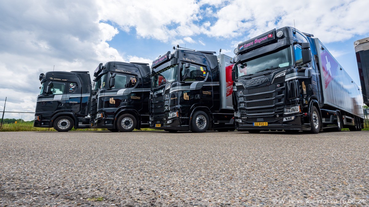 Ende Januar 2024 hat die Firma Gijs Boss die Fahrzeuge von Ruud Hagens Datrans B.V. übernommen. Das schwarze Design bleibt erhalten, den ersten neuen DAF XG+ mit neuem Aufleger, beschriftet mit "Datrans" gibt es auf den ersten Bildern in dieser Galerie zu sehen. Dazu kommen aktuell zwei weiße DAF XG+, die in Deutschland zugelassen sind (Moers MO, Kreis Wesel). Die Fahrzeuge in den bekannten Farben von Gijs Boss gibt es weiterhin. Diese stehen jedoch weiterhin verteilt bei Kunden oder Fahrern zuhause. Die zweite "neue" Firma ist jetzt Laura Hagens, Das ist bekanntlich die Tochter von Ruud Hagens. Unter dem Namen laufen alle SCANIA NextGen mit Schubboden/Walking-Floor Aufliegern. Die beiden M-Trex SCANIA gehören dazu. Alle Planenauflieger gehörten bisher Ruud Hagens Datrans B.V. Dazu kommen noch die IVECO S-Way, von Helene-Speed (Deutschland und Rumänien). Da sicherlich alle Fahrzeuge über länger Zeit noch "bunt gemischt" zu sehen sein werden, habe ich erstmal alles unter dem Namen Boss-Datrans & Laura Hagens zusammengefasst. Alle LKW werden auch weiterhin auf dem bekannten Gelände in Wanssum stehen.