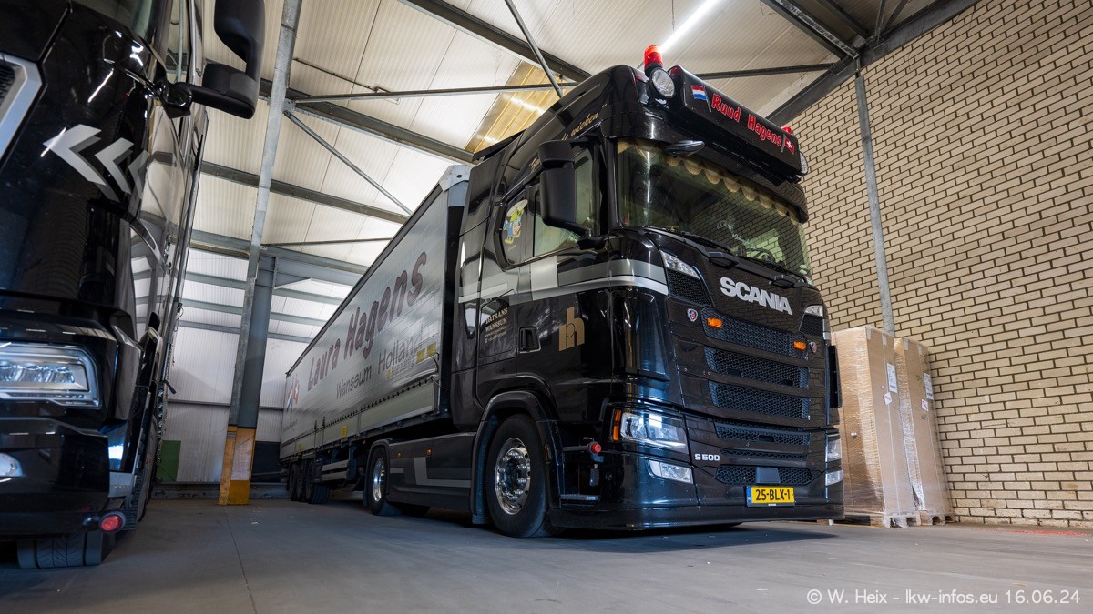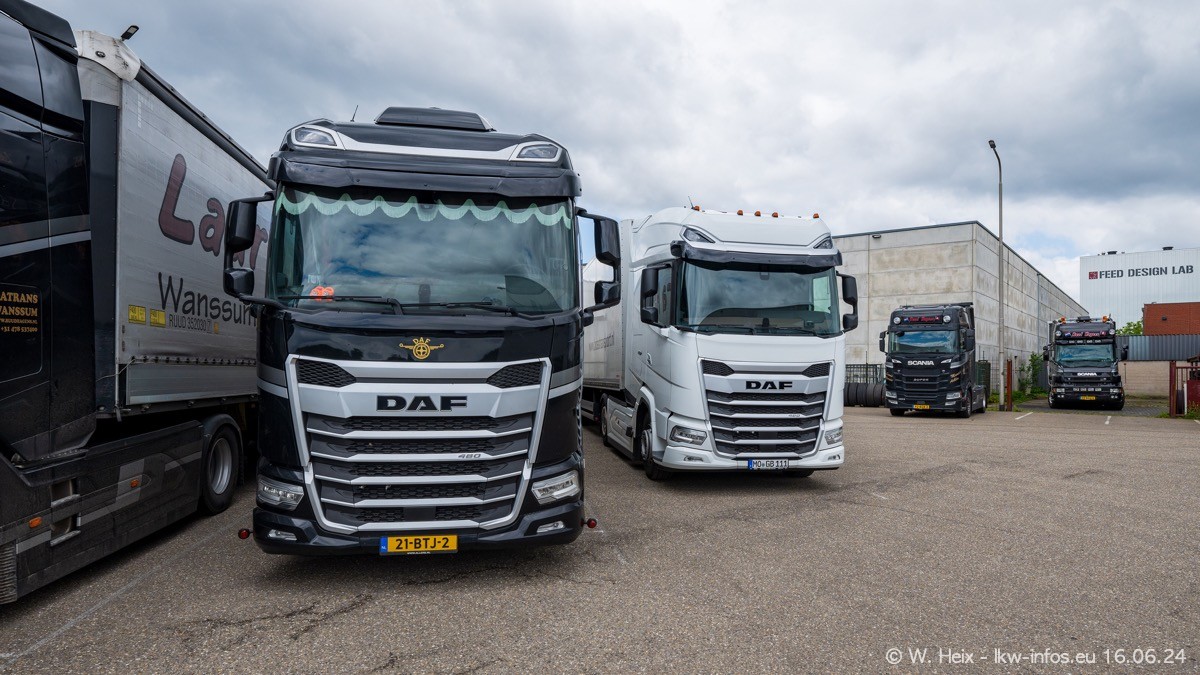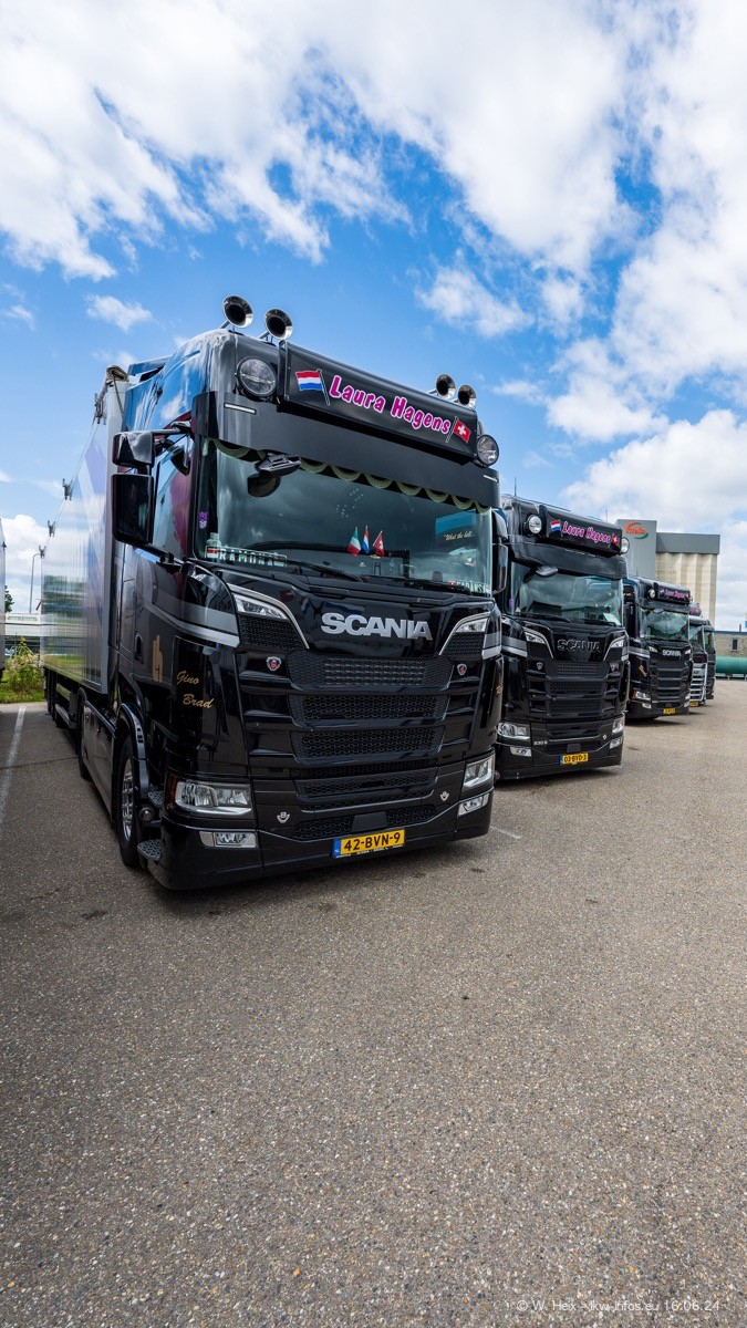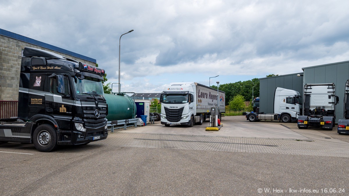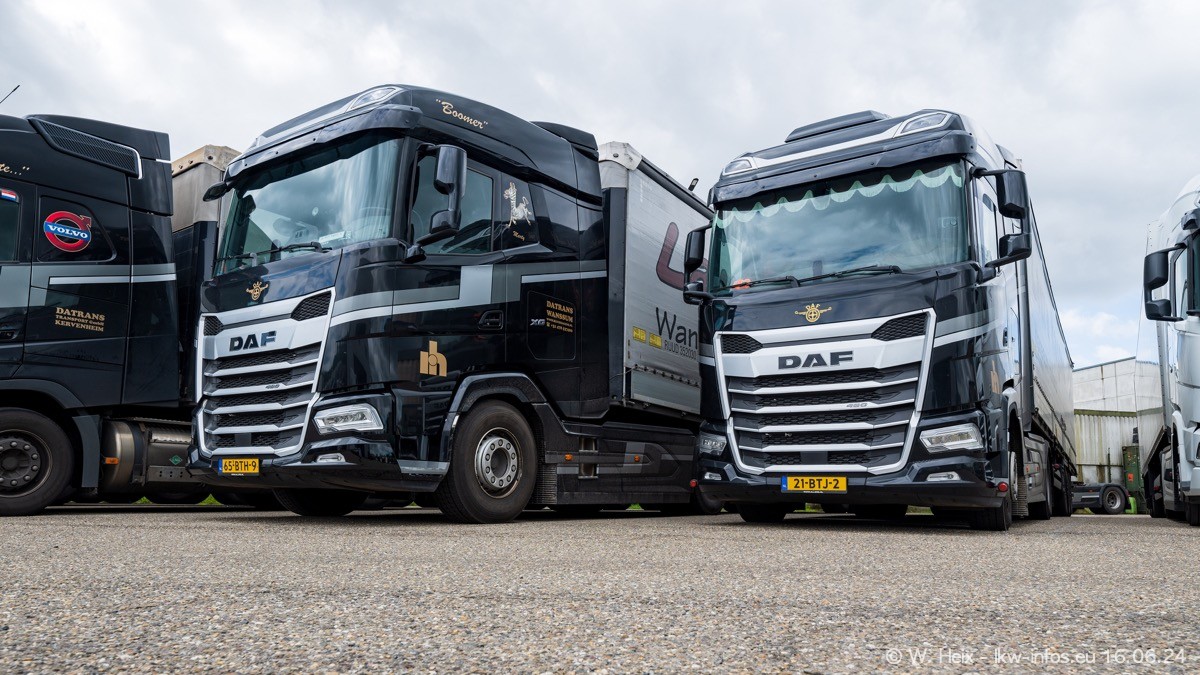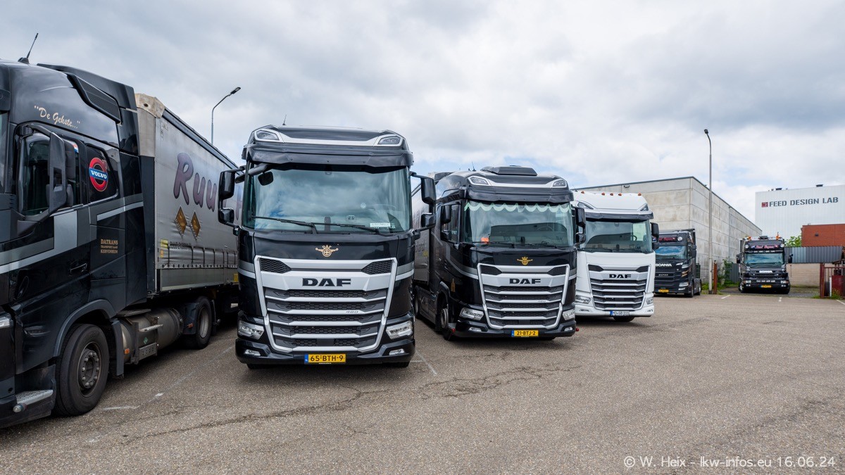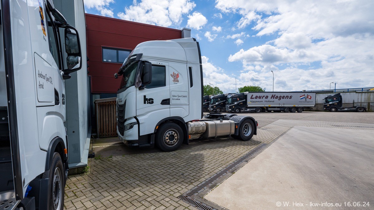 Ende Januar 2024 hat die Firma Gijs Boss die Fahrzeuge von Ruud Hagens Datrans B.V. übernommen. Das schwarze Design bleibt erhalten, den ersten neuen DAF XG+ mit neuem Aufleger, beschriftet mit "Datrans" gibt es auf den ersten Bildern in dieser Galerie zu sehen. Dazu kommen aktuell zwei weiße DAF XG+, die in Deutschland zugelassen sind (Moers MO, Kreis Wesel). Die Fahrzeuge in den bekannten Farben von Gijs Boss gibt es weiterhin. Diese stehen jedoch weiterhin verteilt bei Kunden oder Fahrern zuhause. Die zweite "neue" Firma ist jetzt Laura Hagens, Das ist bekanntlich die Tochter von Ruud Hagens. Unter dem Namen laufen alle SCANIA NextGen mit Schubboden/Walking-Floor Aufliegern. Die beiden M-Trex SCANIA gehören dazu. Alle Planenauflieger gehörten bisher Ruud Hagens Datrans B.V. Dazu kommen noch die IVECO S-Way, von Helene-Speed (Deutschland und Rumänien). Da sicherlich alle Fahrzeuge über länger Zeit noch "bunt gemischt" zu sehen sein werden, habe ich erstmal alles unter dem Namen Boss-Datrans & Laura Hagens zusammengefasst. Alle LKW werden auch weiterhin auf dem bekannten Gelände in Wanssum stehen.