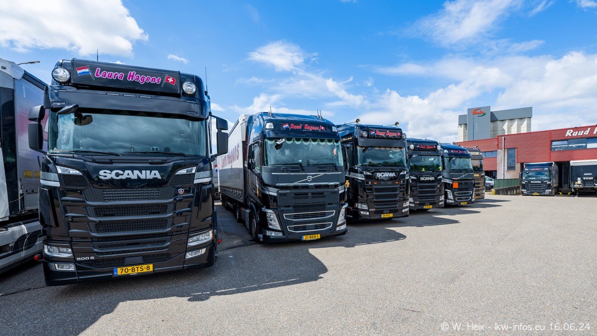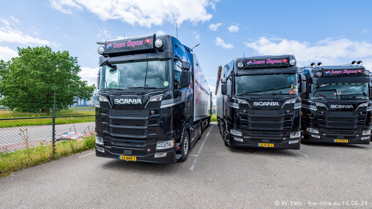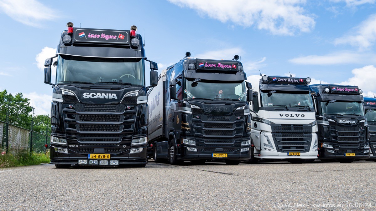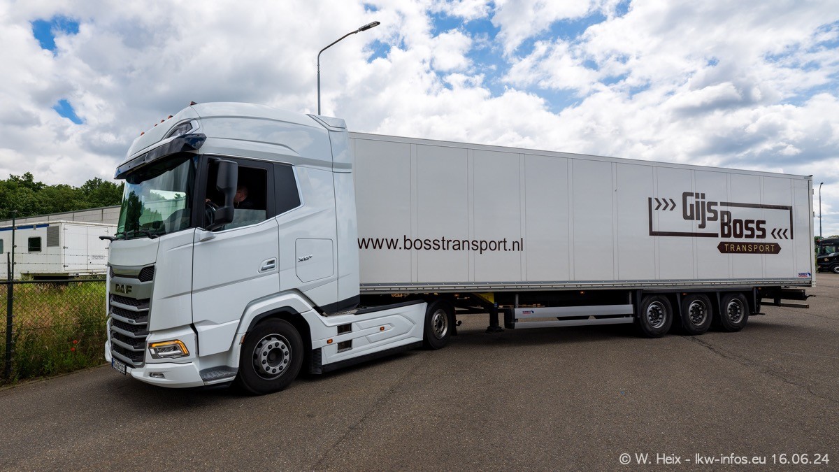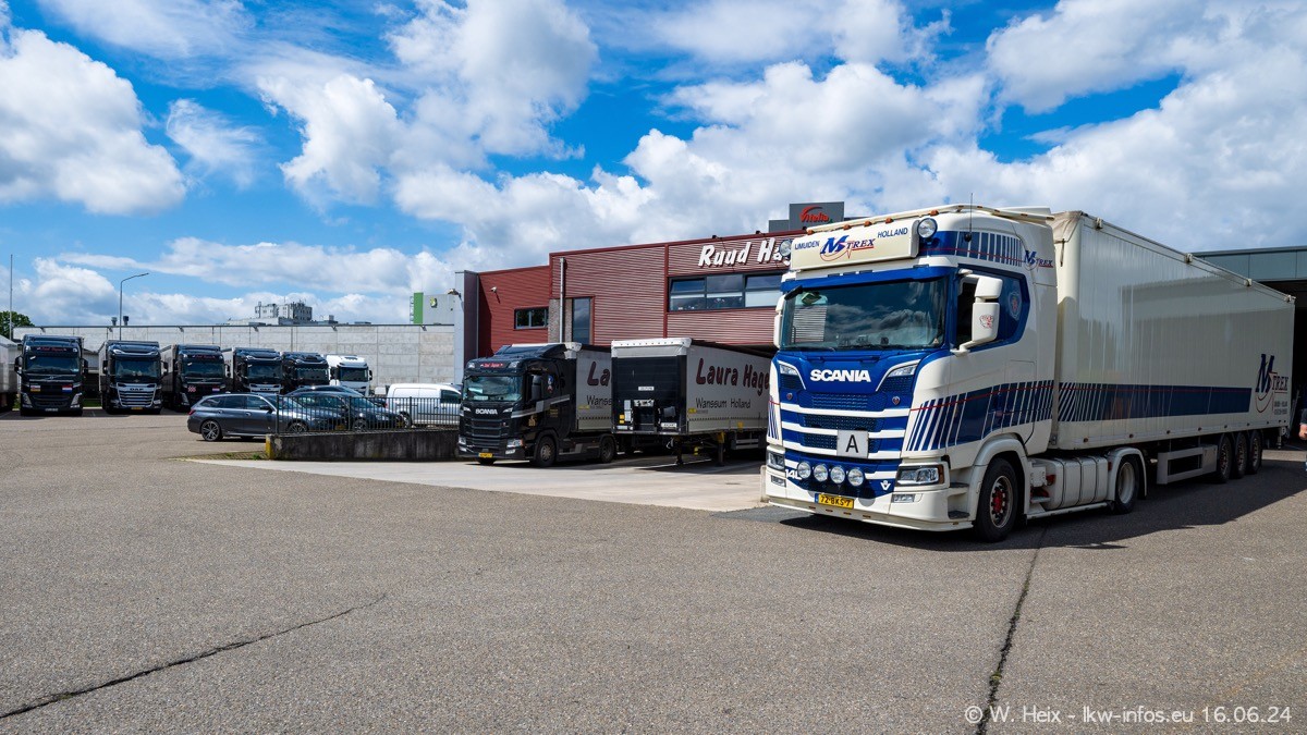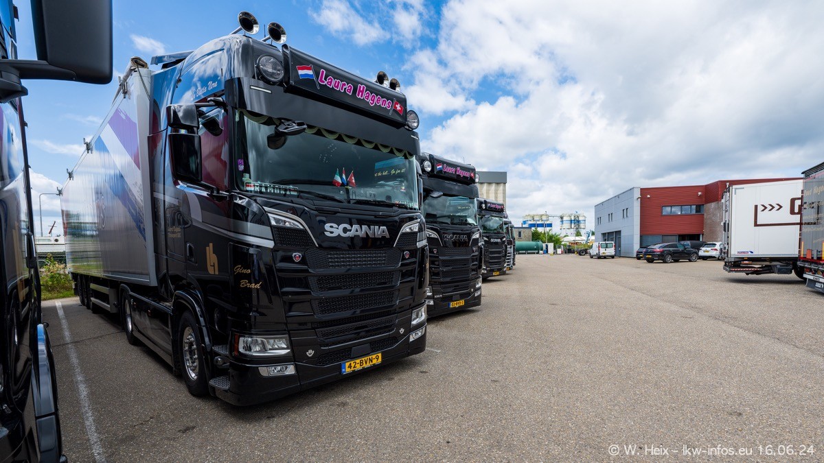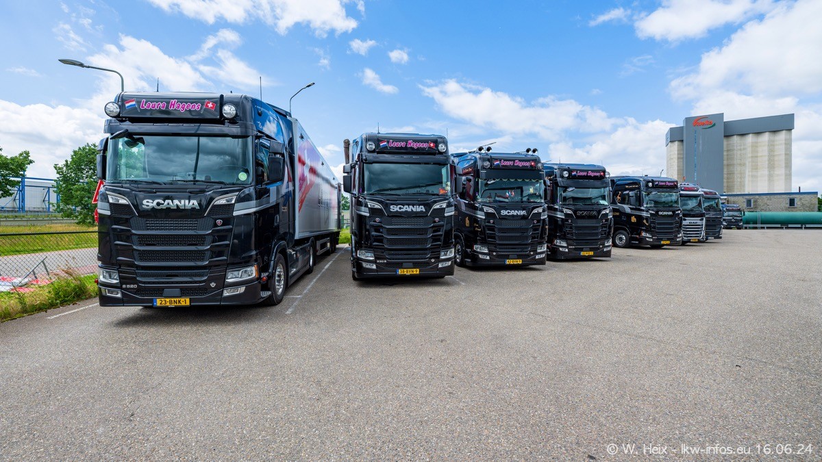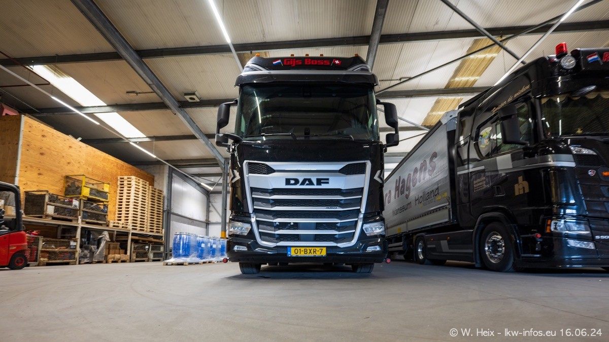 Ende Januar 2024 hat die Firma Gijs Boss die Fahrzeuge von Ruud Hagens Datrans B.V. übernommen. Das schwarze Design bleibt erhalten, den ersten neuen DAF XG+ mit neuem Aufleger, beschriftet mit "Datrans" gibt es auf den ersten Bildern in dieser Galerie zu sehen. Dazu kommen aktuell zwei weiße DAF XG+, die in Deutschland zugelassen sind (Moers MO, Kreis Wesel). Die Fahrzeuge in den bekannten Farben von Gijs Boss gibt es weiterhin. Diese stehen jedoch weiterhin verteilt bei Kunden oder Fahrern zuhause. Die zweite "neue" Firma ist jetzt Laura Hagens, Das ist bekanntlich die Tochter von Ruud Hagens. Unter dem Namen laufen alle SCANIA NextGen mit Schubboden/Walking-Floor Aufliegern. Die beiden M-Trex SCANIA gehören dazu. Alle Planenauflieger gehörten bisher Ruud Hagens Datrans B.V. Dazu kommen noch die IVECO S-Way, von Helene-Speed (Deutschland und Rumänien). Da sicherlich alle Fahrzeuge über länger Zeit noch "bunt gemischt" zu sehen sein werden, habe ich erstmal alles unter dem Namen Boss-Datrans & Laura Hagens zusammengefasst. Alle LKW werden auch weiterhin auf dem bekannten Gelände in Wanssum stehen.