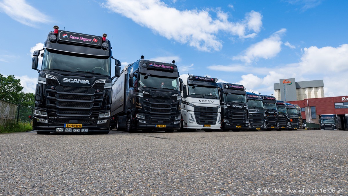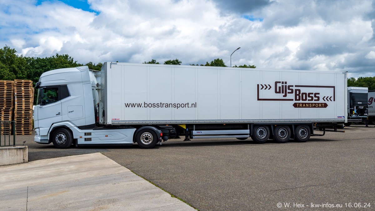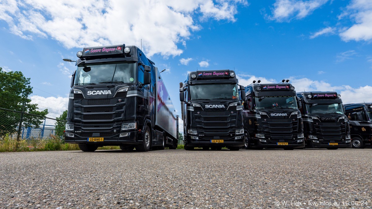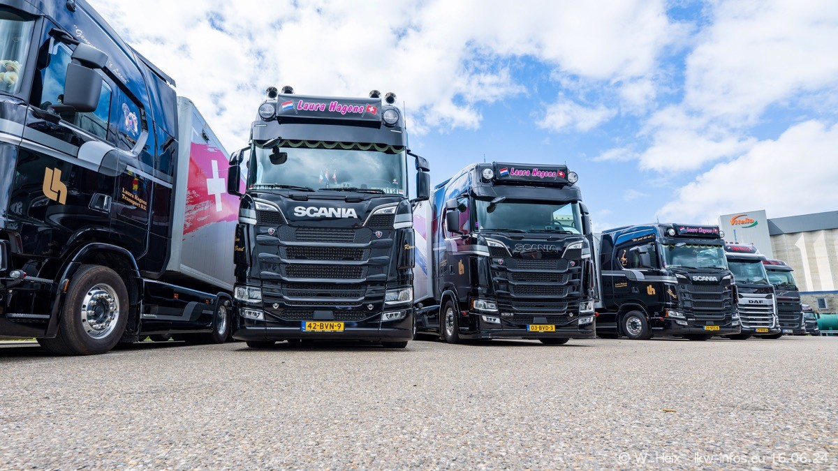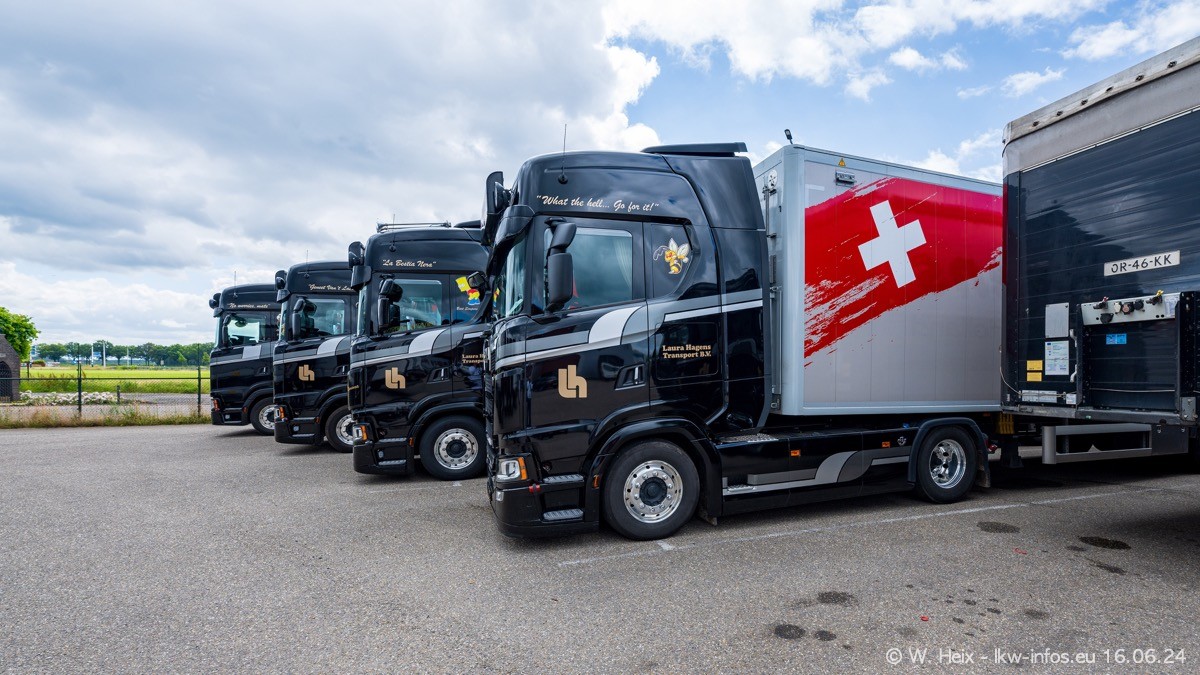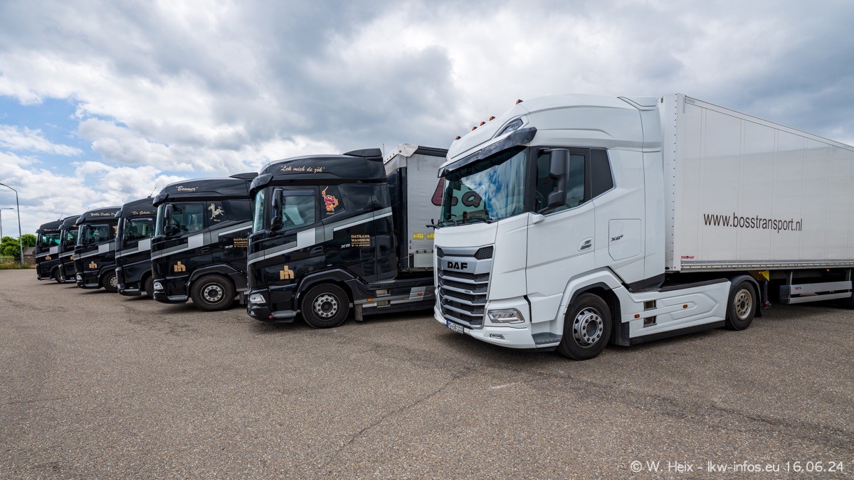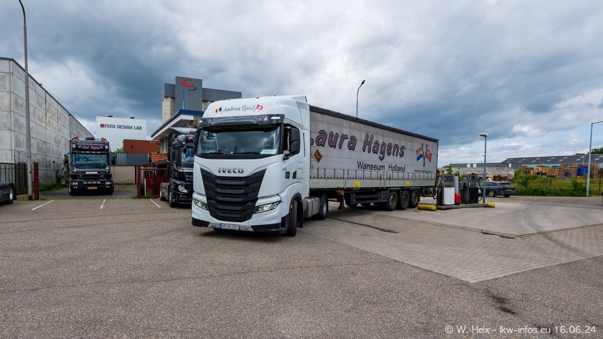 Ende Januar 2024 hat die Firma Gijs Boss die Fahrzeuge von Ruud Hagens Datrans B.V. übernommen. Das schwarze Design bleibt erhalten, den ersten neuen DAF XG+ mit neuem Aufleger, beschriftet mit "Datrans" gibt es auf den ersten Bildern in dieser Galerie zu sehen. Dazu kommen aktuell zwei weiße DAF XG+, die in Deutschland zugelassen sind (Moers MO, Kreis Wesel). Die Fahrzeuge in den bekannten Farben von Gijs Boss gibt es weiterhin. Diese stehen jedoch weiterhin verteilt bei Kunden oder Fahrern zuhause. Die zweite "neue" Firma ist jetzt Laura Hagens, Das ist bekanntlich die Tochter von Ruud Hagens. Unter dem Namen laufen alle SCANIA NextGen mit Schubboden/Walking-Floor Aufliegern. Die beiden M-Trex SCANIA gehören dazu. Alle Planenauflieger gehörten bisher Ruud Hagens Datrans B.V. Dazu kommen noch die IVECO S-Way, von Helene-Speed (Deutschland und Rumänien). Da sicherlich alle Fahrzeuge über länger Zeit noch "bunt gemischt" zu sehen sein werden, habe ich erstmal alles unter dem Namen Boss-Datrans & Laura Hagens zusammengefasst. Alle LKW werden auch weiterhin auf dem bekannten Gelände in Wanssum stehen.
