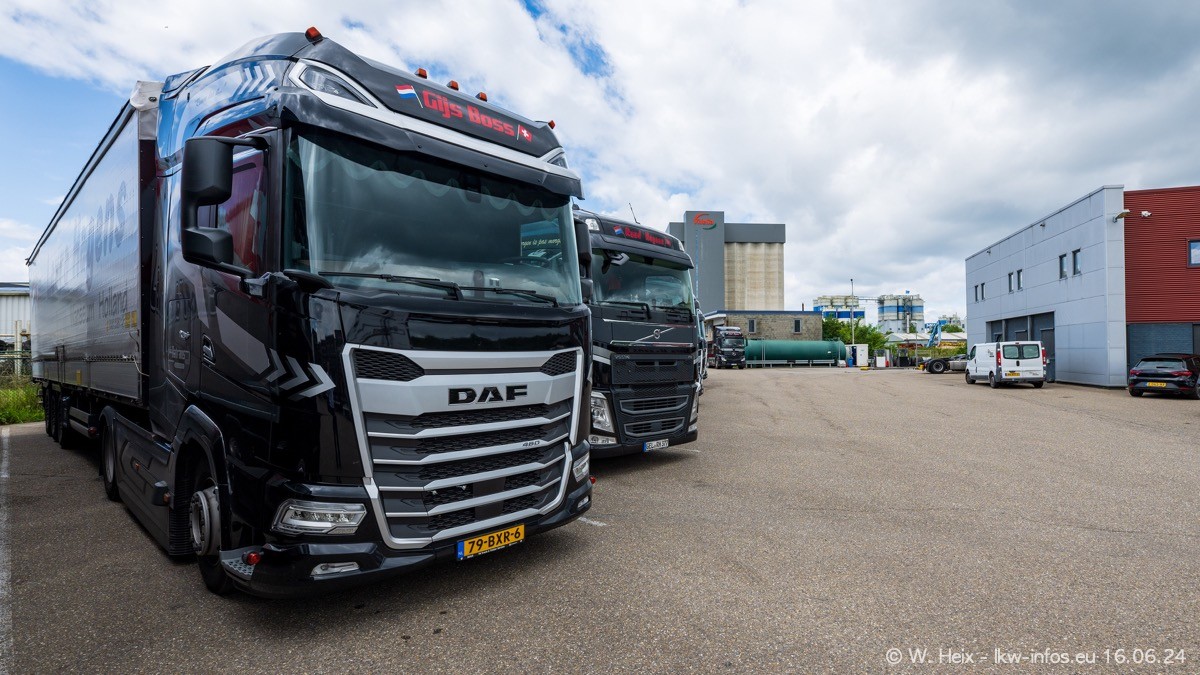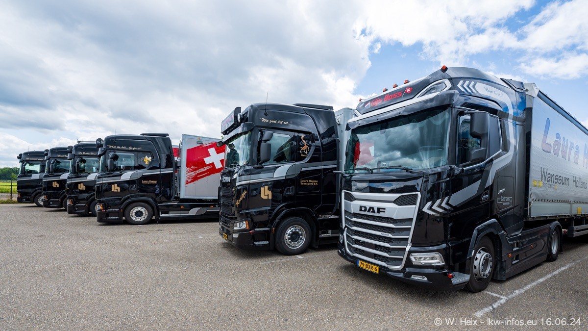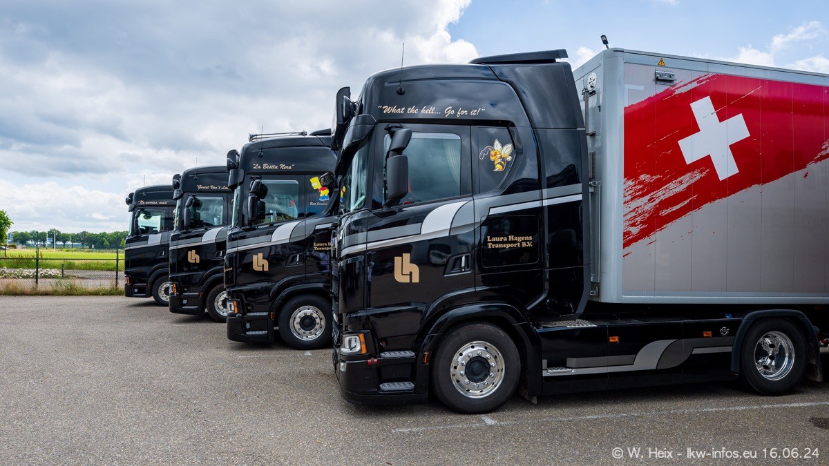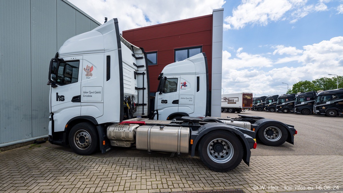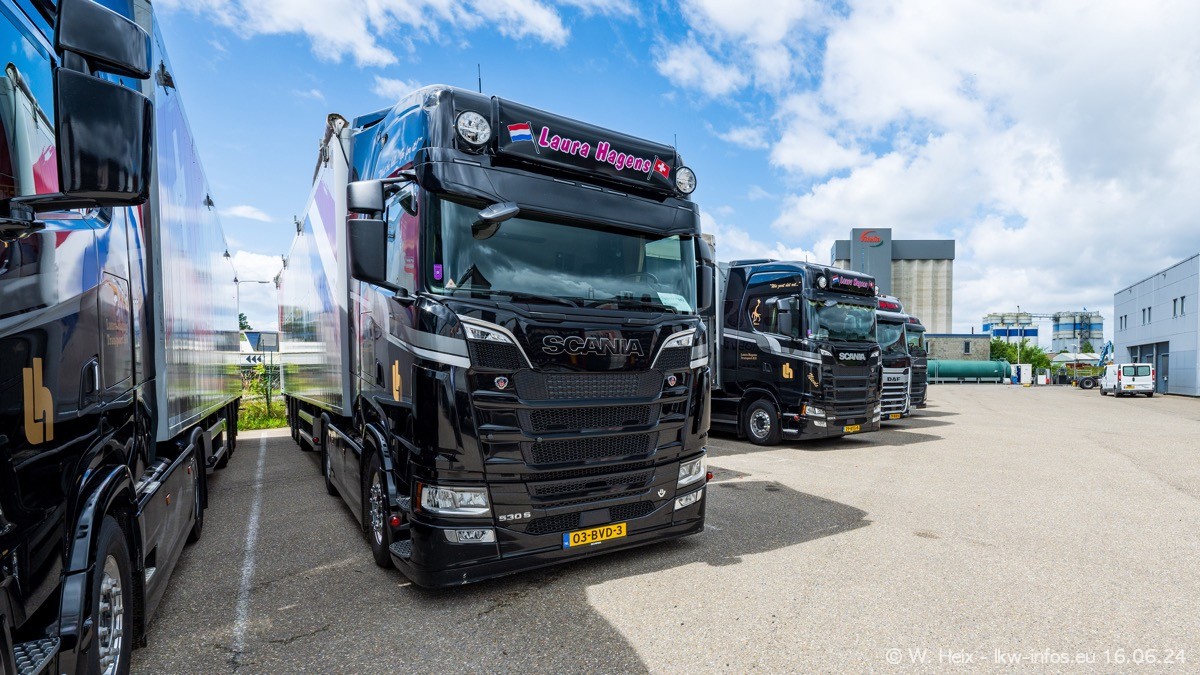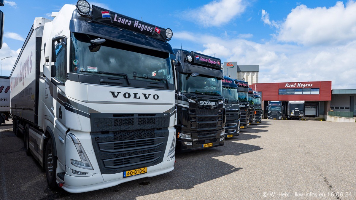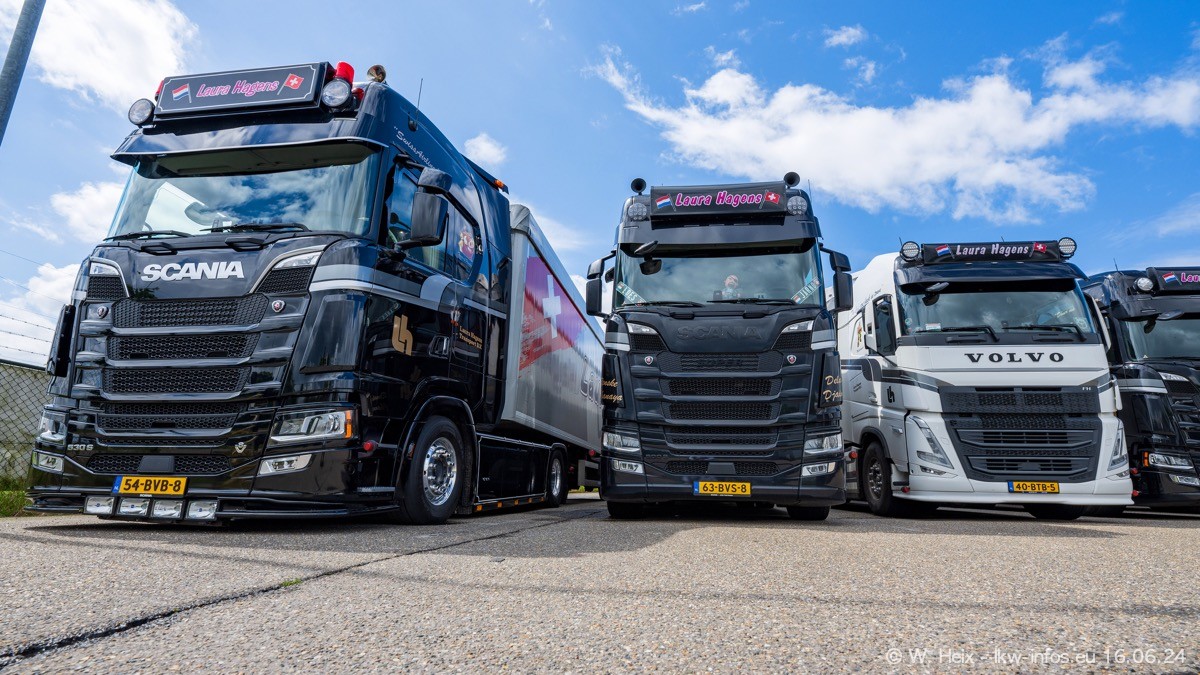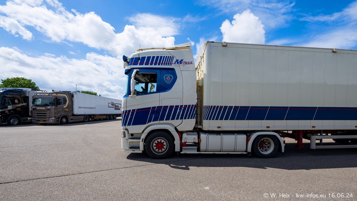 Ende Januar 2024 hat die Firma Gijs Boss die Fahrzeuge von Ruud Hagens Datrans B.V. übernommen. Das schwarze Design bleibt erhalten, den ersten neuen DAF XG+ mit neuem Aufleger, beschriftet mit "Datrans" gibt es auf den ersten Bildern in dieser Galerie zu sehen. Dazu kommen aktuell zwei weiße DAF XG+, die in Deutschland zugelassen sind (Moers MO, Kreis Wesel). Die Fahrzeuge in den bekannten Farben von Gijs Boss gibt es weiterhin. Diese stehen jedoch weiterhin verteilt bei Kunden oder Fahrern zuhause. Die zweite "neue" Firma ist jetzt Laura Hagens, Das ist bekanntlich die Tochter von Ruud Hagens. Unter dem Namen laufen alle SCANIA NextGen mit Schubboden/Walking-Floor Aufliegern. Die beiden M-Trex SCANIA gehören dazu. Alle Planenauflieger gehörten bisher Ruud Hagens Datrans B.V. Dazu kommen noch die IVECO S-Way, von Helene-Speed (Deutschland und Rumänien). Da sicherlich alle Fahrzeuge über länger Zeit noch "bunt gemischt" zu sehen sein werden, habe ich erstmal alles unter dem Namen Boss-Datrans & Laura Hagens zusammengefasst. Alle LKW werden auch weiterhin auf dem bekannten Gelände in Wanssum stehen.
