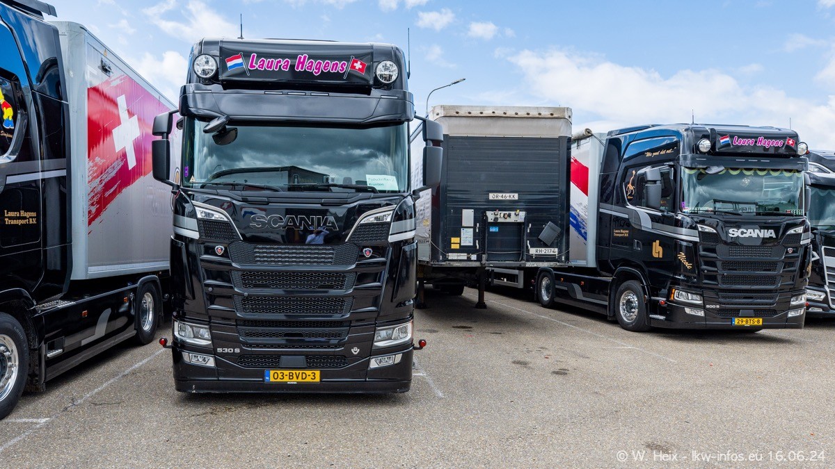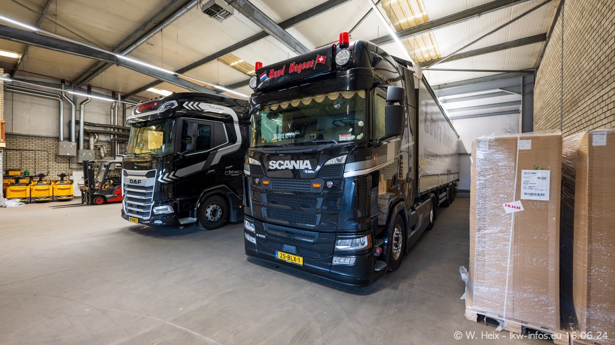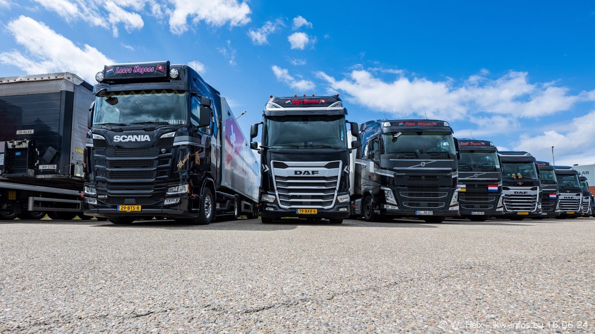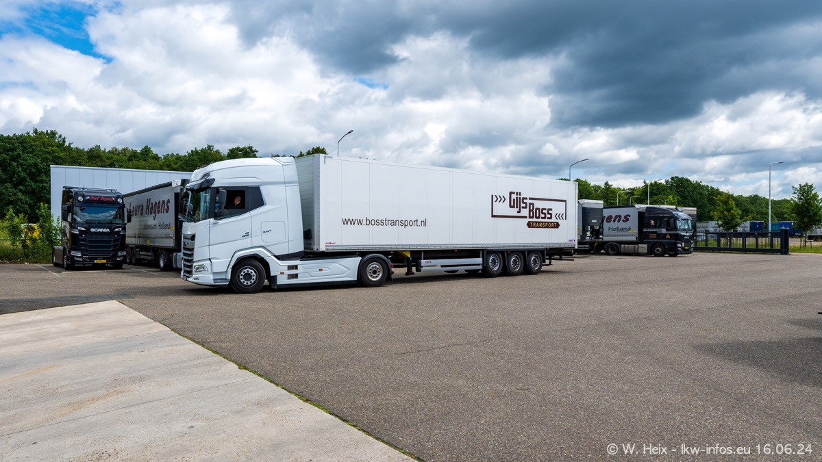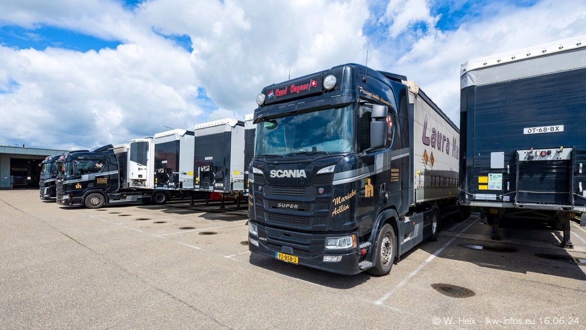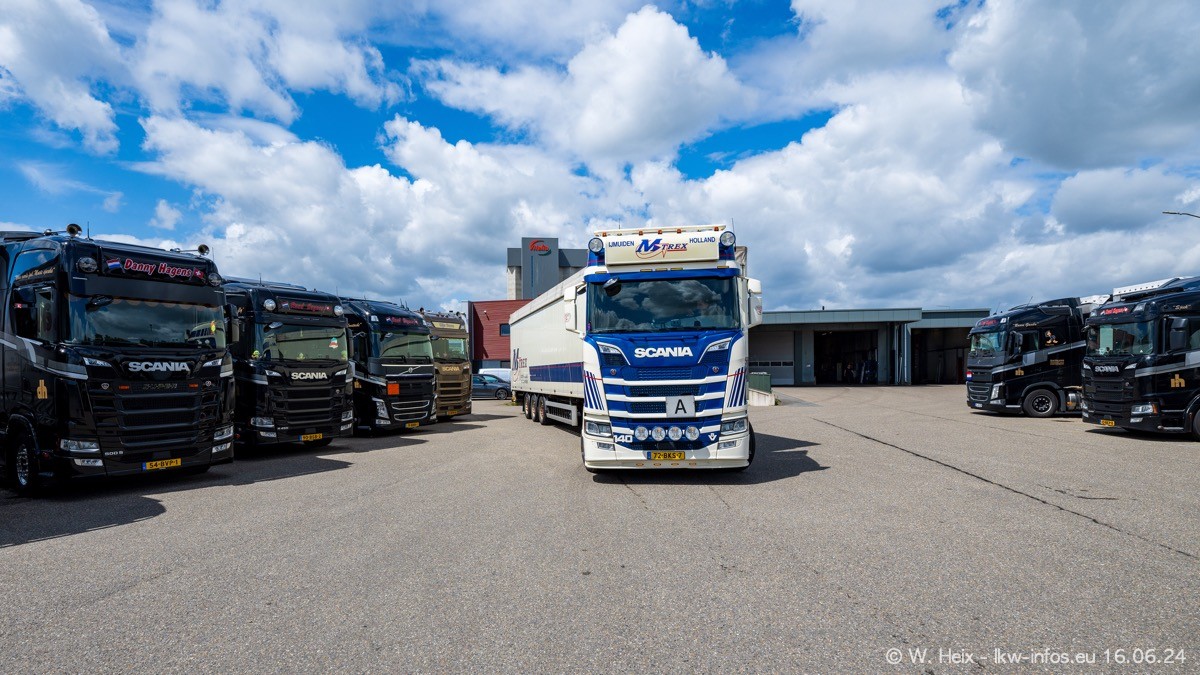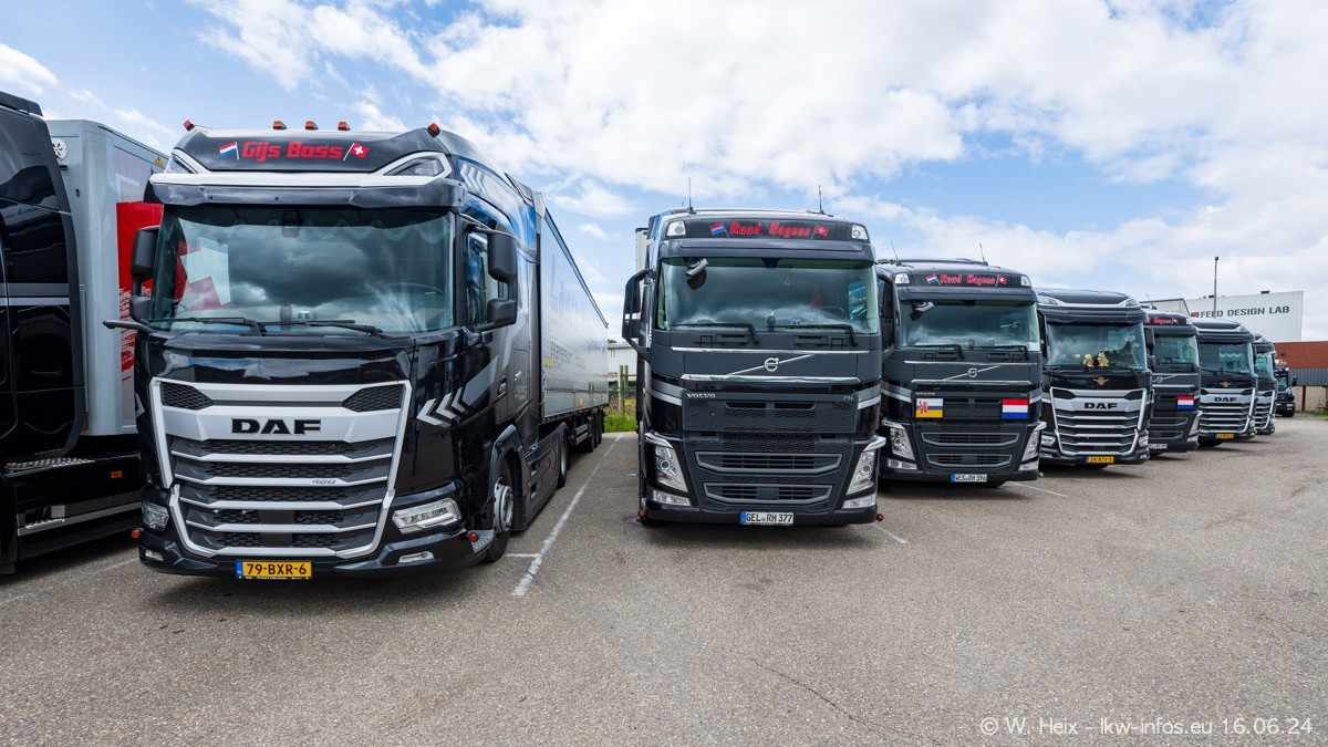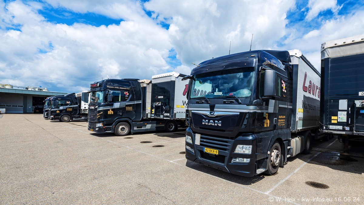 Ende Januar 2024 hat die Firma Gijs Boss die Fahrzeuge von Ruud Hagens Datrans B.V. übernommen. Das schwarze Design bleibt erhalten, den ersten neuen DAF XG+ mit neuem Aufleger, beschriftet mit "Datrans" gibt es auf den ersten Bildern in dieser Galerie zu sehen. Dazu kommen aktuell zwei weiße DAF XG+, die in Deutschland zugelassen sind (Moers MO, Kreis Wesel). Die Fahrzeuge in den bekannten Farben von Gijs Boss gibt es weiterhin. Diese stehen jedoch weiterhin verteilt bei Kunden oder Fahrern zuhause. Die zweite "neue" Firma ist jetzt Laura Hagens, Das ist bekanntlich die Tochter von Ruud Hagens. Unter dem Namen laufen alle SCANIA NextGen mit Schubboden/Walking-Floor Aufliegern. Die beiden M-Trex SCANIA gehören dazu. Alle Planenauflieger gehörten bisher Ruud Hagens Datrans B.V. Dazu kommen noch die IVECO S-Way, von Helene-Speed (Deutschland und Rumänien). Da sicherlich alle Fahrzeuge über länger Zeit noch "bunt gemischt" zu sehen sein werden, habe ich erstmal alles unter dem Namen Boss-Datrans & Laura Hagens zusammengefasst. Alle LKW werden auch weiterhin auf dem bekannten Gelände in Wanssum stehen.