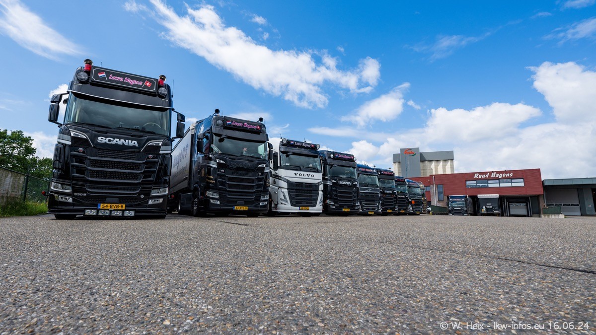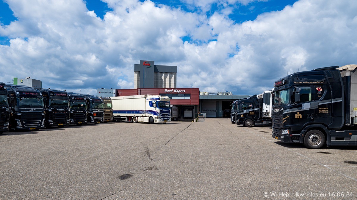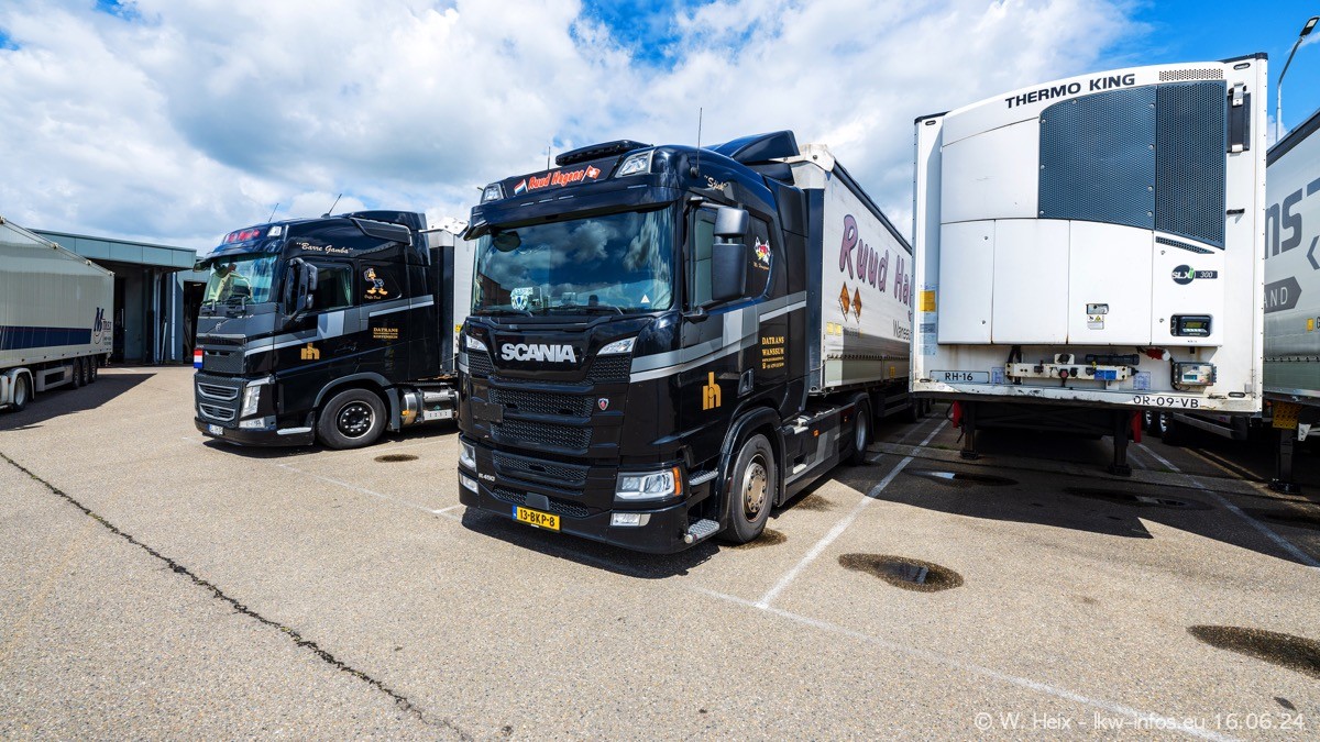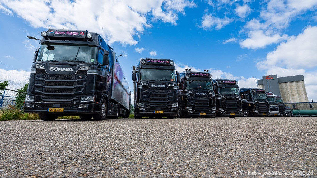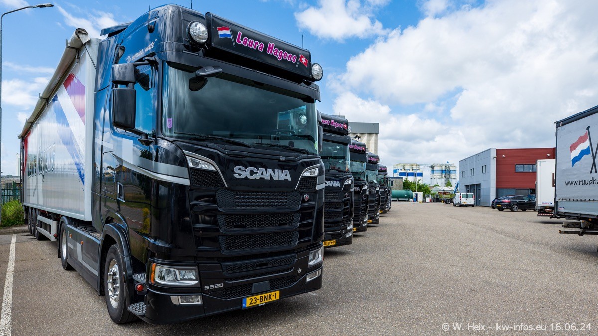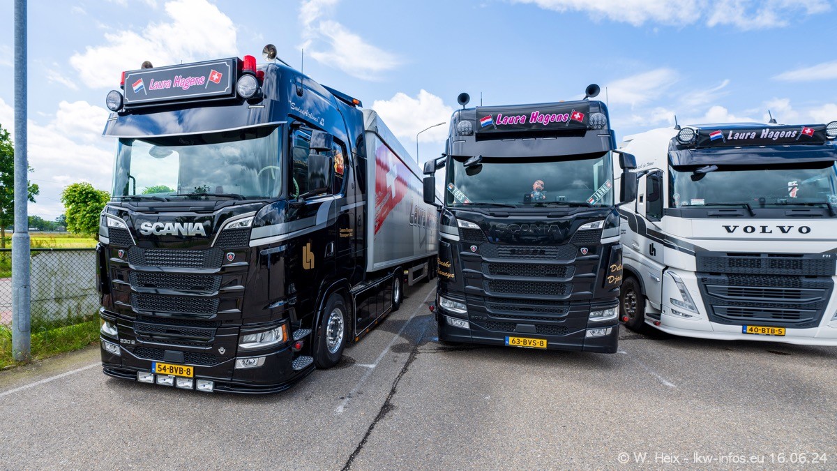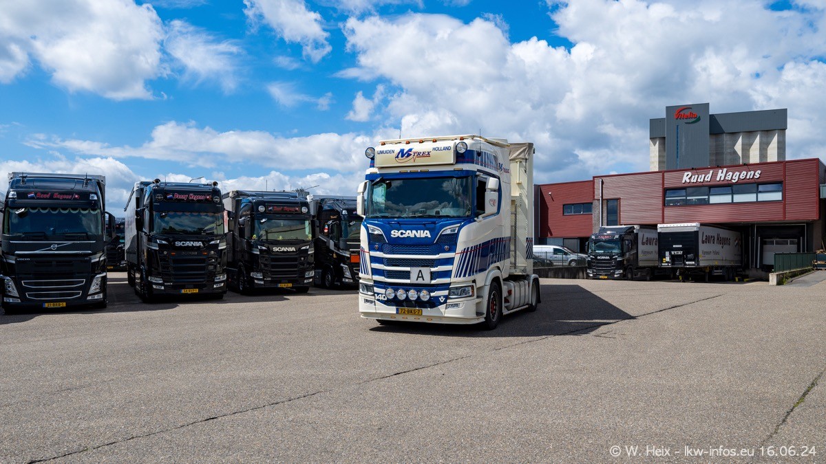 Ende Januar 2024 hat die Firma Gijs Boss die Fahrzeuge von Ruud Hagens Datrans B.V. übernommen. Das schwarze Design bleibt erhalten, den ersten neuen DAF XG+ mit neuem Aufleger, beschriftet mit "Datrans" gibt es auf den ersten Bildern in dieser Galerie zu sehen. Dazu kommen aktuell zwei weiße DAF XG+, die in Deutschland zugelassen sind (Moers MO, Kreis Wesel). Die Fahrzeuge in den bekannten Farben von Gijs Boss gibt es weiterhin. Diese stehen jedoch weiterhin verteilt bei Kunden oder Fahrern zuhause. Die zweite "neue" Firma ist jetzt Laura Hagens, Das ist bekanntlich die Tochter von Ruud Hagens. Unter dem Namen laufen alle SCANIA NextGen mit Schubboden/Walking-Floor Aufliegern. Die beiden M-Trex SCANIA gehören dazu. Alle Planenauflieger gehörten bisher Ruud Hagens Datrans B.V. Dazu kommen noch die IVECO S-Way, von Helene-Speed (Deutschland und Rumänien). Da sicherlich alle Fahrzeuge über länger Zeit noch "bunt gemischt" zu sehen sein werden, habe ich erstmal alles unter dem Namen Boss-Datrans & Laura Hagens zusammengefasst. Alle LKW werden auch weiterhin auf dem bekannten Gelände in Wanssum stehen.