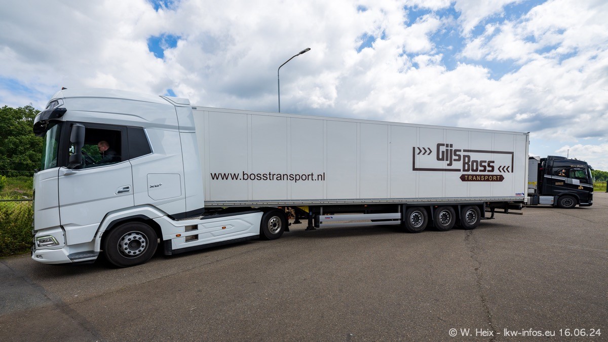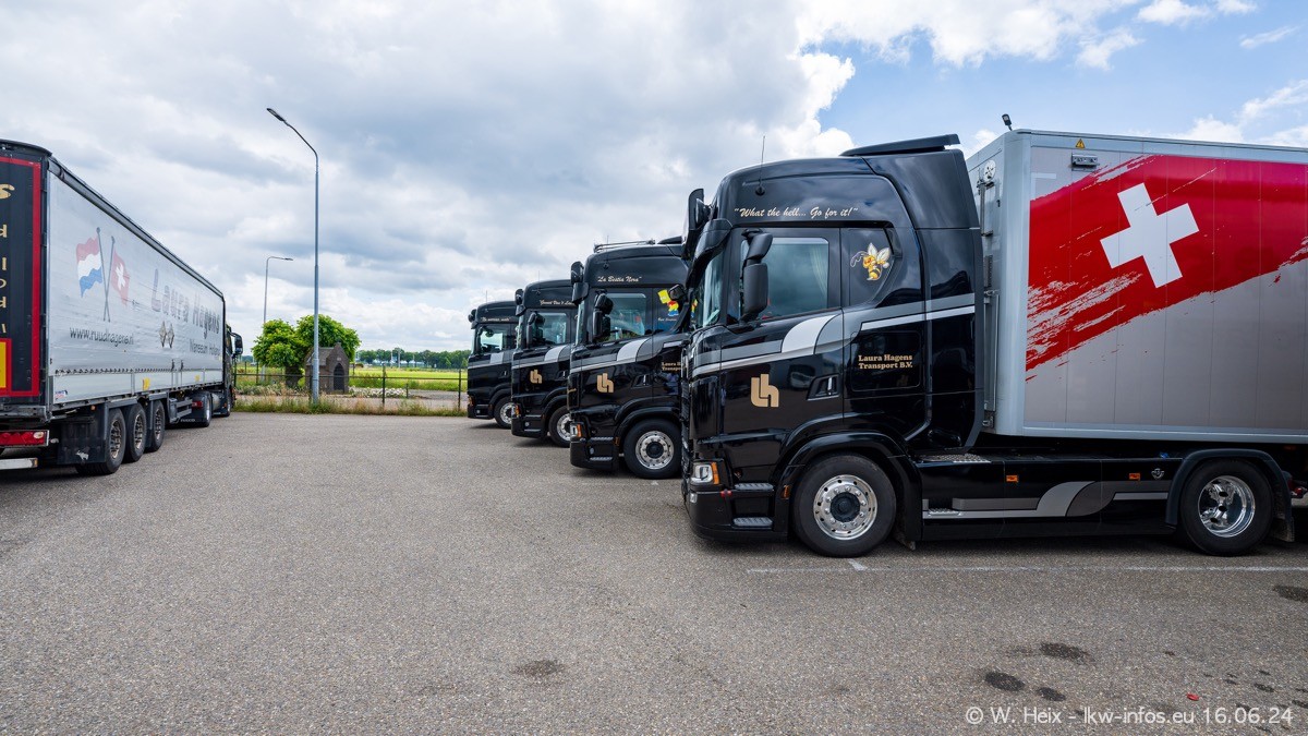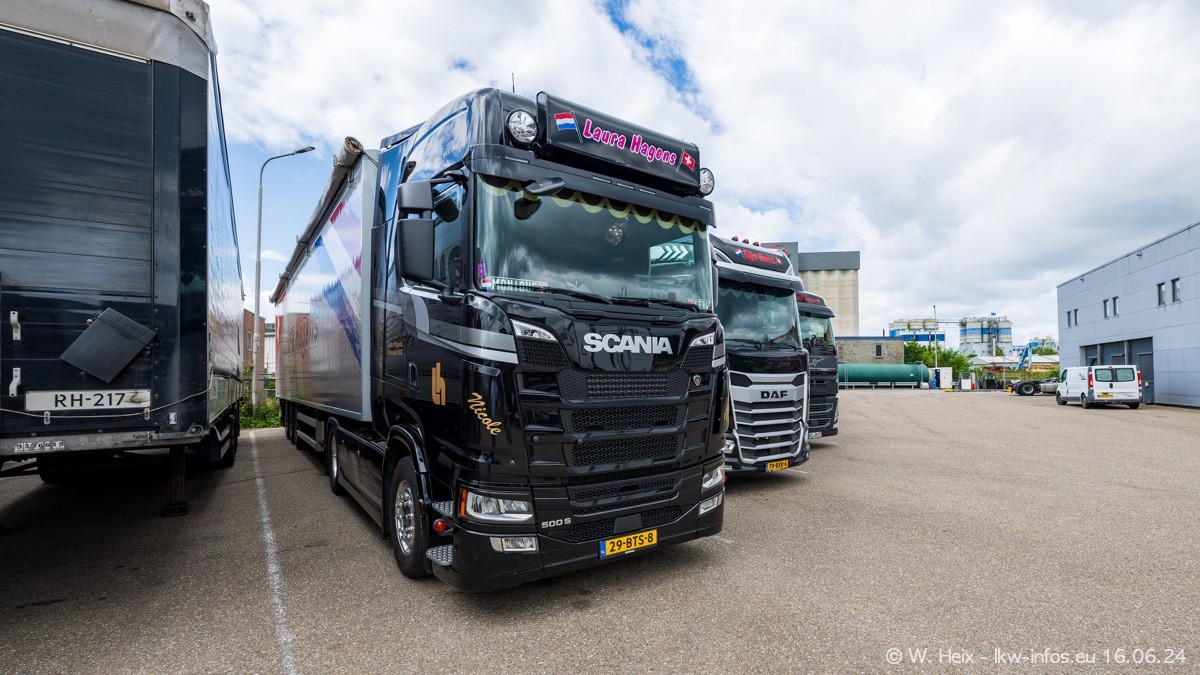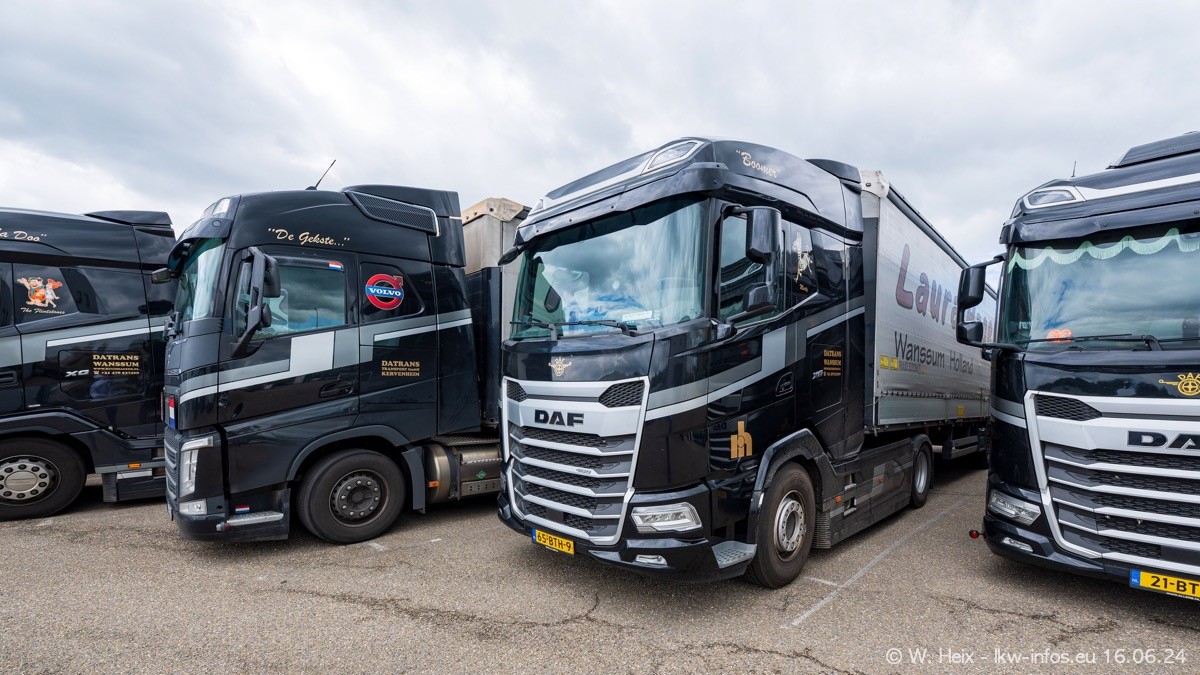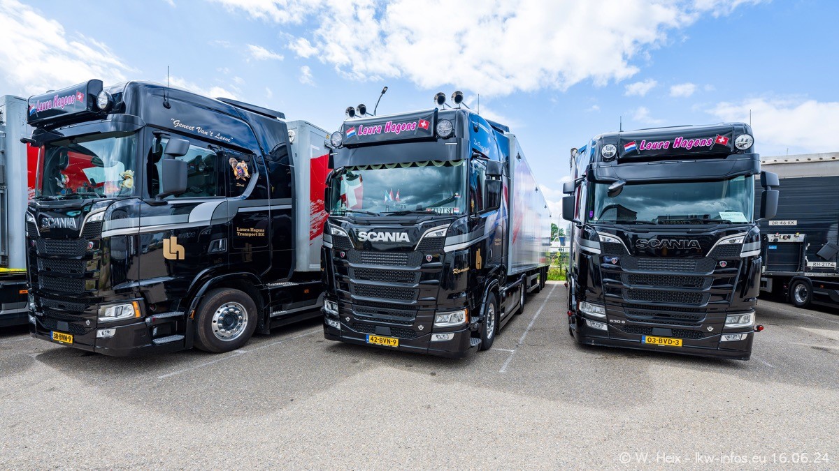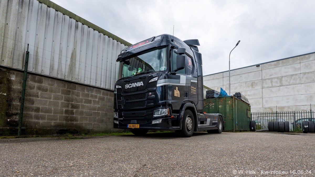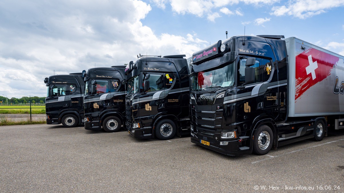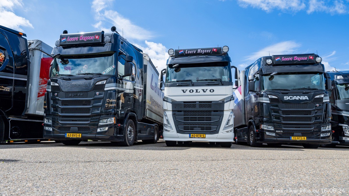 Ende Januar 2024 hat die Firma Gijs Boss die Fahrzeuge von Ruud Hagens Datrans B.V. übernommen. Das schwarze Design bleibt erhalten, den ersten neuen DAF XG+ mit neuem Aufleger, beschriftet mit "Datrans" gibt es auf den ersten Bildern in dieser Galerie zu sehen. Dazu kommen aktuell zwei weiße DAF XG+, die in Deutschland zugelassen sind (Moers MO, Kreis Wesel). Die Fahrzeuge in den bekannten Farben von Gijs Boss gibt es weiterhin. Diese stehen jedoch weiterhin verteilt bei Kunden oder Fahrern zuhause. Die zweite "neue" Firma ist jetzt Laura Hagens, Das ist bekanntlich die Tochter von Ruud Hagens. Unter dem Namen laufen alle SCANIA NextGen mit Schubboden/Walking-Floor Aufliegern. Die beiden M-Trex SCANIA gehören dazu. Alle Planenauflieger gehörten bisher Ruud Hagens Datrans B.V. Dazu kommen noch die IVECO S-Way, von Helene-Speed (Deutschland und Rumänien). Da sicherlich alle Fahrzeuge über länger Zeit noch "bunt gemischt" zu sehen sein werden, habe ich erstmal alles unter dem Namen Boss-Datrans & Laura Hagens zusammengefasst. Alle LKW werden auch weiterhin auf dem bekannten Gelände in Wanssum stehen.