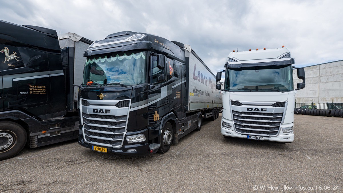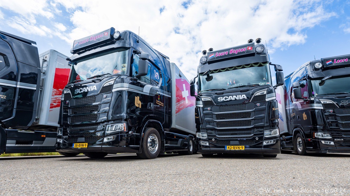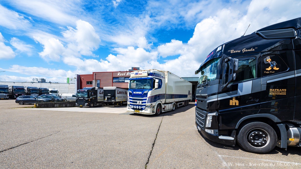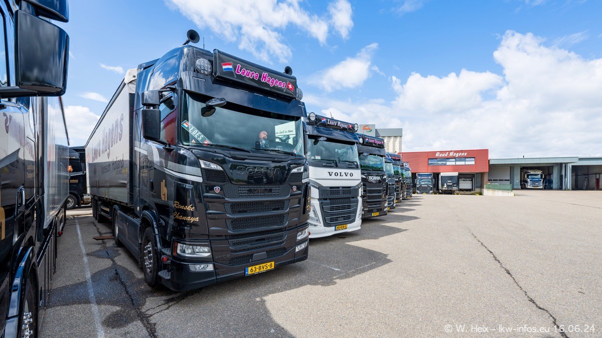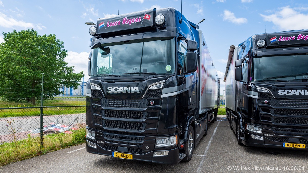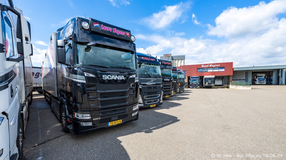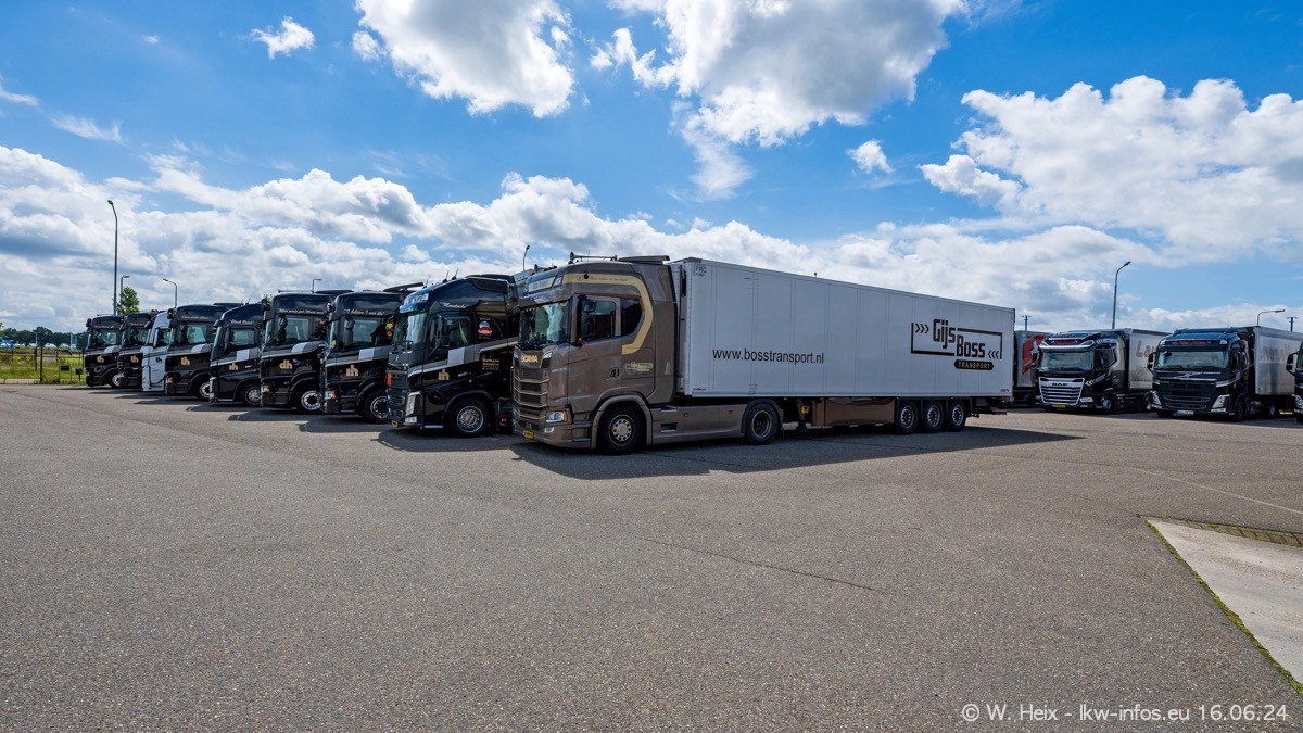 Ende Januar 2024 hat die Firma Gijs Boss die Fahrzeuge von Ruud Hagens Datrans B.V. übernommen. Das schwarze Design bleibt erhalten, den ersten neuen DAF XG+ mit neuem Aufleger, beschriftet mit "Datrans" gibt es auf den ersten Bildern in dieser Galerie zu sehen. Dazu kommen aktuell zwei weiße DAF XG+, die in Deutschland zugelassen sind (Moers MO, Kreis Wesel). Die Fahrzeuge in den bekannten Farben von Gijs Boss gibt es weiterhin. Diese stehen jedoch weiterhin verteilt bei Kunden oder Fahrern zuhause. Die zweite "neue" Firma ist jetzt Laura Hagens, Das ist bekanntlich die Tochter von Ruud Hagens. Unter dem Namen laufen alle SCANIA NextGen mit Schubboden/Walking-Floor Aufliegern. Die beiden M-Trex SCANIA gehören dazu. Alle Planenauflieger gehörten bisher Ruud Hagens Datrans B.V. Dazu kommen noch die IVECO S-Way, von Helene-Speed (Deutschland und Rumänien). Da sicherlich alle Fahrzeuge über länger Zeit noch "bunt gemischt" zu sehen sein werden, habe ich erstmal alles unter dem Namen Boss-Datrans & Laura Hagens zusammengefasst. Alle LKW werden auch weiterhin auf dem bekannten Gelände in Wanssum stehen.
