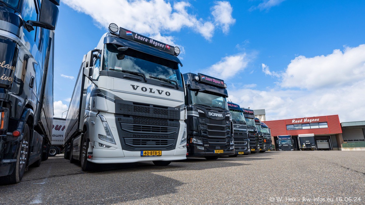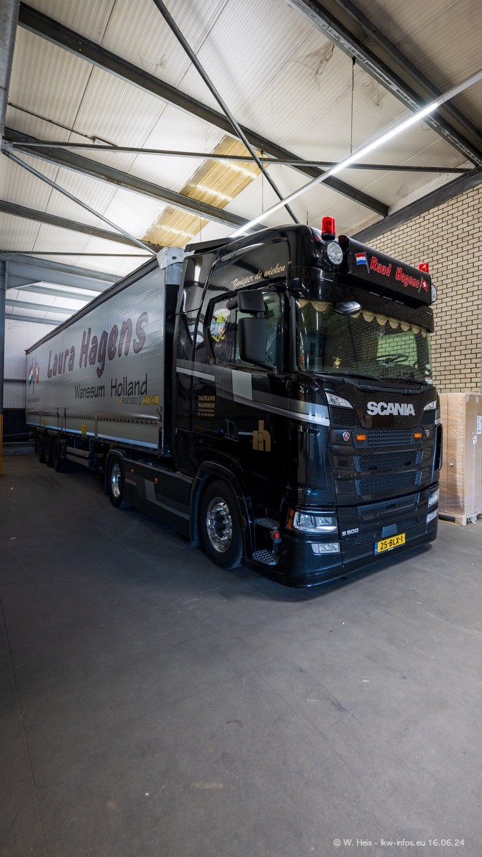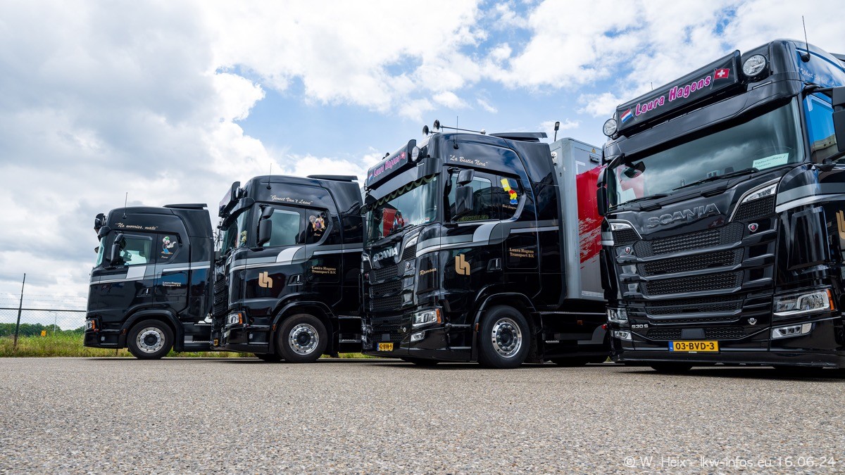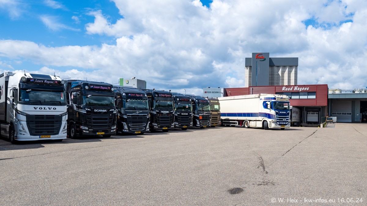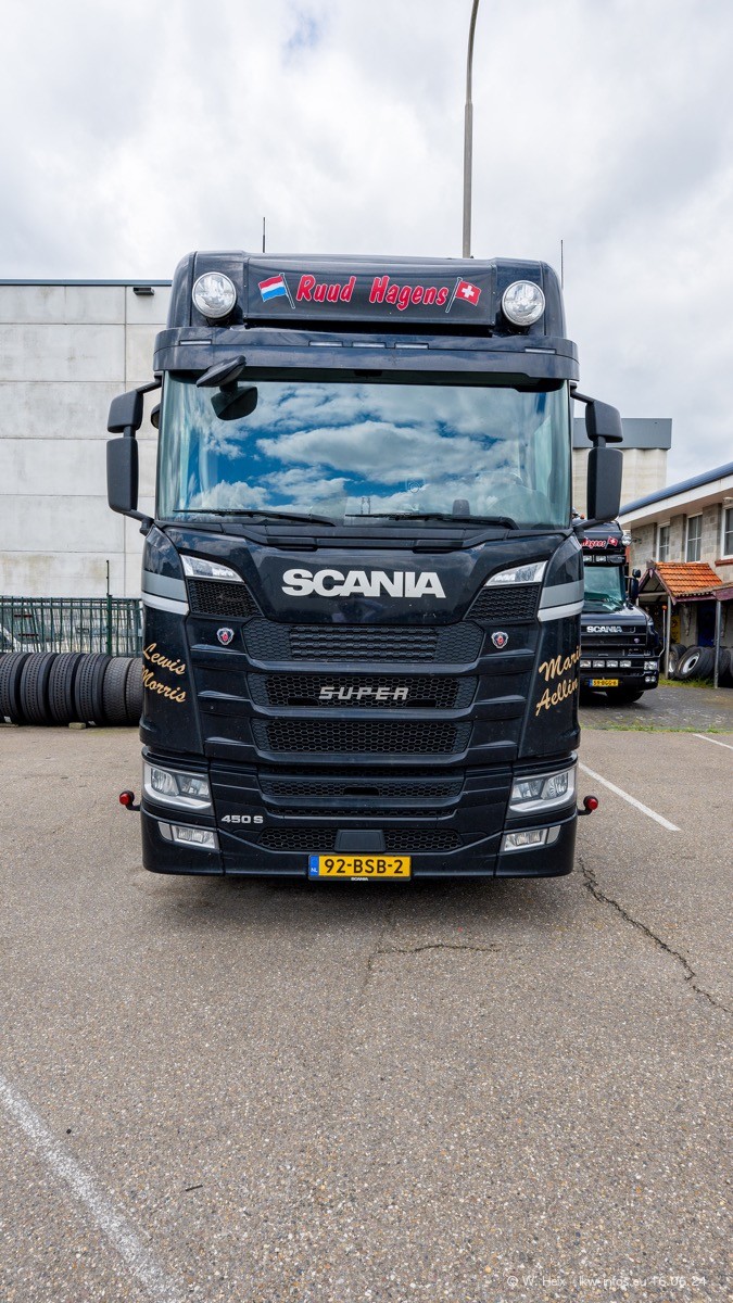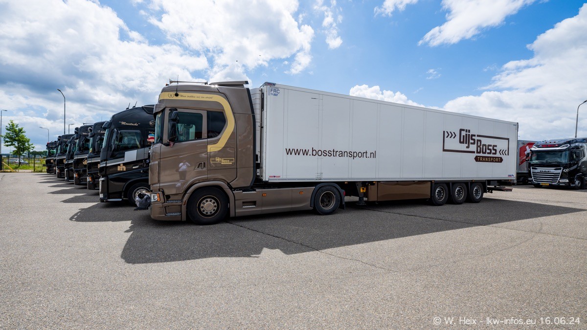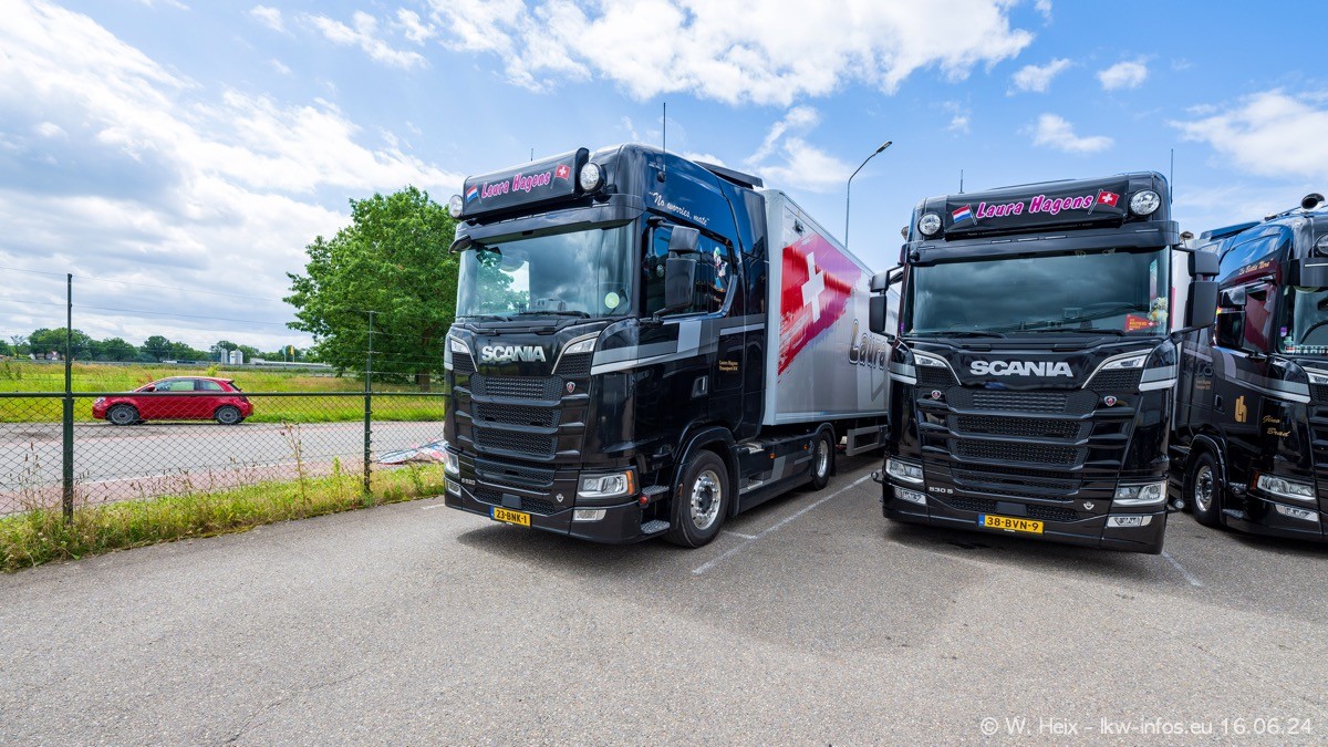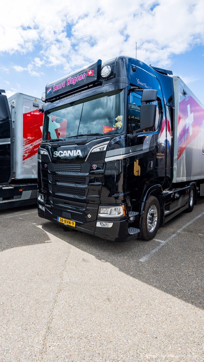Ende Januar 2024 hat die Firma Gijs Boss die Fahrzeuge von Ruud Hagens Datrans B.V. übernommen. Das schwarze Design bleibt erhalten, den ersten neuen DAF XG+ mit neuem Aufleger, beschriftet mit "Datrans" gibt es auf den ersten Bildern in dieser Galerie zu sehen. Dazu kommen aktuell zwei weiße DAF XG+, die in Deutschland zugelassen sind (Moers MO, Kreis Wesel). Die Fahrzeuge in den bekannten Farben von Gijs Boss gibt es weiterhin. Diese stehen jedoch weiterhin verteilt bei Kunden oder Fahrern zuhause. Die zweite "neue" Firma ist jetzt Laura Hagens, Das ist bekanntlich die Tochter von Ruud Hagens. Unter dem Namen laufen alle SCANIA NextGen mit Schubboden/Walking-Floor Aufliegern. Die beiden M-Trex SCANIA gehören dazu. Alle Planenauflieger gehörten bisher Ruud Hagens Datrans B.V. Dazu kommen noch die IVECO S-Way, von Helene-Speed (Deutschland und Rumänien). Da sicherlich alle Fahrzeuge über länger Zeit noch "bunt gemischt" zu sehen sein werden, habe ich erstmal alles unter dem Namen Boss-Datrans & Laura Hagens zusammengefasst. Alle LKW werden auch weiterhin auf dem bekannten Gelände in Wanssum stehen.