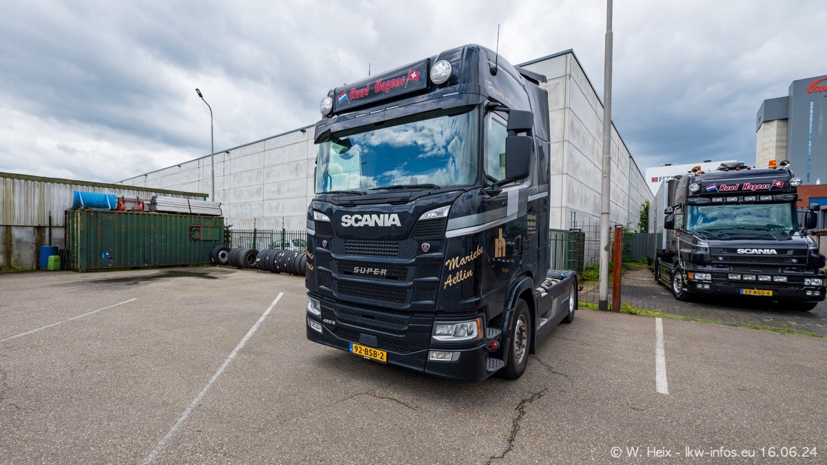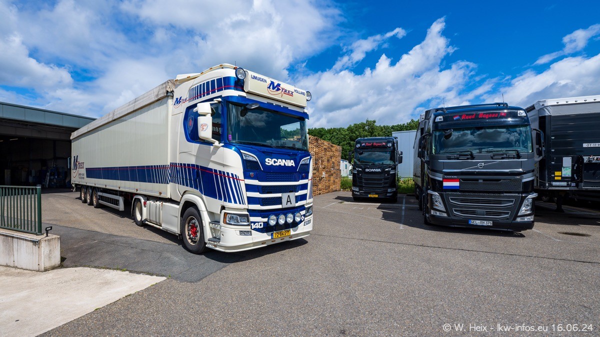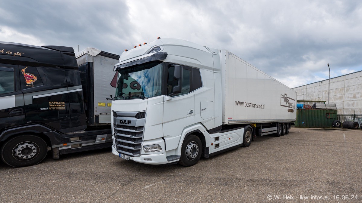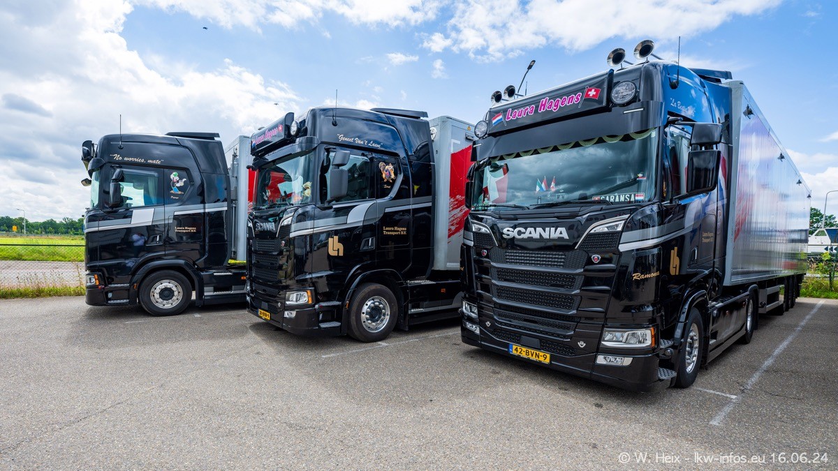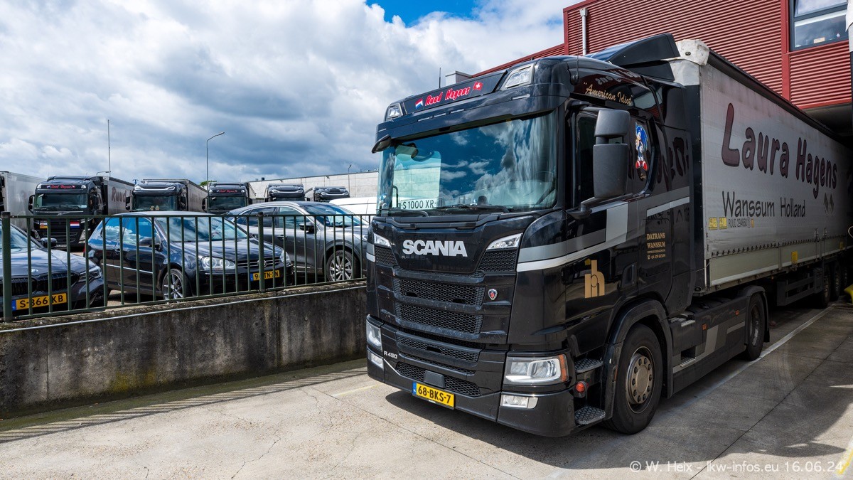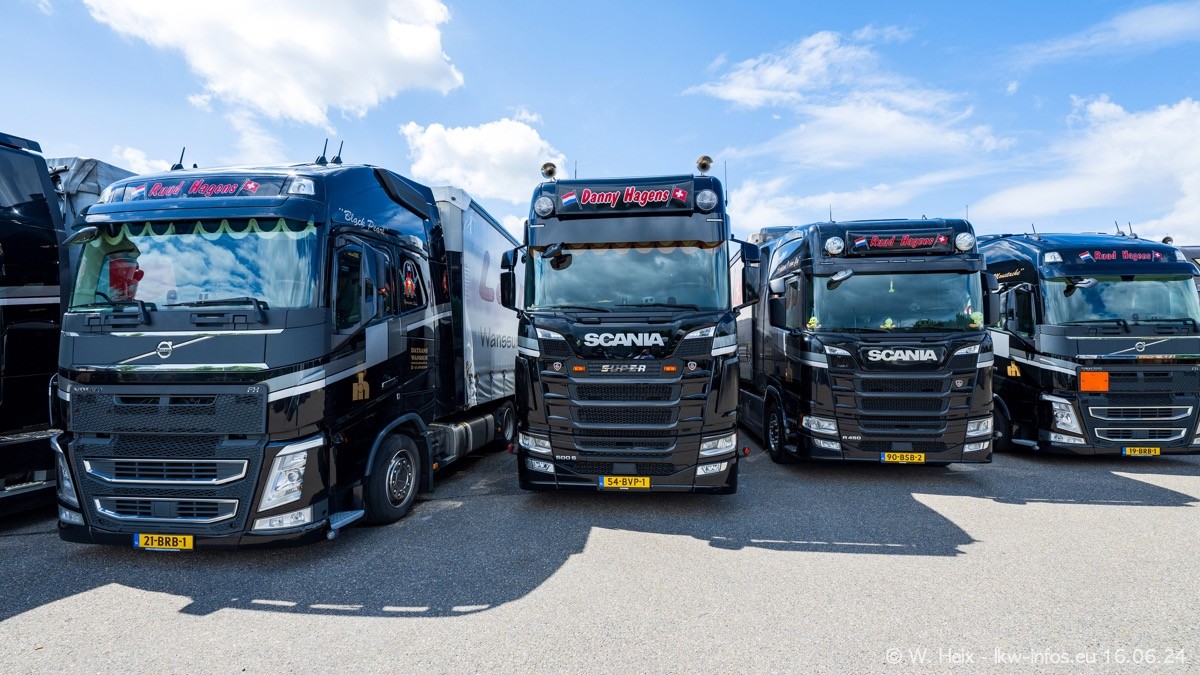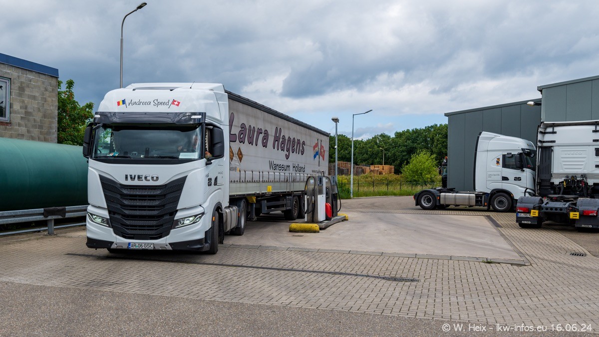 Ende Januar 2024 hat die Firma Gijs Boss die Fahrzeuge von Ruud Hagens Datrans B.V. übernommen. Das schwarze Design bleibt erhalten, den ersten neuen DAF XG+ mit neuem Aufleger, beschriftet mit "Datrans" gibt es auf den ersten Bildern in dieser Galerie zu sehen. Dazu kommen aktuell zwei weiße DAF XG+, die in Deutschland zugelassen sind (Moers MO, Kreis Wesel). Die Fahrzeuge in den bekannten Farben von Gijs Boss gibt es weiterhin. Diese stehen jedoch weiterhin verteilt bei Kunden oder Fahrern zuhause. Die zweite "neue" Firma ist jetzt Laura Hagens, Das ist bekanntlich die Tochter von Ruud Hagens. Unter dem Namen laufen alle SCANIA NextGen mit Schubboden/Walking-Floor Aufliegern. Die beiden M-Trex SCANIA gehören dazu. Alle Planenauflieger gehörten bisher Ruud Hagens Datrans B.V. Dazu kommen noch die IVECO S-Way, von Helene-Speed (Deutschland und Rumänien). Da sicherlich alle Fahrzeuge über länger Zeit noch "bunt gemischt" zu sehen sein werden, habe ich erstmal alles unter dem Namen Boss-Datrans & Laura Hagens zusammengefasst. Alle LKW werden auch weiterhin auf dem bekannten Gelände in Wanssum stehen.