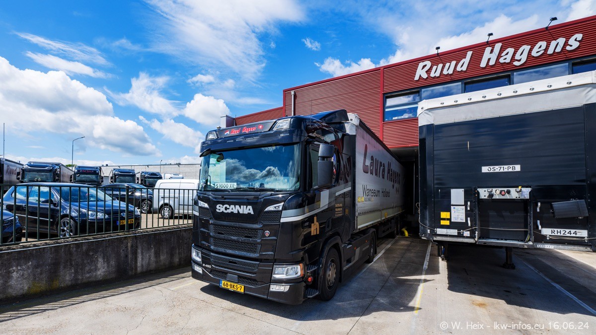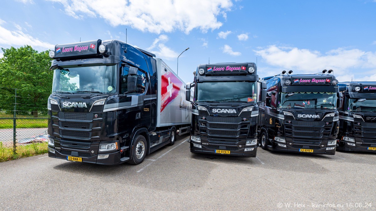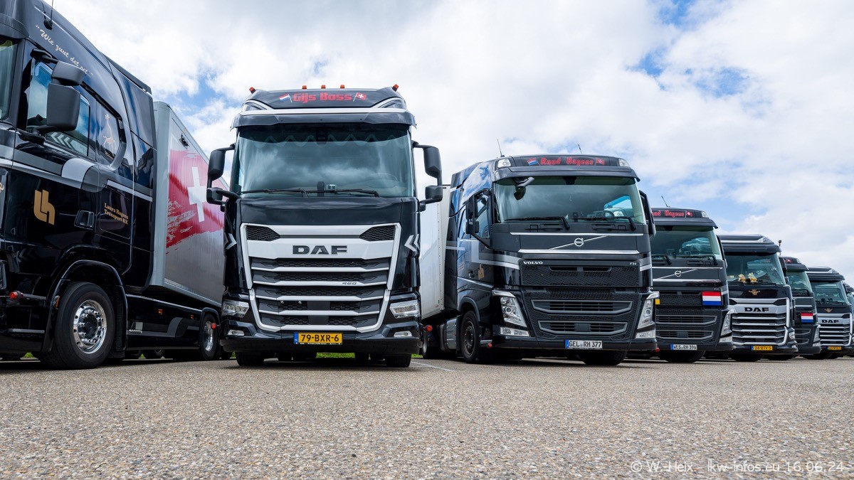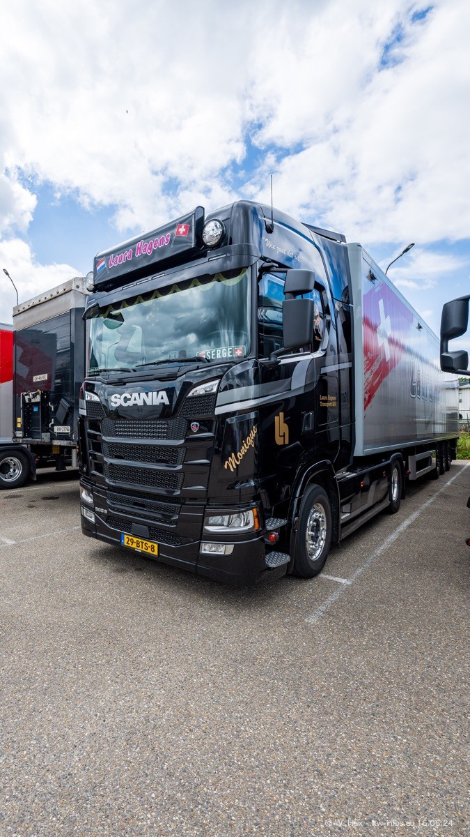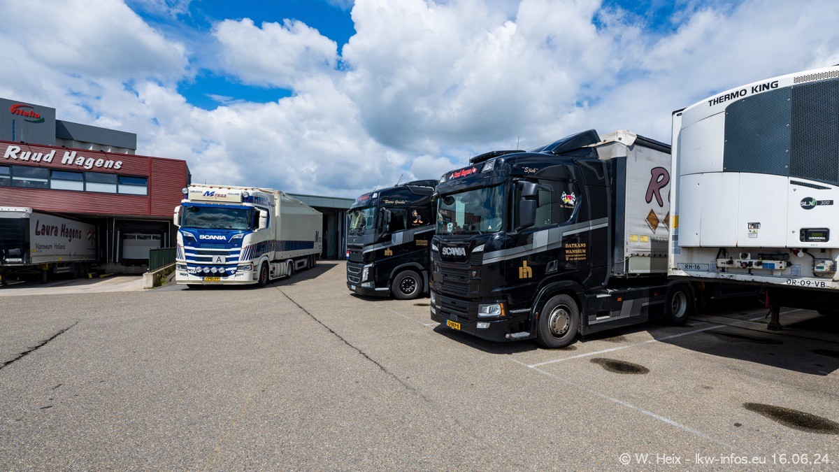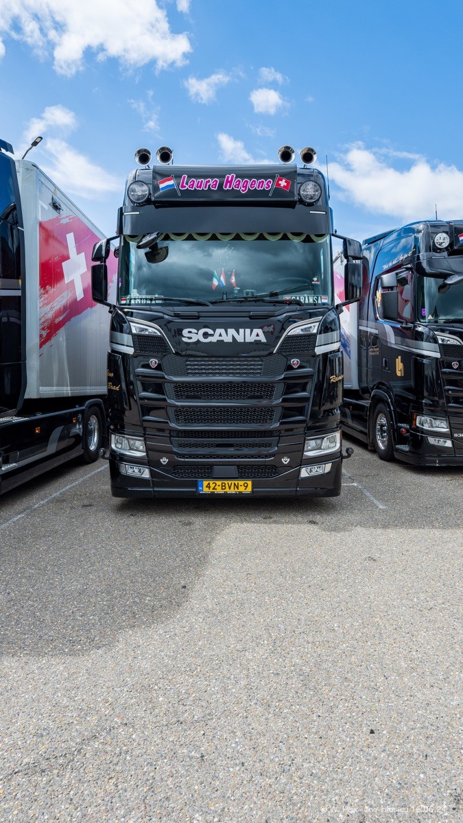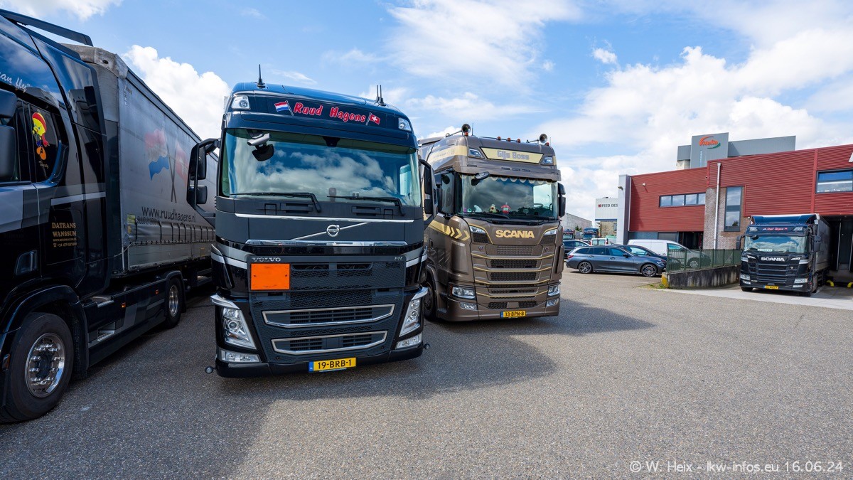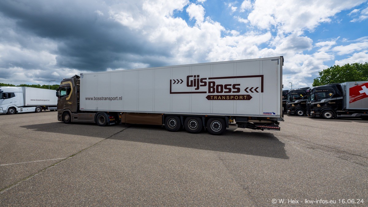 Ende Januar 2024 hat die Firma Gijs Boss die Fahrzeuge von Ruud Hagens Datrans B.V. übernommen. Das schwarze Design bleibt erhalten, den ersten neuen DAF XG+ mit neuem Aufleger, beschriftet mit "Datrans" gibt es auf den ersten Bildern in dieser Galerie zu sehen. Dazu kommen aktuell zwei weiße DAF XG+, die in Deutschland zugelassen sind (Moers MO, Kreis Wesel). Die Fahrzeuge in den bekannten Farben von Gijs Boss gibt es weiterhin. Diese stehen jedoch weiterhin verteilt bei Kunden oder Fahrern zuhause. Die zweite "neue" Firma ist jetzt Laura Hagens, Das ist bekanntlich die Tochter von Ruud Hagens. Unter dem Namen laufen alle SCANIA NextGen mit Schubboden/Walking-Floor Aufliegern. Die beiden M-Trex SCANIA gehören dazu. Alle Planenauflieger gehörten bisher Ruud Hagens Datrans B.V. Dazu kommen noch die IVECO S-Way, von Helene-Speed (Deutschland und Rumänien). Da sicherlich alle Fahrzeuge über länger Zeit noch "bunt gemischt" zu sehen sein werden, habe ich erstmal alles unter dem Namen Boss-Datrans & Laura Hagens zusammengefasst. Alle LKW werden auch weiterhin auf dem bekannten Gelände in Wanssum stehen.