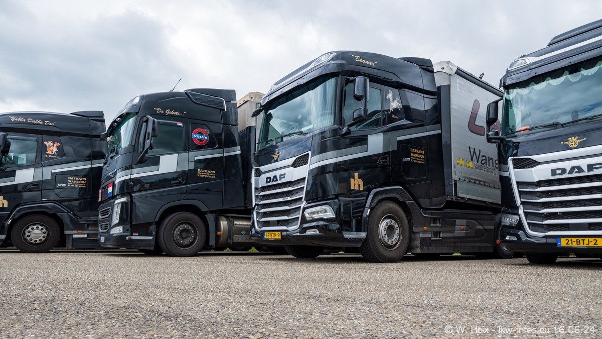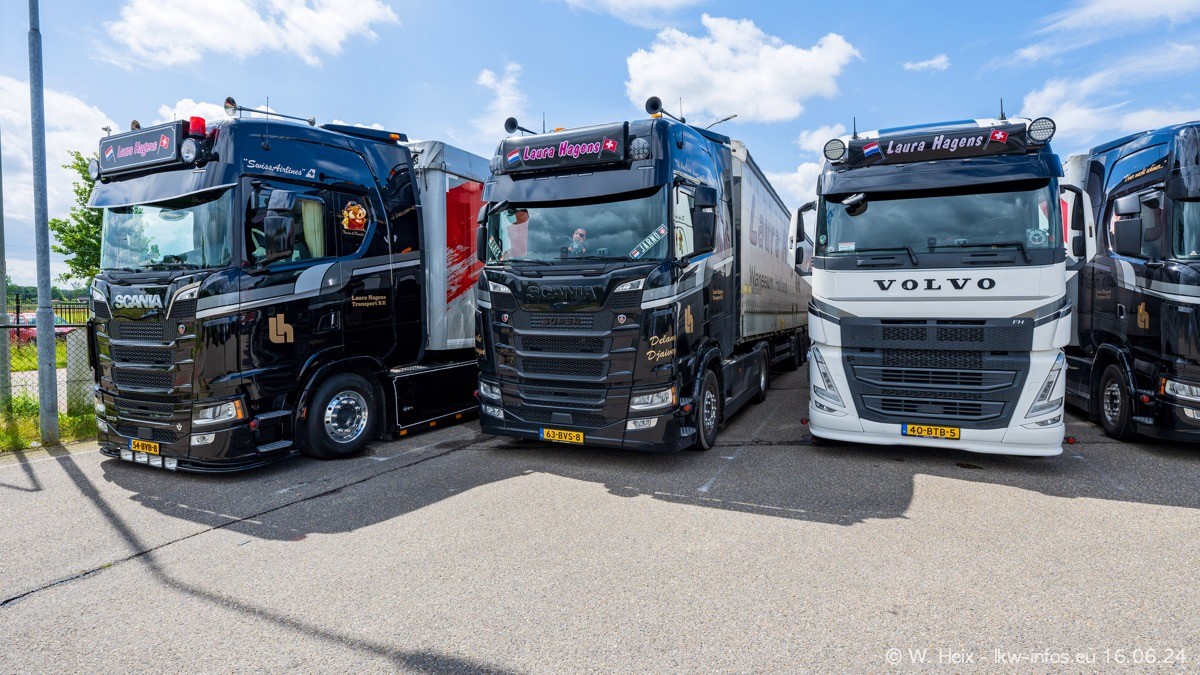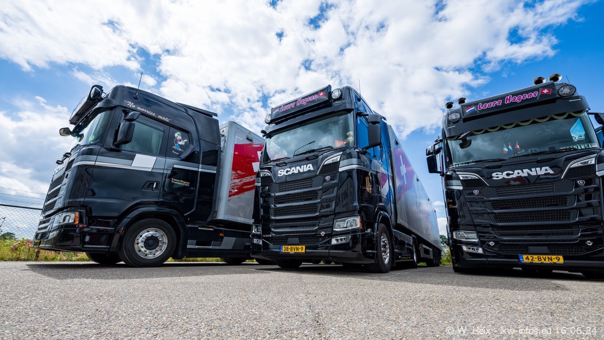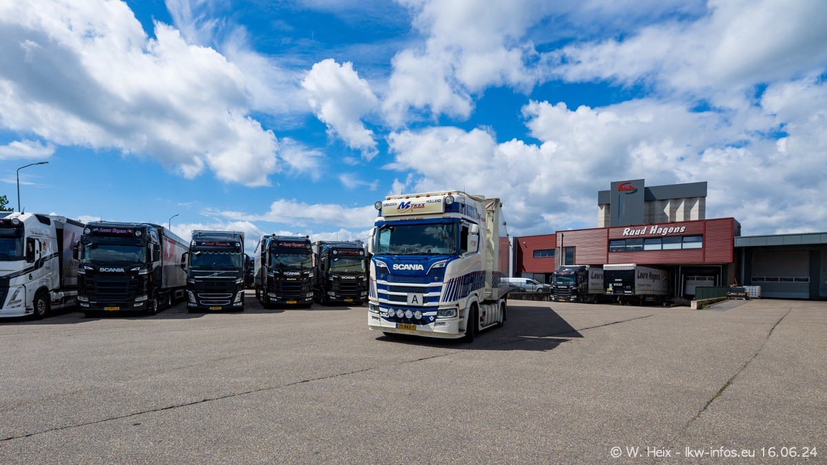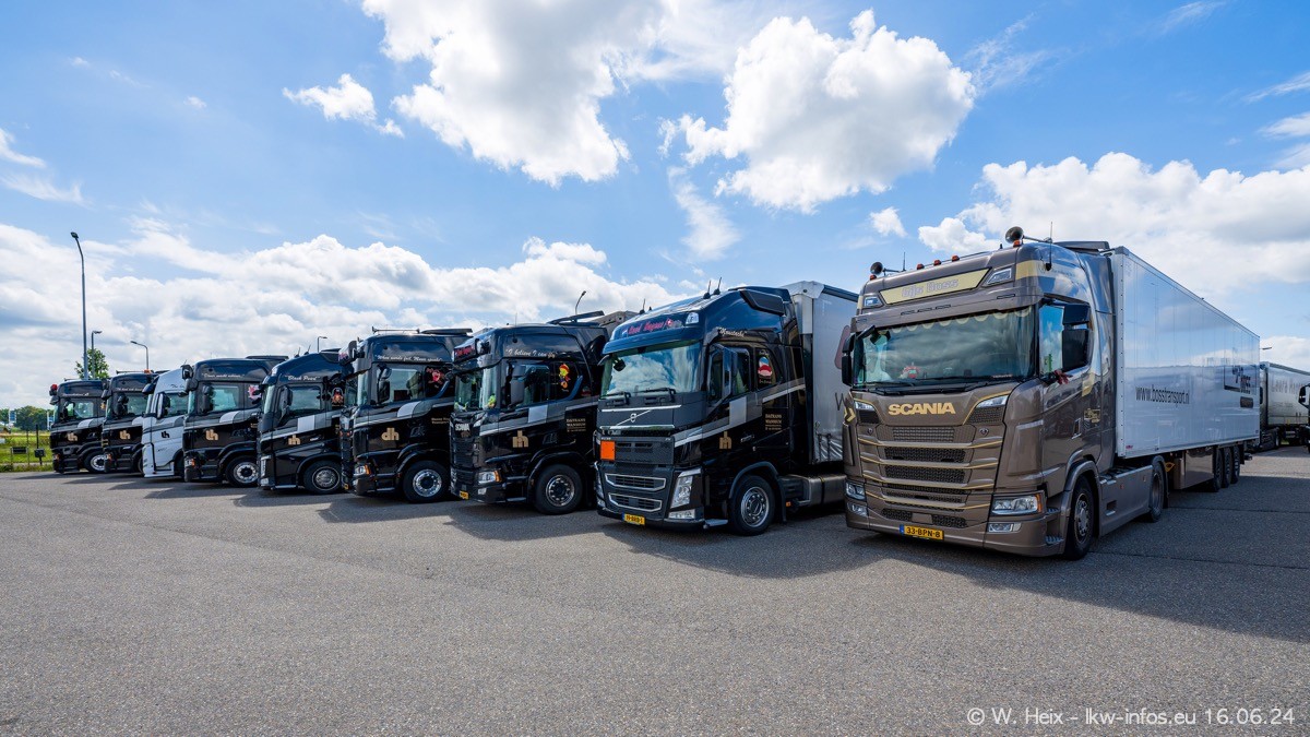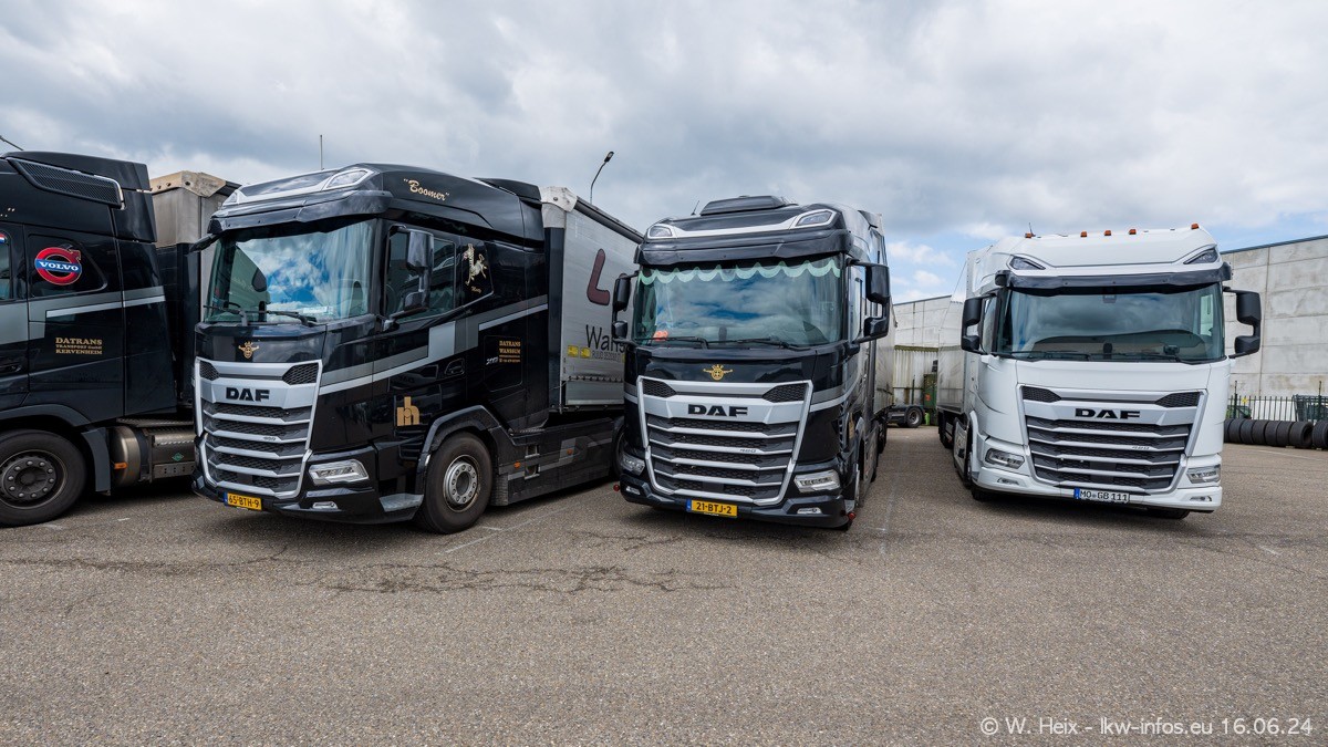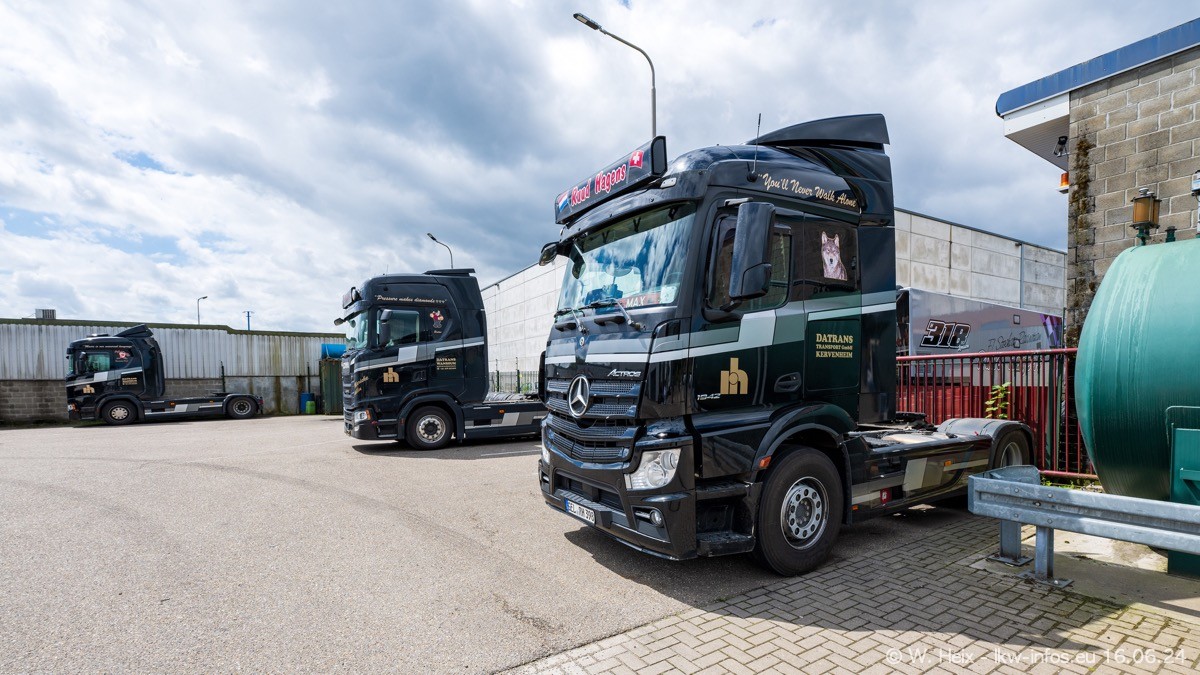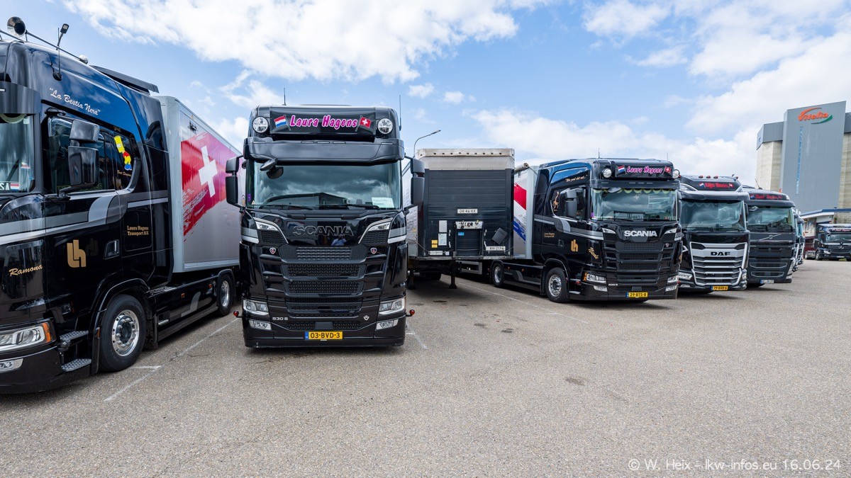 Ende Januar 2024 hat die Firma Gijs Boss die Fahrzeuge von Ruud Hagens Datrans B.V. übernommen. Das schwarze Design bleibt erhalten, den ersten neuen DAF XG+ mit neuem Aufleger, beschriftet mit "Datrans" gibt es auf den ersten Bildern in dieser Galerie zu sehen. Dazu kommen aktuell zwei weiße DAF XG+, die in Deutschland zugelassen sind (Moers MO, Kreis Wesel). Die Fahrzeuge in den bekannten Farben von Gijs Boss gibt es weiterhin. Diese stehen jedoch weiterhin verteilt bei Kunden oder Fahrern zuhause. Die zweite "neue" Firma ist jetzt Laura Hagens, Das ist bekanntlich die Tochter von Ruud Hagens. Unter dem Namen laufen alle SCANIA NextGen mit Schubboden/Walking-Floor Aufliegern. Die beiden M-Trex SCANIA gehören dazu. Alle Planenauflieger gehörten bisher Ruud Hagens Datrans B.V. Dazu kommen noch die IVECO S-Way, von Helene-Speed (Deutschland und Rumänien). Da sicherlich alle Fahrzeuge über länger Zeit noch "bunt gemischt" zu sehen sein werden, habe ich erstmal alles unter dem Namen Boss-Datrans & Laura Hagens zusammengefasst. Alle LKW werden auch weiterhin auf dem bekannten Gelände in Wanssum stehen.