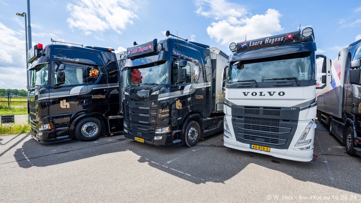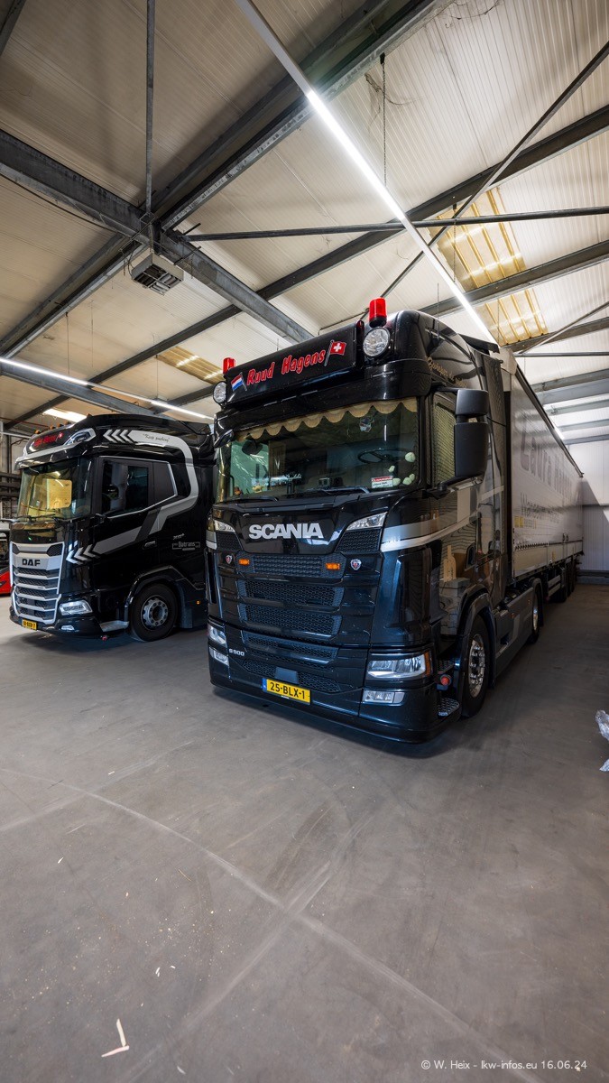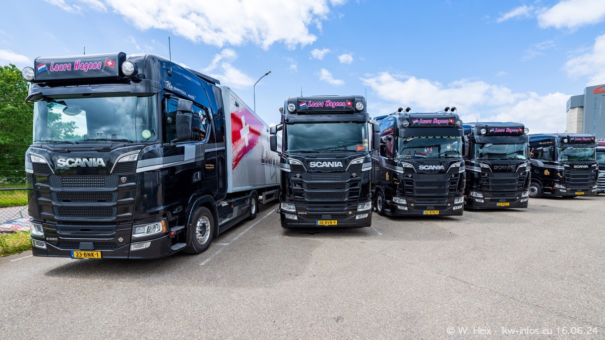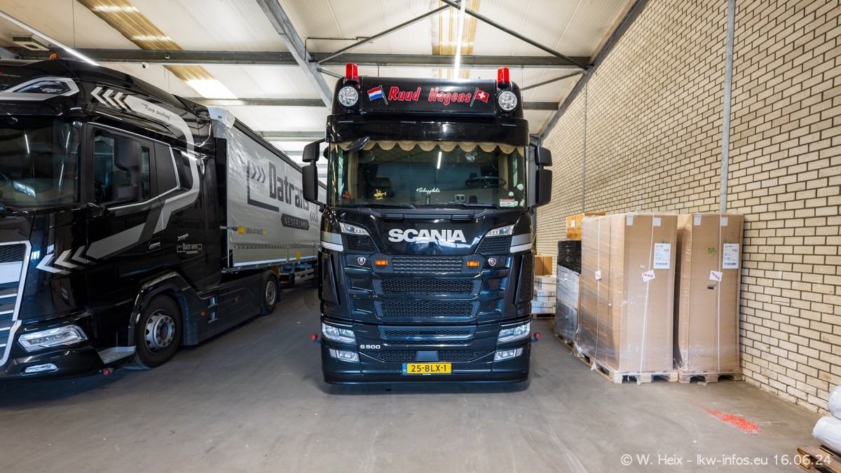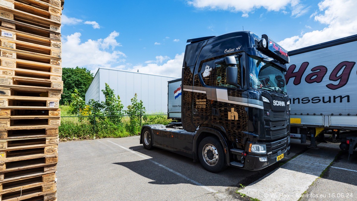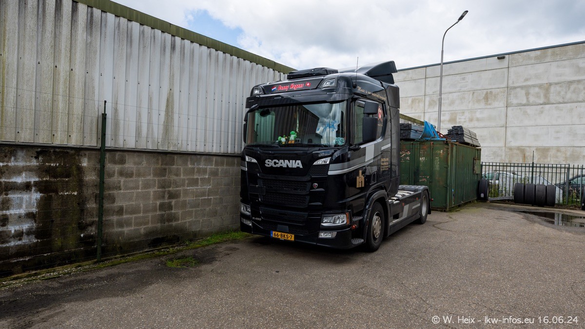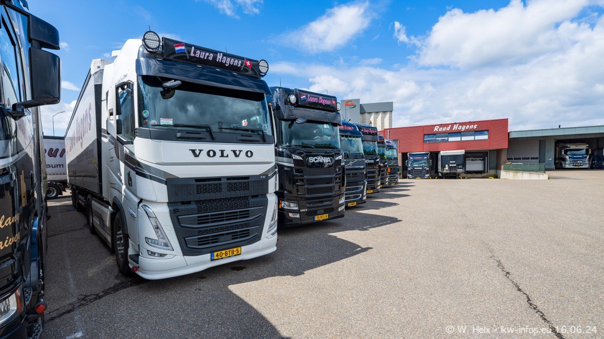 Ende Januar 2024 hat die Firma Gijs Boss die Fahrzeuge von Ruud Hagens Datrans B.V. übernommen. Das schwarze Design bleibt erhalten, den ersten neuen DAF XG+ mit neuem Aufleger, beschriftet mit "Datrans" gibt es auf den ersten Bildern in dieser Galerie zu sehen. Dazu kommen aktuell zwei weiße DAF XG+, die in Deutschland zugelassen sind (Moers MO, Kreis Wesel). Die Fahrzeuge in den bekannten Farben von Gijs Boss gibt es weiterhin. Diese stehen jedoch weiterhin verteilt bei Kunden oder Fahrern zuhause. Die zweite "neue" Firma ist jetzt Laura Hagens, Das ist bekanntlich die Tochter von Ruud Hagens. Unter dem Namen laufen alle SCANIA NextGen mit Schubboden/Walking-Floor Aufliegern. Die beiden M-Trex SCANIA gehören dazu. Alle Planenauflieger gehörten bisher Ruud Hagens Datrans B.V. Dazu kommen noch die IVECO S-Way, von Helene-Speed (Deutschland und Rumänien). Da sicherlich alle Fahrzeuge über länger Zeit noch "bunt gemischt" zu sehen sein werden, habe ich erstmal alles unter dem Namen Boss-Datrans & Laura Hagens zusammengefasst. Alle LKW werden auch weiterhin auf dem bekannten Gelände in Wanssum stehen.