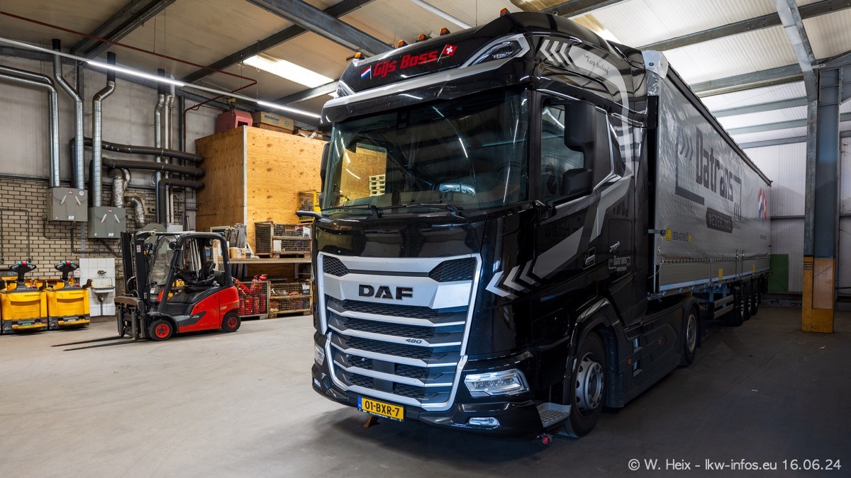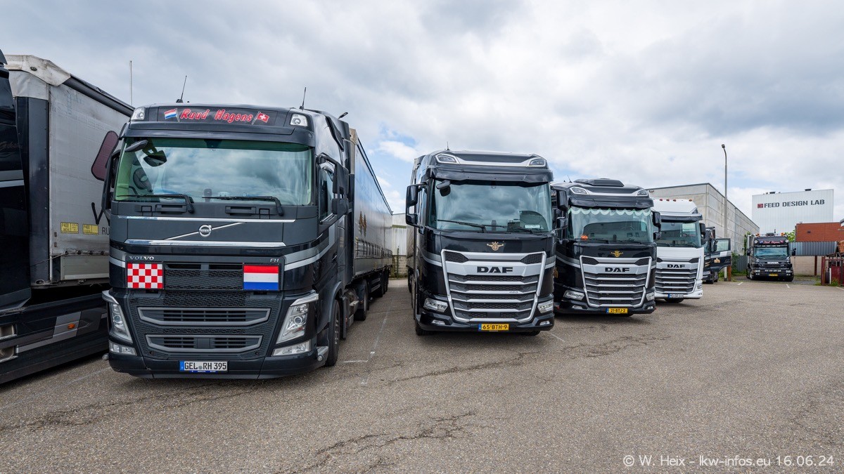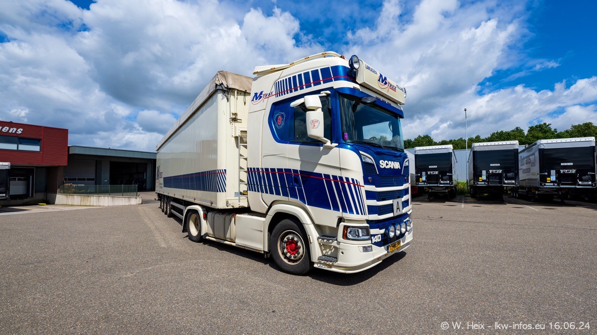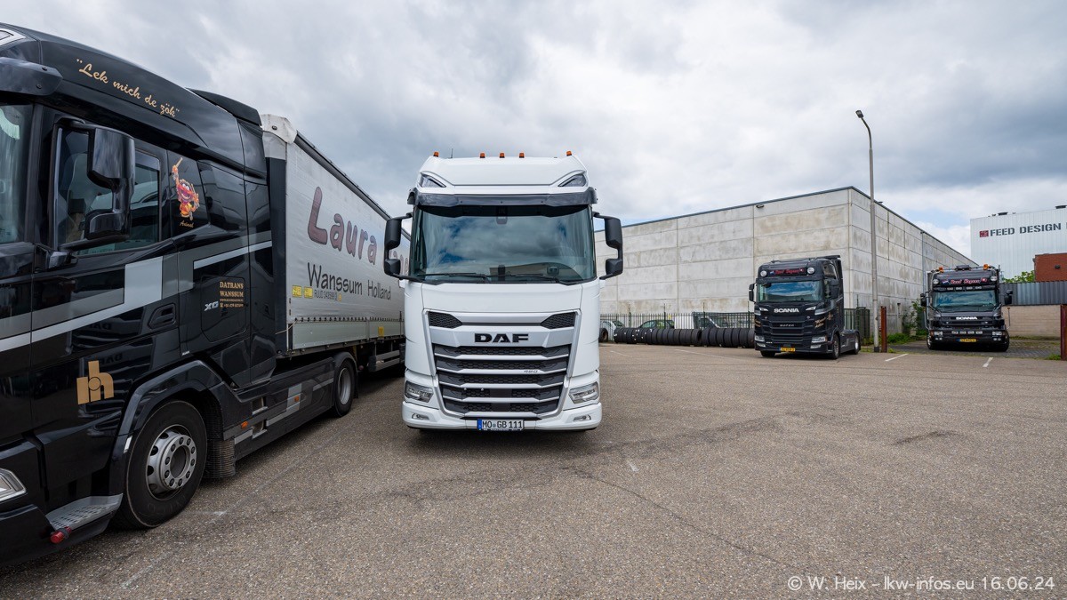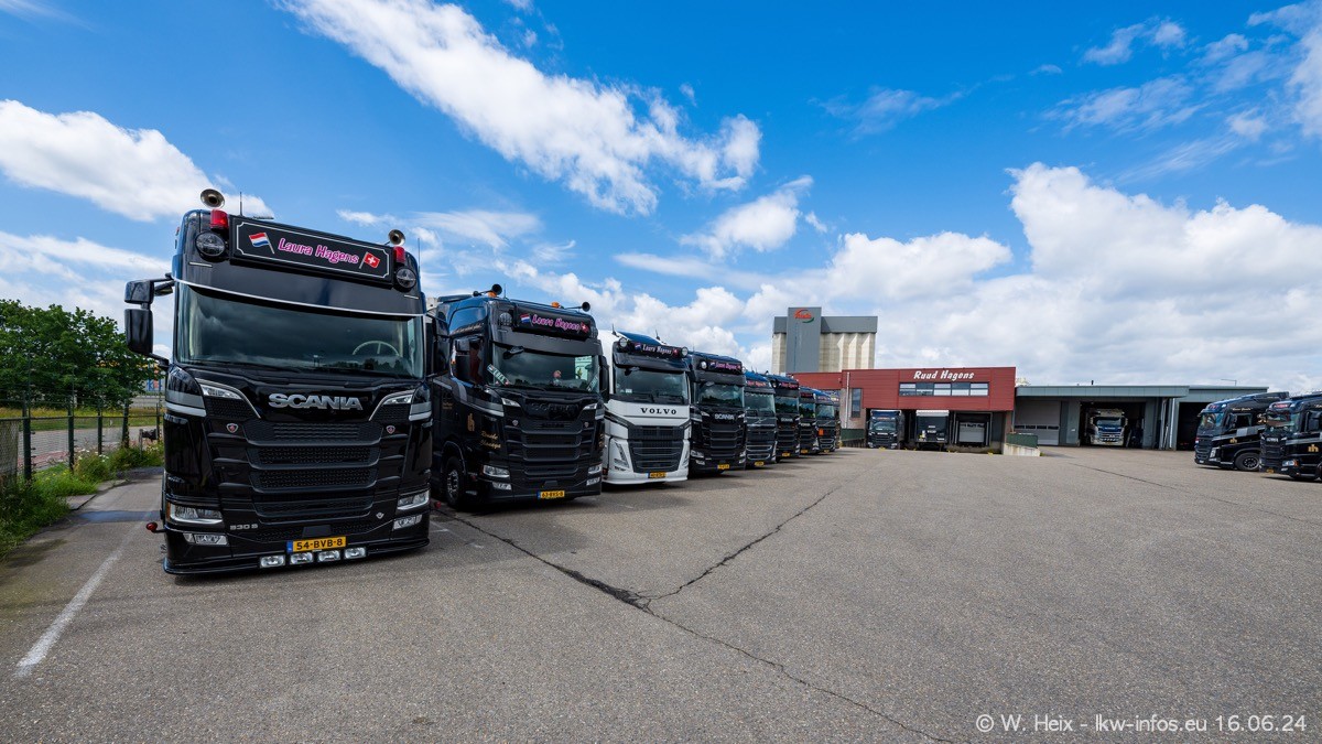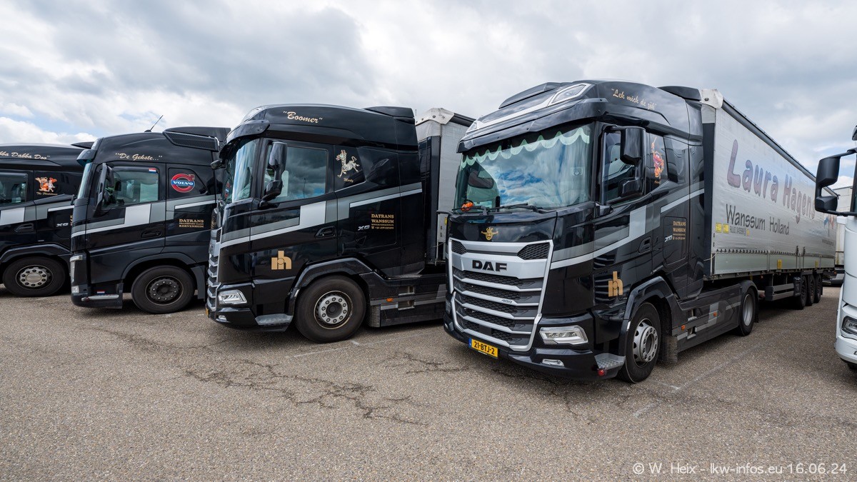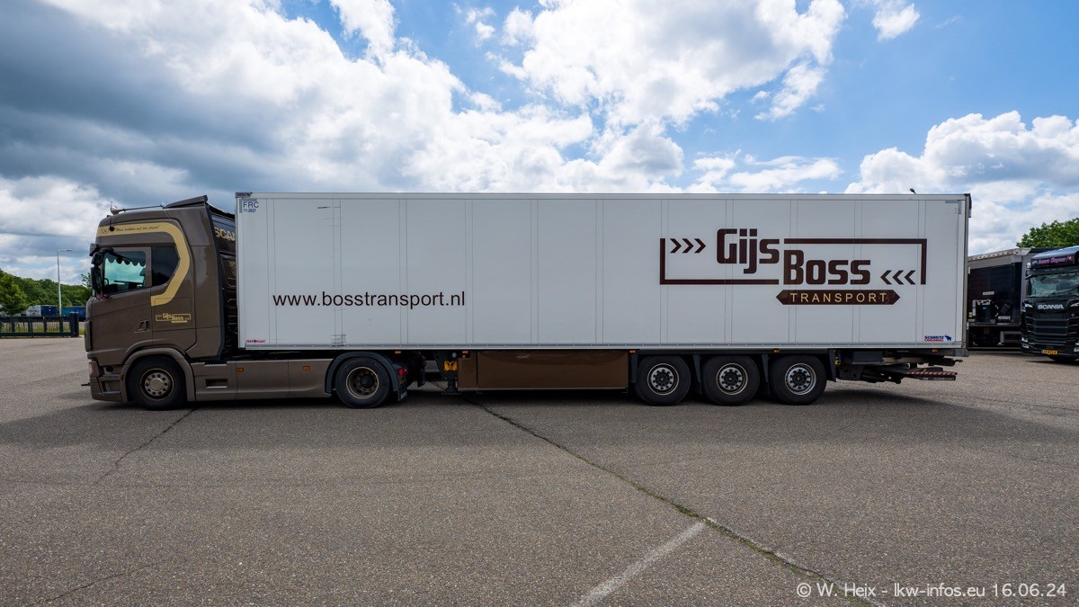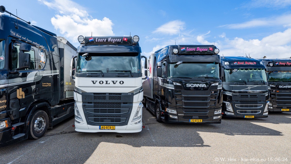 Ende Januar 2024 hat die Firma Gijs Boss die Fahrzeuge von Ruud Hagens Datrans B.V. übernommen. Das schwarze Design bleibt erhalten, den ersten neuen DAF XG+ mit neuem Aufleger, beschriftet mit "Datrans" gibt es auf den ersten Bildern in dieser Galerie zu sehen. Dazu kommen aktuell zwei weiße DAF XG+, die in Deutschland zugelassen sind (Moers MO, Kreis Wesel). Die Fahrzeuge in den bekannten Farben von Gijs Boss gibt es weiterhin. Diese stehen jedoch weiterhin verteilt bei Kunden oder Fahrern zuhause. Die zweite "neue" Firma ist jetzt Laura Hagens, Das ist bekanntlich die Tochter von Ruud Hagens. Unter dem Namen laufen alle SCANIA NextGen mit Schubboden/Walking-Floor Aufliegern. Die beiden M-Trex SCANIA gehören dazu. Alle Planenauflieger gehörten bisher Ruud Hagens Datrans B.V. Dazu kommen noch die IVECO S-Way, von Helene-Speed (Deutschland und Rumänien). Da sicherlich alle Fahrzeuge über länger Zeit noch "bunt gemischt" zu sehen sein werden, habe ich erstmal alles unter dem Namen Boss-Datrans & Laura Hagens zusammengefasst. Alle LKW werden auch weiterhin auf dem bekannten Gelände in Wanssum stehen.