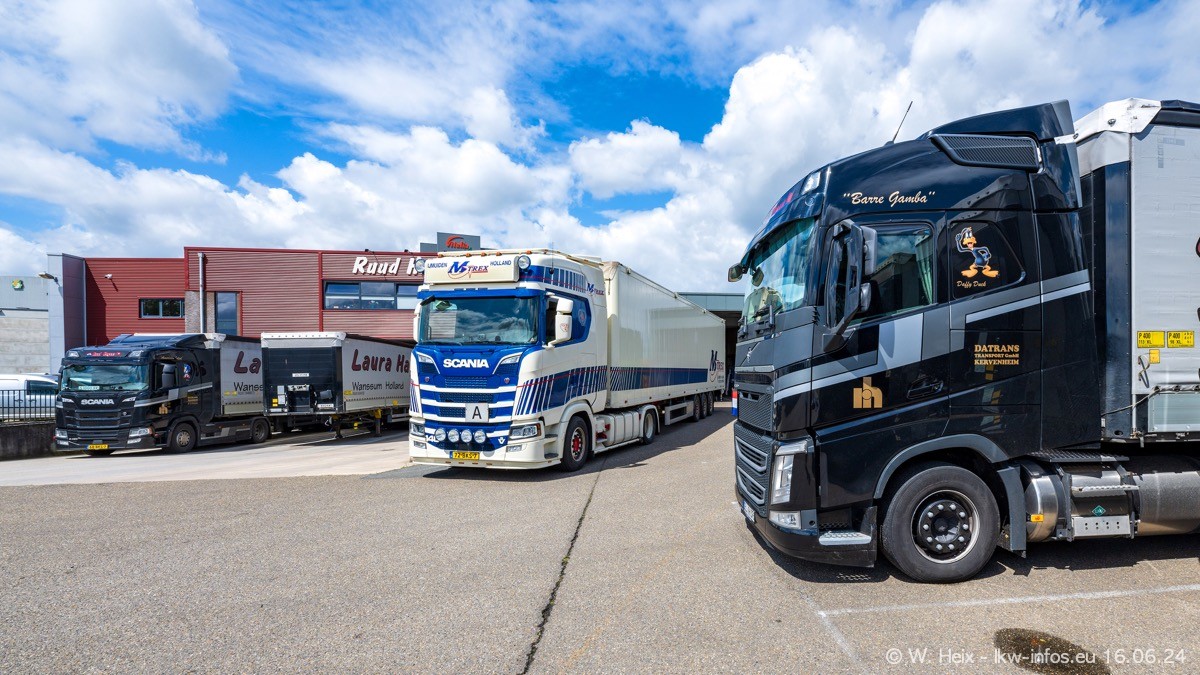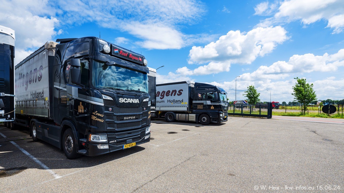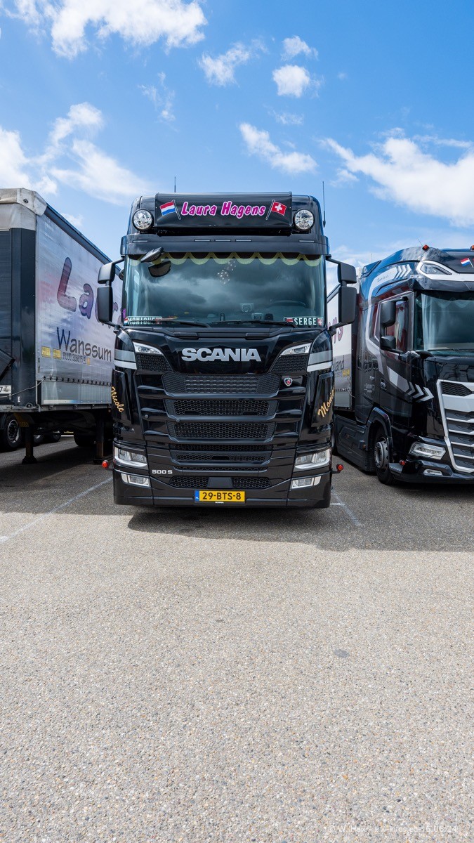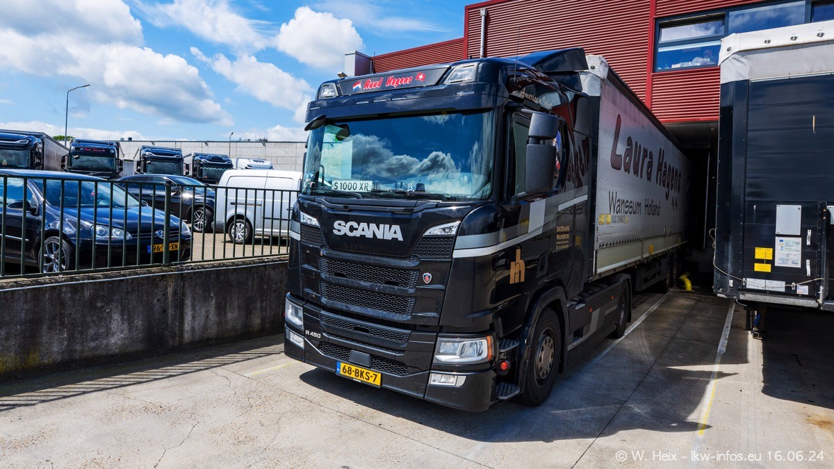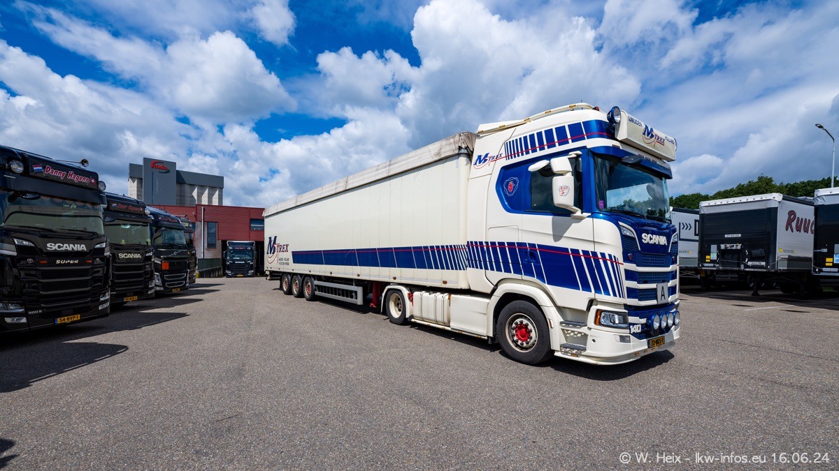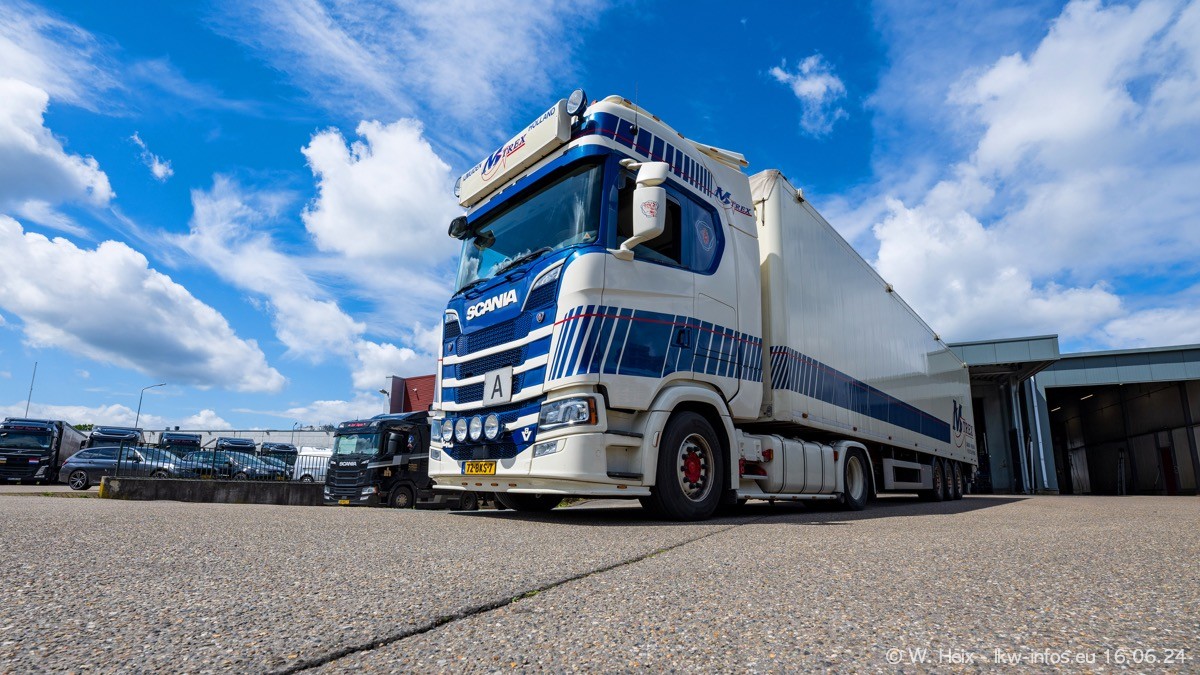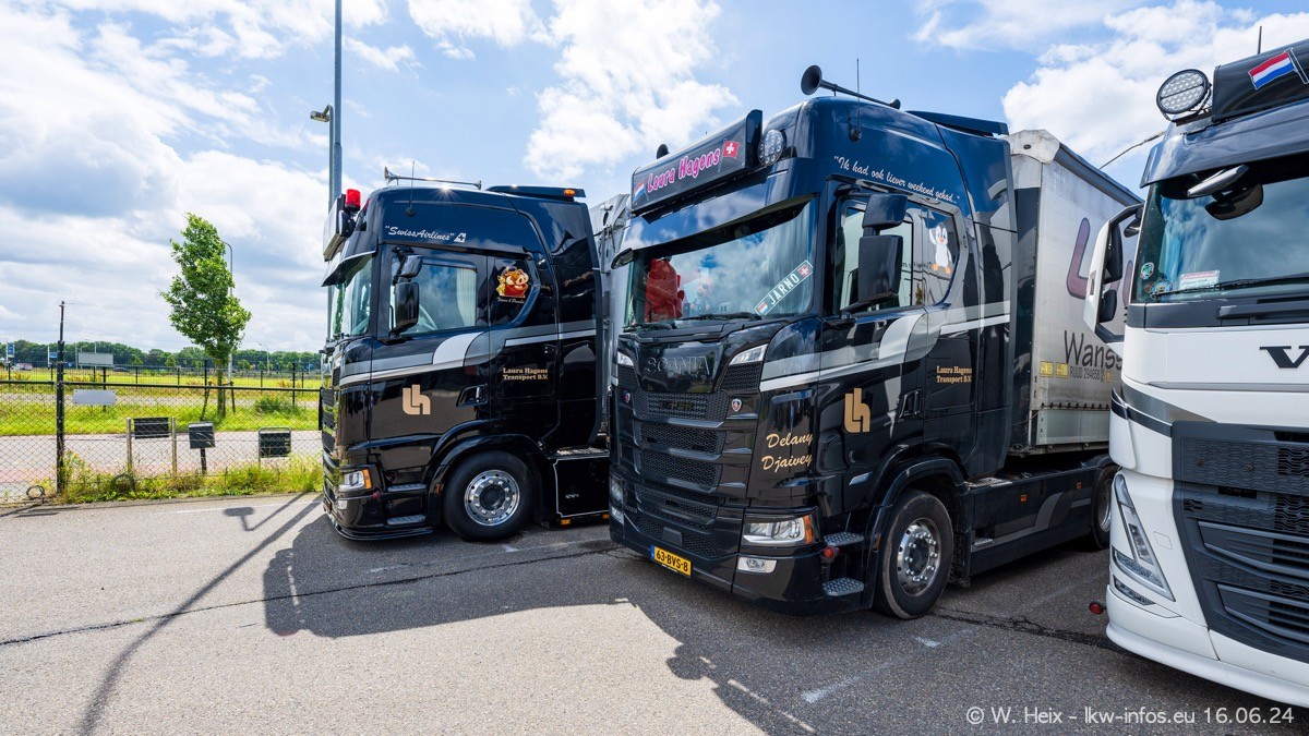 Ende Januar 2024 hat die Firma Gijs Boss die Fahrzeuge von Ruud Hagens Datrans B.V. übernommen. Das schwarze Design bleibt erhalten, den ersten neuen DAF XG+ mit neuem Aufleger, beschriftet mit "Datrans" gibt es auf den ersten Bildern in dieser Galerie zu sehen. Dazu kommen aktuell zwei weiße DAF XG+, die in Deutschland zugelassen sind (Moers MO, Kreis Wesel). Die Fahrzeuge in den bekannten Farben von Gijs Boss gibt es weiterhin. Diese stehen jedoch weiterhin verteilt bei Kunden oder Fahrern zuhause. Die zweite "neue" Firma ist jetzt Laura Hagens, Das ist bekanntlich die Tochter von Ruud Hagens. Unter dem Namen laufen alle SCANIA NextGen mit Schubboden/Walking-Floor Aufliegern. Die beiden M-Trex SCANIA gehören dazu. Alle Planenauflieger gehörten bisher Ruud Hagens Datrans B.V. Dazu kommen noch die IVECO S-Way, von Helene-Speed (Deutschland und Rumänien). Da sicherlich alle Fahrzeuge über länger Zeit noch "bunt gemischt" zu sehen sein werden, habe ich erstmal alles unter dem Namen Boss-Datrans & Laura Hagens zusammengefasst. Alle LKW werden auch weiterhin auf dem bekannten Gelände in Wanssum stehen.