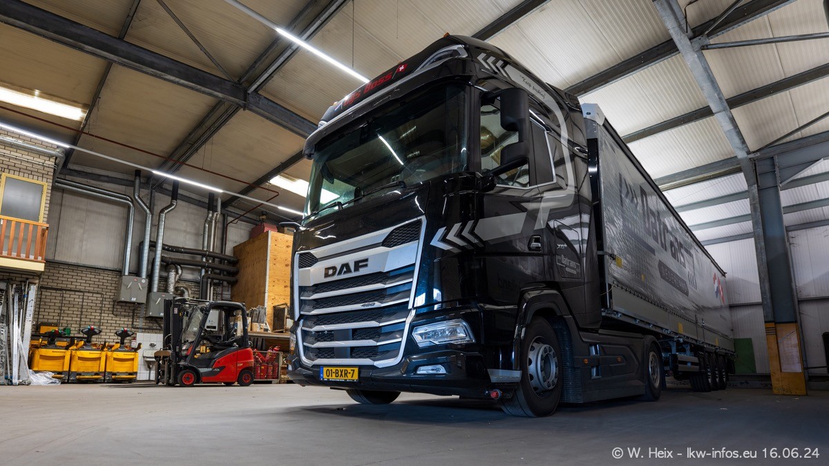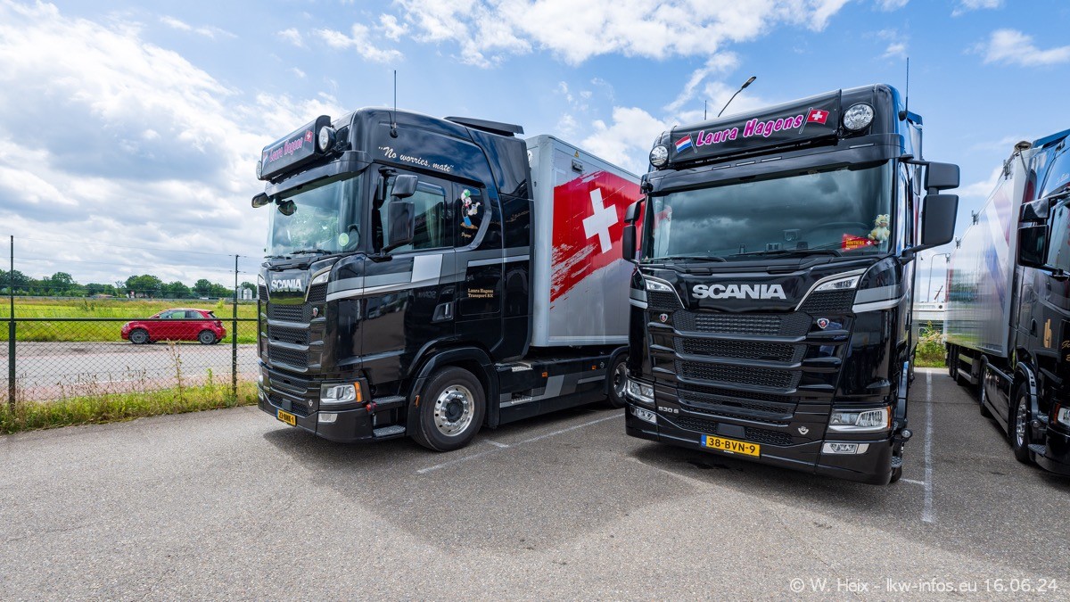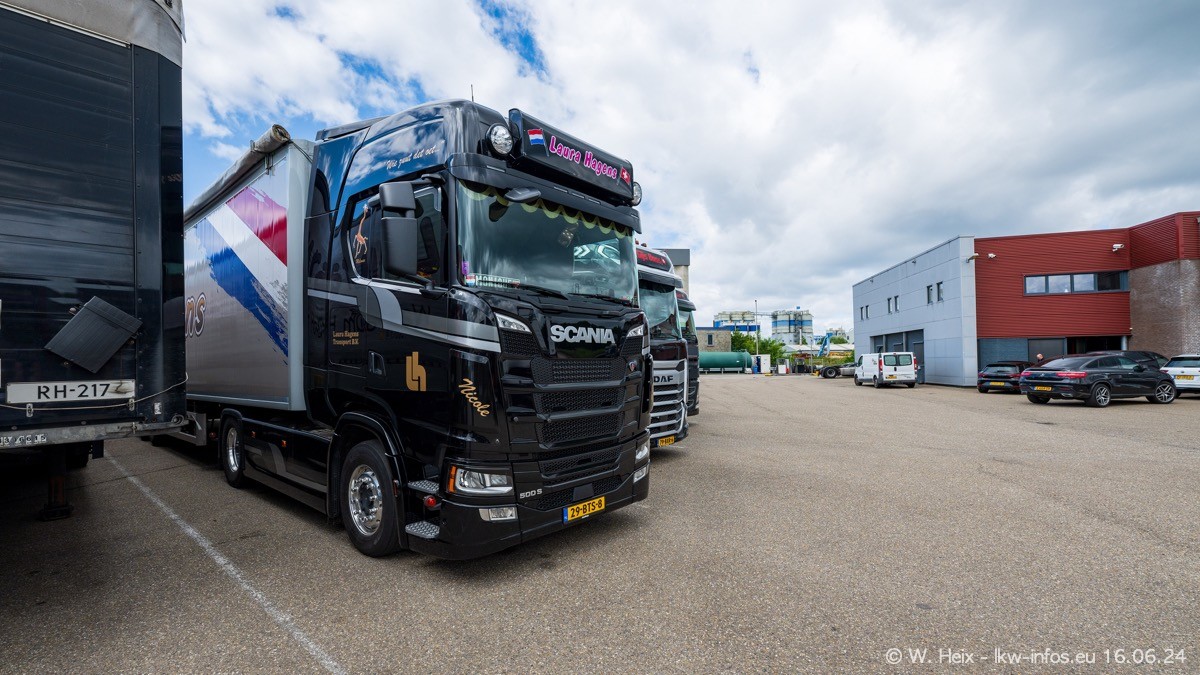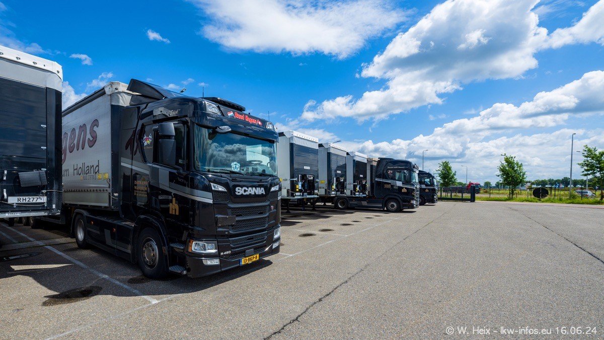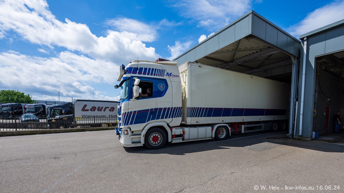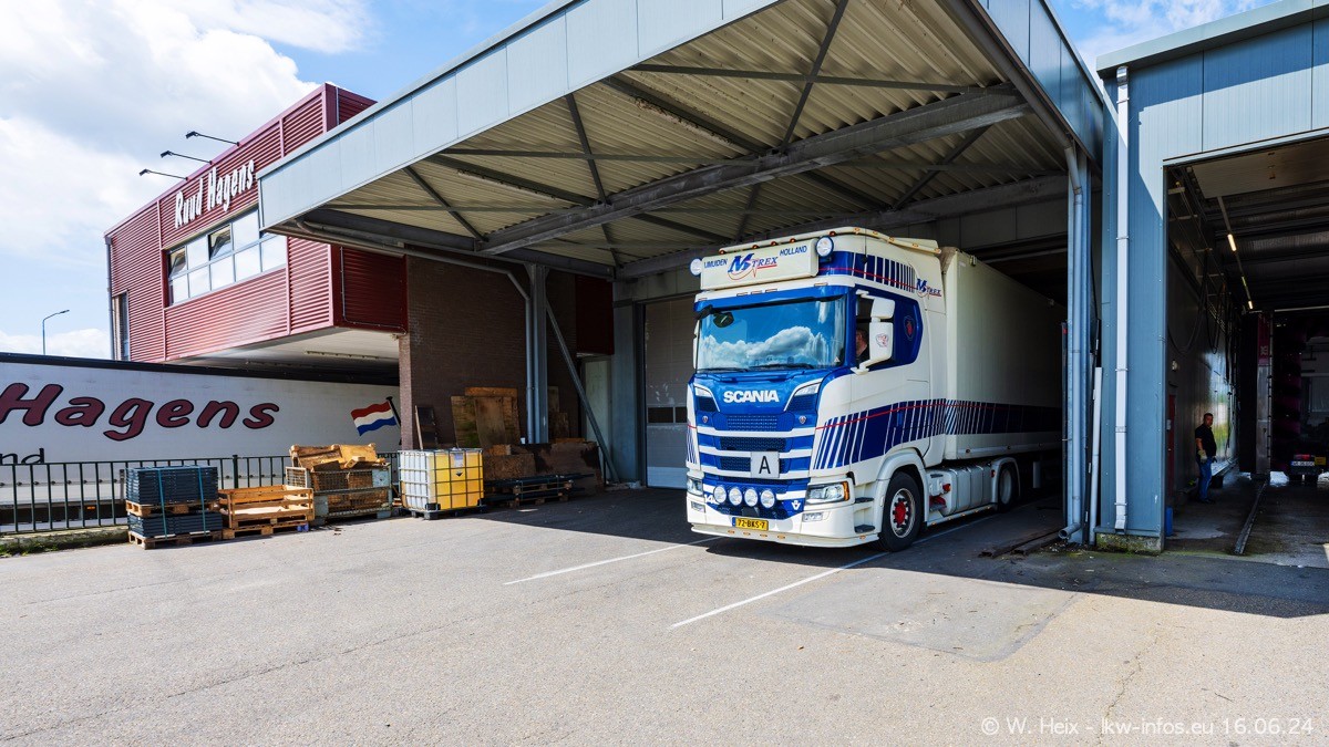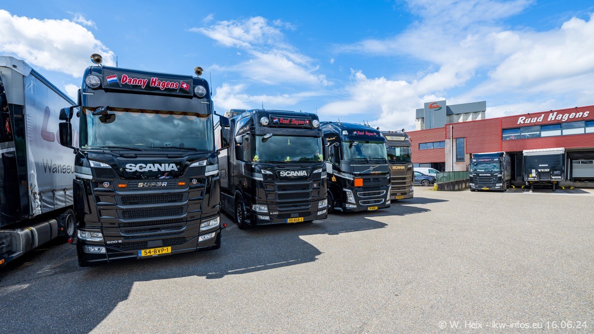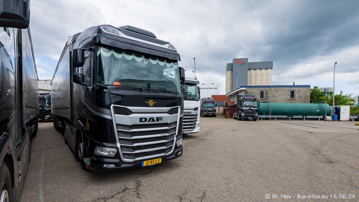 Ende Januar 2024 hat die Firma Gijs Boss die Fahrzeuge von Ruud Hagens Datrans B.V. übernommen. Das schwarze Design bleibt erhalten, den ersten neuen DAF XG+ mit neuem Aufleger, beschriftet mit "Datrans" gibt es auf den ersten Bildern in dieser Galerie zu sehen. Dazu kommen aktuell zwei weiße DAF XG+, die in Deutschland zugelassen sind (Moers MO, Kreis Wesel). Die Fahrzeuge in den bekannten Farben von Gijs Boss gibt es weiterhin. Diese stehen jedoch weiterhin verteilt bei Kunden oder Fahrern zuhause. Die zweite "neue" Firma ist jetzt Laura Hagens, Das ist bekanntlich die Tochter von Ruud Hagens. Unter dem Namen laufen alle SCANIA NextGen mit Schubboden/Walking-Floor Aufliegern. Die beiden M-Trex SCANIA gehören dazu. Alle Planenauflieger gehörten bisher Ruud Hagens Datrans B.V. Dazu kommen noch die IVECO S-Way, von Helene-Speed (Deutschland und Rumänien). Da sicherlich alle Fahrzeuge über länger Zeit noch "bunt gemischt" zu sehen sein werden, habe ich erstmal alles unter dem Namen Boss-Datrans & Laura Hagens zusammengefasst. Alle LKW werden auch weiterhin auf dem bekannten Gelände in Wanssum stehen.