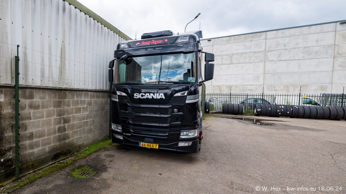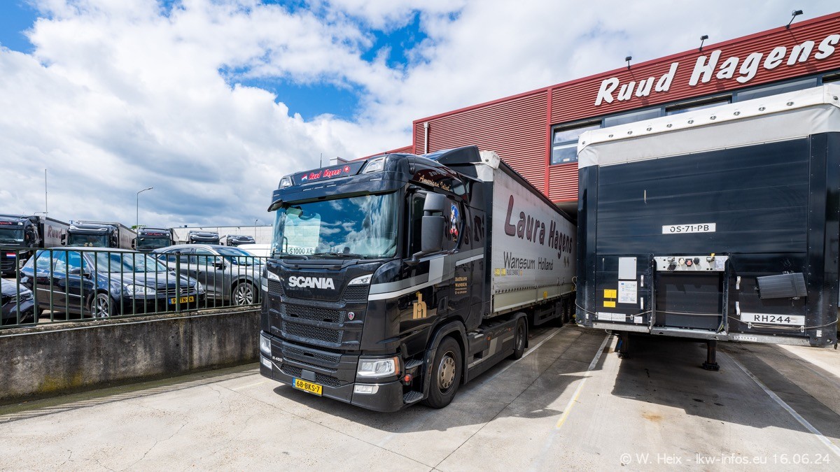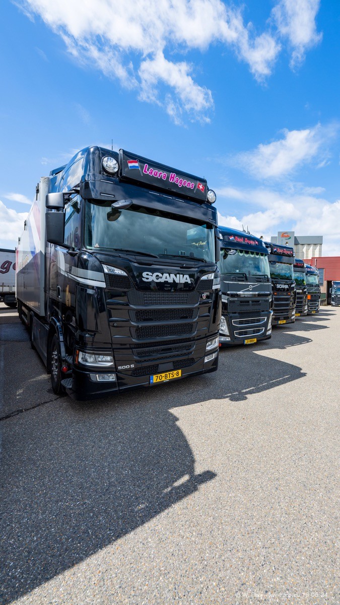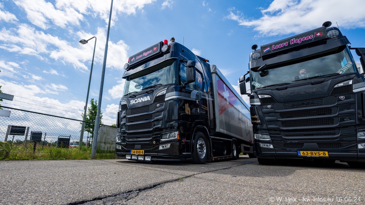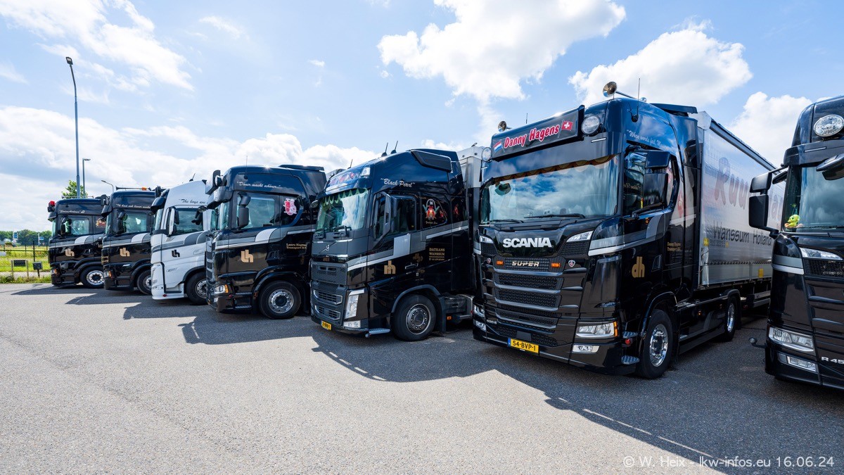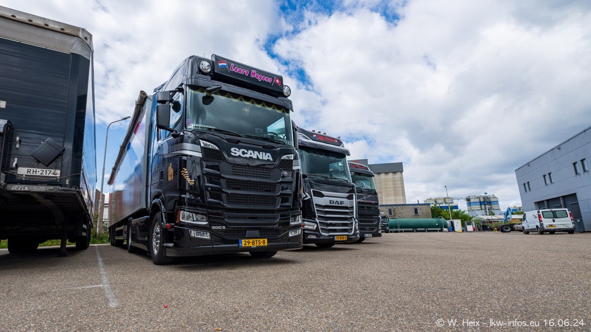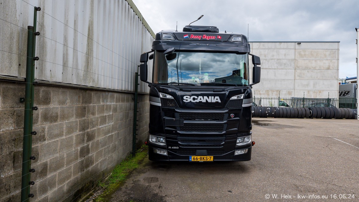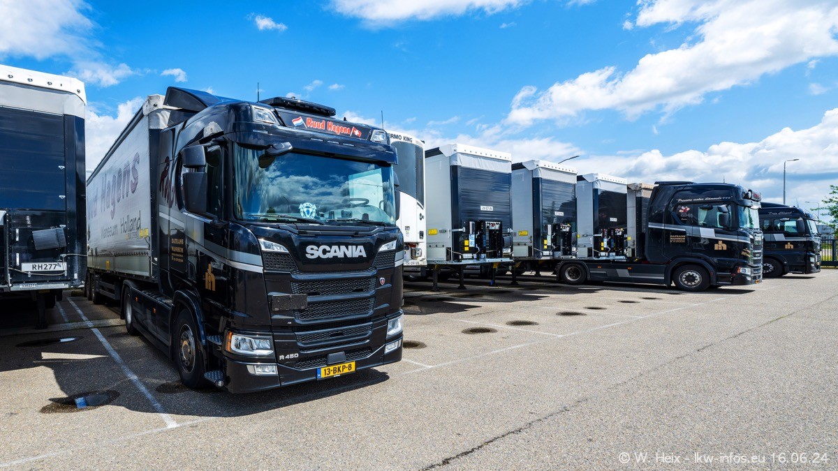 Ende Januar 2024 hat die Firma Gijs Boss die Fahrzeuge von Ruud Hagens Datrans B.V. übernommen. Das schwarze Design bleibt erhalten, den ersten neuen DAF XG+ mit neuem Aufleger, beschriftet mit "Datrans" gibt es auf den ersten Bildern in dieser Galerie zu sehen. Dazu kommen aktuell zwei weiße DAF XG+, die in Deutschland zugelassen sind (Moers MO, Kreis Wesel). Die Fahrzeuge in den bekannten Farben von Gijs Boss gibt es weiterhin. Diese stehen jedoch weiterhin verteilt bei Kunden oder Fahrern zuhause. Die zweite "neue" Firma ist jetzt Laura Hagens, Das ist bekanntlich die Tochter von Ruud Hagens. Unter dem Namen laufen alle SCANIA NextGen mit Schubboden/Walking-Floor Aufliegern. Die beiden M-Trex SCANIA gehören dazu. Alle Planenauflieger gehörten bisher Ruud Hagens Datrans B.V. Dazu kommen noch die IVECO S-Way, von Helene-Speed (Deutschland und Rumänien). Da sicherlich alle Fahrzeuge über länger Zeit noch "bunt gemischt" zu sehen sein werden, habe ich erstmal alles unter dem Namen Boss-Datrans & Laura Hagens zusammengefasst. Alle LKW werden auch weiterhin auf dem bekannten Gelände in Wanssum stehen.