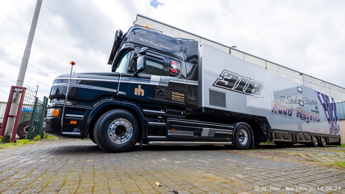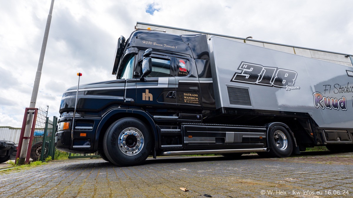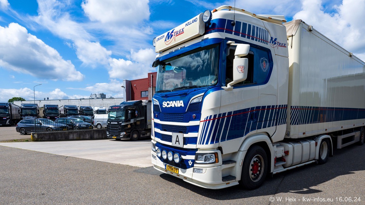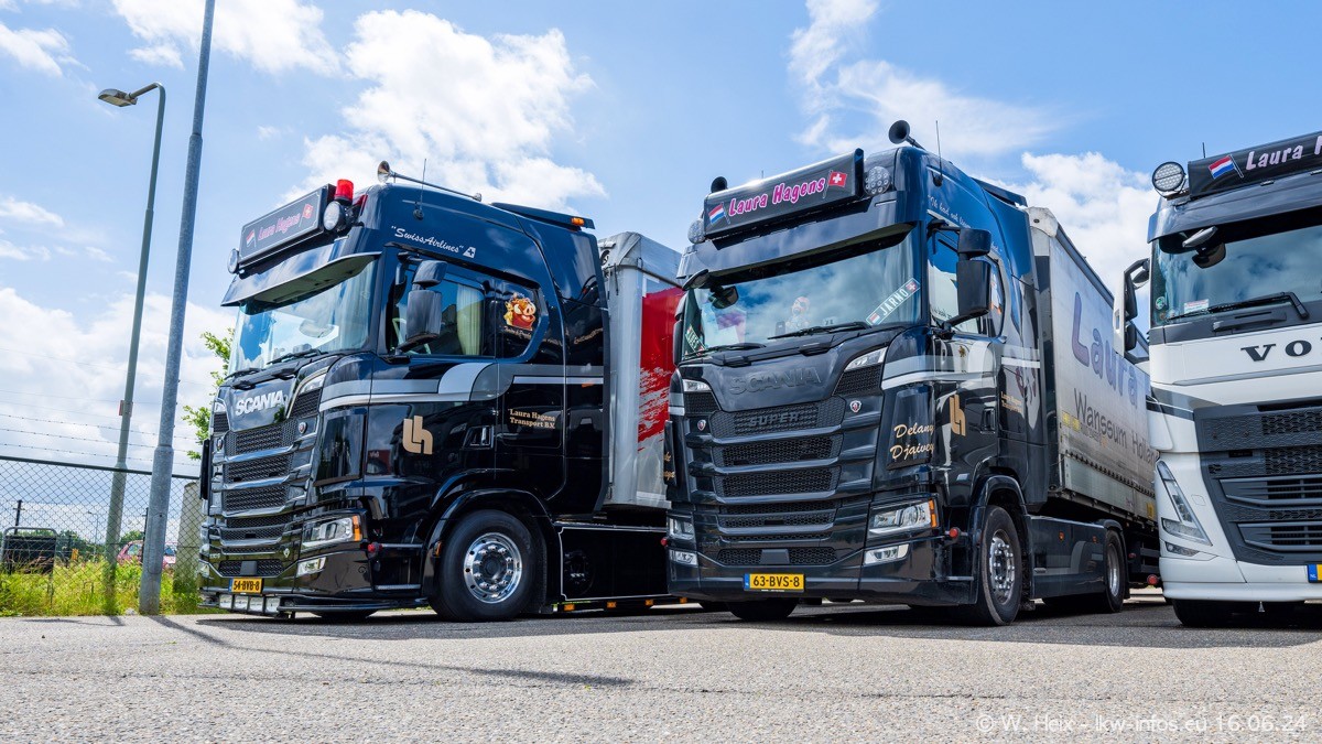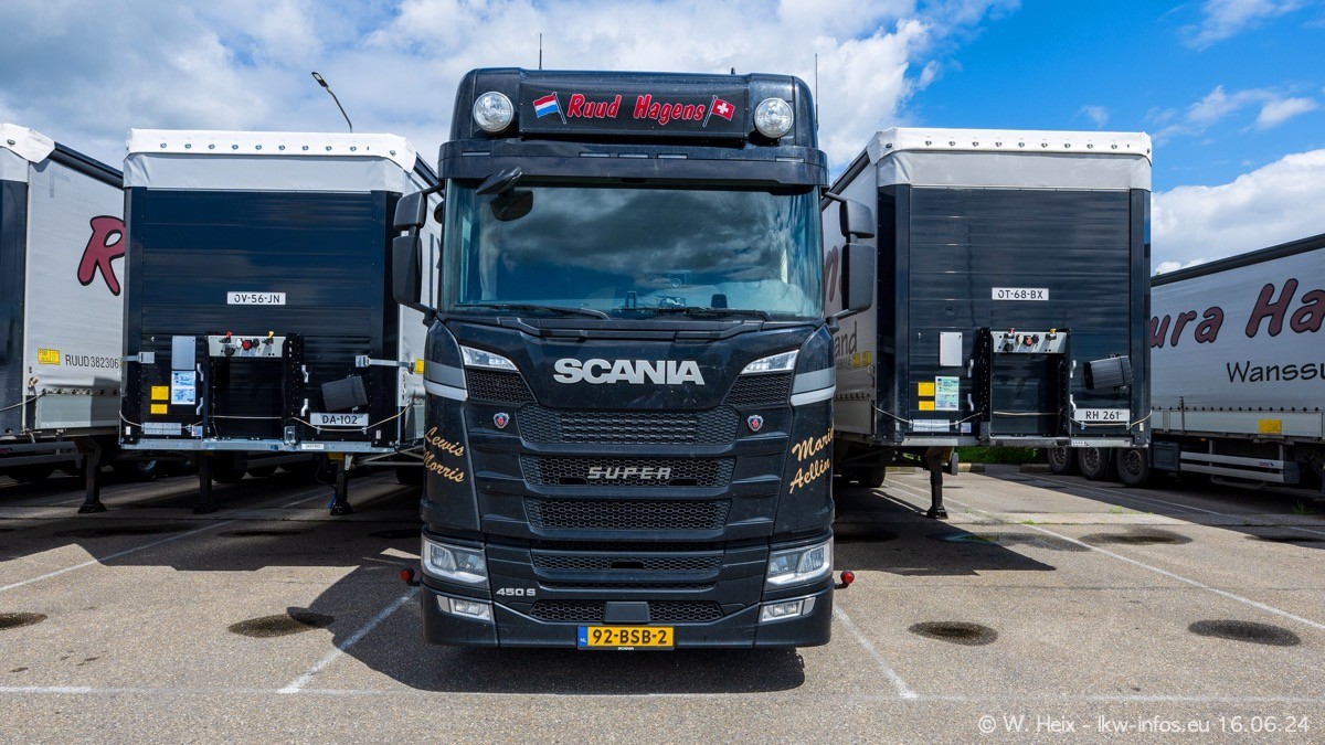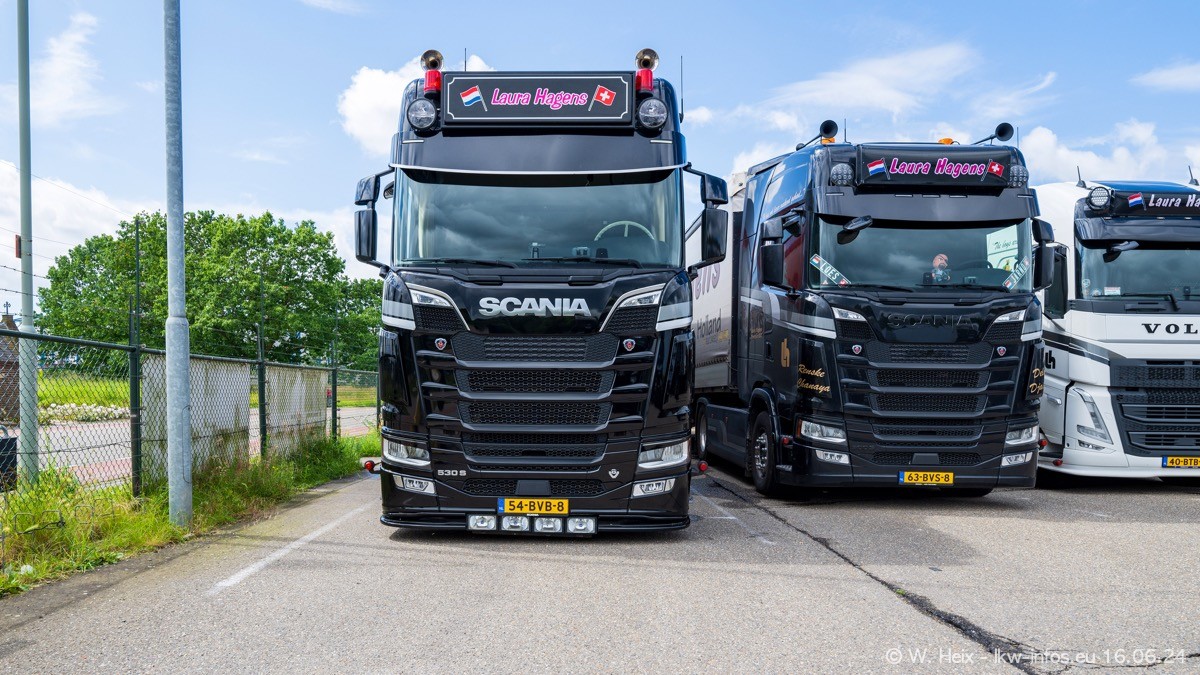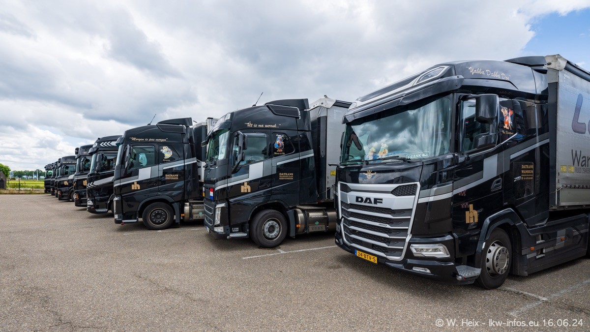 Ende Januar 2024 hat die Firma Gijs Boss die Fahrzeuge von Ruud Hagens Datrans B.V. übernommen. Das schwarze Design bleibt erhalten, den ersten neuen DAF XG+ mit neuem Aufleger, beschriftet mit "Datrans" gibt es auf den ersten Bildern in dieser Galerie zu sehen. Dazu kommen aktuell zwei weiße DAF XG+, die in Deutschland zugelassen sind (Moers MO, Kreis Wesel). Die Fahrzeuge in den bekannten Farben von Gijs Boss gibt es weiterhin. Diese stehen jedoch weiterhin verteilt bei Kunden oder Fahrern zuhause. Die zweite "neue" Firma ist jetzt Laura Hagens, Das ist bekanntlich die Tochter von Ruud Hagens. Unter dem Namen laufen alle SCANIA NextGen mit Schubboden/Walking-Floor Aufliegern. Die beiden M-Trex SCANIA gehören dazu. Alle Planenauflieger gehörten bisher Ruud Hagens Datrans B.V. Dazu kommen noch die IVECO S-Way, von Helene-Speed (Deutschland und Rumänien). Da sicherlich alle Fahrzeuge über länger Zeit noch "bunt gemischt" zu sehen sein werden, habe ich erstmal alles unter dem Namen Boss-Datrans & Laura Hagens zusammengefasst. Alle LKW werden auch weiterhin auf dem bekannten Gelände in Wanssum stehen.