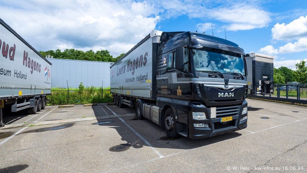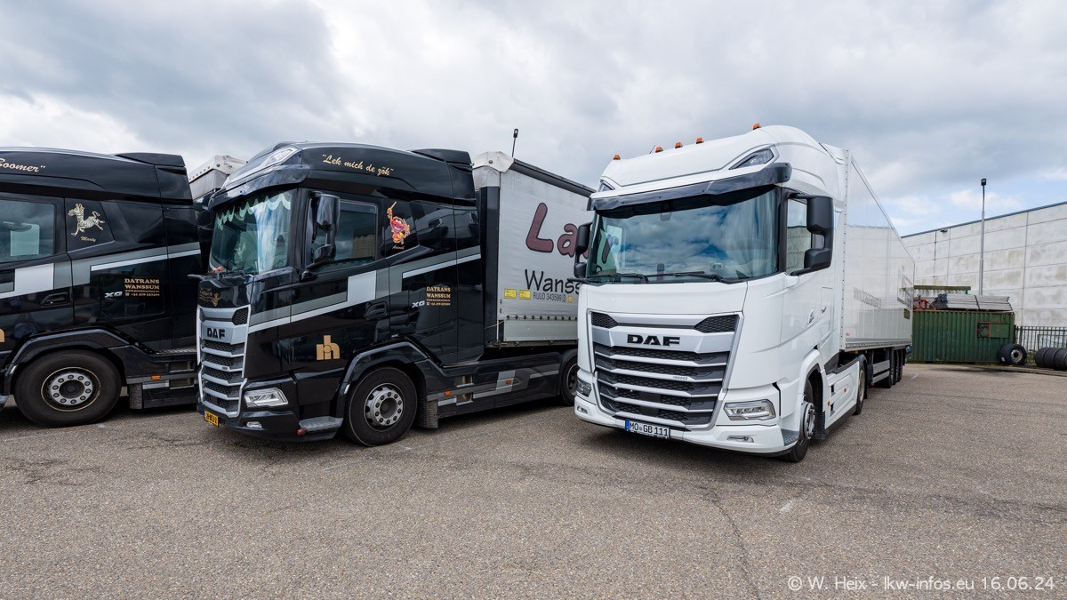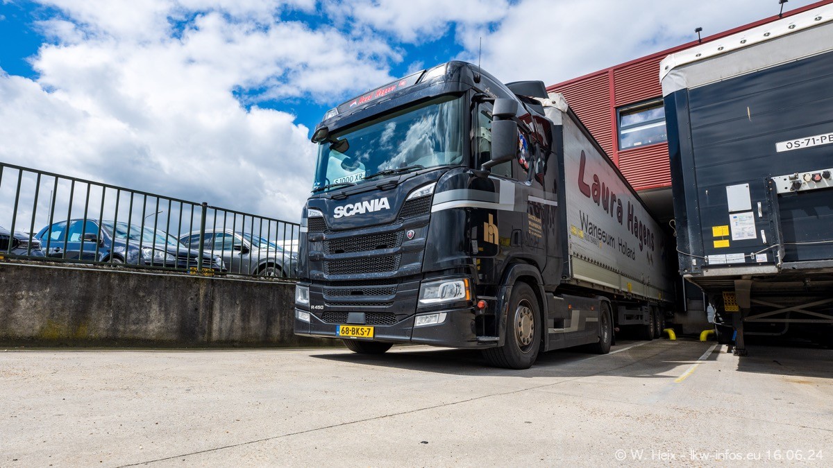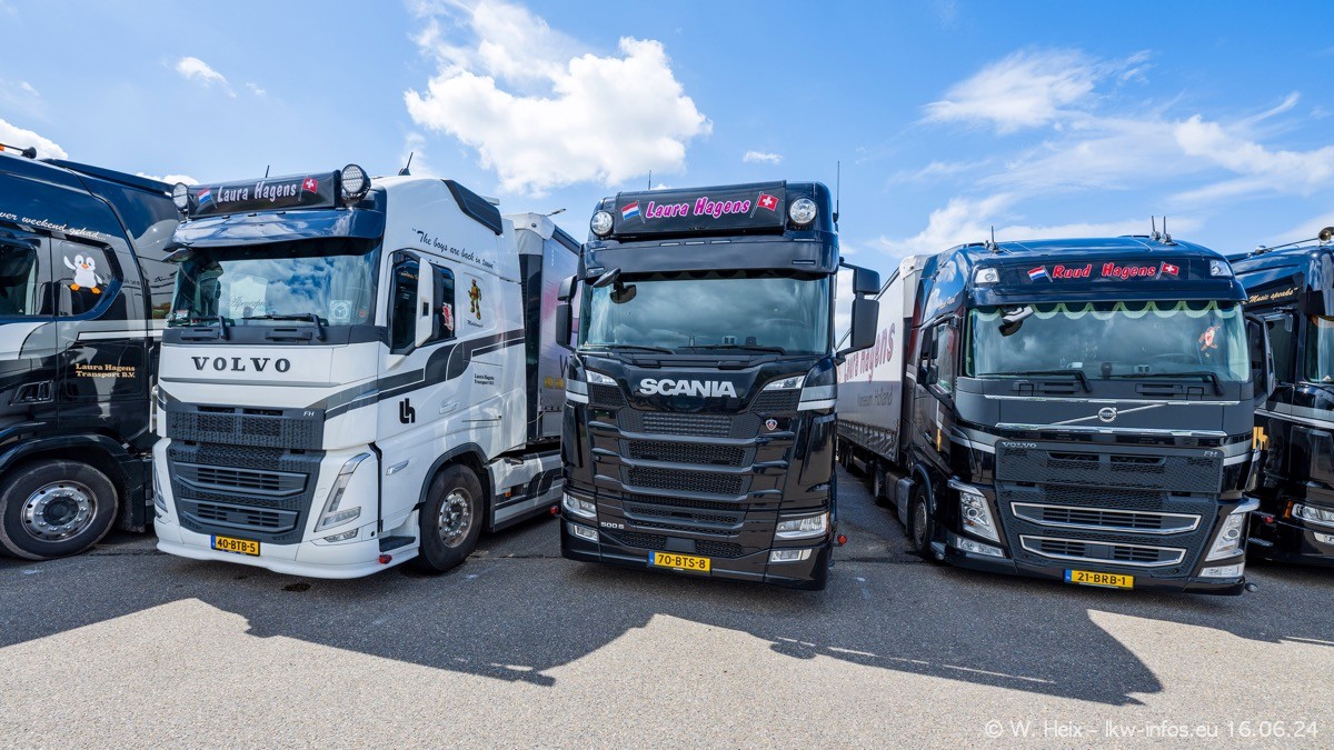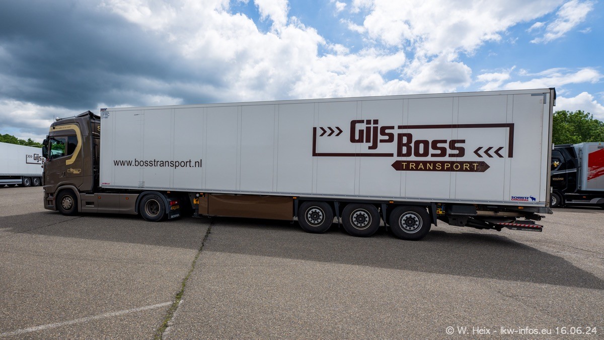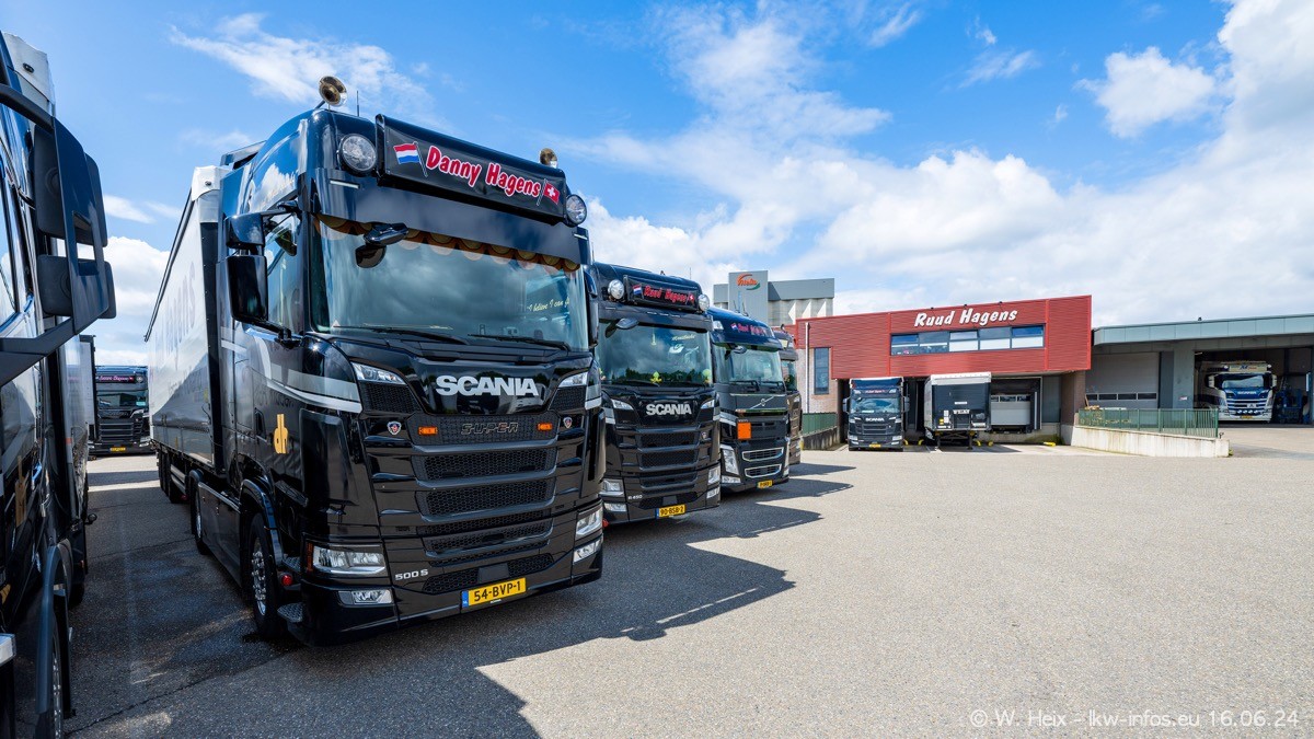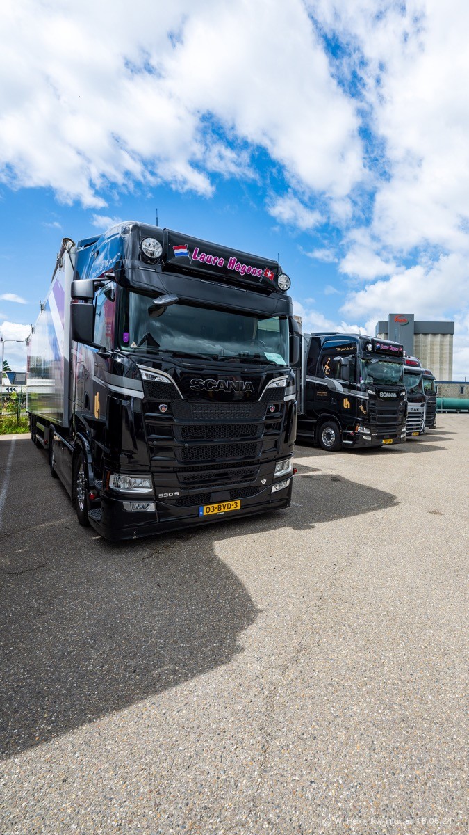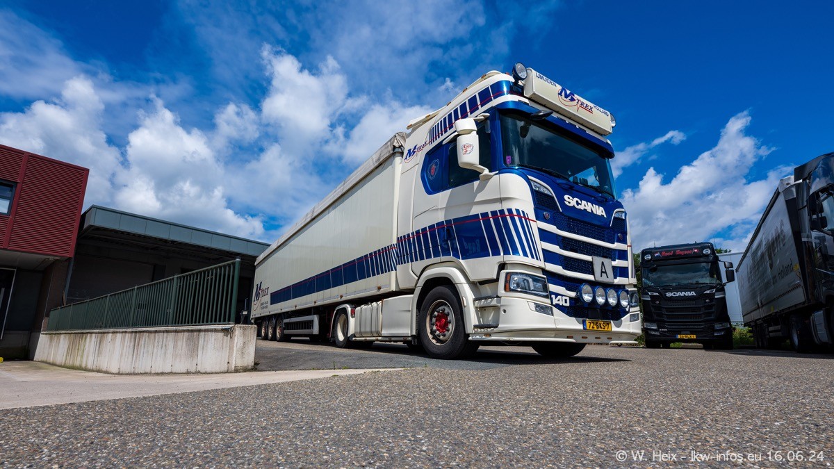 Ende Januar 2024 hat die Firma Gijs Boss die Fahrzeuge von Ruud Hagens Datrans B.V. übernommen. Das schwarze Design bleibt erhalten, den ersten neuen DAF XG+ mit neuem Aufleger, beschriftet mit "Datrans" gibt es auf den ersten Bildern in dieser Galerie zu sehen. Dazu kommen aktuell zwei weiße DAF XG+, die in Deutschland zugelassen sind (Moers MO, Kreis Wesel). Die Fahrzeuge in den bekannten Farben von Gijs Boss gibt es weiterhin. Diese stehen jedoch weiterhin verteilt bei Kunden oder Fahrern zuhause. Die zweite "neue" Firma ist jetzt Laura Hagens, Das ist bekanntlich die Tochter von Ruud Hagens. Unter dem Namen laufen alle SCANIA NextGen mit Schubboden/Walking-Floor Aufliegern. Die beiden M-Trex SCANIA gehören dazu. Alle Planenauflieger gehörten bisher Ruud Hagens Datrans B.V. Dazu kommen noch die IVECO S-Way, von Helene-Speed (Deutschland und Rumänien). Da sicherlich alle Fahrzeuge über länger Zeit noch "bunt gemischt" zu sehen sein werden, habe ich erstmal alles unter dem Namen Boss-Datrans & Laura Hagens zusammengefasst. Alle LKW werden auch weiterhin auf dem bekannten Gelände in Wanssum stehen.