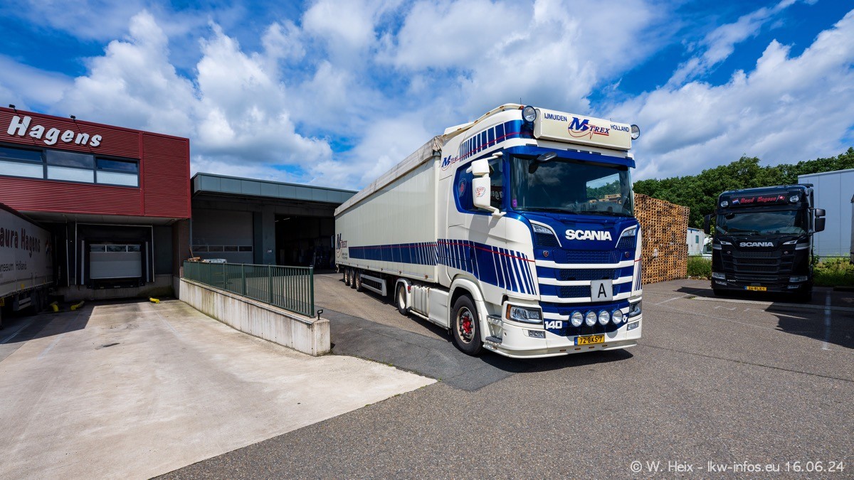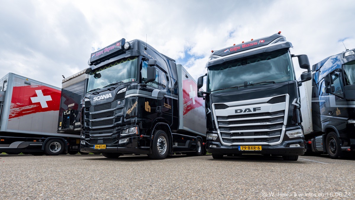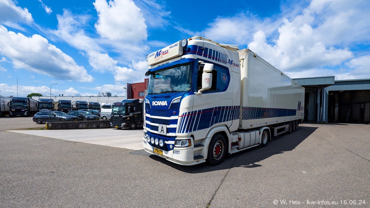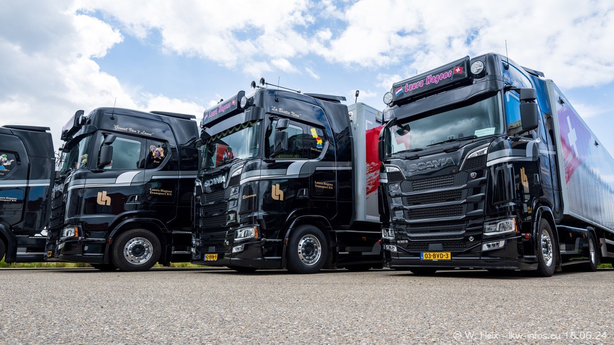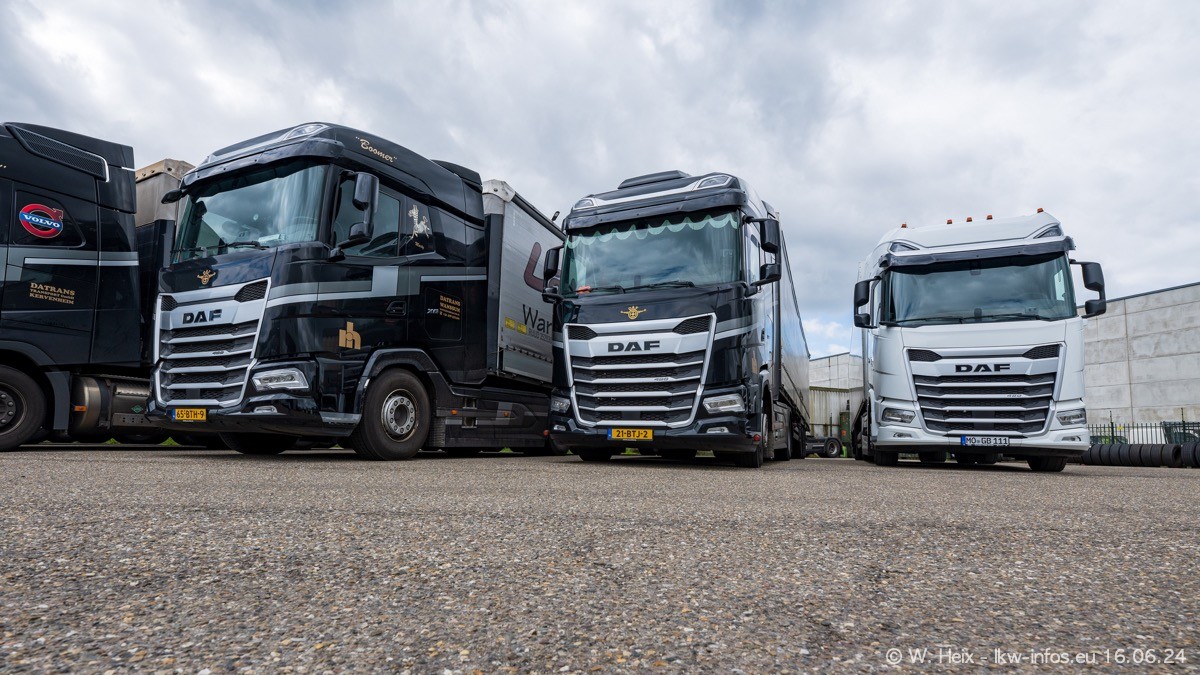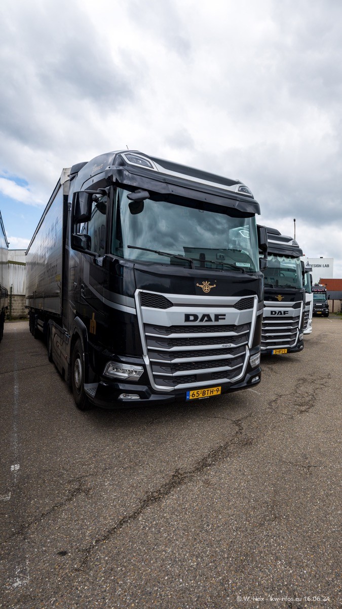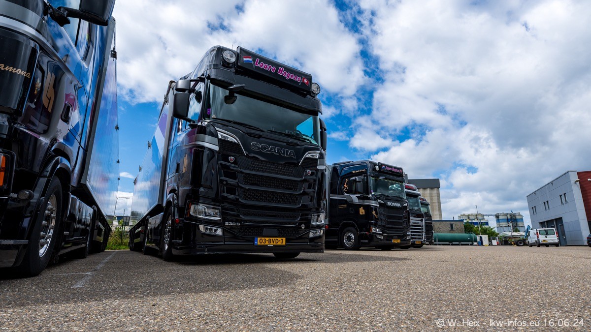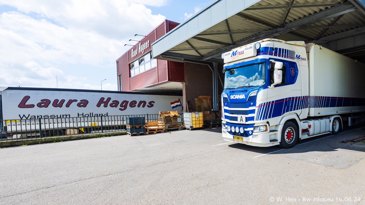 Ende Januar 2024 hat die Firma Gijs Boss die Fahrzeuge von Ruud Hagens Datrans B.V. übernommen. Das schwarze Design bleibt erhalten, den ersten neuen DAF XG+ mit neuem Aufleger, beschriftet mit "Datrans" gibt es auf den ersten Bildern in dieser Galerie zu sehen. Dazu kommen aktuell zwei weiße DAF XG+, die in Deutschland zugelassen sind (Moers MO, Kreis Wesel). Die Fahrzeuge in den bekannten Farben von Gijs Boss gibt es weiterhin. Diese stehen jedoch weiterhin verteilt bei Kunden oder Fahrern zuhause. Die zweite "neue" Firma ist jetzt Laura Hagens, Das ist bekanntlich die Tochter von Ruud Hagens. Unter dem Namen laufen alle SCANIA NextGen mit Schubboden/Walking-Floor Aufliegern. Die beiden M-Trex SCANIA gehören dazu. Alle Planenauflieger gehörten bisher Ruud Hagens Datrans B.V. Dazu kommen noch die IVECO S-Way, von Helene-Speed (Deutschland und Rumänien). Da sicherlich alle Fahrzeuge über länger Zeit noch "bunt gemischt" zu sehen sein werden, habe ich erstmal alles unter dem Namen Boss-Datrans & Laura Hagens zusammengefasst. Alle LKW werden auch weiterhin auf dem bekannten Gelände in Wanssum stehen.