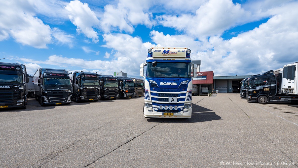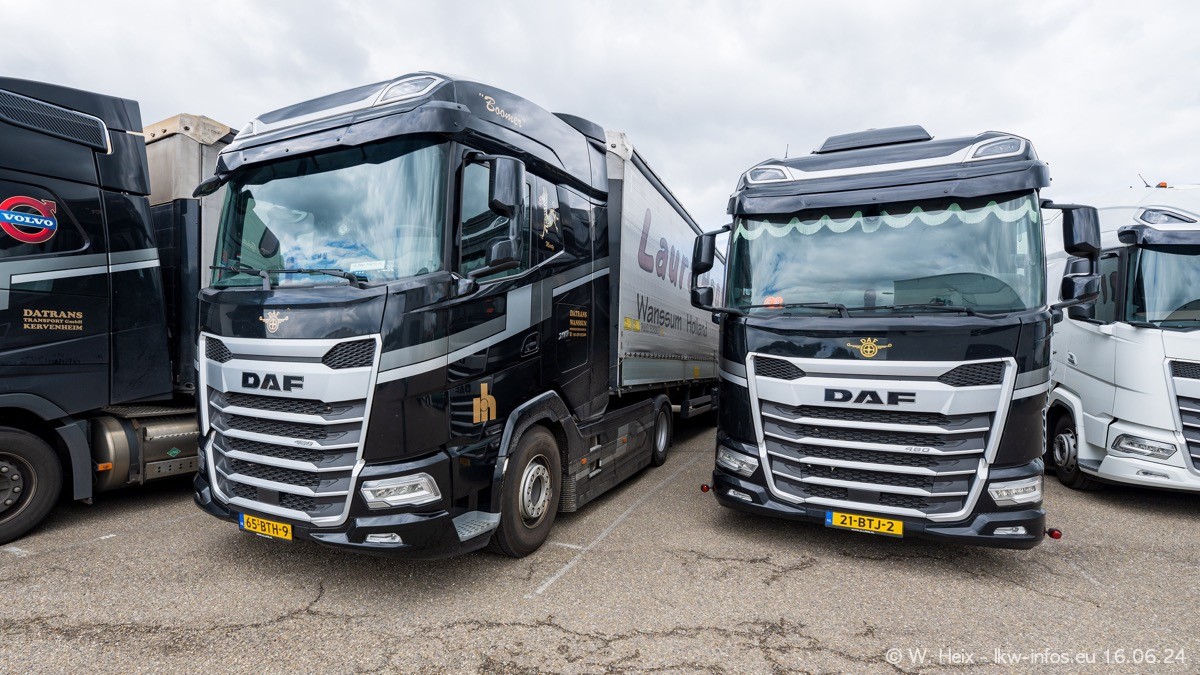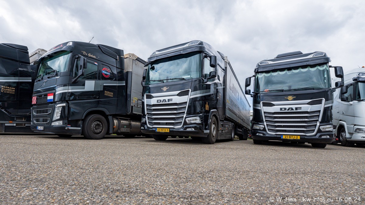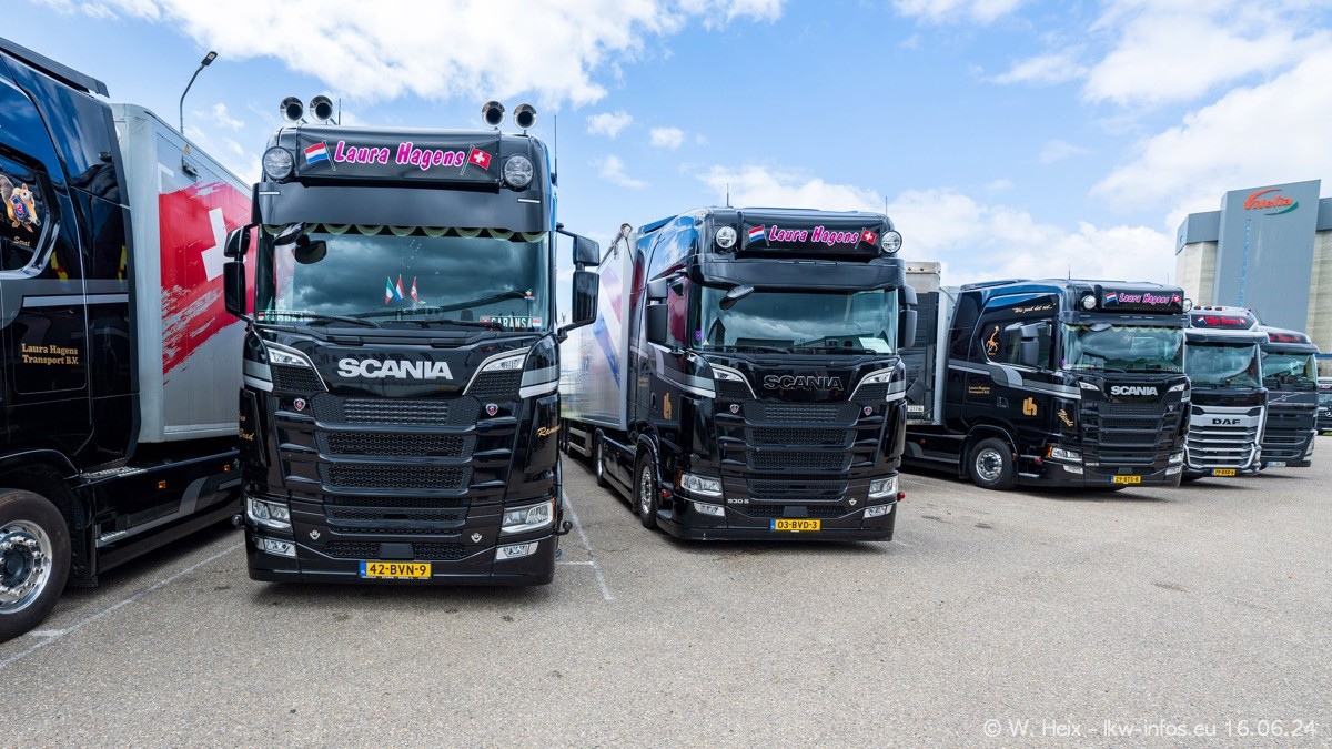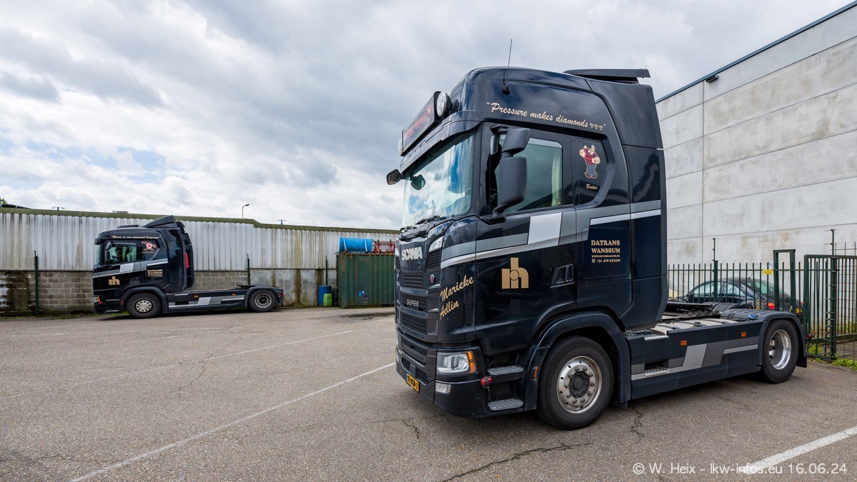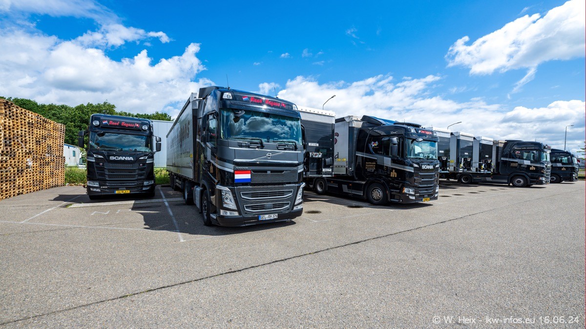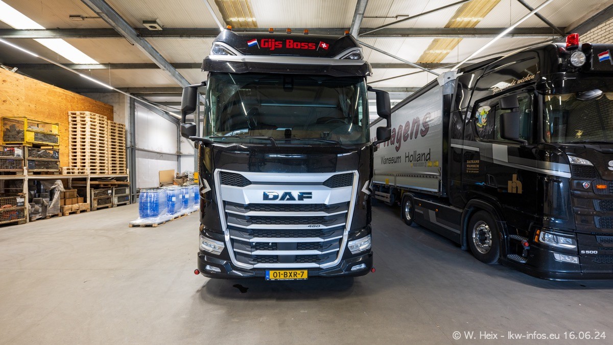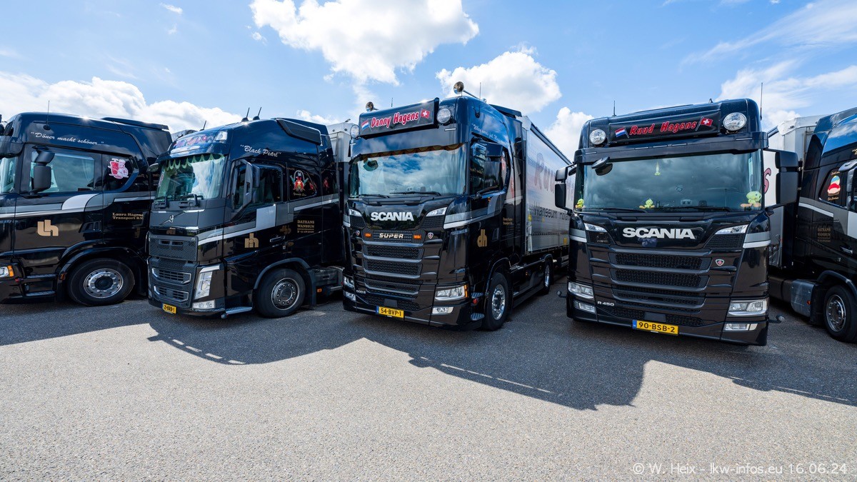 Ende Januar 2024 hat die Firma Gijs Boss die Fahrzeuge von Ruud Hagens Datrans B.V. übernommen. Das schwarze Design bleibt erhalten, den ersten neuen DAF XG+ mit neuem Aufleger, beschriftet mit "Datrans" gibt es auf den ersten Bildern in dieser Galerie zu sehen. Dazu kommen aktuell zwei weiße DAF XG+, die in Deutschland zugelassen sind (Moers MO, Kreis Wesel). Die Fahrzeuge in den bekannten Farben von Gijs Boss gibt es weiterhin. Diese stehen jedoch weiterhin verteilt bei Kunden oder Fahrern zuhause. Die zweite "neue" Firma ist jetzt Laura Hagens, Das ist bekanntlich die Tochter von Ruud Hagens. Unter dem Namen laufen alle SCANIA NextGen mit Schubboden/Walking-Floor Aufliegern. Die beiden M-Trex SCANIA gehören dazu. Alle Planenauflieger gehörten bisher Ruud Hagens Datrans B.V. Dazu kommen noch die IVECO S-Way, von Helene-Speed (Deutschland und Rumänien). Da sicherlich alle Fahrzeuge über länger Zeit noch "bunt gemischt" zu sehen sein werden, habe ich erstmal alles unter dem Namen Boss-Datrans & Laura Hagens zusammengefasst. Alle LKW werden auch weiterhin auf dem bekannten Gelände in Wanssum stehen.