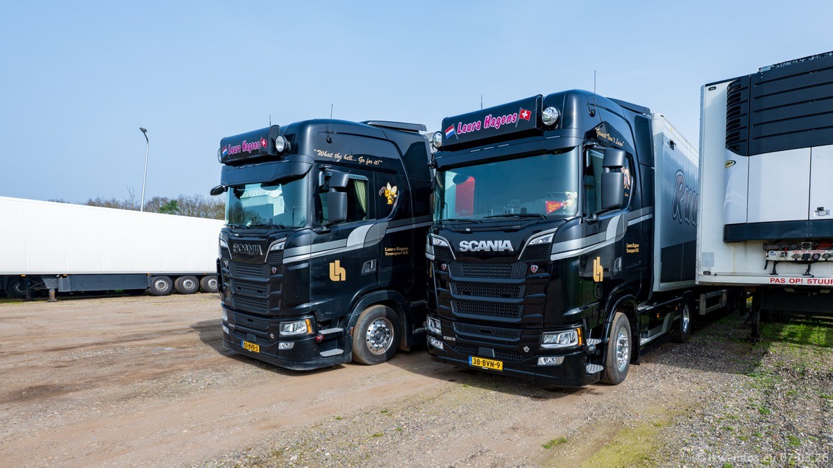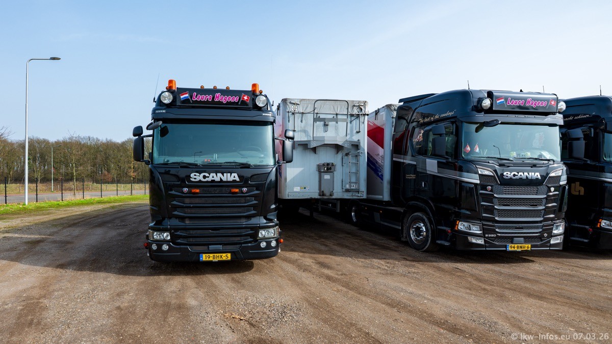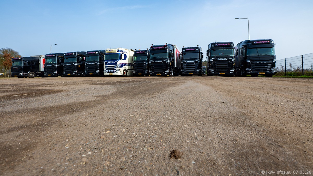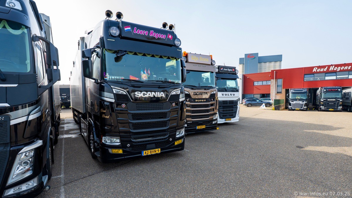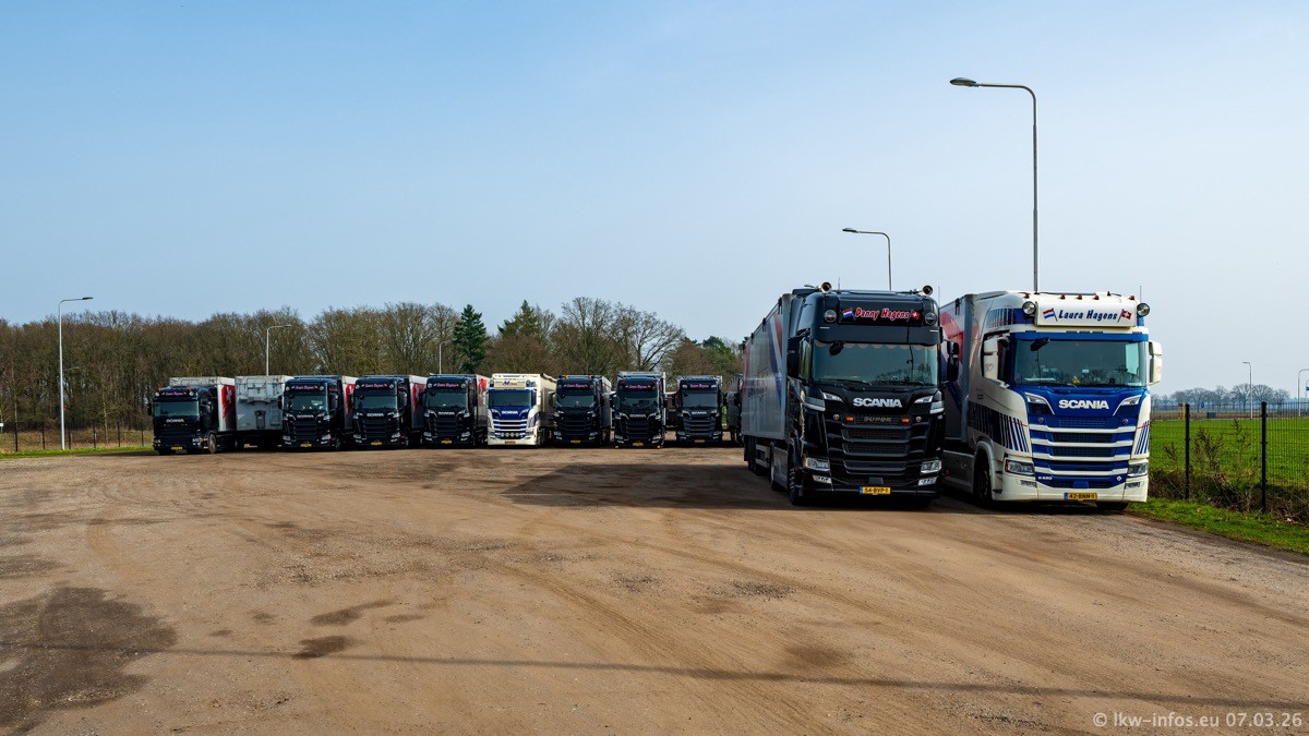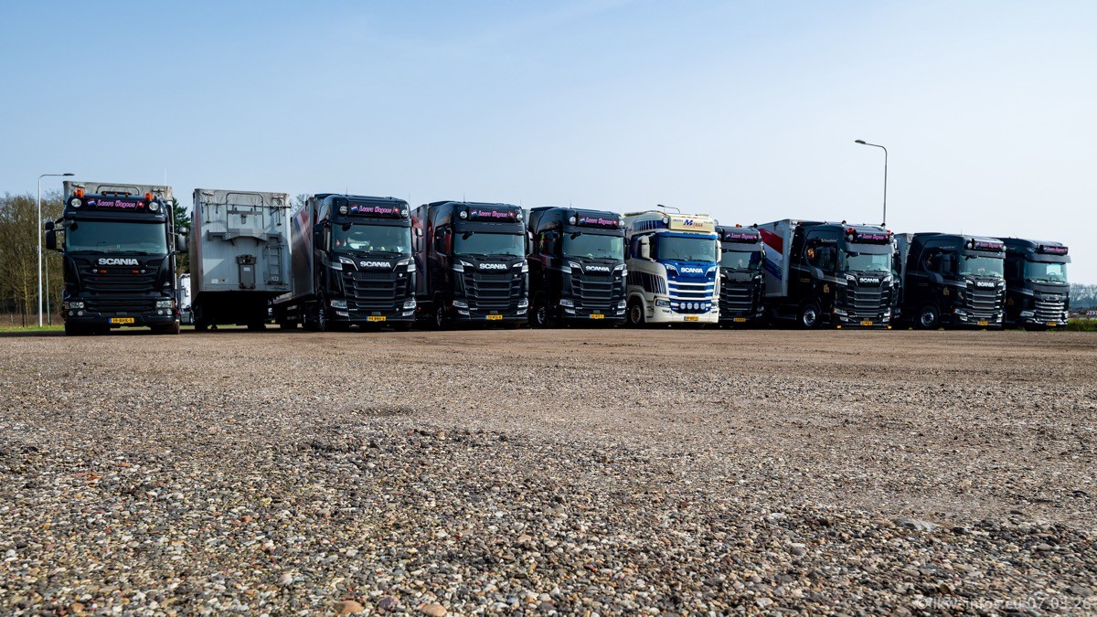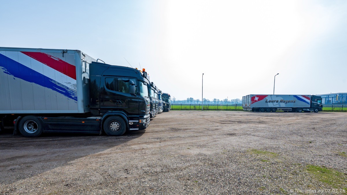 Die LKW von Laura Hagens stehen jetzt auf dem Parkplatz gegenüber vom Firmengelände. Gijs Boss hat das Büro in Venlo aufgelöst und die "alten" LKW stehen jetzt auch in Wanssum. Darum musste ein Teil der LKW auf den zweiten Parkplatz, weil es sowieso schon viel zu eng ist auf dem Firmenhof. Es gibt einen weiteren neuen VOLVO FH Aero, der seit Anfang Januar fährt.