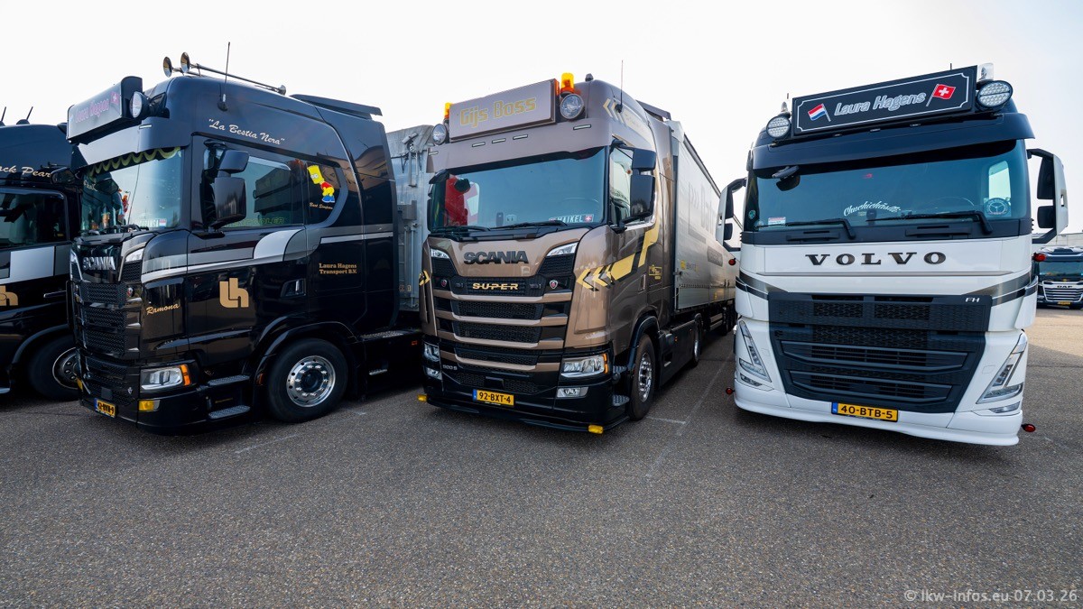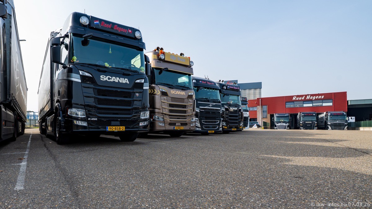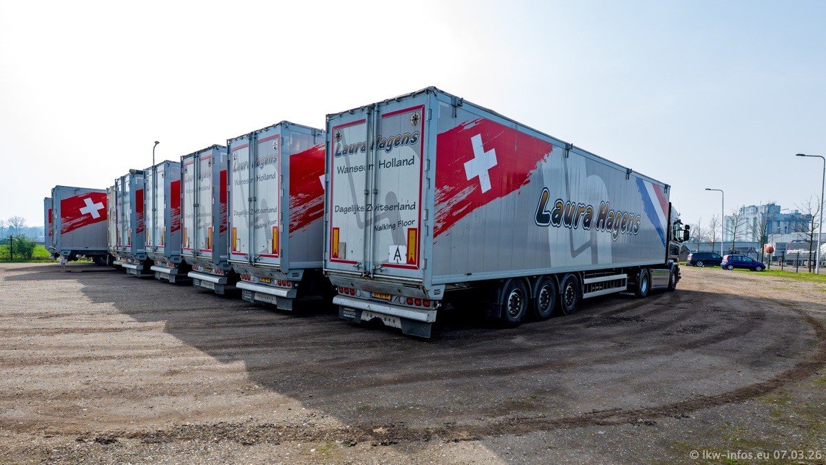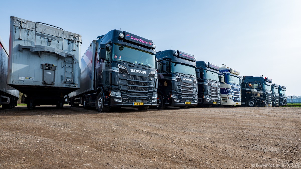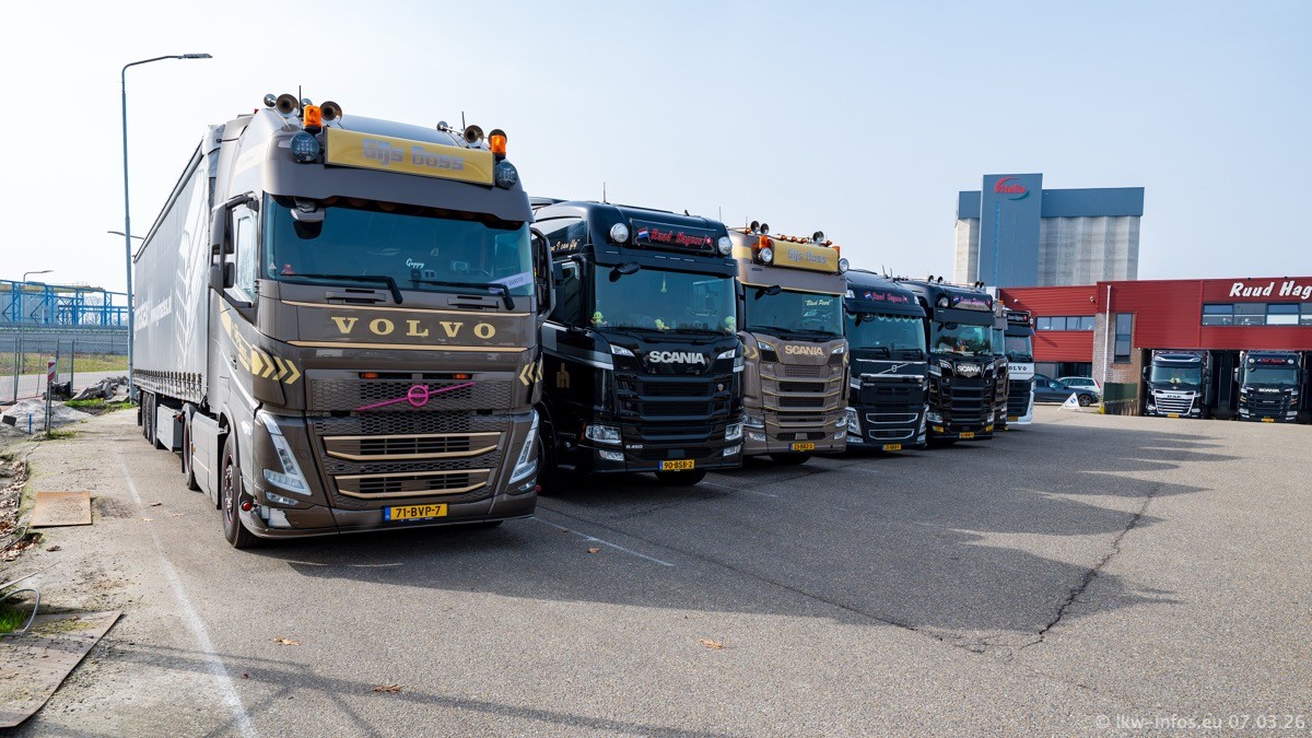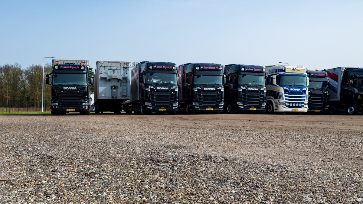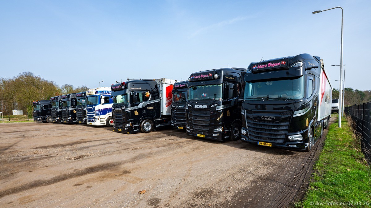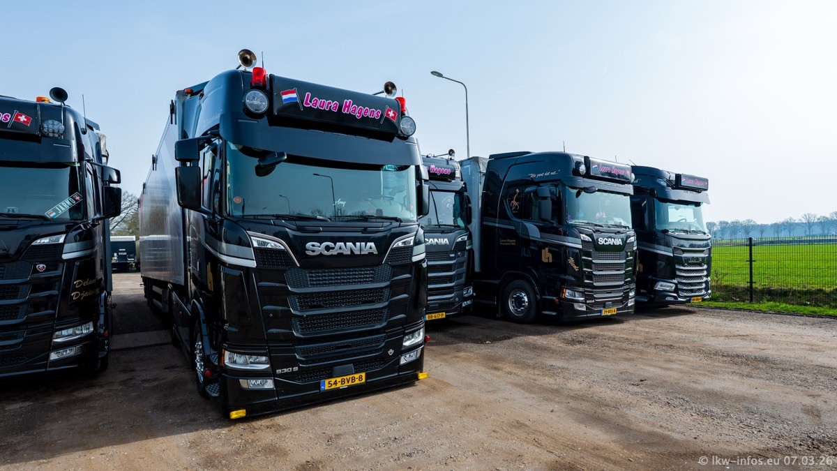 Die LKW von Laura Hagens stehen jetzt auf dem Parkplatz gegenüber vom Firmengelände. Gijs Boss hat das Büro in Venlo aufgelöst und die "alten" LKW stehen jetzt auch in Wanssum. Darum musste ein Teil der LKW auf den zweiten Parkplatz, weil es sowieso schon viel zu eng ist auf dem Firmenhof. Es gibt einen weiteren neuen VOLVO FH Aero, der seit Anfang Januar fährt.