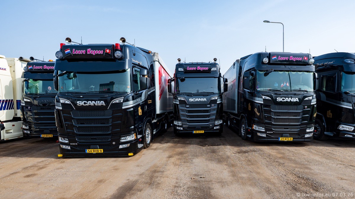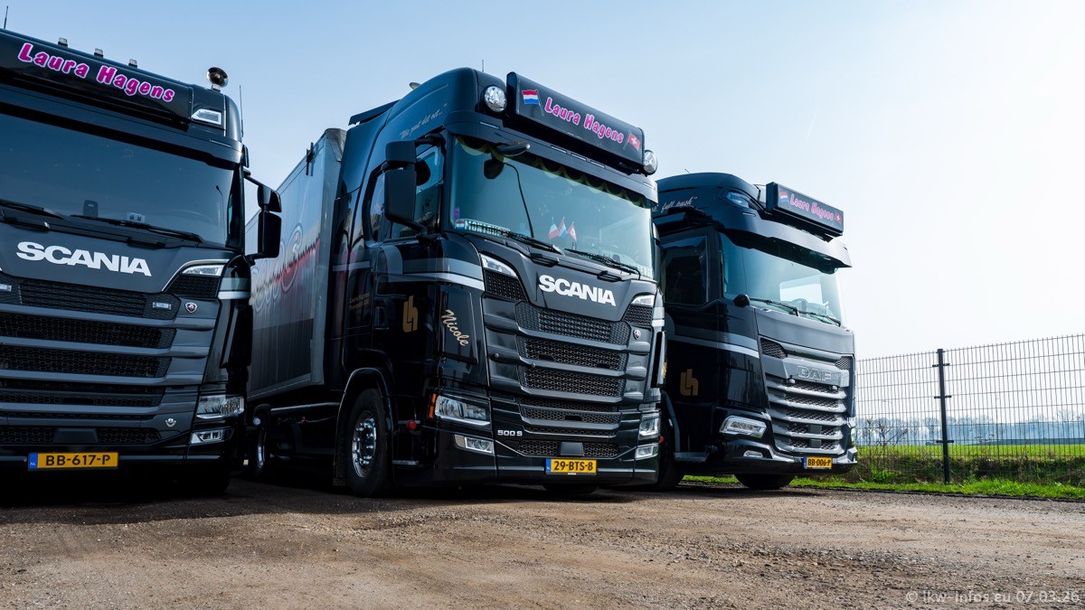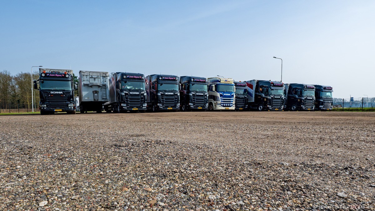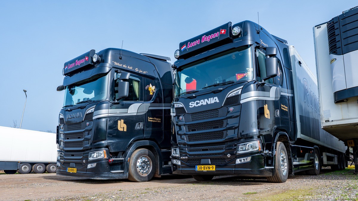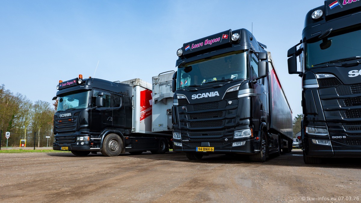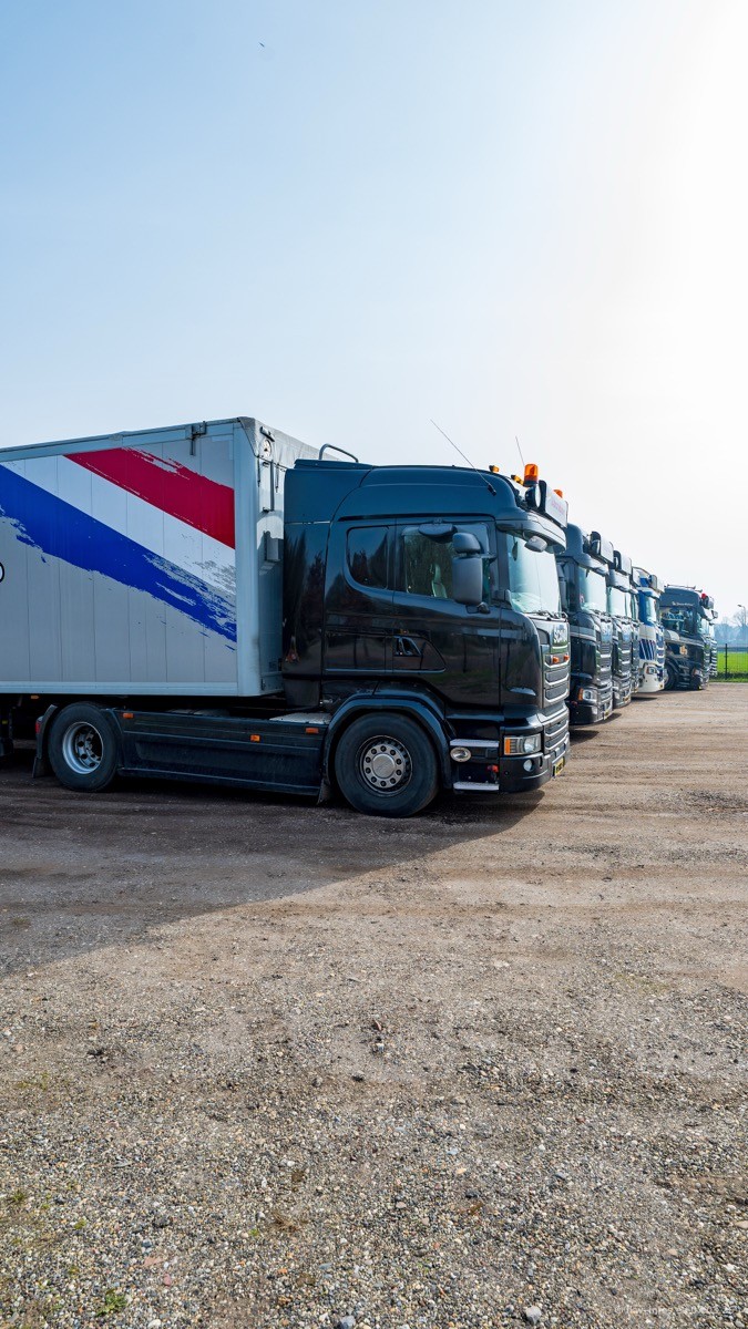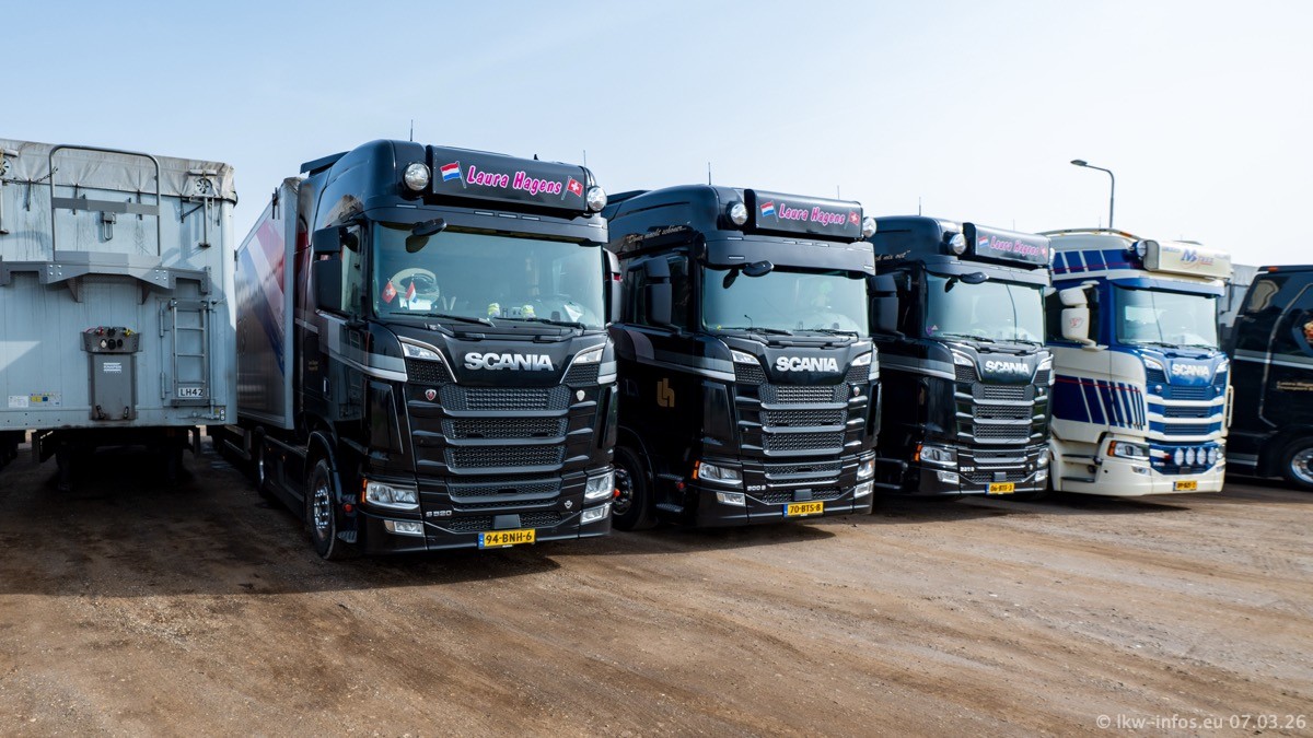 Die LKW von Laura Hagens stehen jetzt auf dem Parkplatz gegenüber vom Firmengelände. Gijs Boss hat das Büro in Venlo aufgelöst und die "alten" LKW stehen jetzt auch in Wanssum. Darum musste ein Teil der LKW auf den zweiten Parkplatz, weil es sowieso schon viel zu eng ist auf dem Firmenhof. Es gibt einen weiteren neuen VOLVO FH Aero, der seit Anfang Januar fährt.