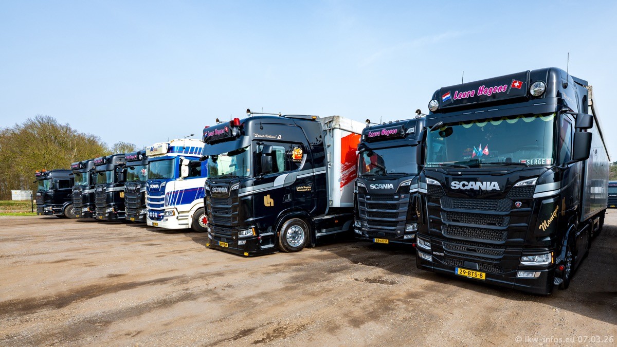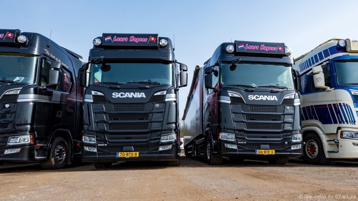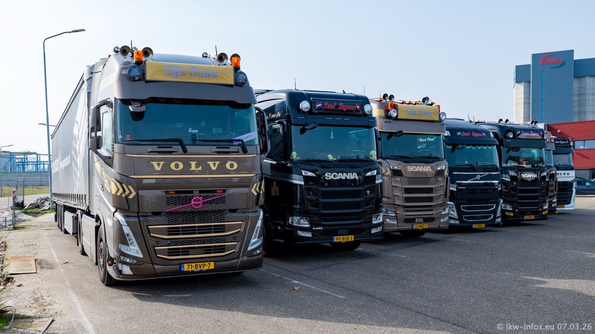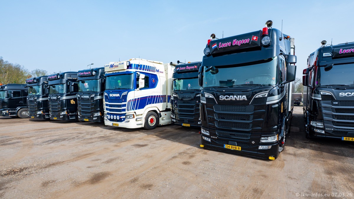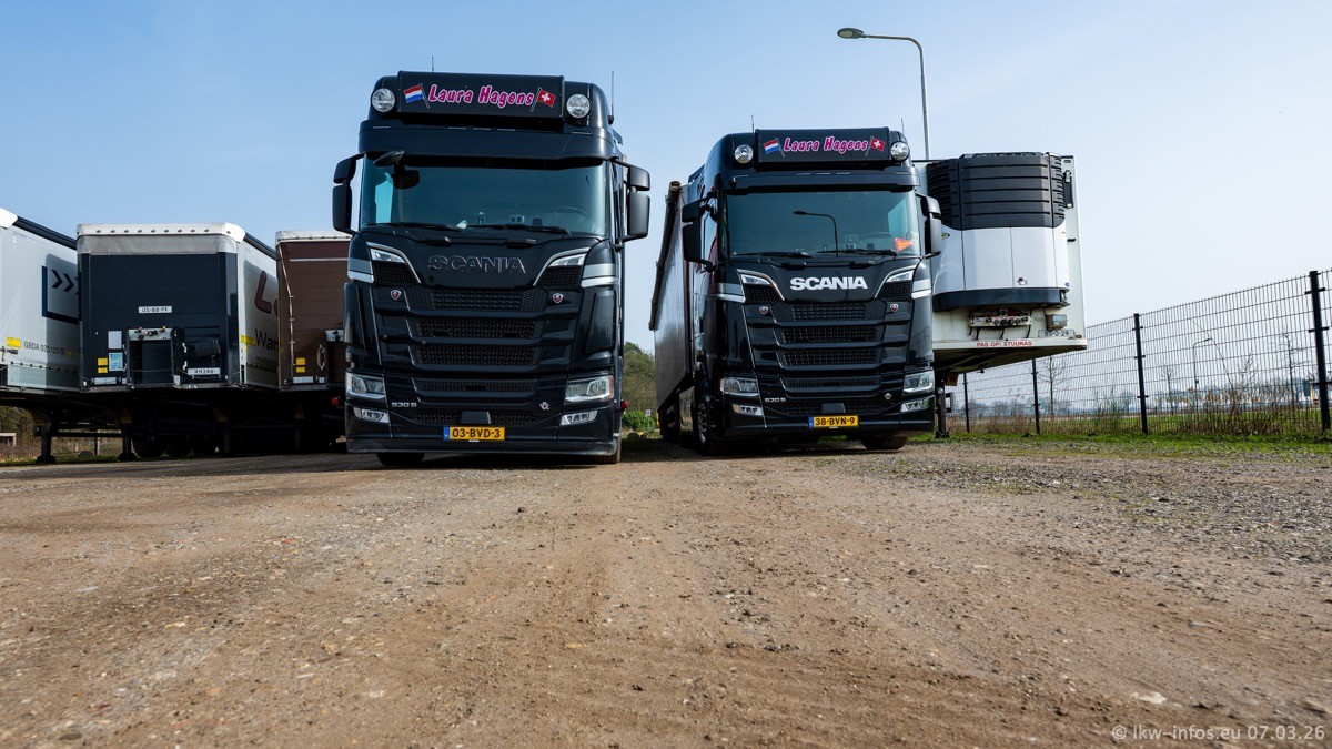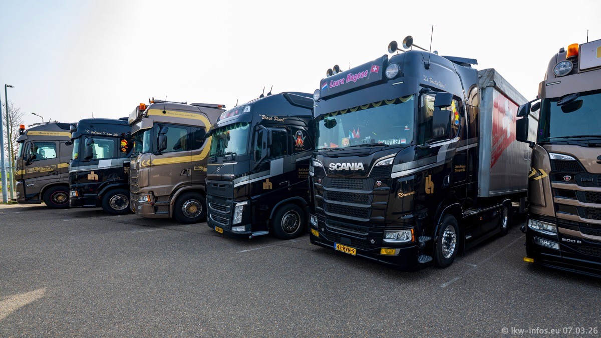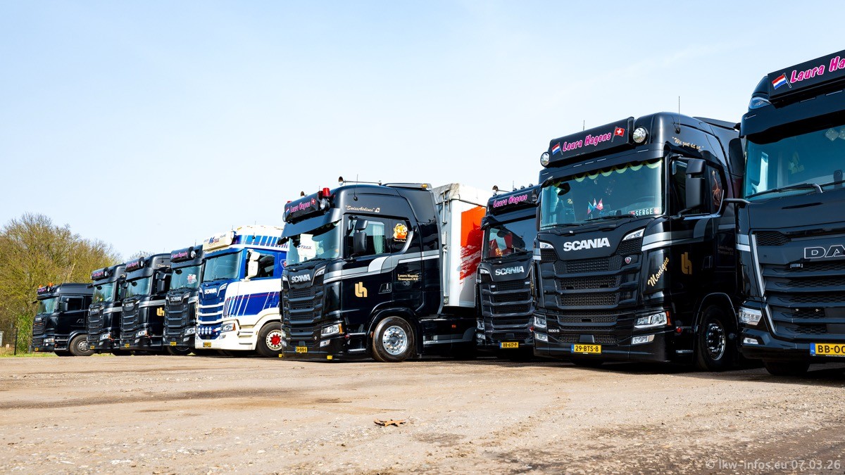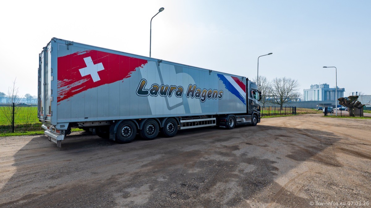Die LKW von Laura Hagens stehen jetzt auf dem Parkplatz gegenüber vom Firmengelände. Gijs Boss hat das Büro in Venlo aufgelöst und die "alten" LKW stehen jetzt auch in Wanssum. Darum musste ein Teil der LKW auf den zweiten Parkplatz, weil es sowieso schon viel zu eng ist auf dem Firmenhof. Es gibt einen weiteren neuen VOLVO FH Aero, der seit Anfang Januar fährt.