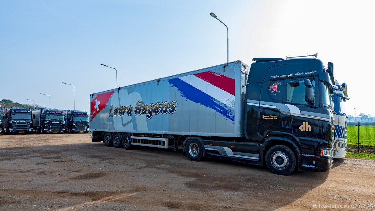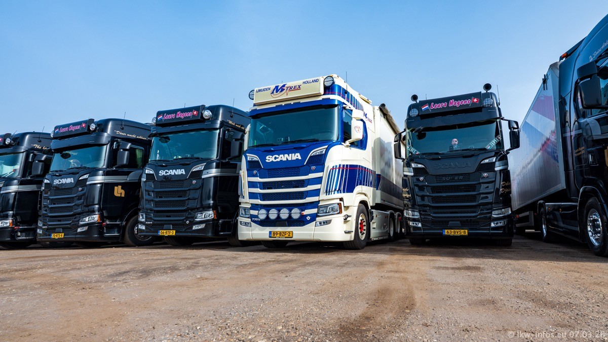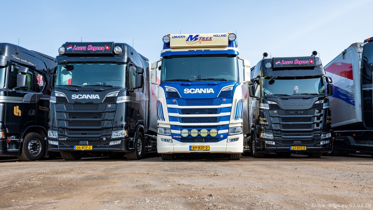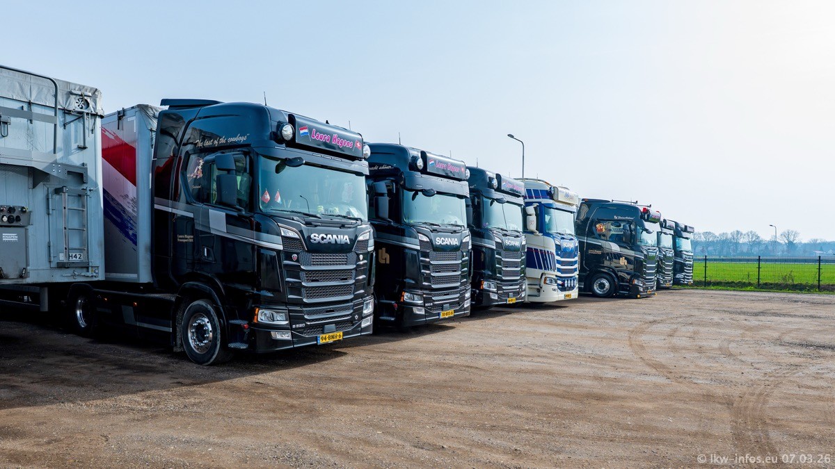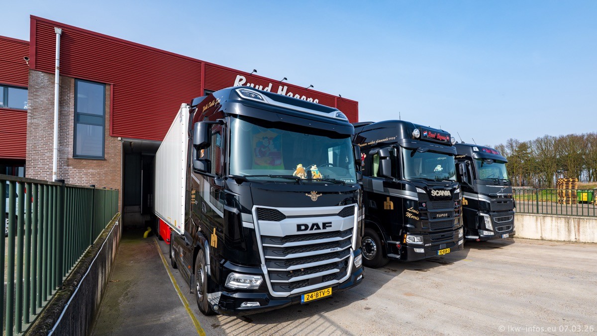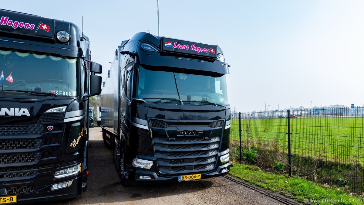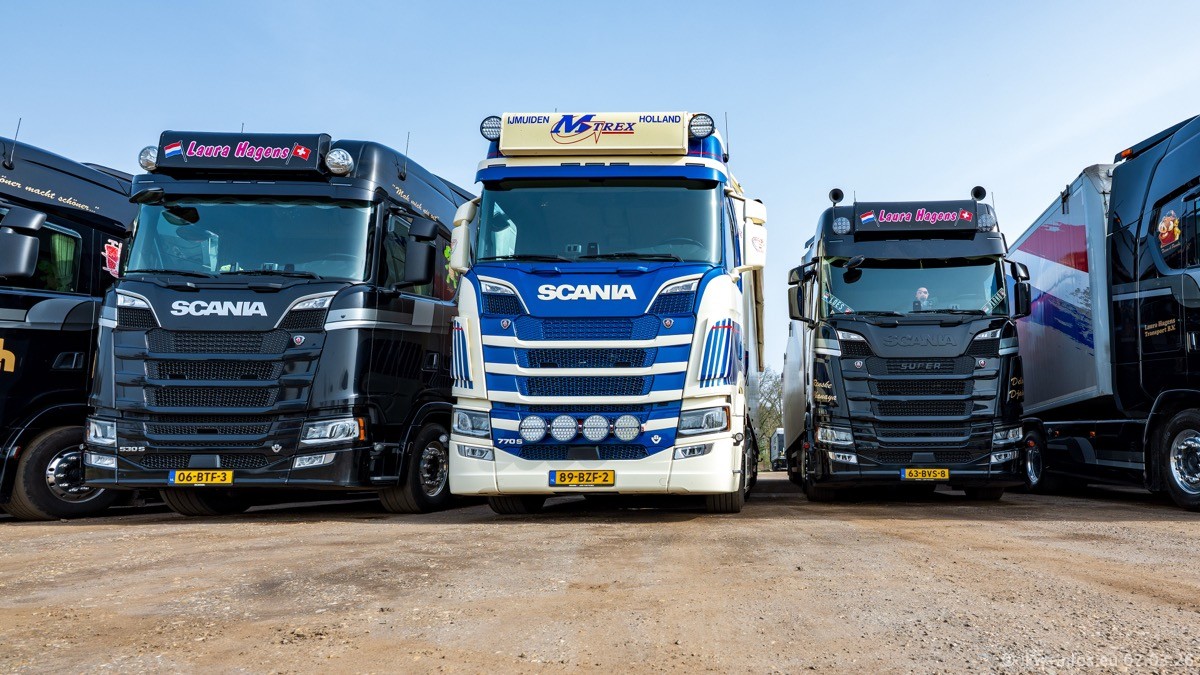 Die LKW von Laura Hagens stehen jetzt auf dem Parkplatz gegenüber vom Firmengelände. Gijs Boss hat das Büro in Venlo aufgelöst und die "alten" LKW stehen jetzt auch in Wanssum. Darum musste ein Teil der LKW auf den zweiten Parkplatz, weil es sowieso schon viel zu eng ist auf dem Firmenhof. Es gibt einen weiteren neuen VOLVO FH Aero, der seit Anfang Januar fährt.