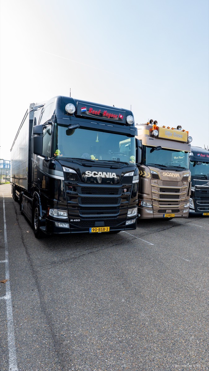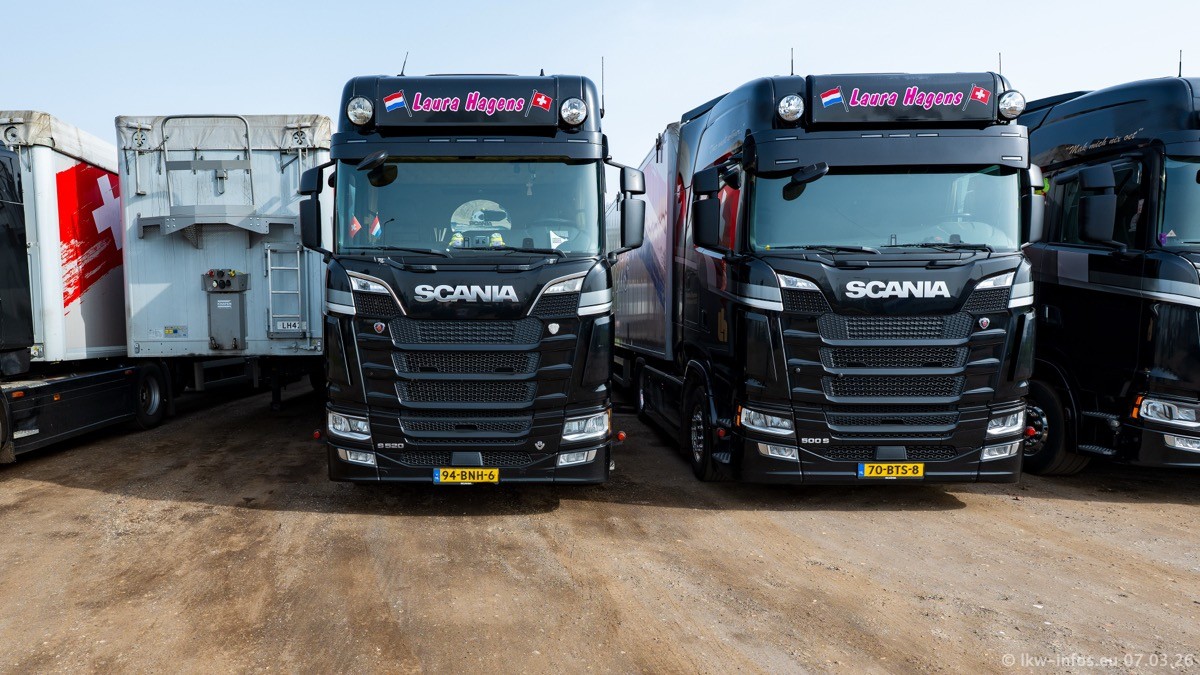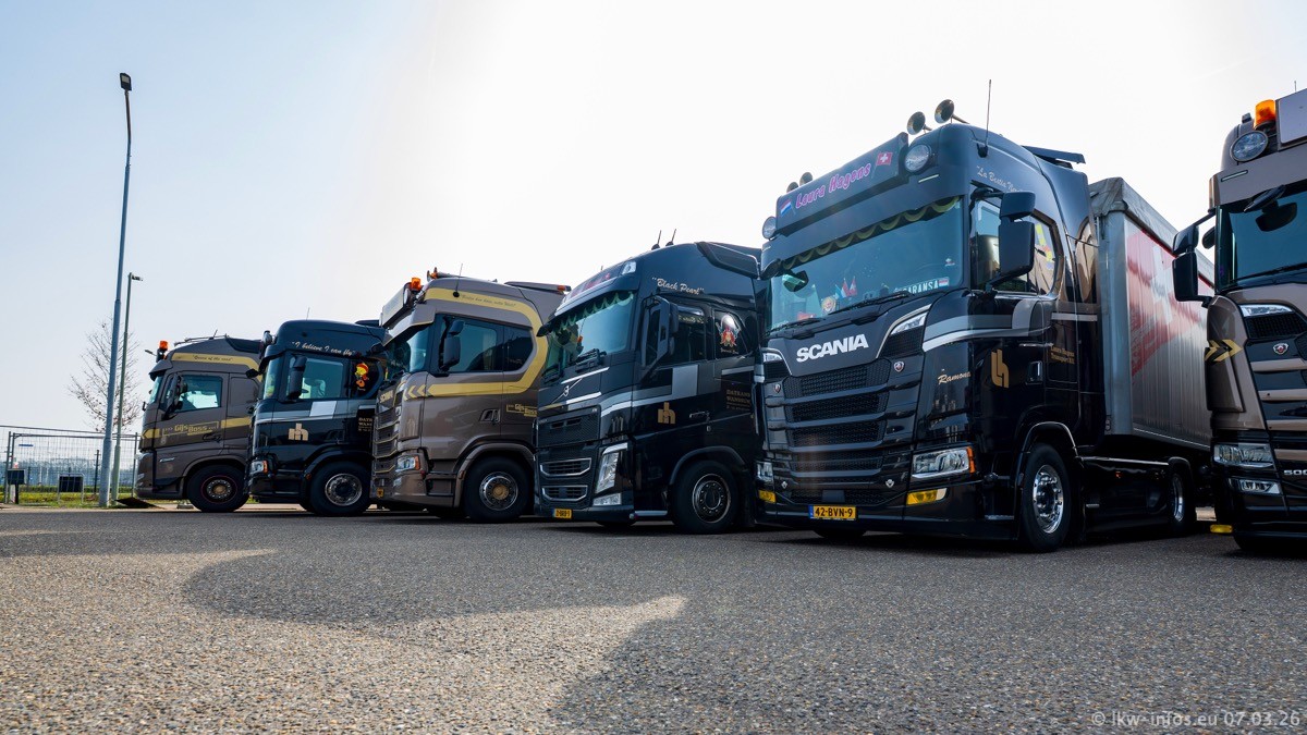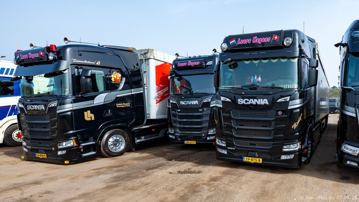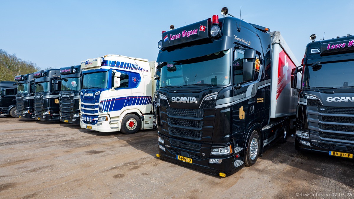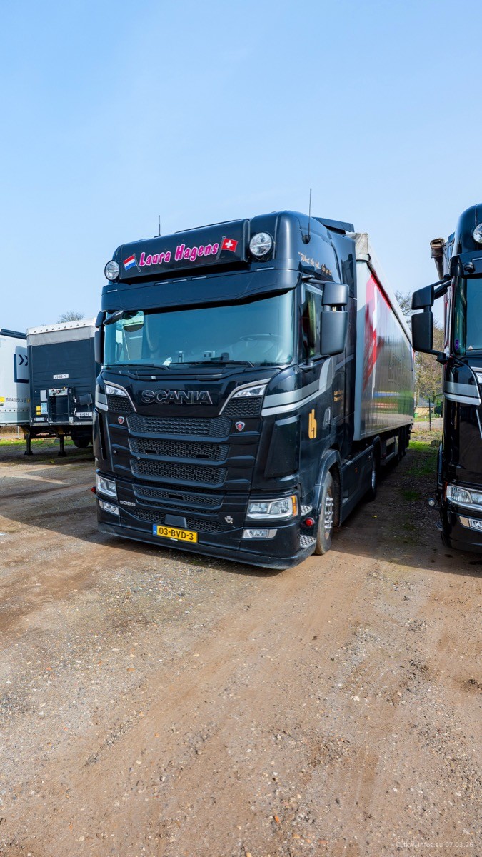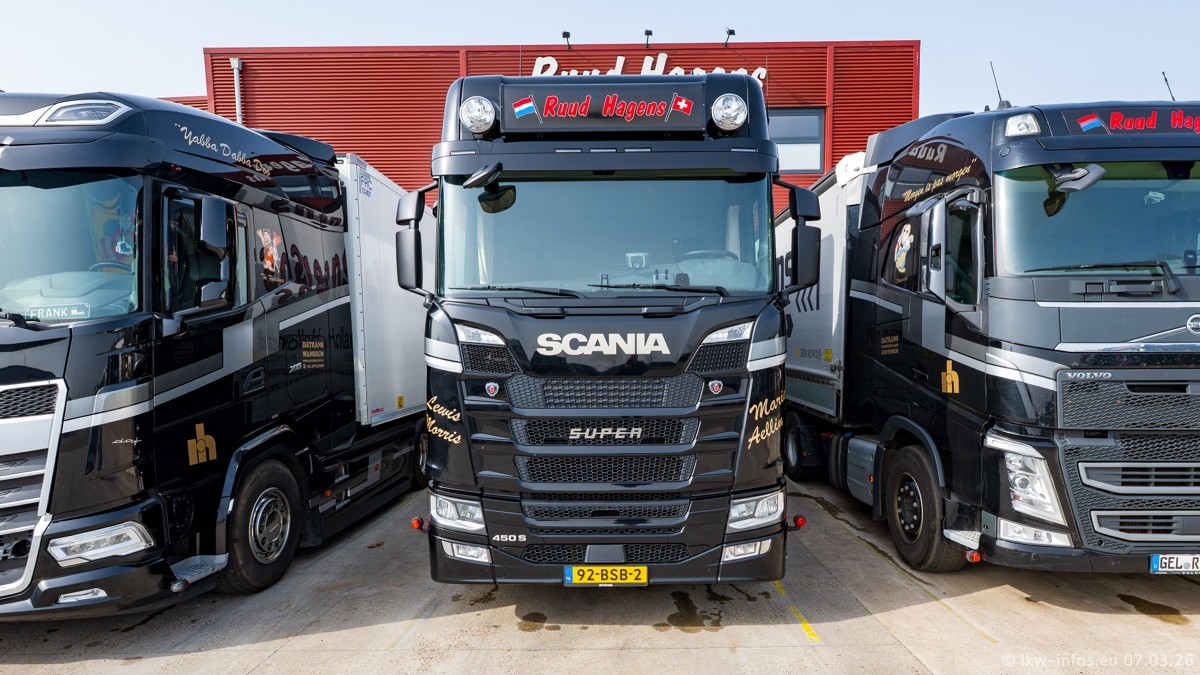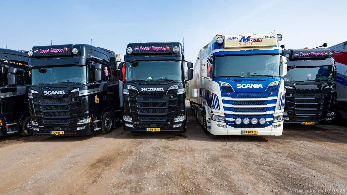 Die LKW von Laura Hagens stehen jetzt auf dem Parkplatz gegenüber vom Firmengelände. Gijs Boss hat das Büro in Venlo aufgelöst und die "alten" LKW stehen jetzt auch in Wanssum. Darum musste ein Teil der LKW auf den zweiten Parkplatz, weil es sowieso schon viel zu eng ist auf dem Firmenhof. Es gibt einen weiteren neuen VOLVO FH Aero, der seit Anfang Januar fährt.