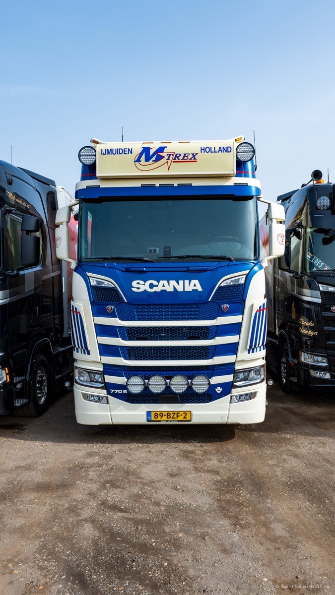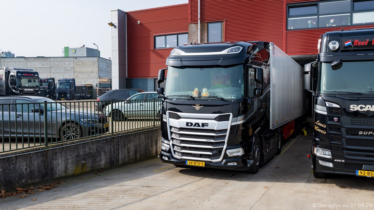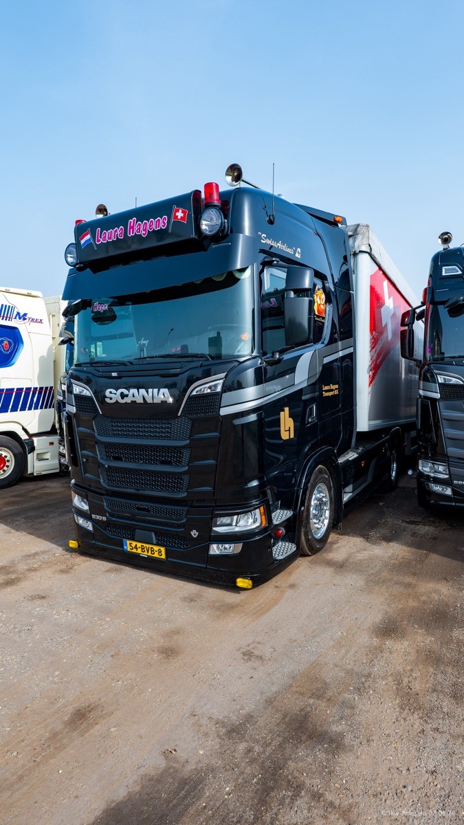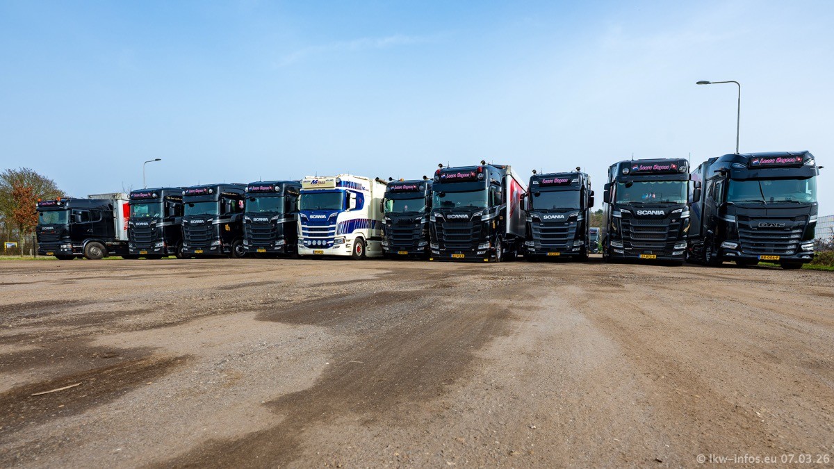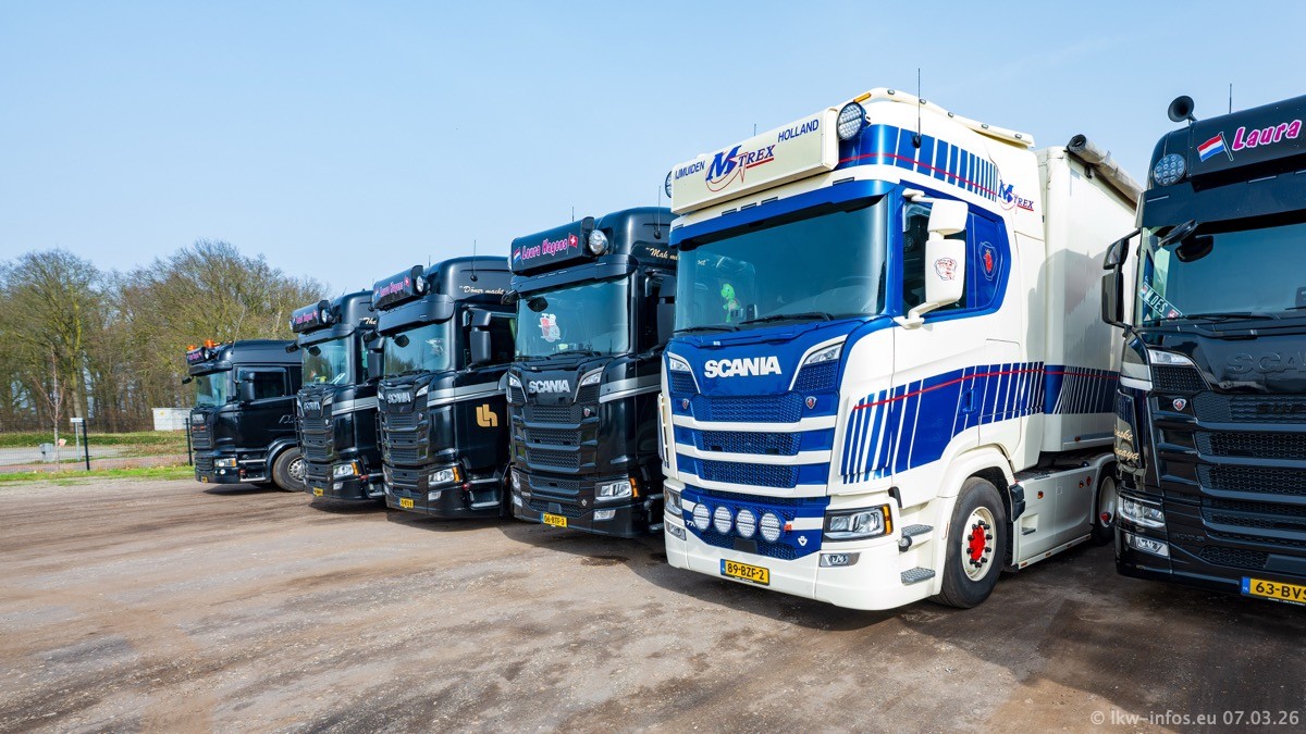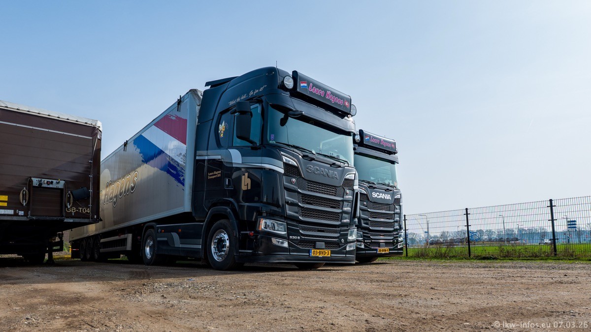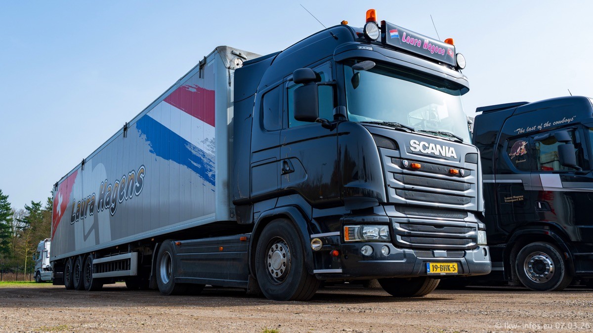 Die LKW von Laura Hagens stehen jetzt auf dem Parkplatz gegenüber vom Firmengelände. Gijs Boss hat das Büro in Venlo aufgelöst und die "alten" LKW stehen jetzt auch in Wanssum. Darum musste ein Teil der LKW auf den zweiten Parkplatz, weil es sowieso schon viel zu eng ist auf dem Firmenhof. Es gibt einen weiteren neuen VOLVO FH Aero, der seit Anfang Januar fährt.