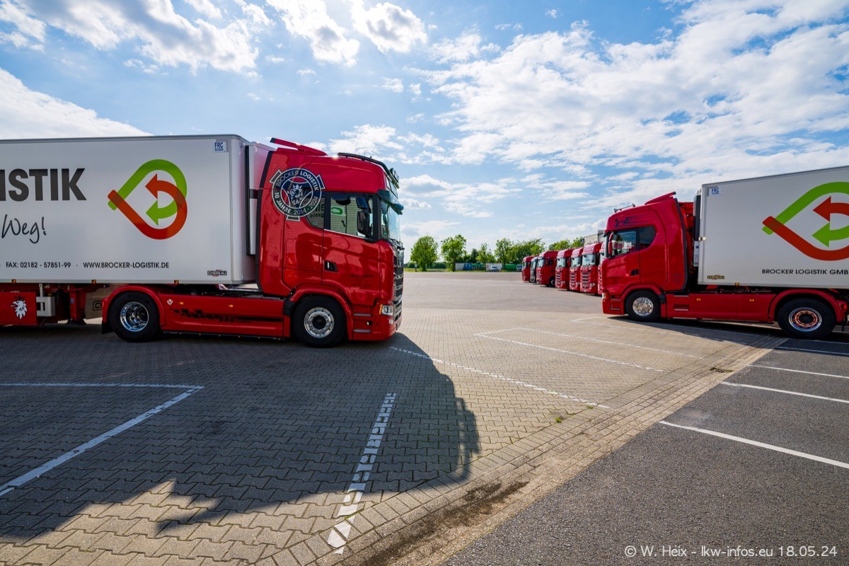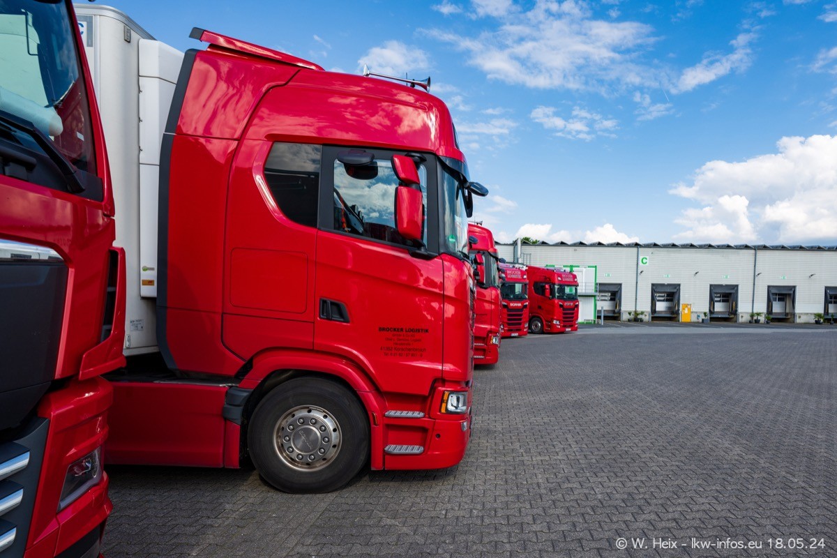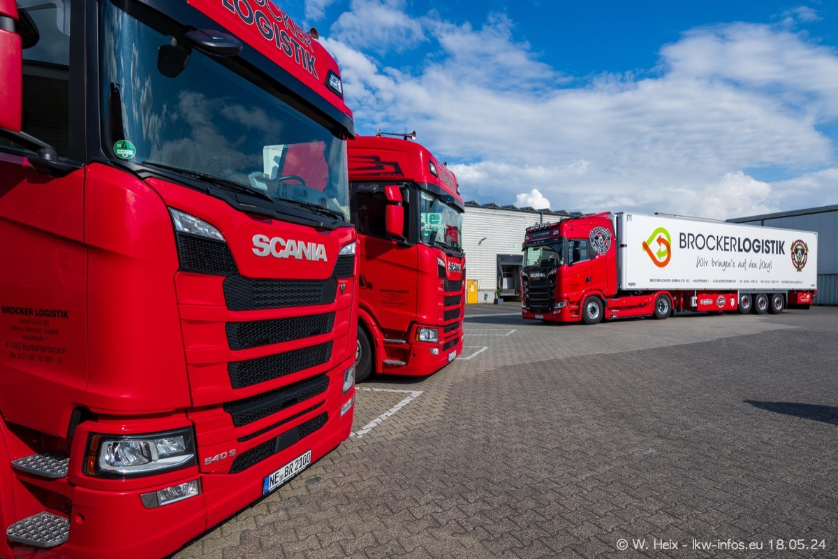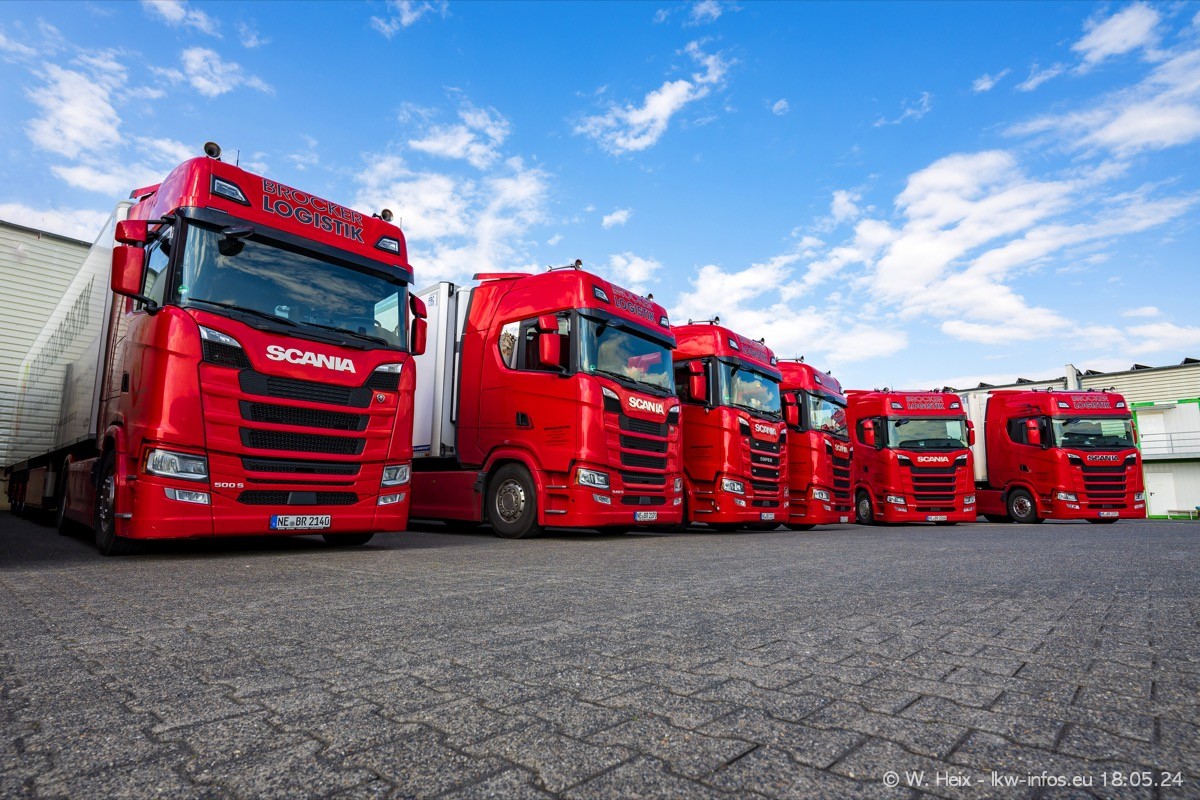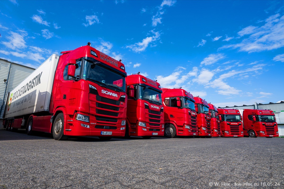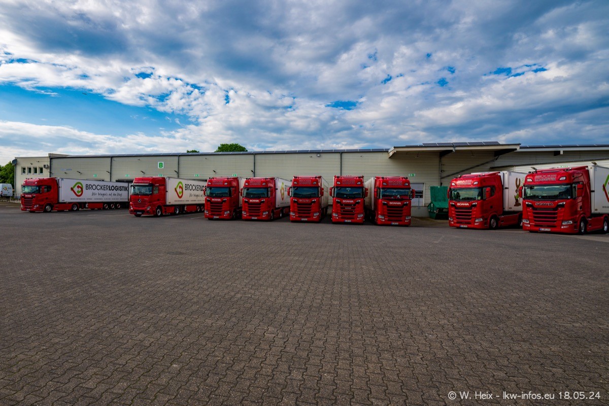 Nach über fünf Jahren war ich wieder bei Brocker Logistik in Korschenbroich. Diesmal wurde ich zu einem kleinen Fotoshooting eingeladen. Am späten Samstag Nachmittag war fast der komplette Fuhrpark zuhause. Das sind aktuell 38 LKW. Zwei fehlten. Zum 10-jährigen Firmenjubiläum wurde im März ein SCANIA 660 S V8 NextGen gekauft. Dieser ist etwas aufwändiger gestaltet als der restliche Fuhrpark, der sich aber auch sehen lassen kann. Auf dem weitläufigen Gelände gab es genug schöne Plätze für dieses kleine Fotoshooting.