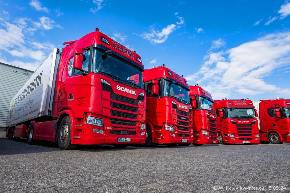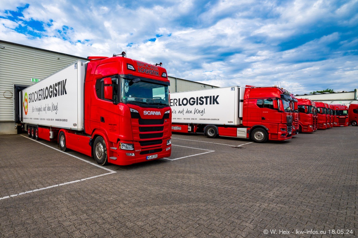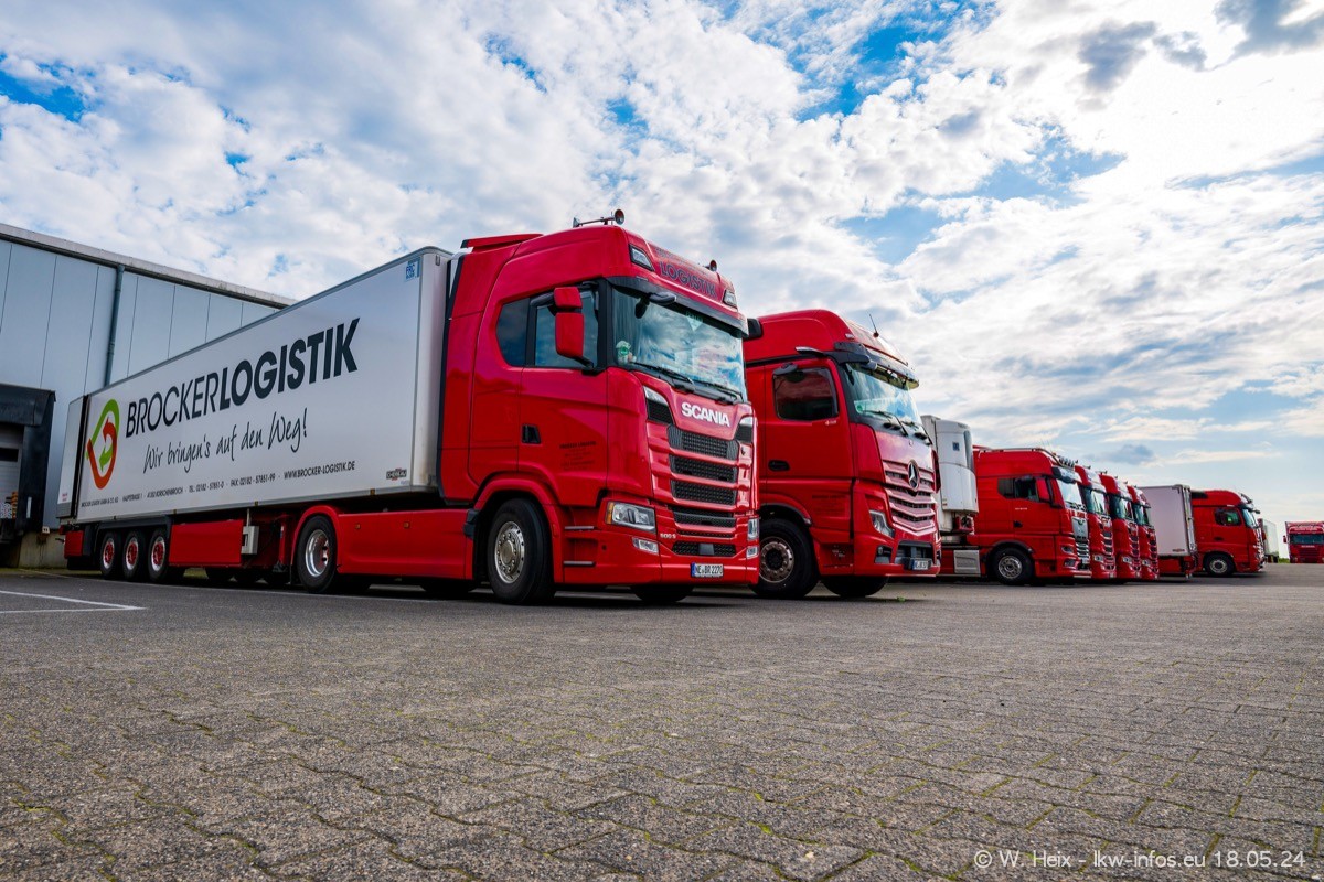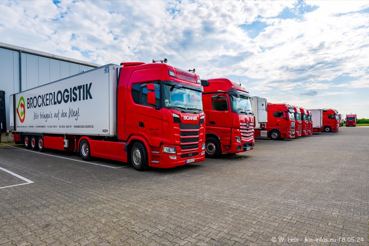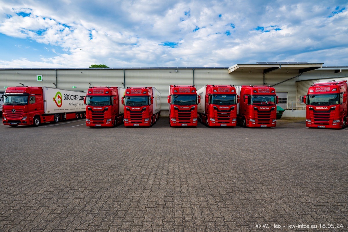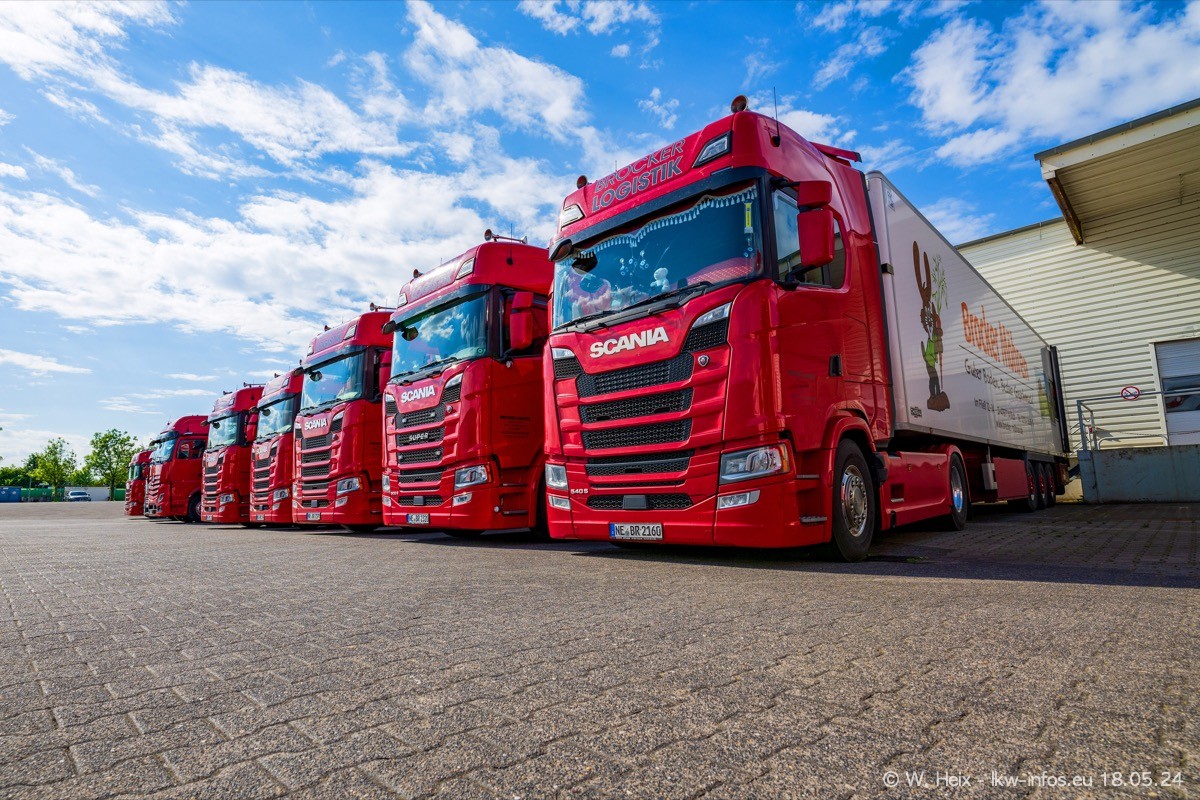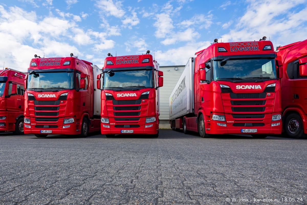 Nach über fünf Jahren war ich wieder bei Brocker Logistik in Korschenbroich. Diesmal wurde ich zu einem kleinen Fotoshooting eingeladen. Am späten Samstag Nachmittag war fast der komplette Fuhrpark zuhause. Das sind aktuell 38 LKW. Zwei fehlten. Zum 10-jährigen Firmenjubiläum wurde im März ein SCANIA 660 S V8 NextGen gekauft. Dieser ist etwas aufwändiger gestaltet als der restliche Fuhrpark, der sich aber auch sehen lassen kann. Auf dem weitläufigen Gelände gab es genug schöne Plätze für dieses kleine Fotoshooting.